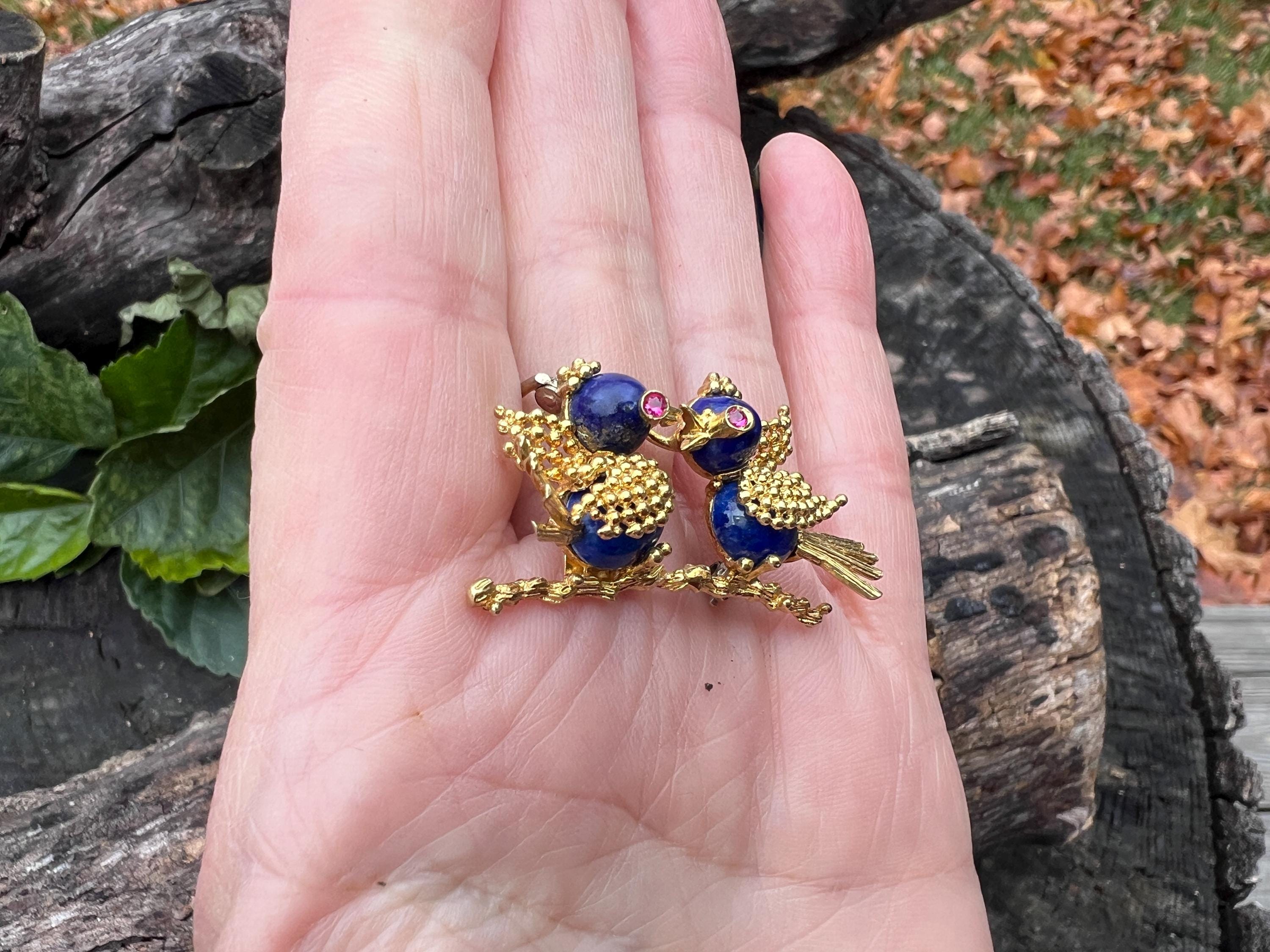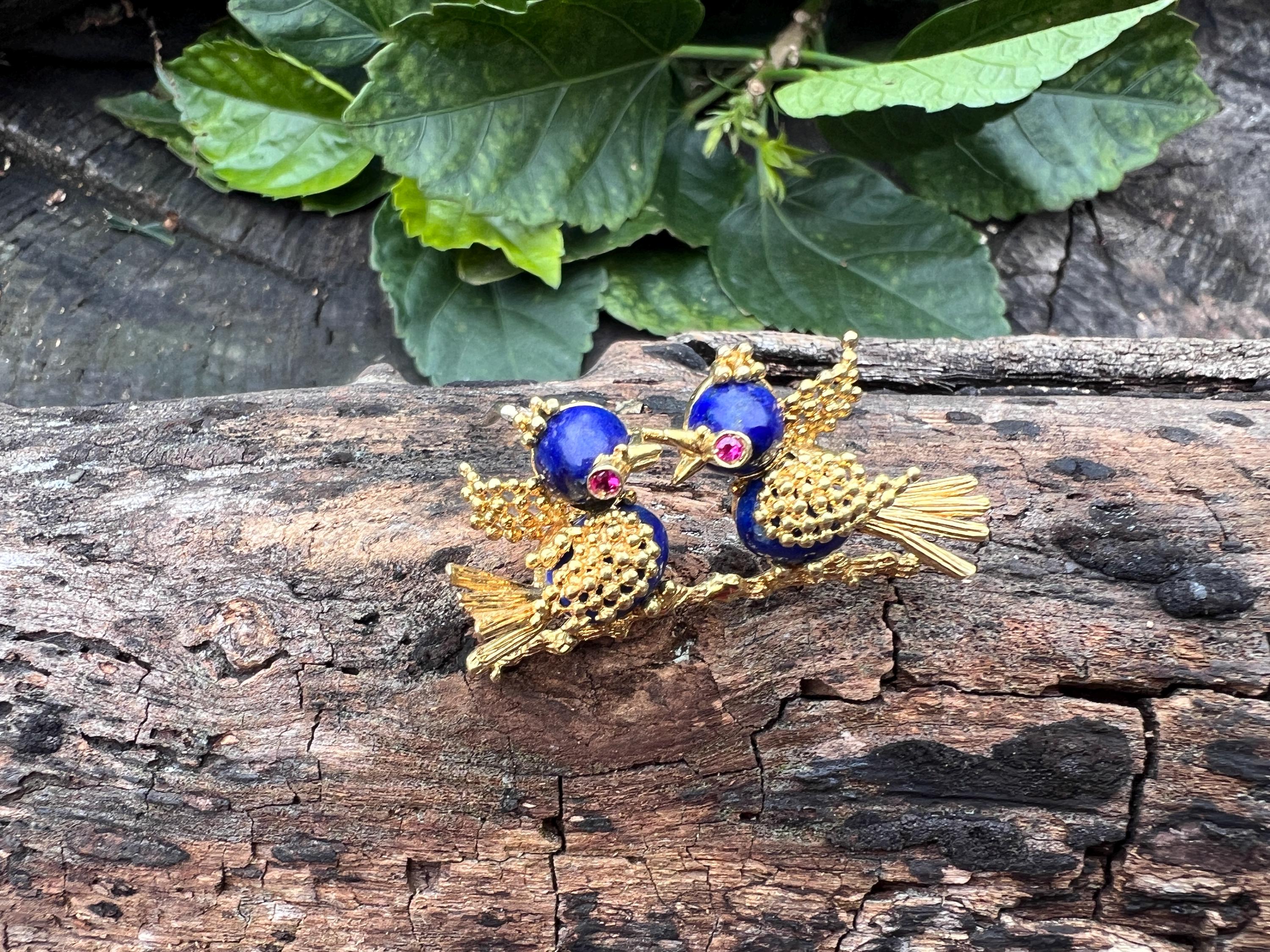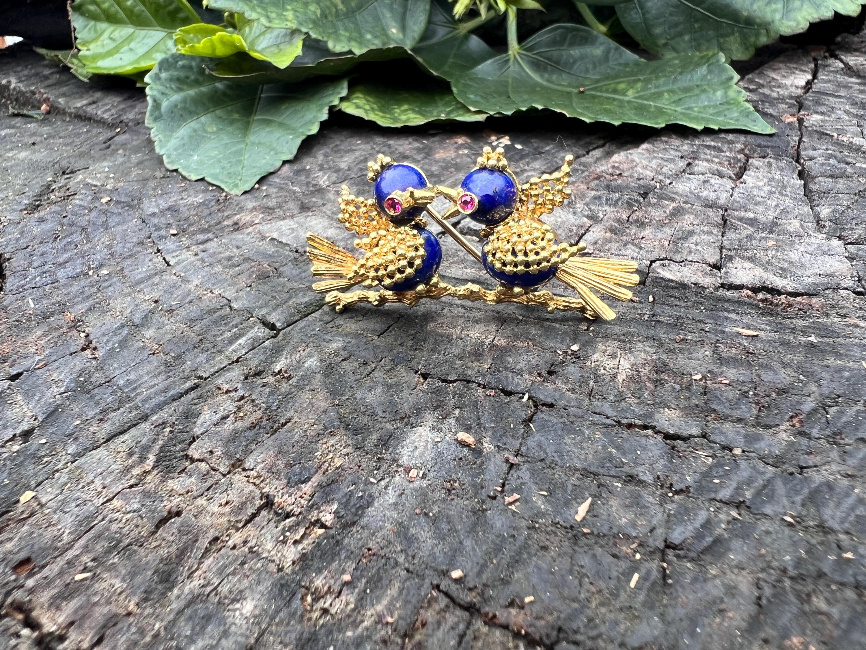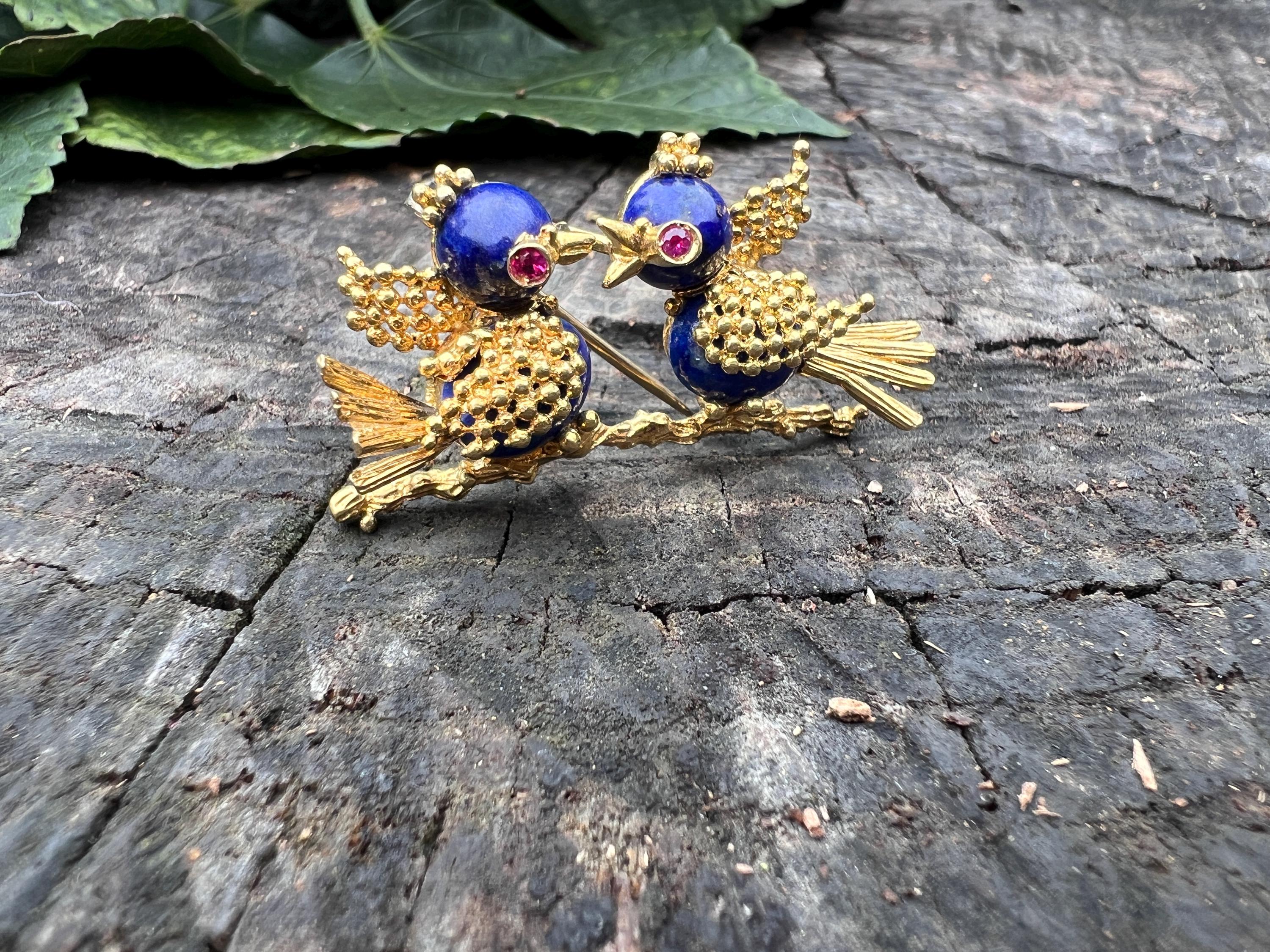 This endearing lovebirds brooch is a beautiful creation. It is set in 18k yellow gold. The lovebirds, in beautiful textured gold to mimic the birds feathers, have vibrant blue lapis heads and bodies. They have round ruby eyes. They are perched together, in love position, on a golden branch. It is an enchanting piece. The birds measures 1 1/2 x 7/8". It weighs 10.27 grams. It is marked Italy, 18k and Merrin.