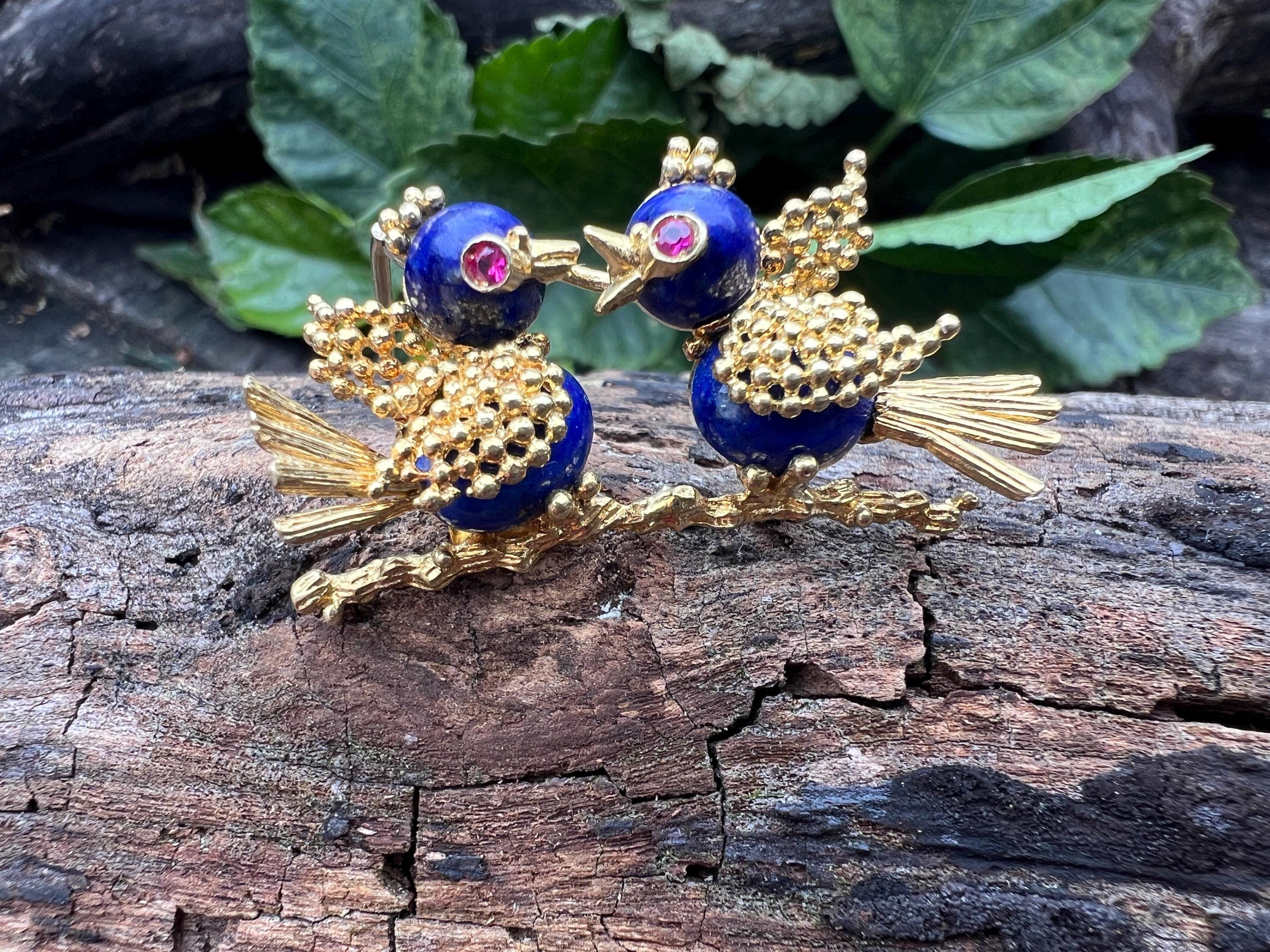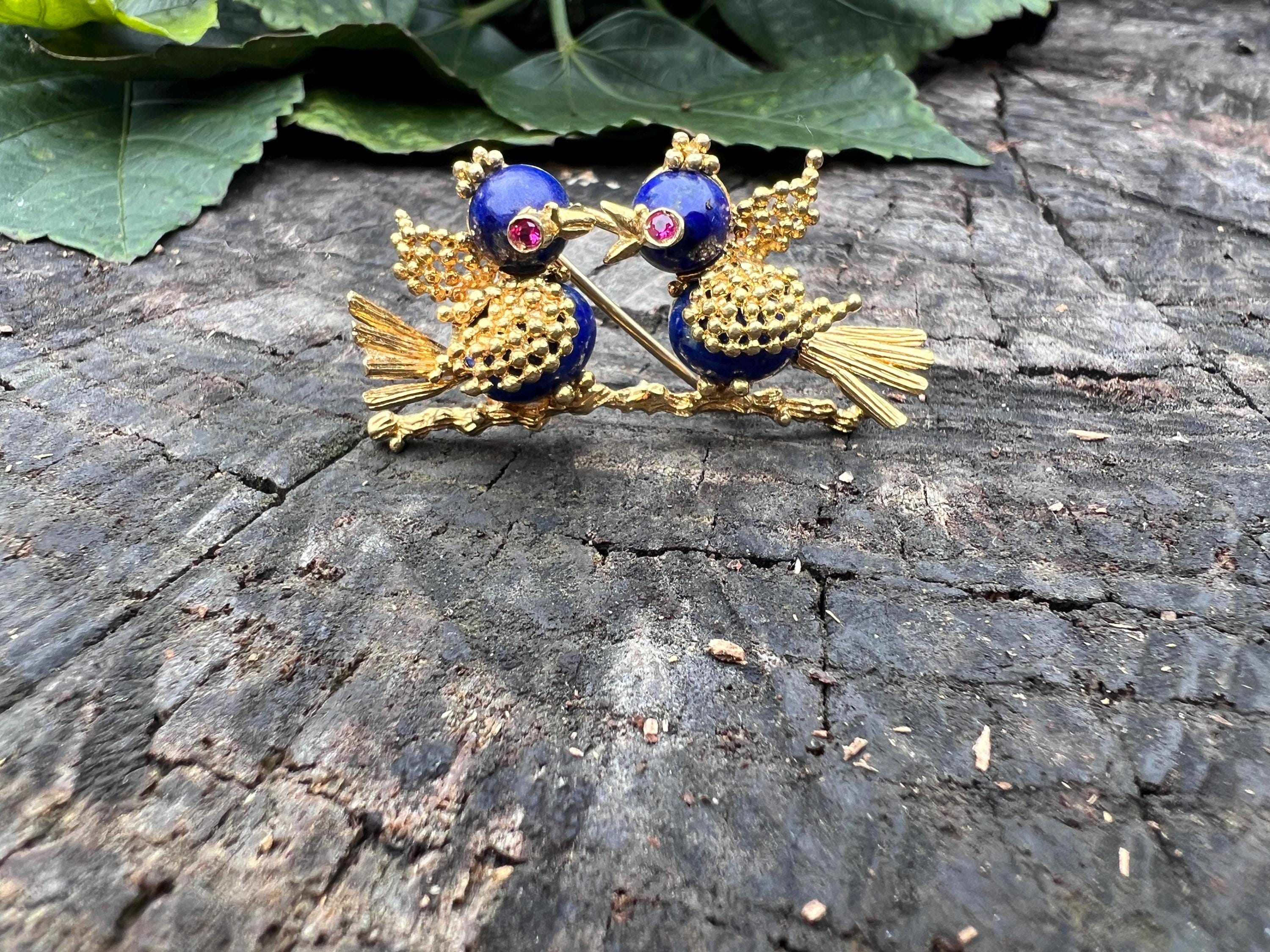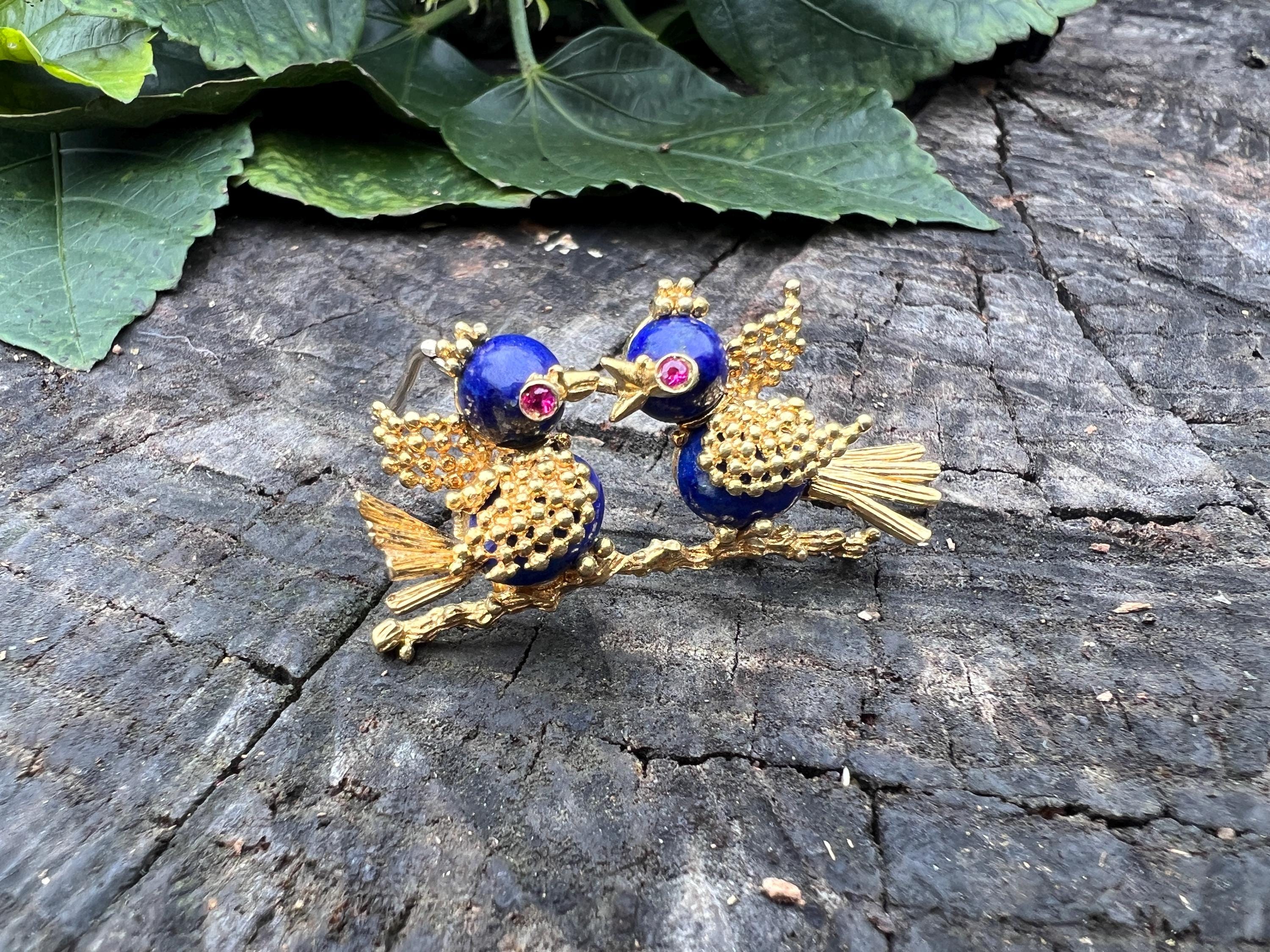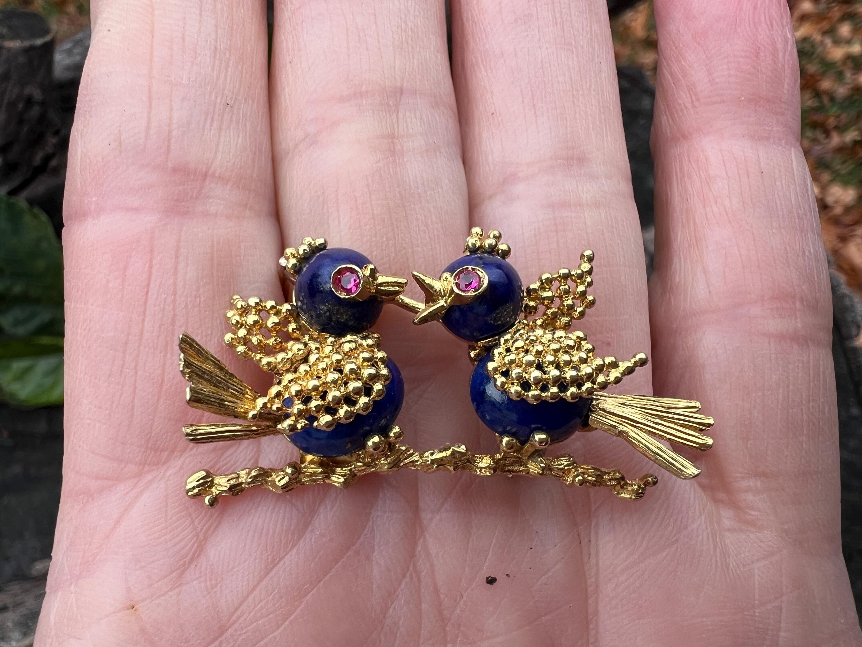 This endearing lovebirds brooch is a beautiful creation. It is set in 18k yellow gold. The lovebirds, in beautiful textured gold to mimic the birds feathers, have vibrant blue lapis heads and bodies. They have round ruby eyes. They are perched together, in love position, on a golden branch. It is an enchanting piece. The birds measures 1 1/2 x 7/8". It weighs 10.27 grams. It is marked Italy, 18k and Merrin.