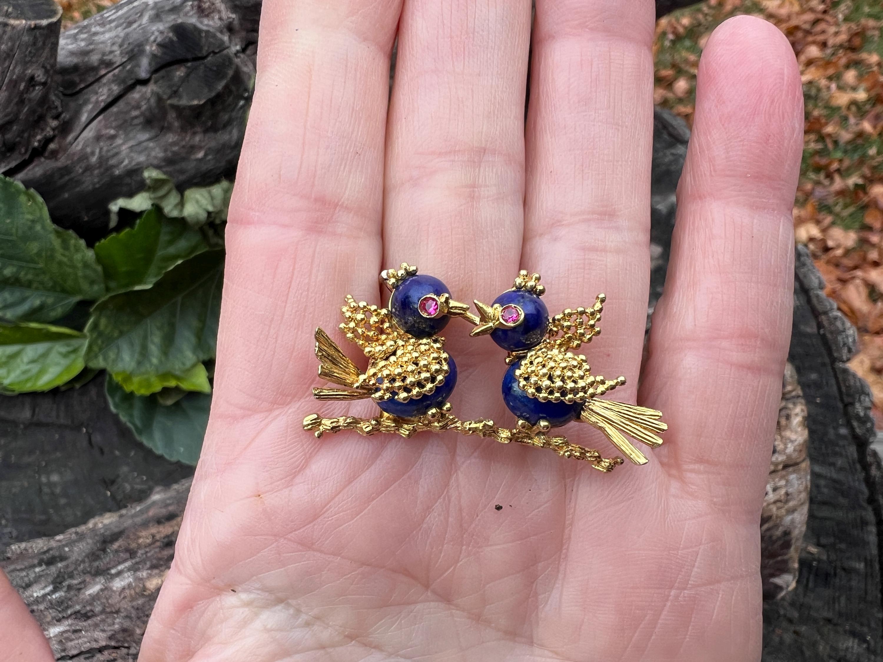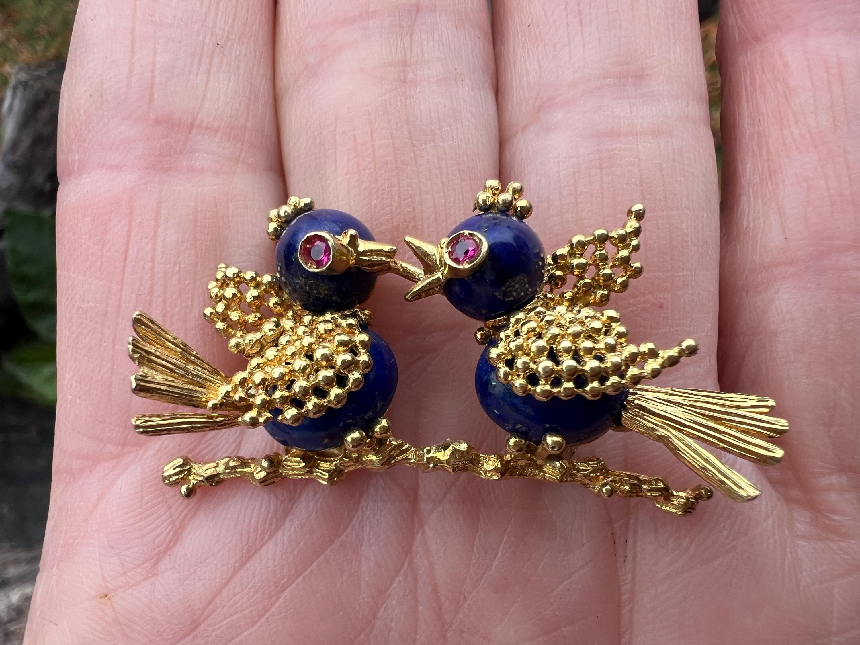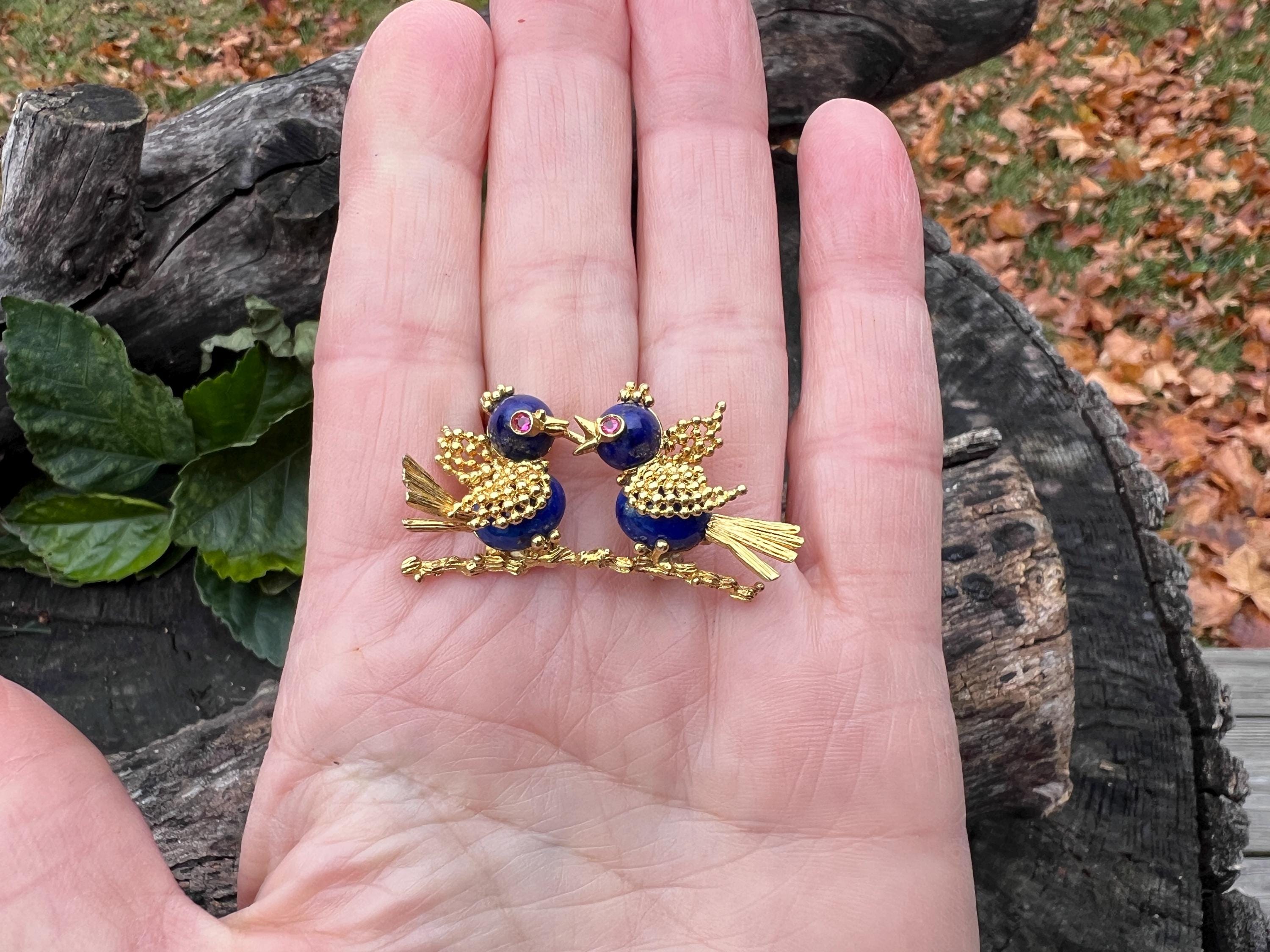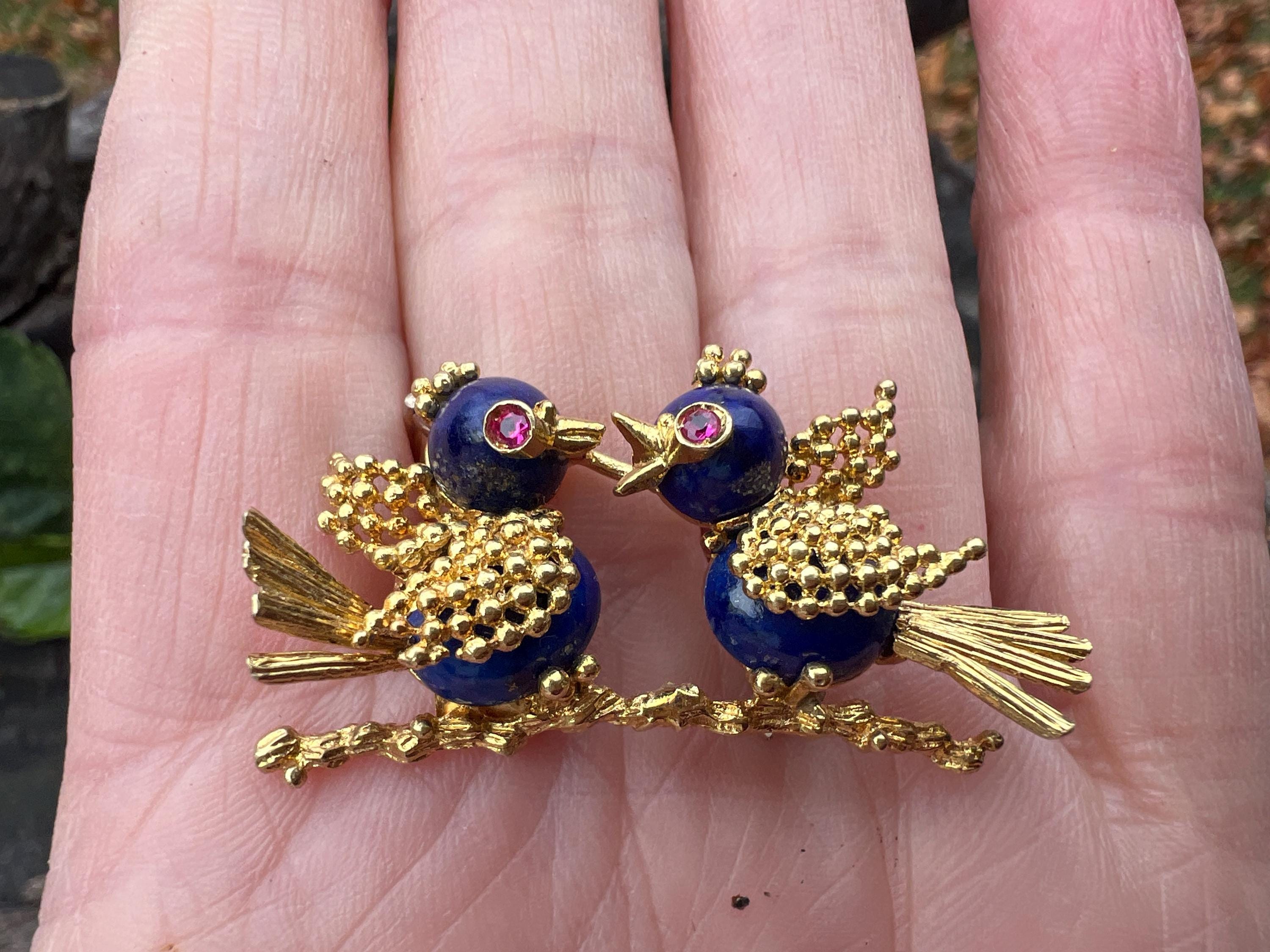 This endearing lovebirds brooch is a beautiful creation. It is set in 18k yellow gold. The lovebirds, in beautiful textured gold to mimic the birds feathers, have vibrant blue lapis heads and bodies. They have round ruby eyes. They are perched together, in love position, on a golden branch. It is an enchanting piece. The birds measures 1 1/2 x 7/8". It weighs 10.27 grams. It is marked Italy, 18k and Merrin.