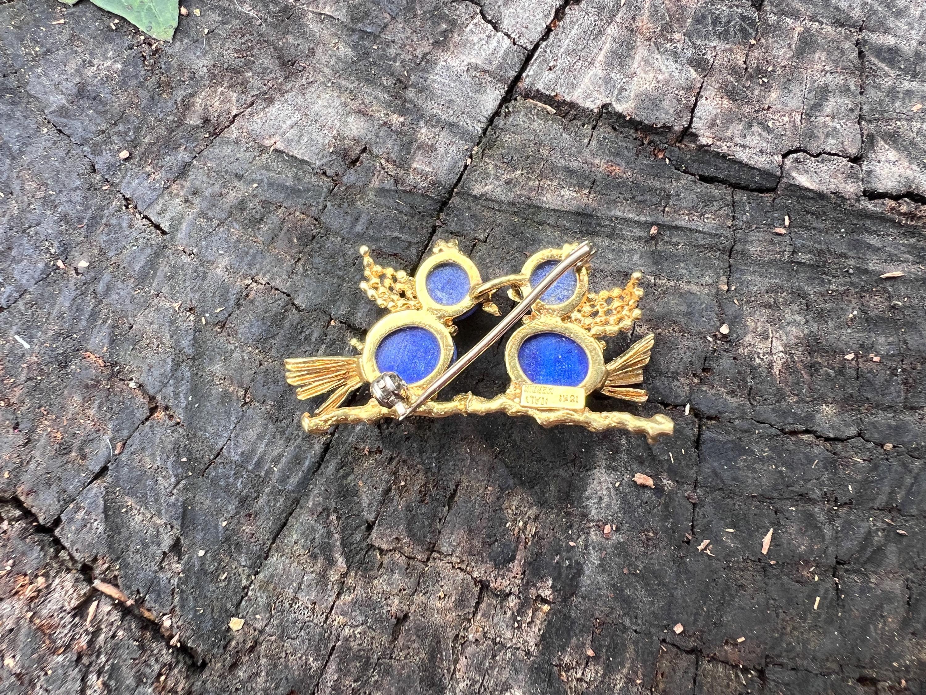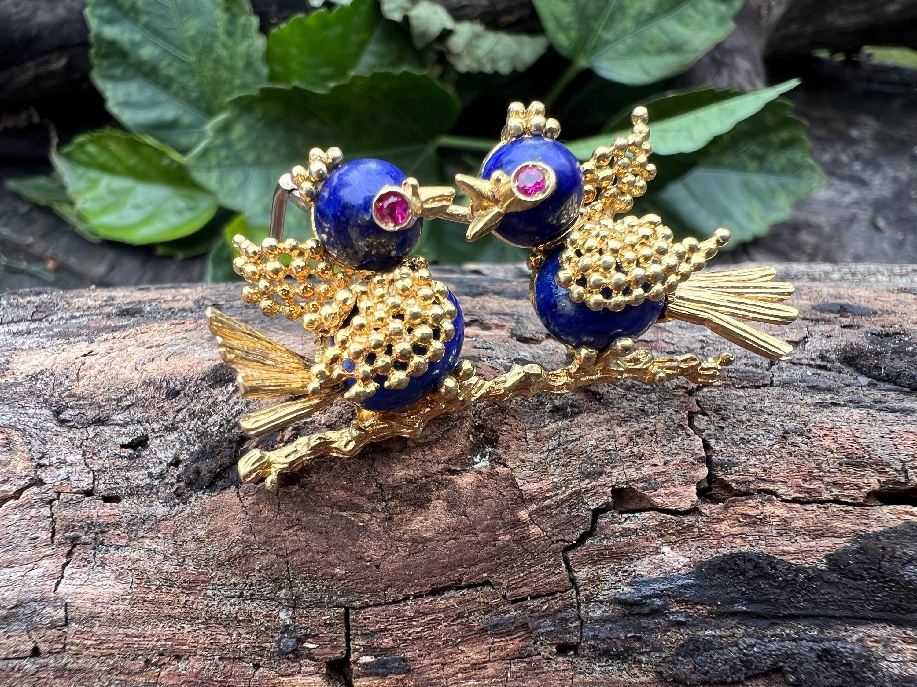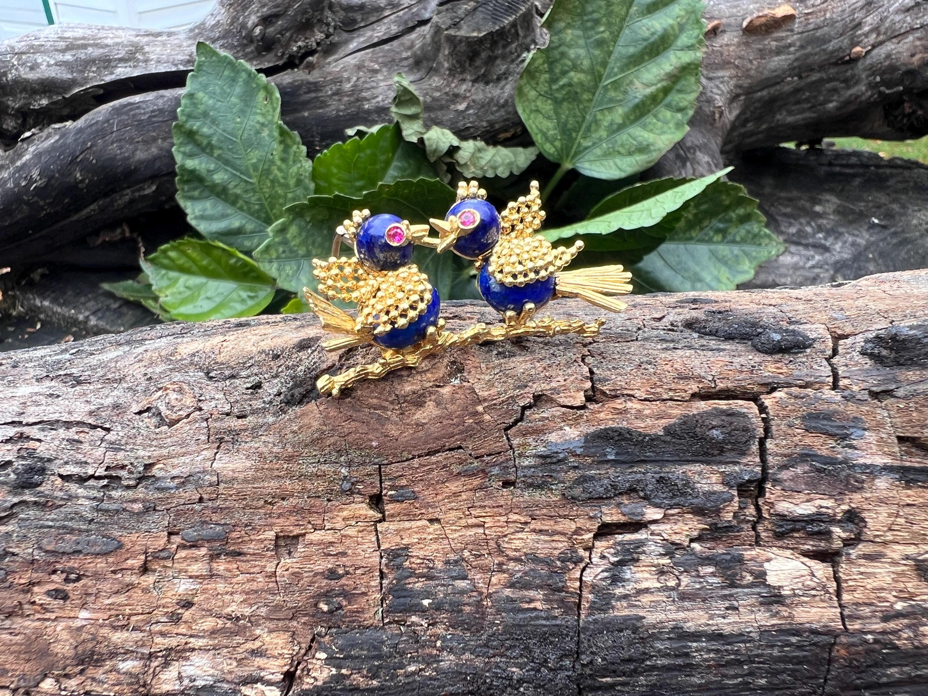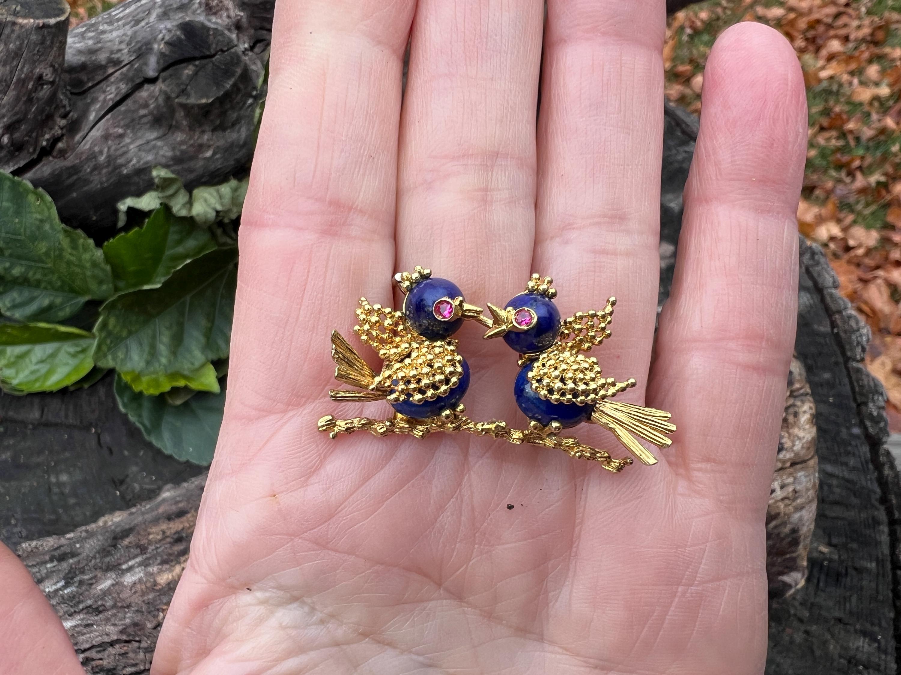 This endearing lovebirds brooch is a beautiful creation. It is set in 18k yellow gold. The lovebirds, in beautiful textured gold to mimic the birds feathers, have vibrant blue lapis heads and bodies. They have round ruby eyes. They are perched together, in love position, on a golden branch. It is an enchanting piece. The birds measures 1 1/2 x 7/8". It weighs 10.27 grams. It is marked Italy, 18k and Merrin.