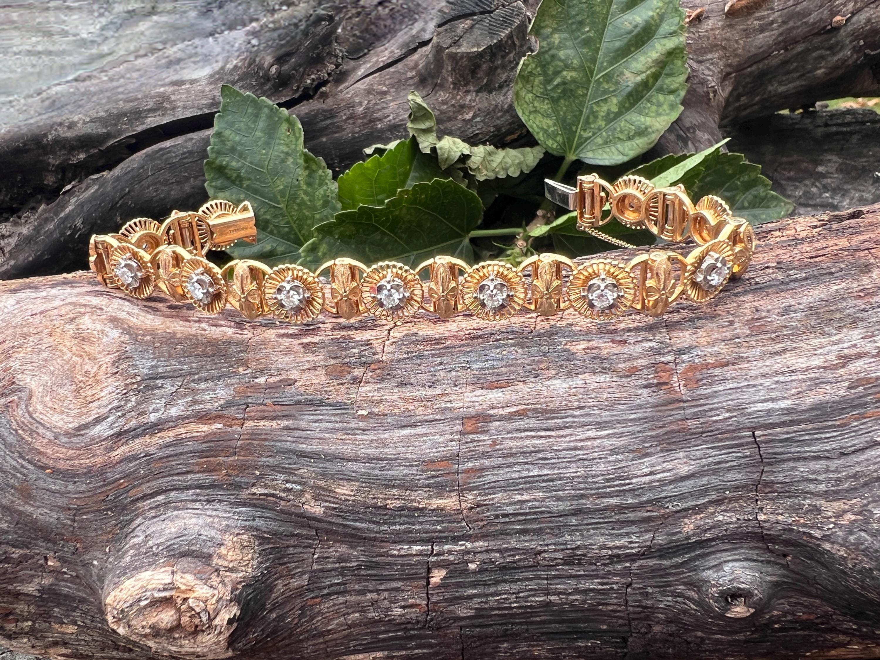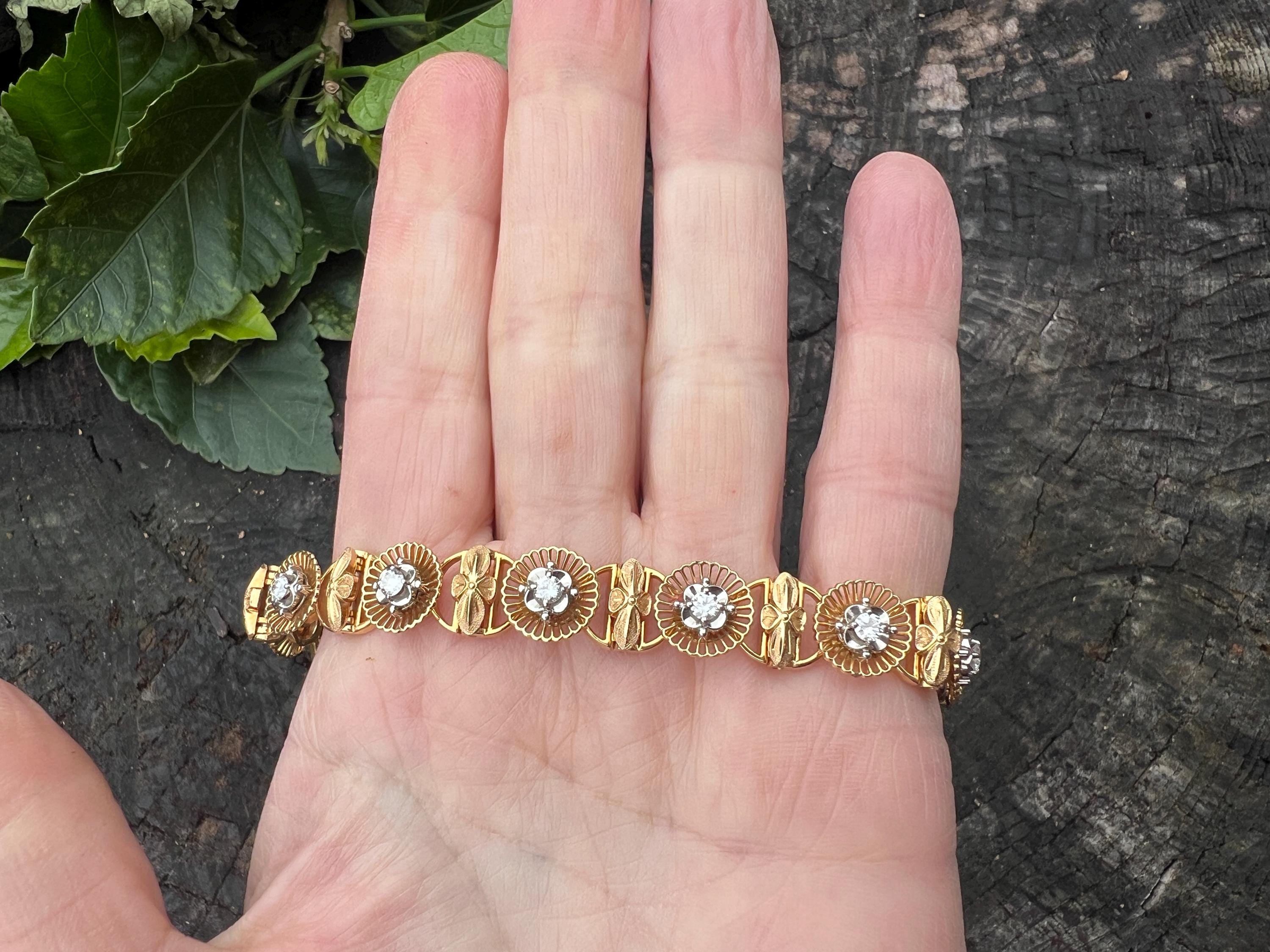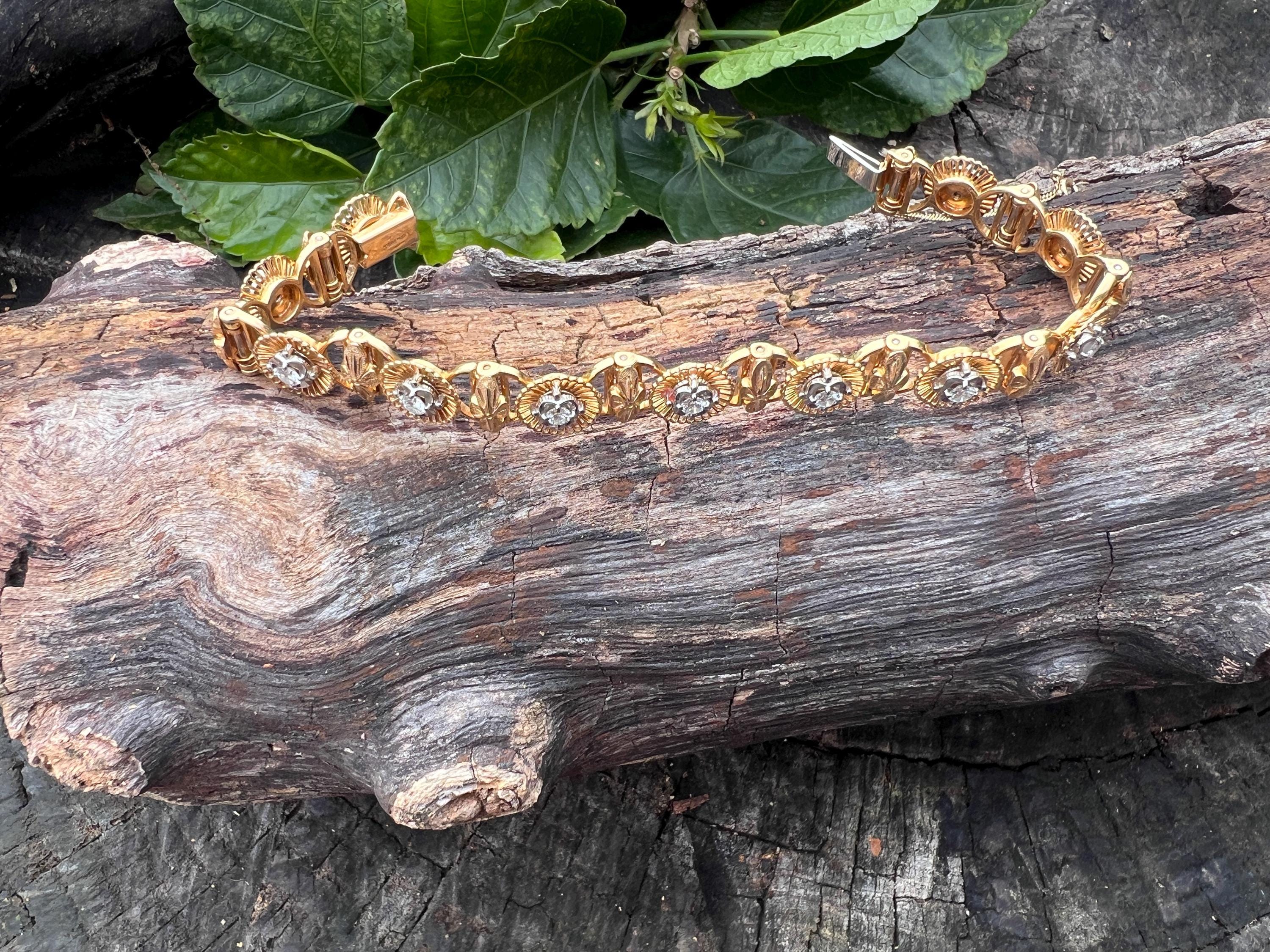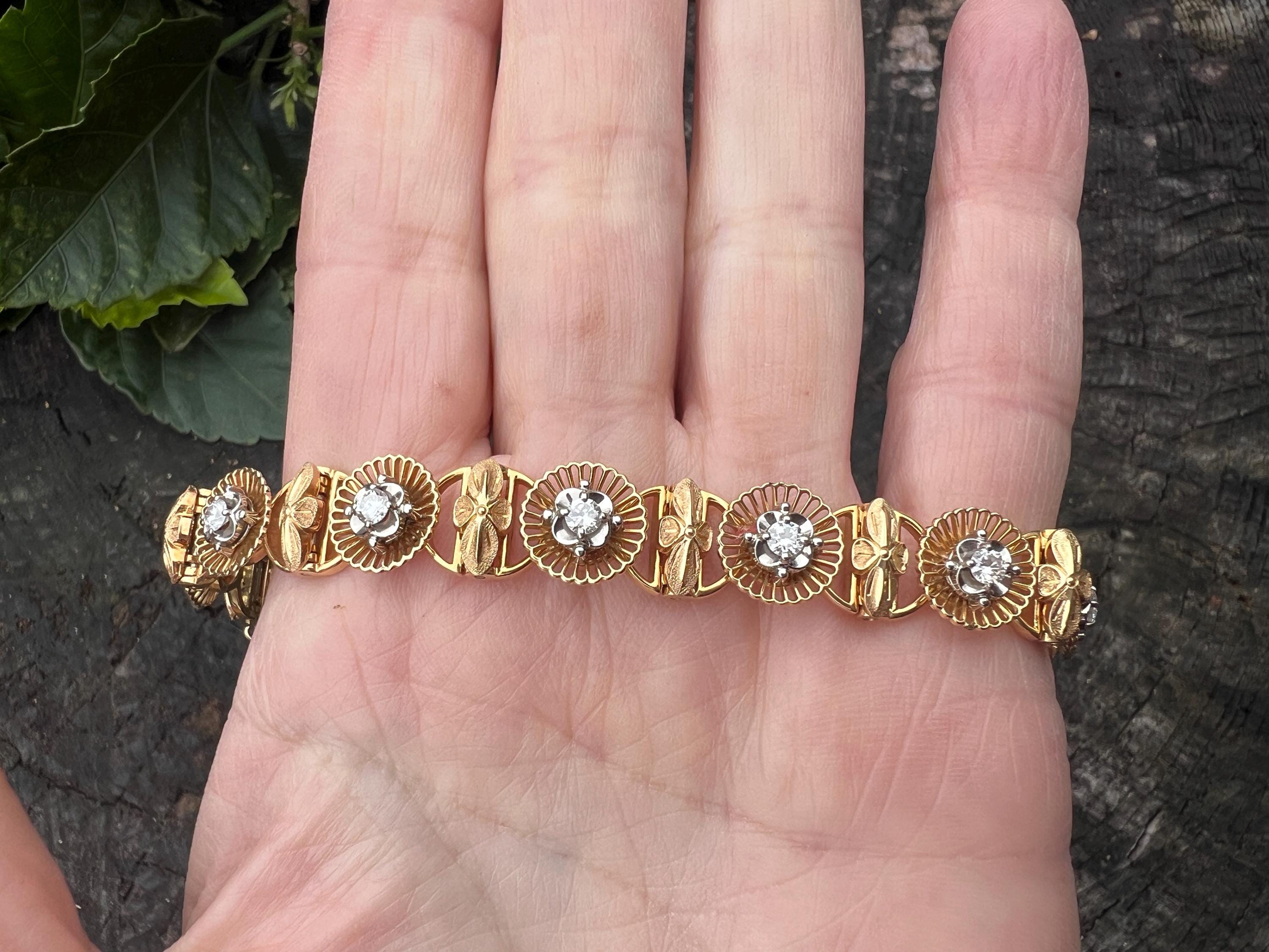 Set in 18k yellow gold this enticing vintage bracelet is the picture of style. It dates from the 1970's. A parade of textured gold floral inspired pinwheels are interwoven between a link with a bow pattern. Each pinwheel holds a dazzling round diamond in the center for bursts of dazzle. The diamonds have a total approx. weight of 1.25 ct of round diamonds. The diamonds are H in color and VS2 in clarity. This piece ignites passion around your wrist. The bracelet weighs 33.74 grams. It measures 7 1/4" long and 3/8" wide. It is marked 18k.