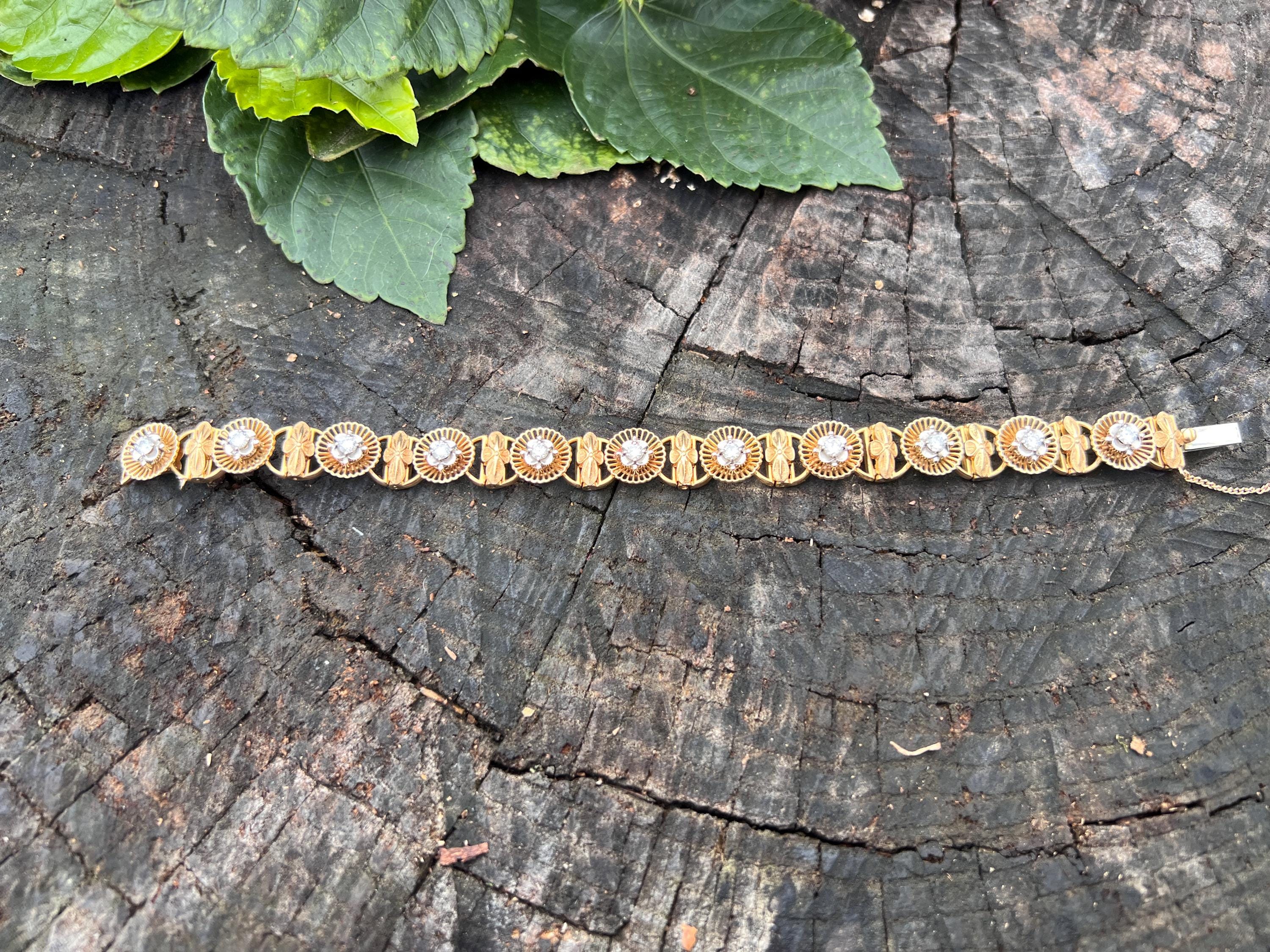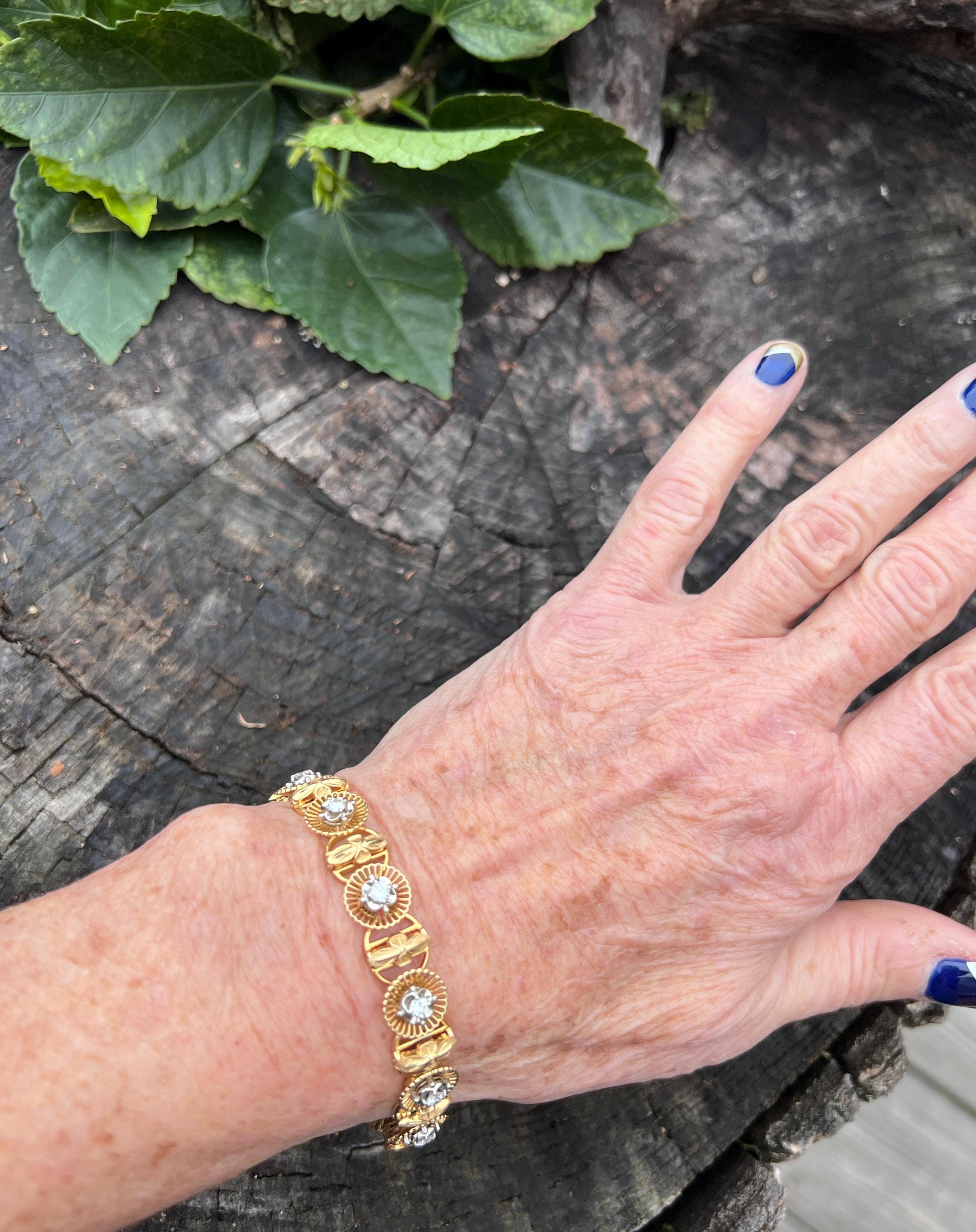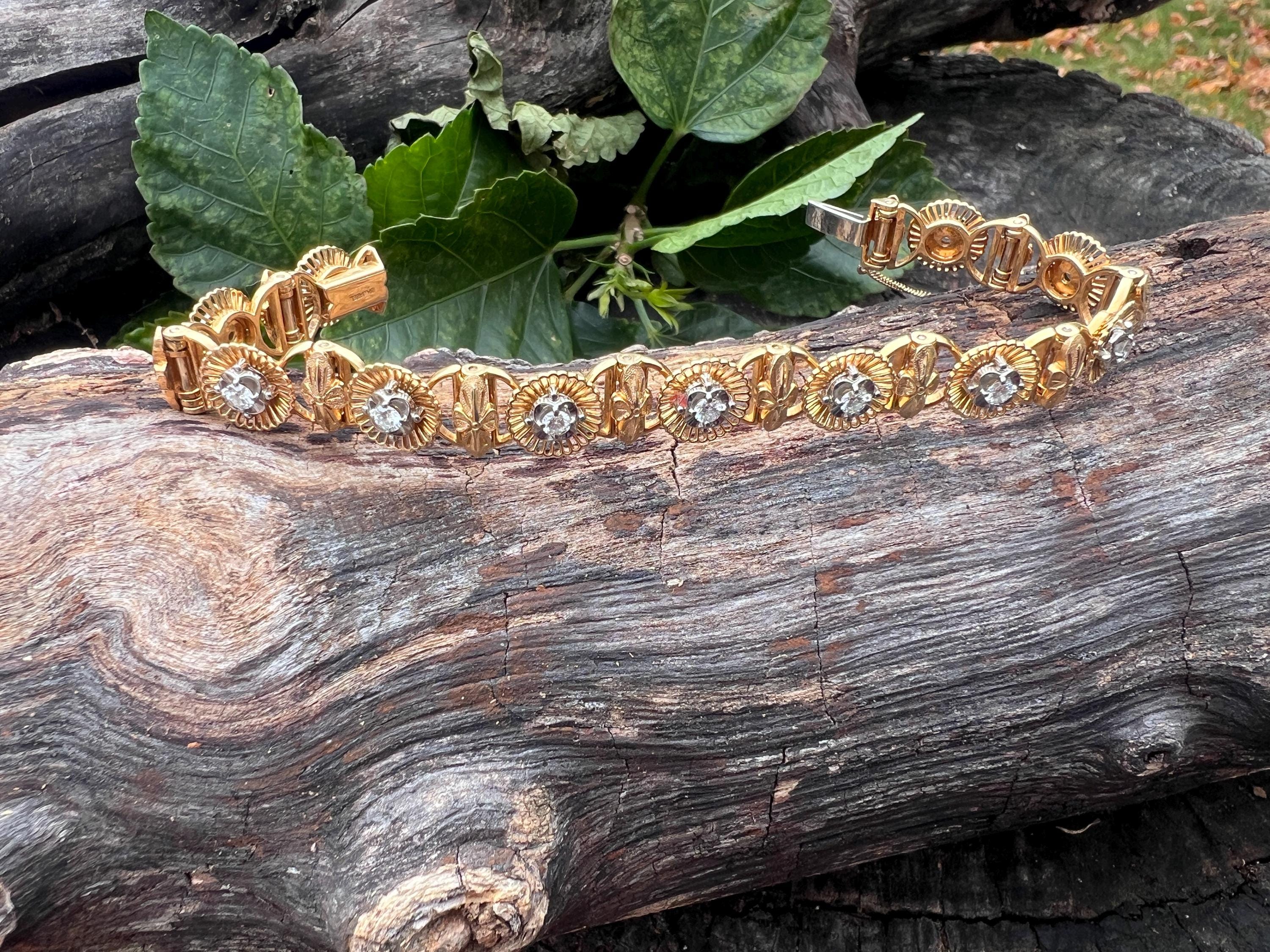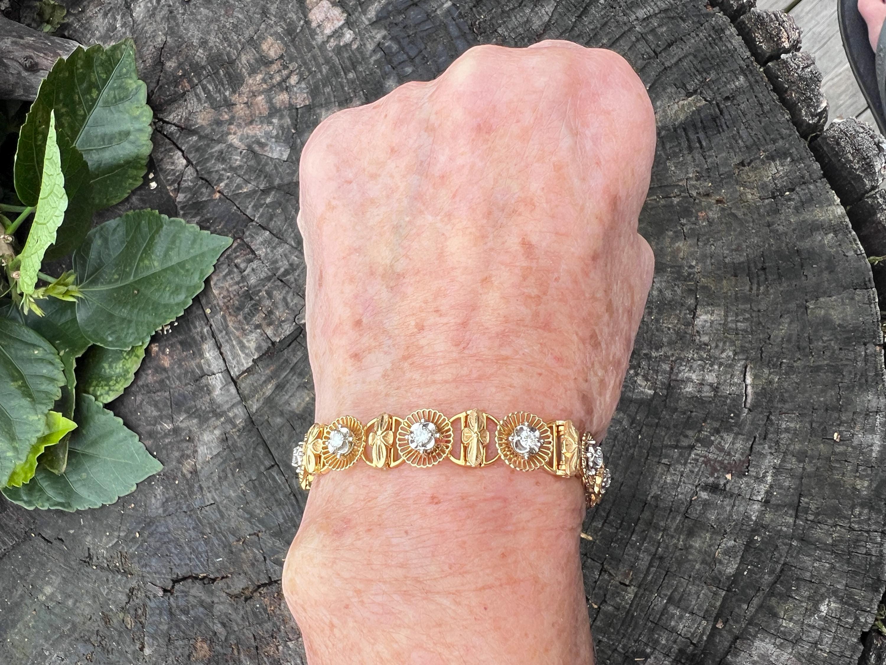 Set in 18k yellow gold this enticing vintage bracelet is the picture of style. It dates from the 1970's. A parade of textured gold floral inspired pinwheels are interwoven between a link with a bow pattern. Each pinwheel holds a dazzling round diamond in the center for bursts of dazzle. The diamonds have a total approx. weight of 1.25 ct of round diamonds. The diamonds are H in color and VS2 in clarity. This piece ignites passion around your wrist. The bracelet weighs 33.74 grams. It measures 7 1/4" long and 3/8" wide. It is marked 18k.