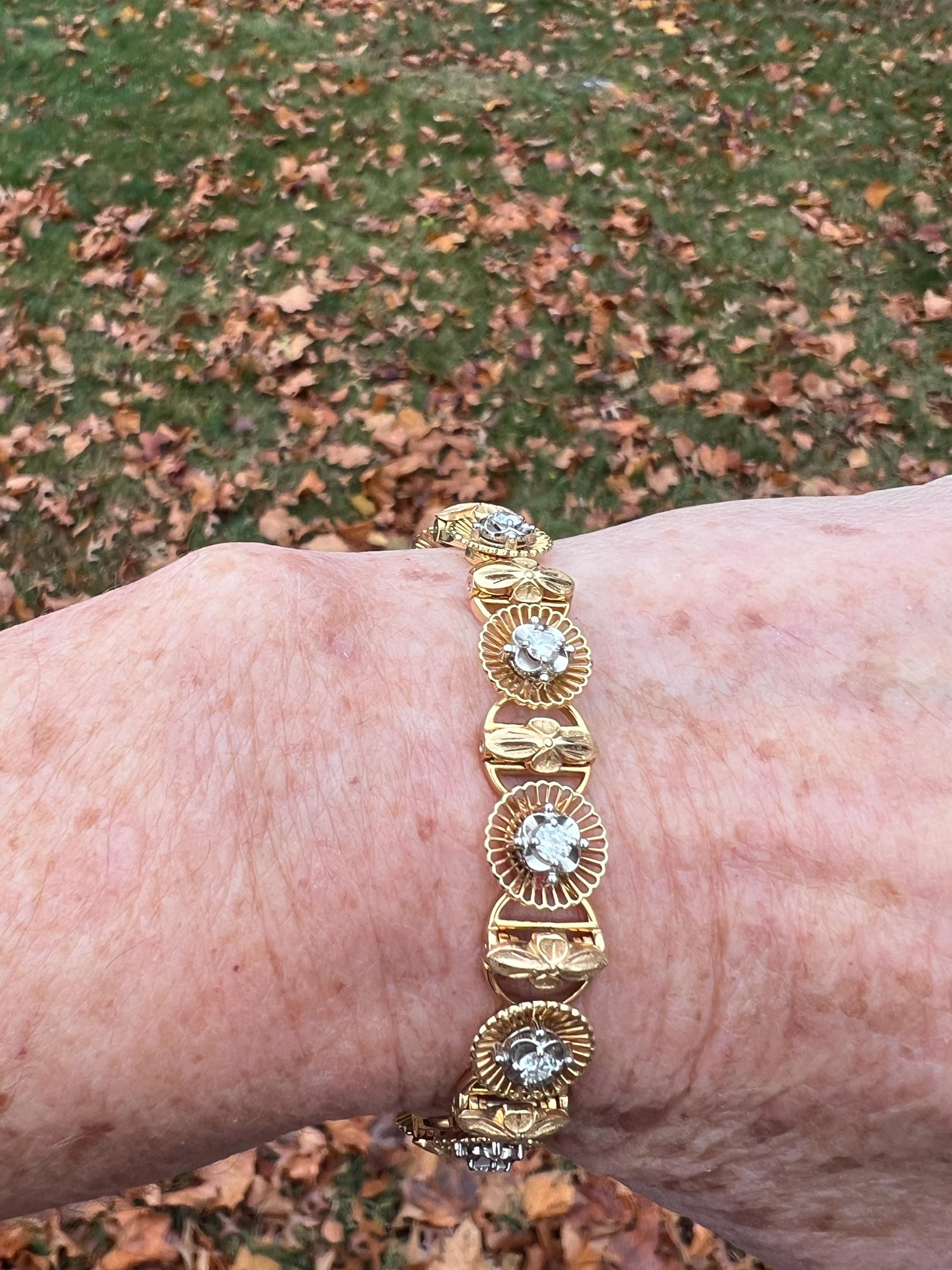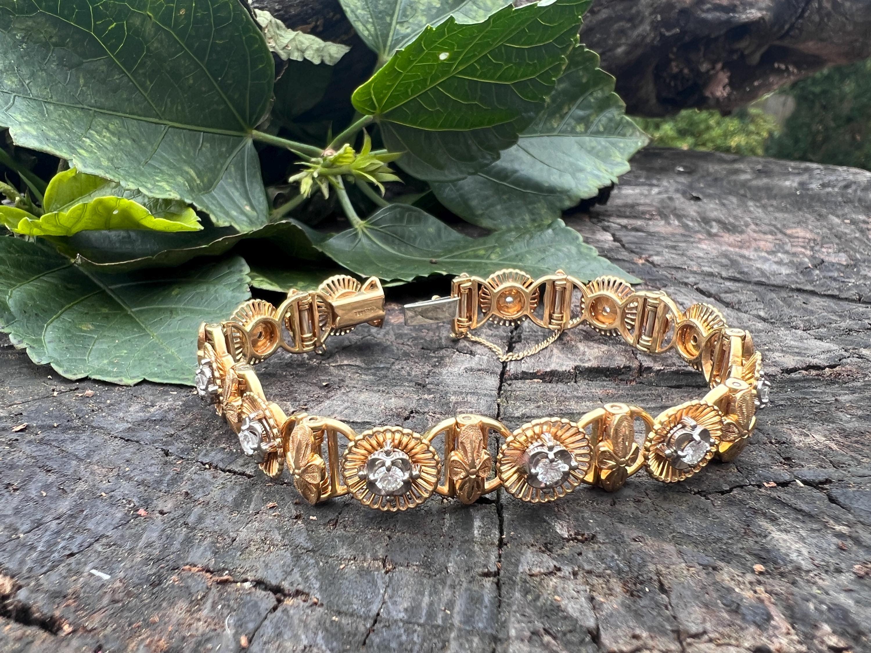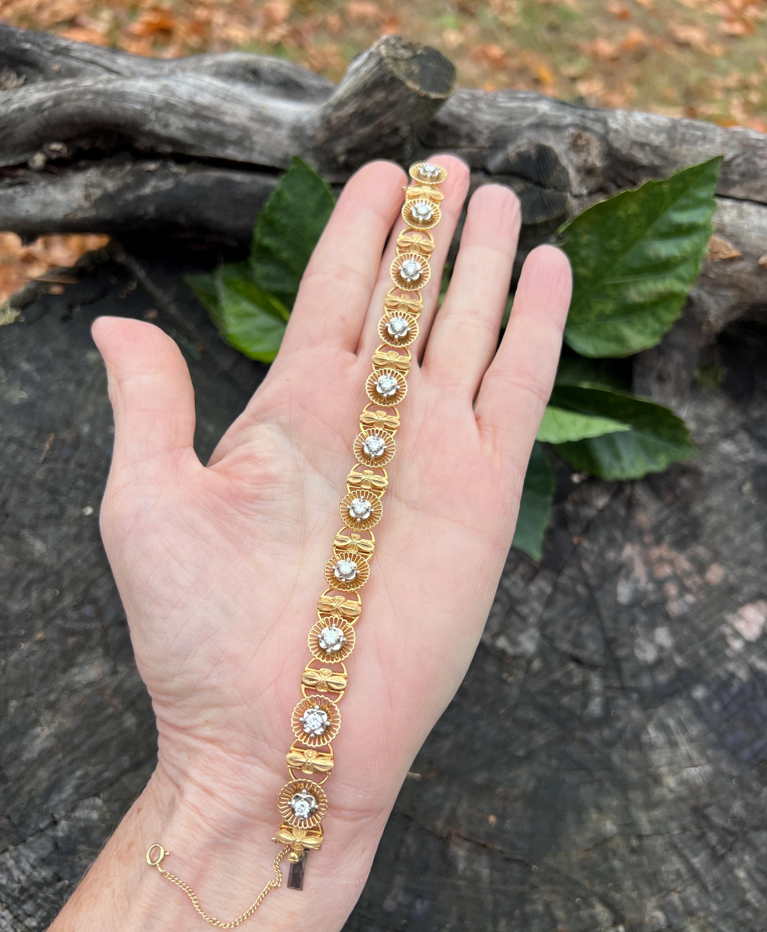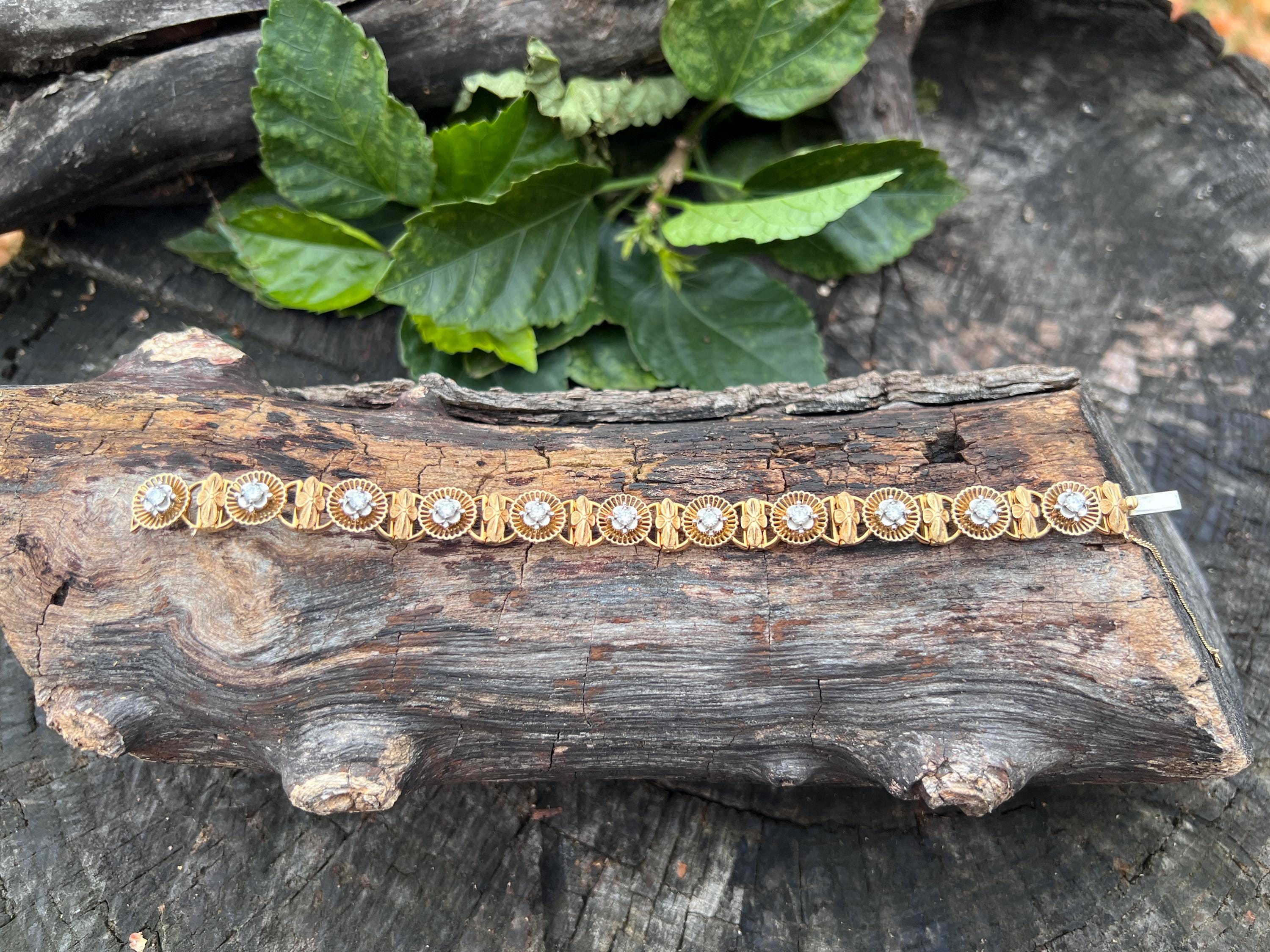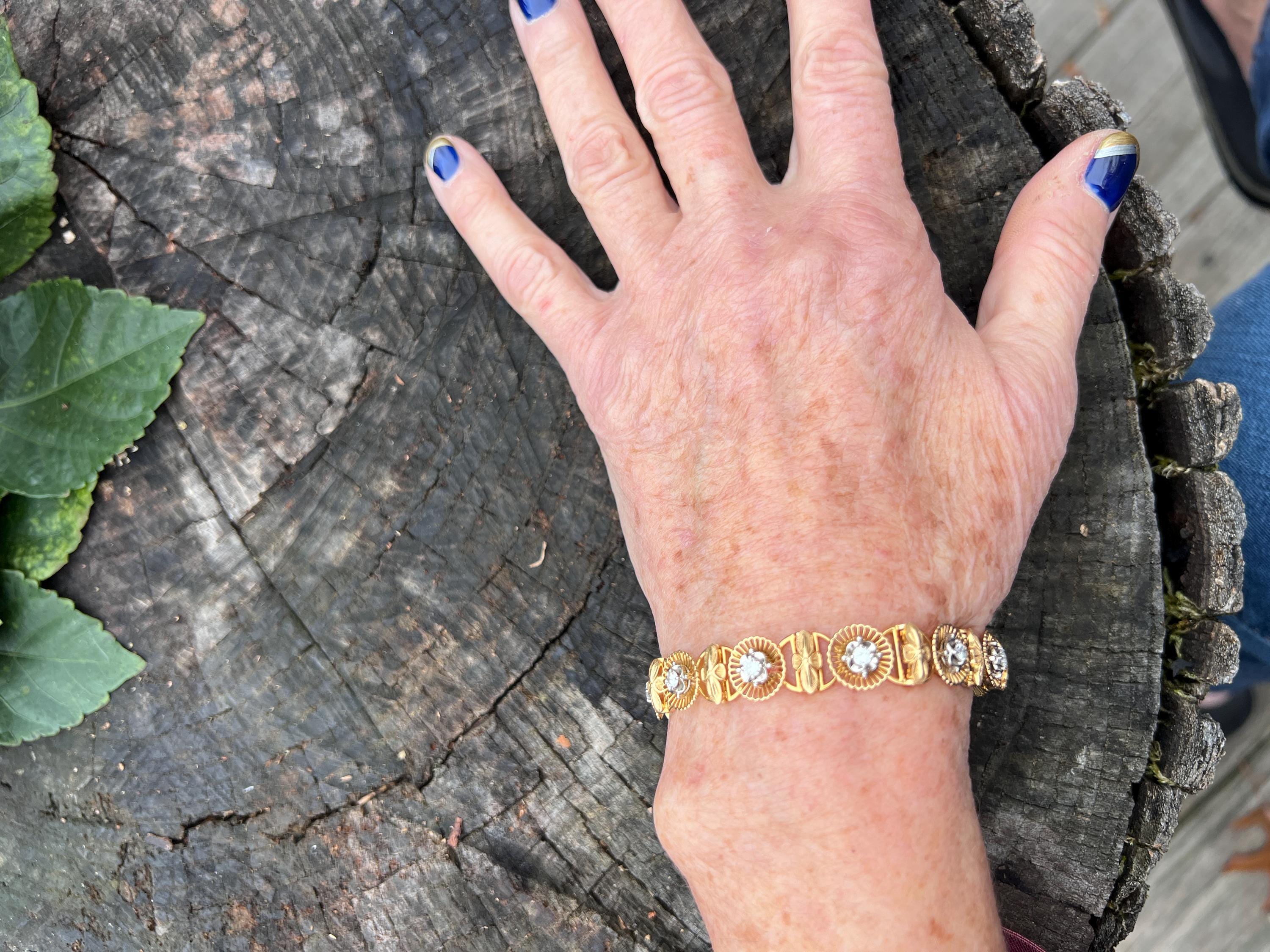 Set in 18k yellow gold this enticing vintage bracelet is the picture of style. It dates from the 1970's. A parade of textured gold floral inspired pinwheels are interwoven between a link with a bow pattern. Each pinwheel holds a dazzling round diamond in the center for bursts of dazzle. The diamonds have a total approx. weight of 1.25 ct of round diamonds. The diamonds are H in color and VS2 in clarity. This piece ignites passion around your wrist. The bracelet weighs 33.74 grams. It measures 7 1/4" long and 3/8" wide. It is marked 18k.