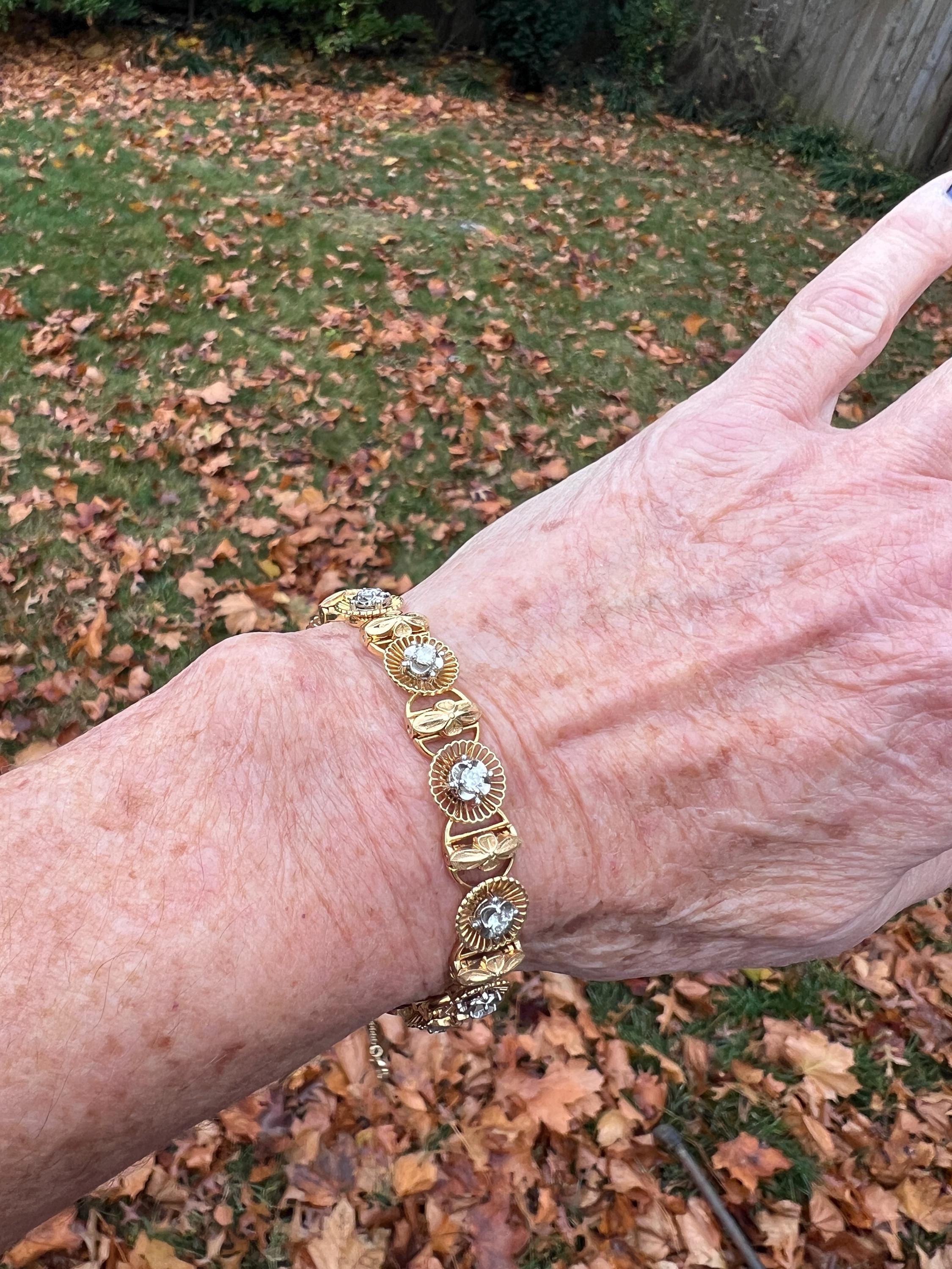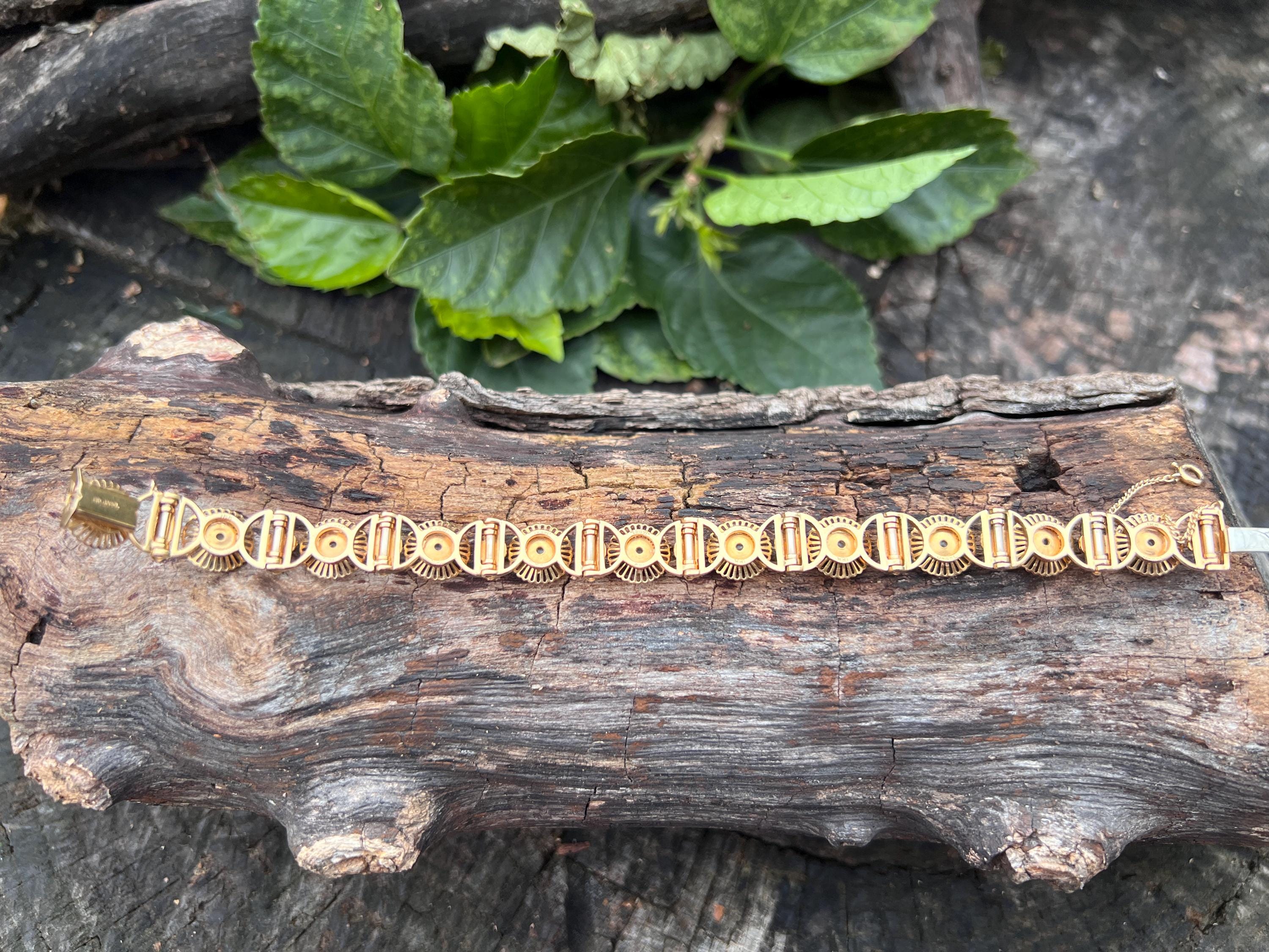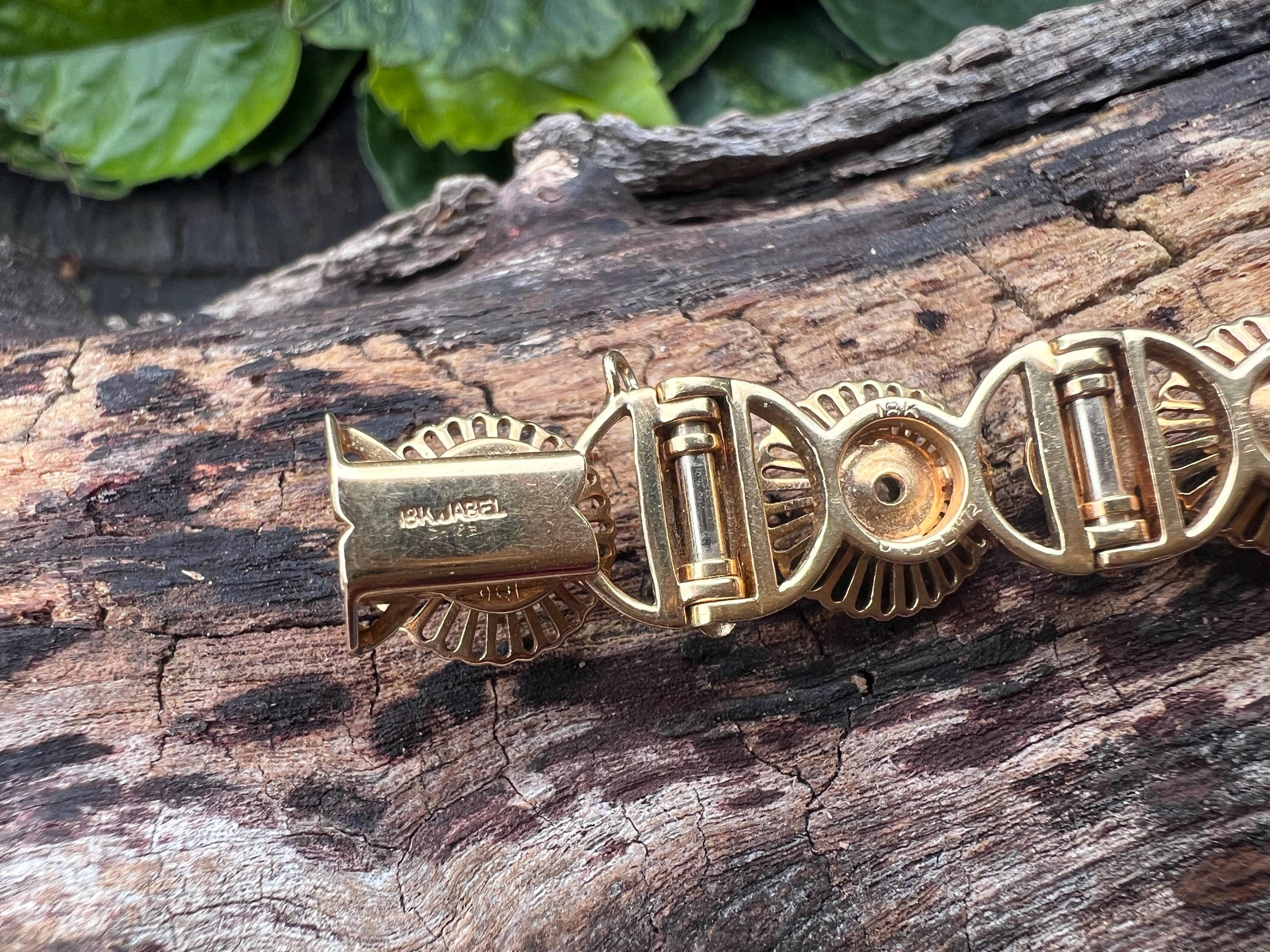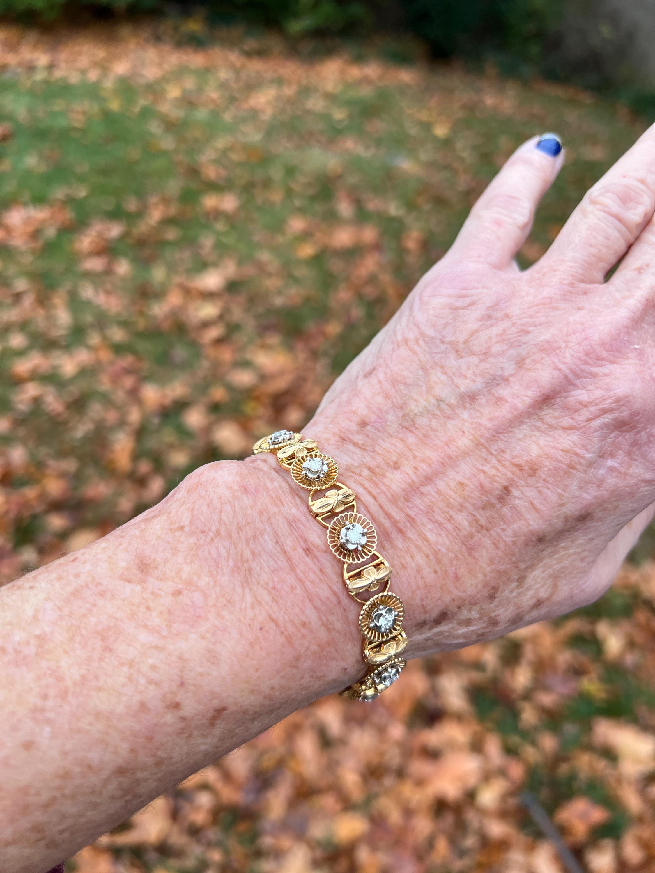 Set in 18k yellow gold this enticing vintage bracelet is the picture of style. It dates from the 1970's. A parade of textured gold floral inspired pinwheels are interwoven between a link with a bow pattern. Each pinwheel holds a dazzling round diamond in the center for bursts of dazzle. The diamonds have a total approx. weight of 1.25 ct of round diamonds. The diamonds are H in color and VS2 in clarity. This piece ignites passion around your wrist. The bracelet weighs 33.74 grams. It measures 7 1/4" long and 3/8" wide. It is marked 18k.