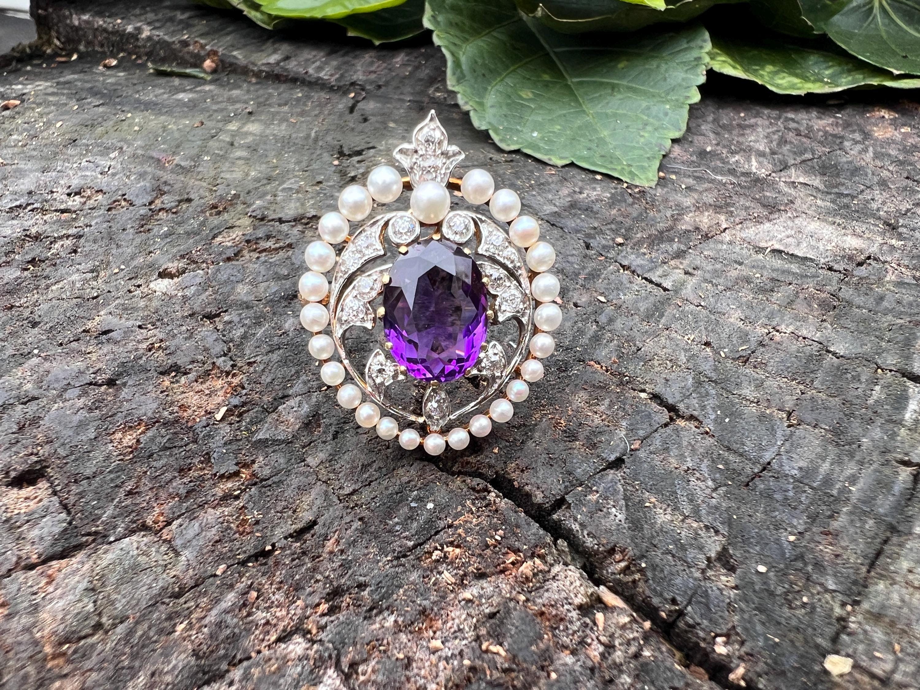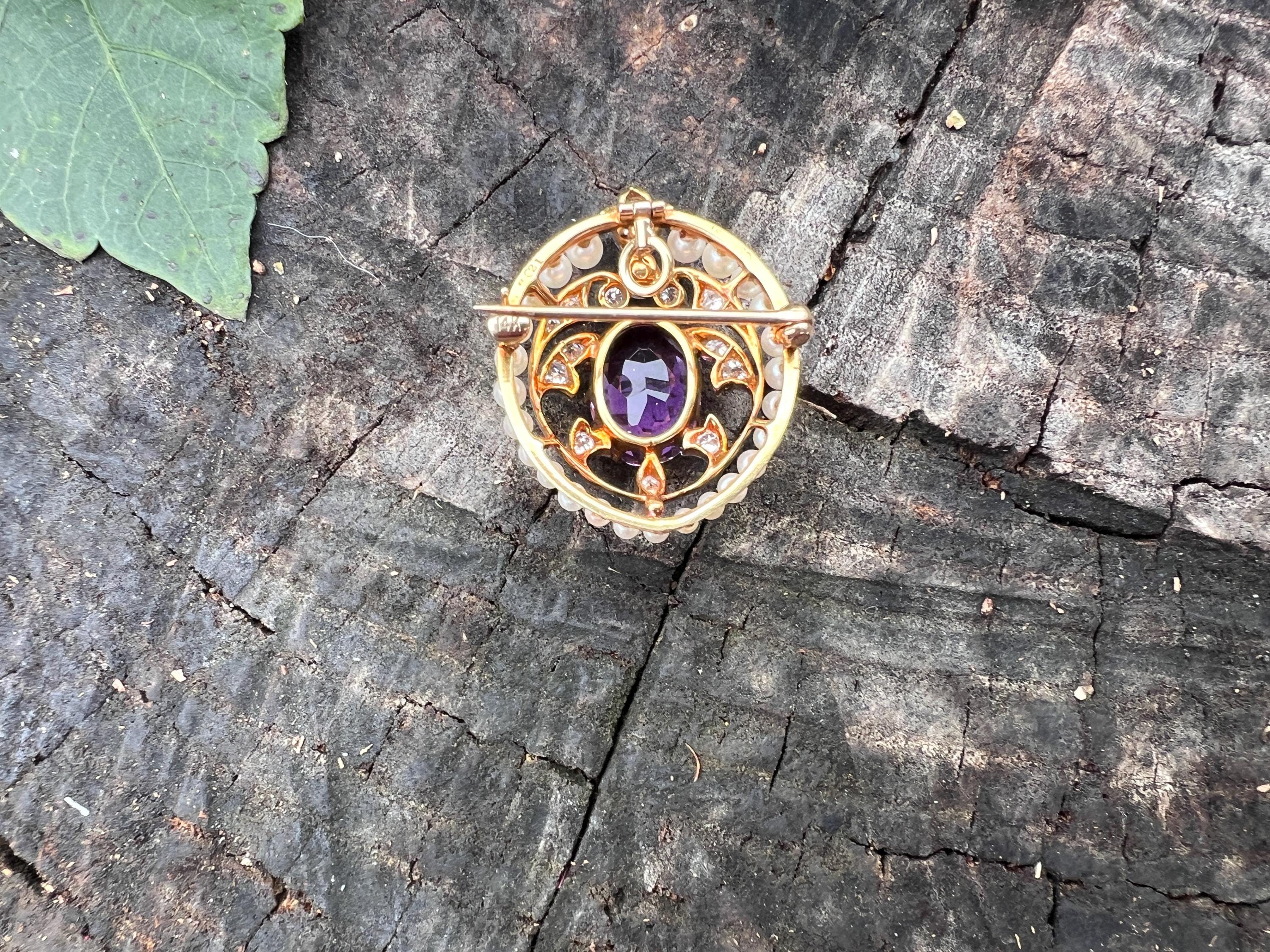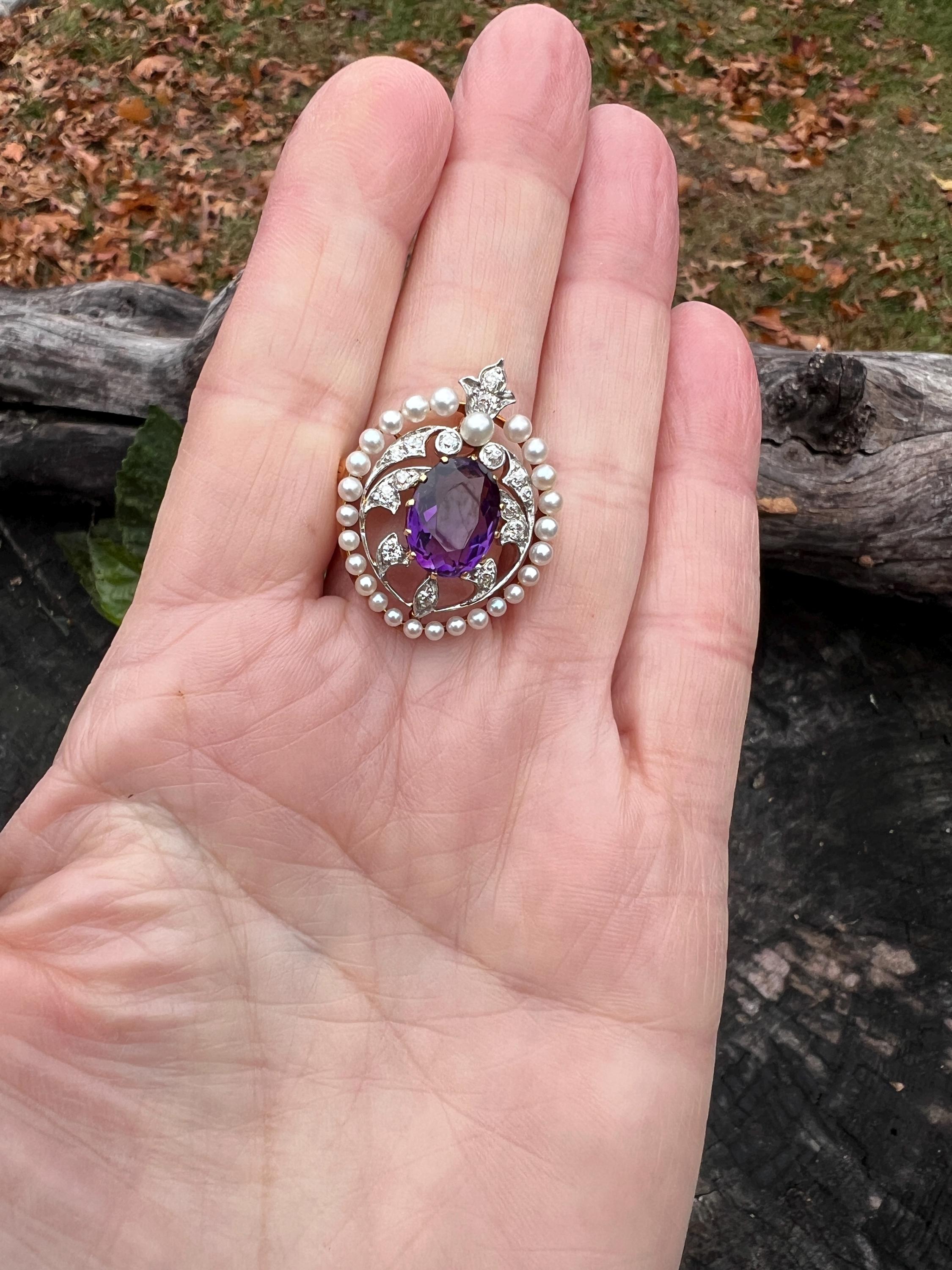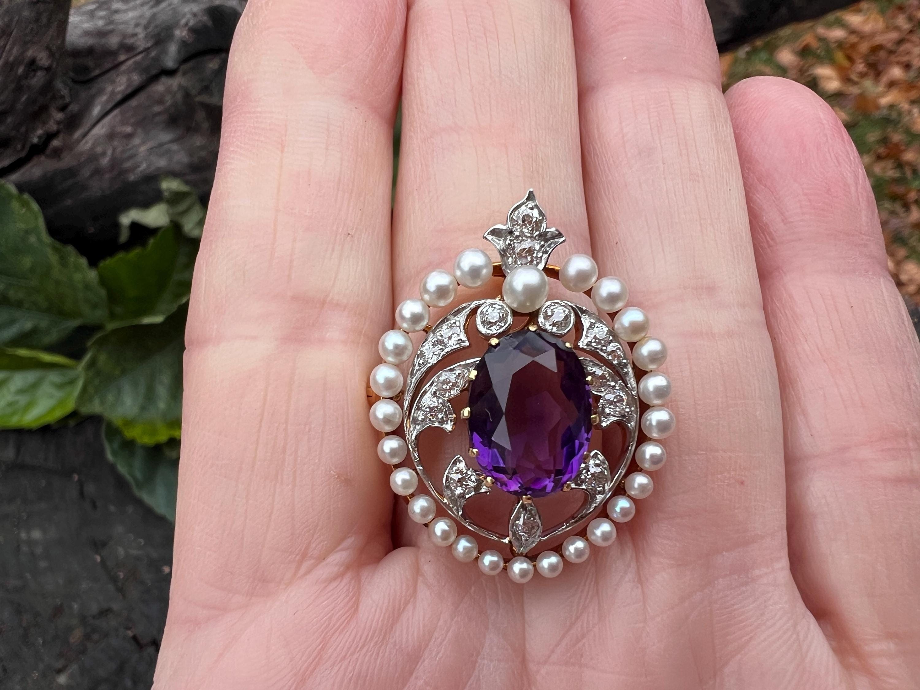 This stunning Edwardian amethyst pin/pedant is chic as it is exquisite. It dates from the early 1900s. It is made in 14k yellow gold with a platinum top. The star of the show is the colossal oval shaped majestically purple amethyst stone. Intensifying the look, the amethyst is complimented by a surge of dazzling diamonds and a halo of lustrous white sea pearls on the top orbiting around the amethyst. The amethyst measures approx. 9 mm x 12 mm. The diamonds have a total approx. weight of .75 ct. The diamonds are G in color and VS2 in clarity. The brooch is tailoring a look of vivid panache. The piece measures 1” x 7/8 ". It weighs 7.59 grams. It can easily be worn as a pin or a pendant. It is marked 14k and JE Caldwell.