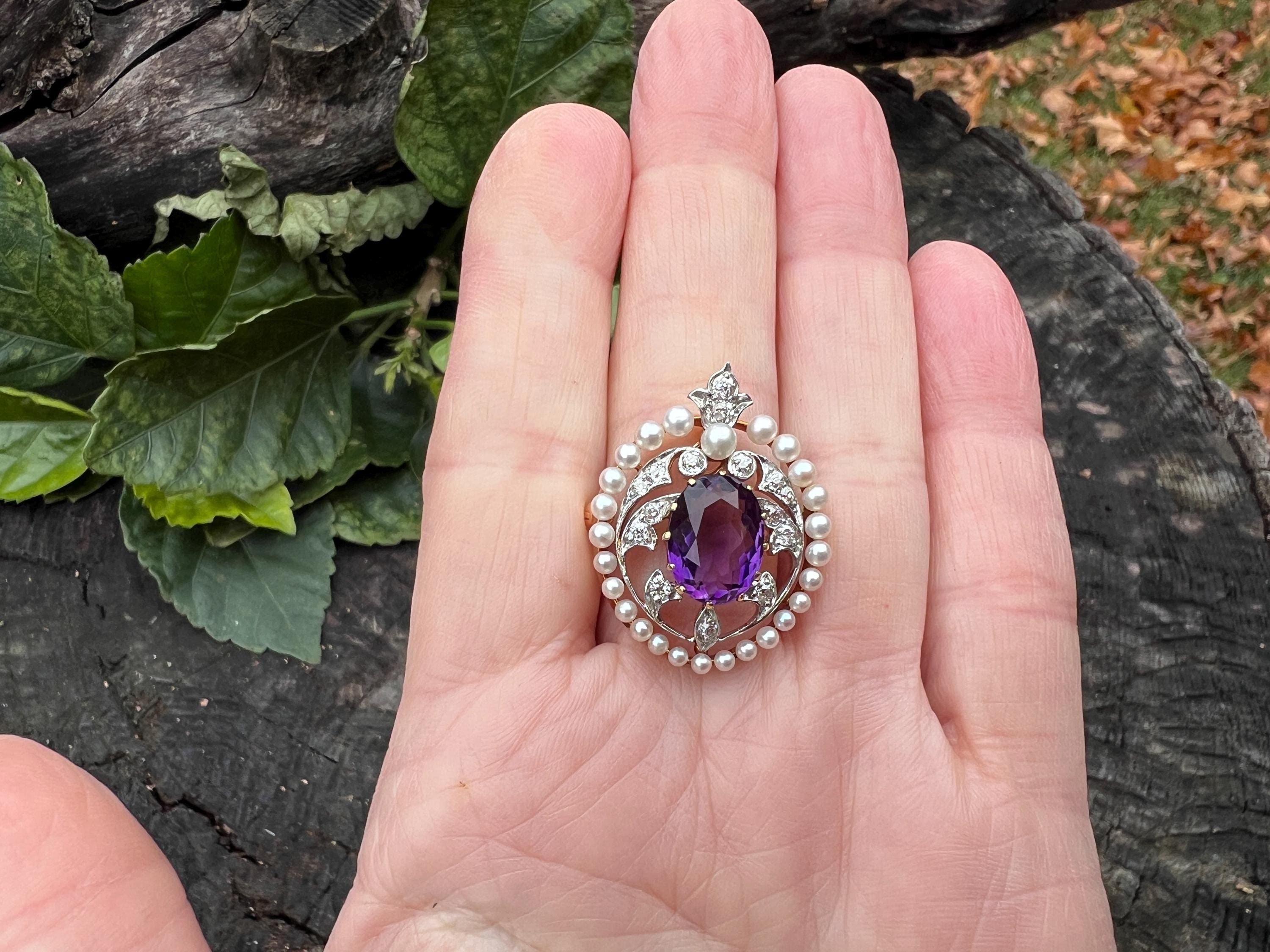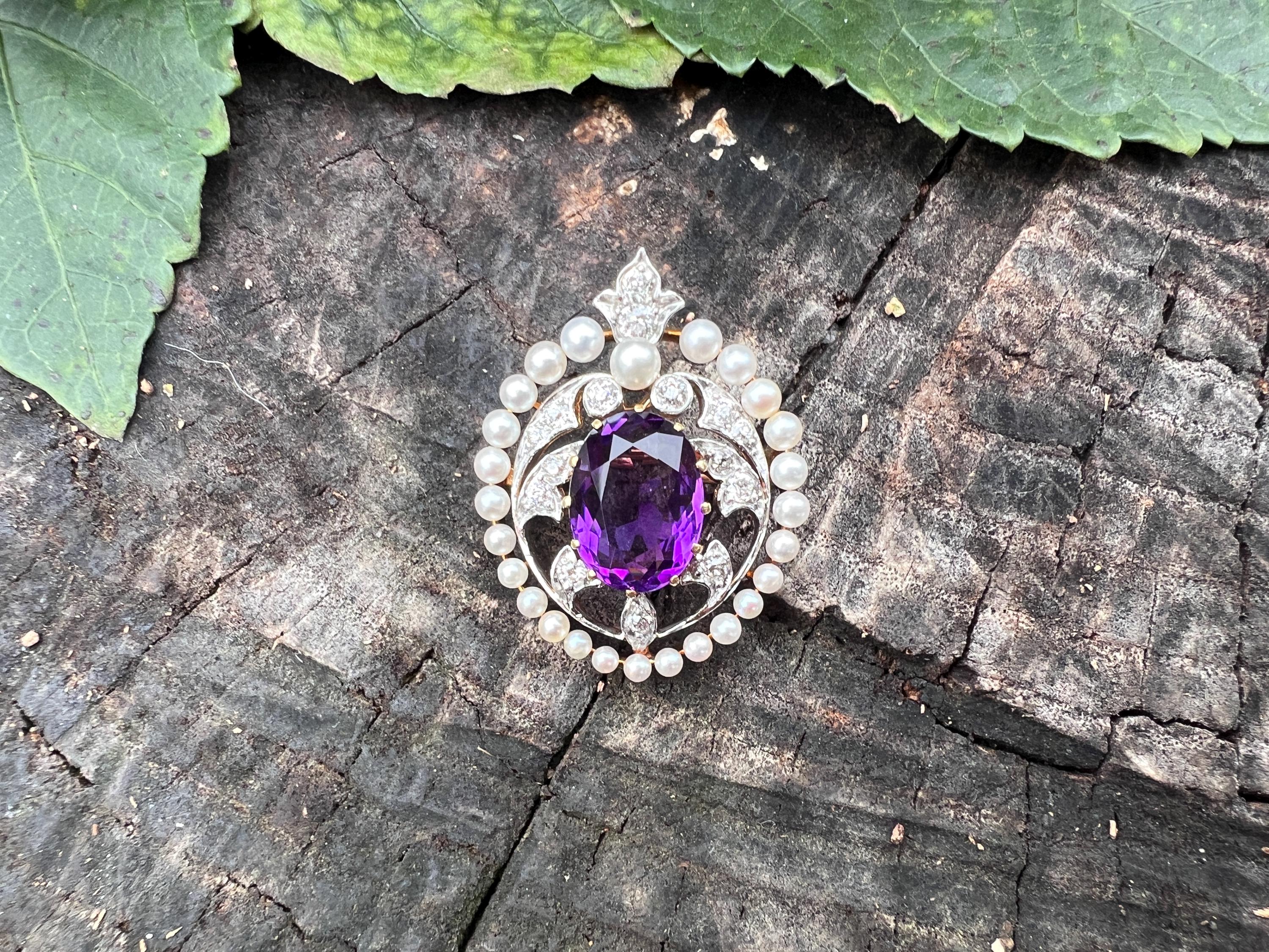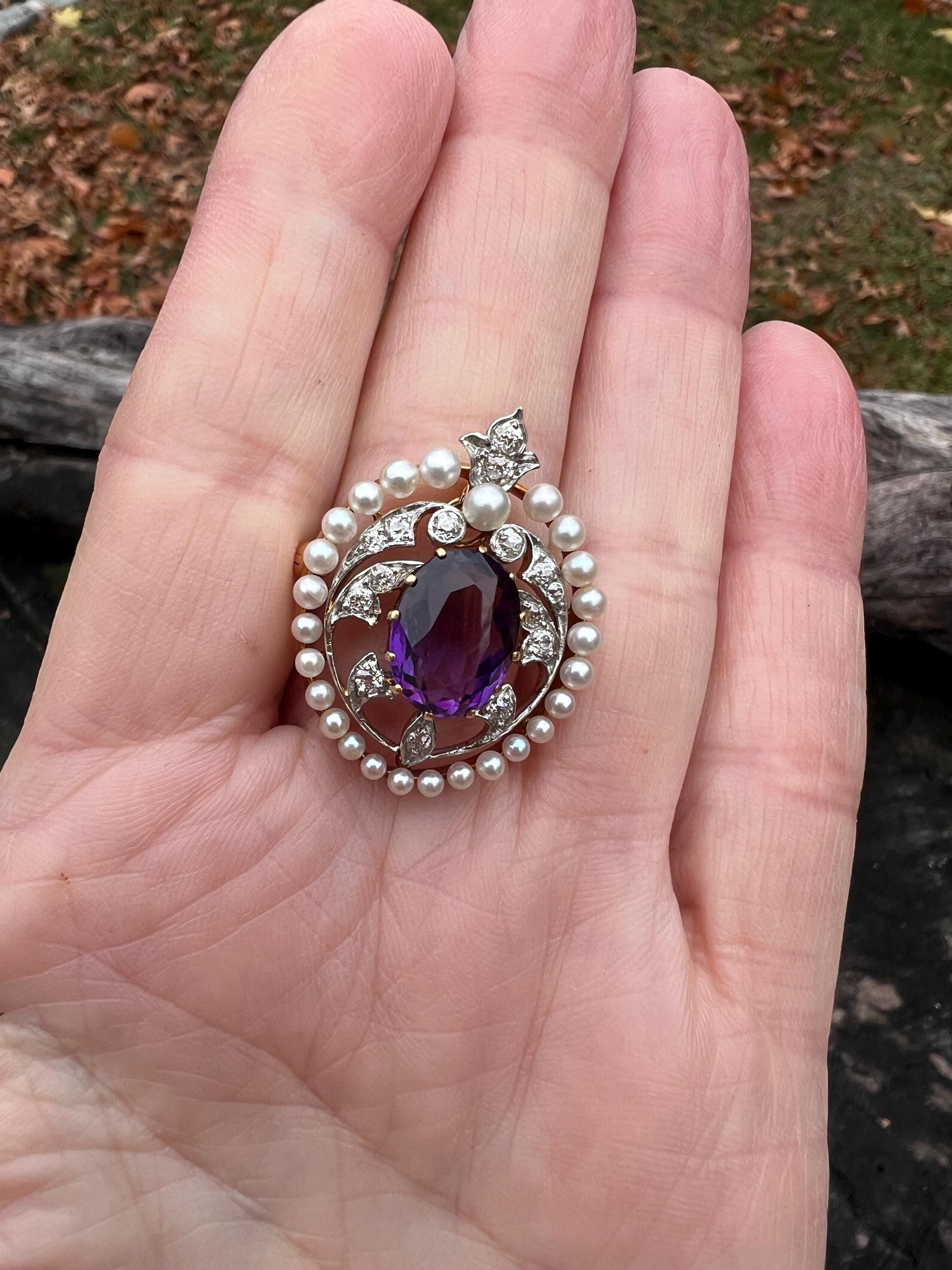 This stunning Edwardian amethyst pin/pedant is chic as it is exquisite. It dates from the early 1900s. It is made in 14k yellow gold with a platinum top. The star of the show is the colossal oval shaped majestically purple amethyst stone. Intensifying the look, the amethyst is complimented by a surge of dazzling diamonds and a halo of lustrous white sea pearls on the top orbiting around the amethyst. The amethyst measures approx. 9 mm x 12 mm. The diamonds have a total approx. weight of .75 ct. The diamonds are G in color and VS2 in clarity. The brooch is tailoring a look of vivid panache. The piece measures 1” x 7/8 ". It weighs 7.59 grams. It can easily be worn as a pin or a pendant. It is marked 14k and JE Caldwell.