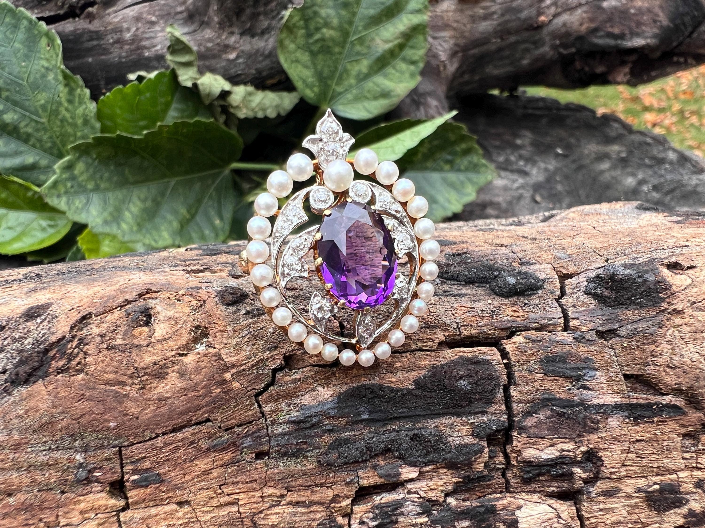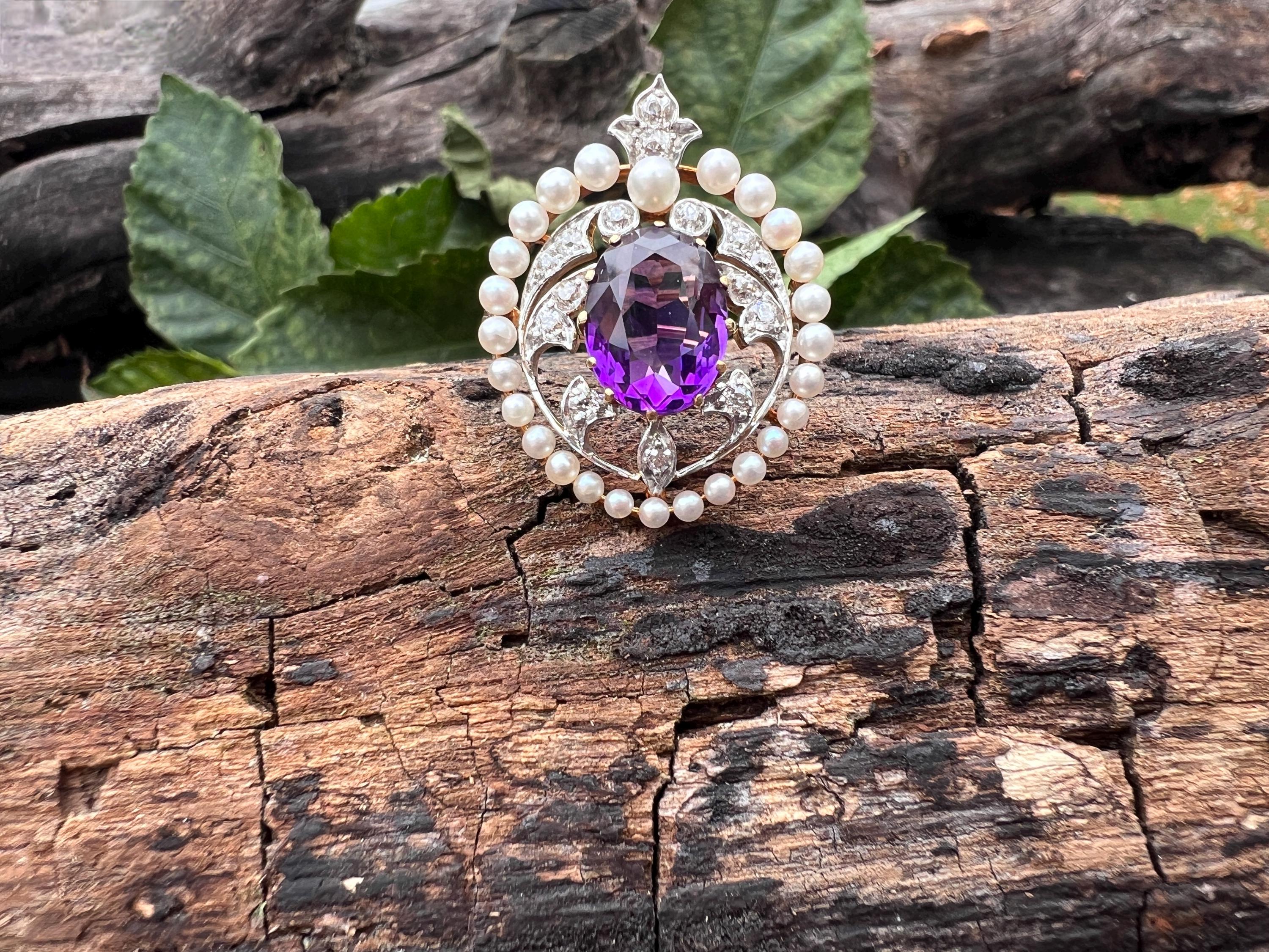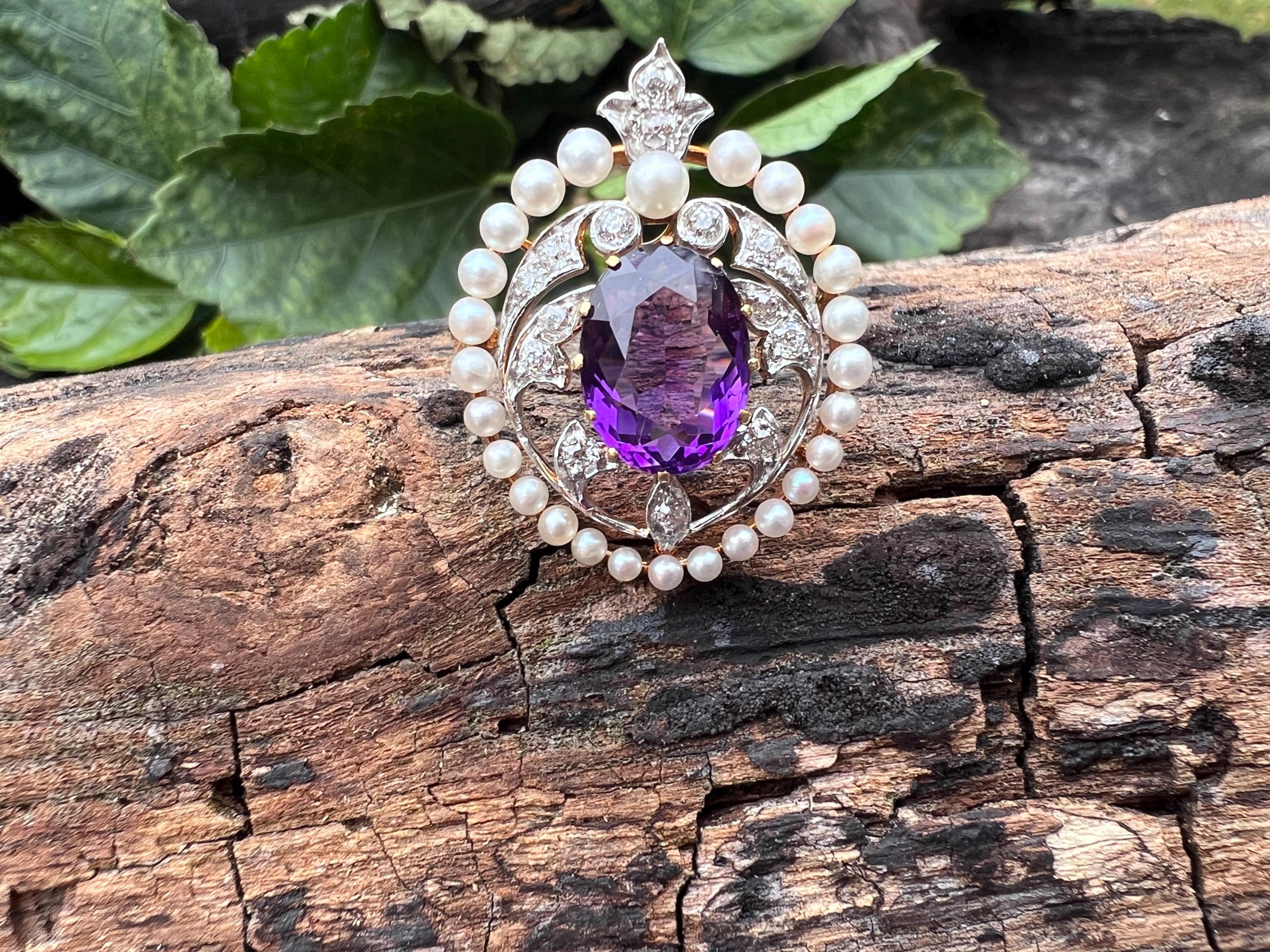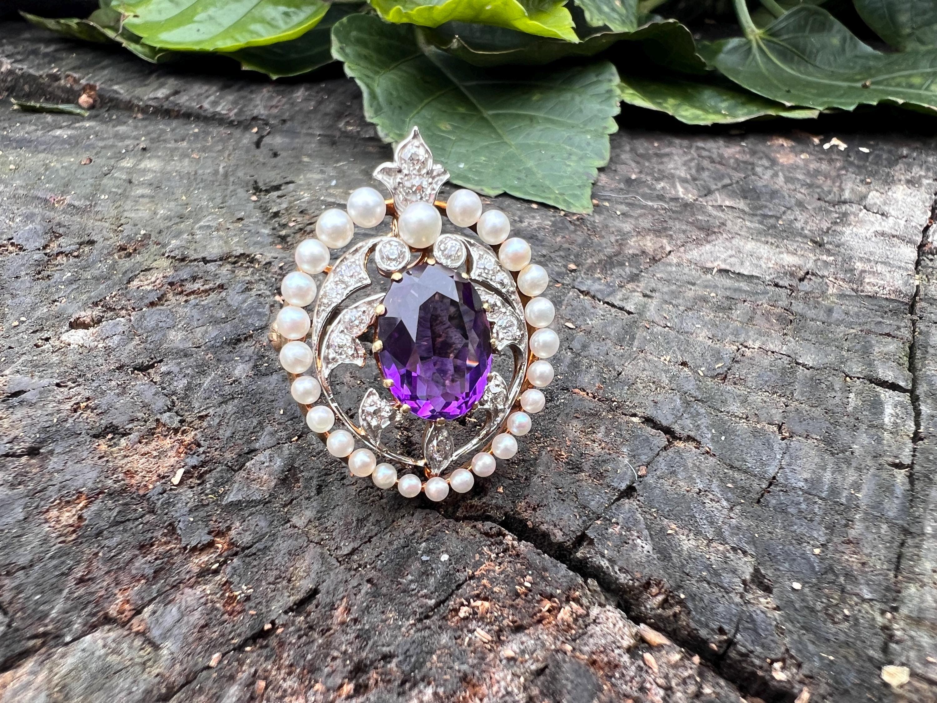 This stunning Edwardian amethyst pin/pedant is chic as it is exquisite. It dates from the early 1900s. It is made in 14k yellow gold with a platinum top. The star of the show is the colossal oval shaped majestically purple amethyst stone. Intensifying the look, the amethyst is complimented by a surge of dazzling diamonds and a halo of lustrous white sea pearls on the top orbiting around the amethyst. The amethyst measures approx. 9 mm x 12 mm. The diamonds have a total approx. weight of .75 ct. The diamonds are G in color and VS2 in clarity. The brooch is tailoring a look of vivid panache. The piece measures 1” x 7/8 ". It weighs 7.59 grams. It can easily be worn as a pin or a pendant. It is marked 14k and JE Caldwell.