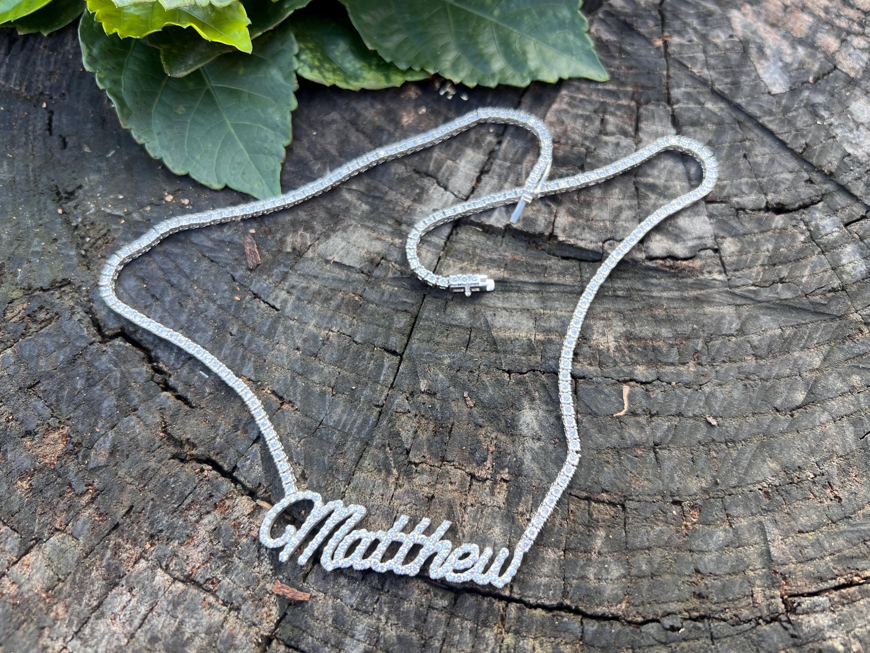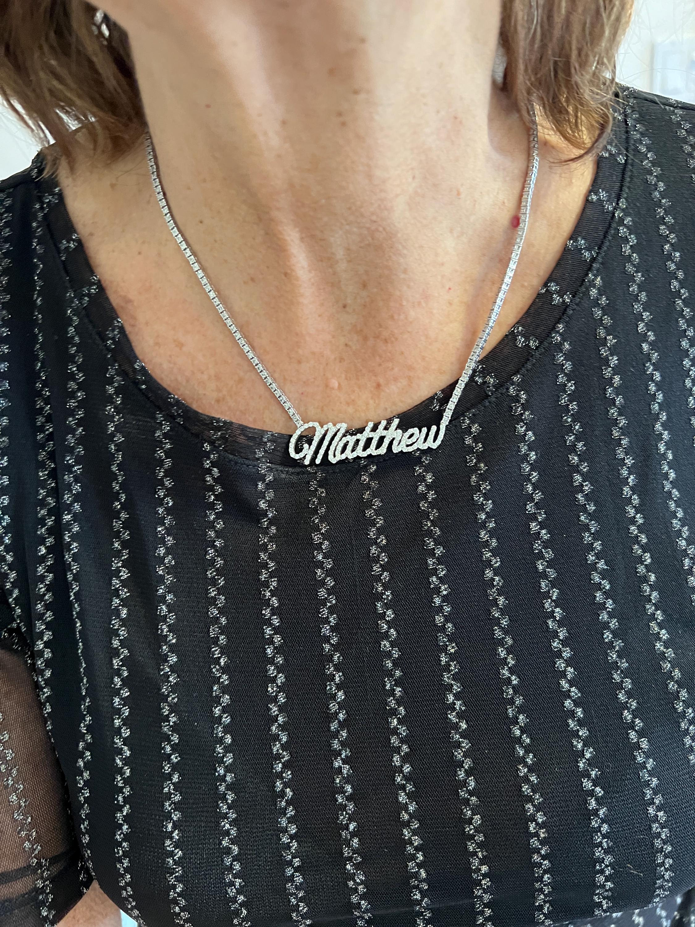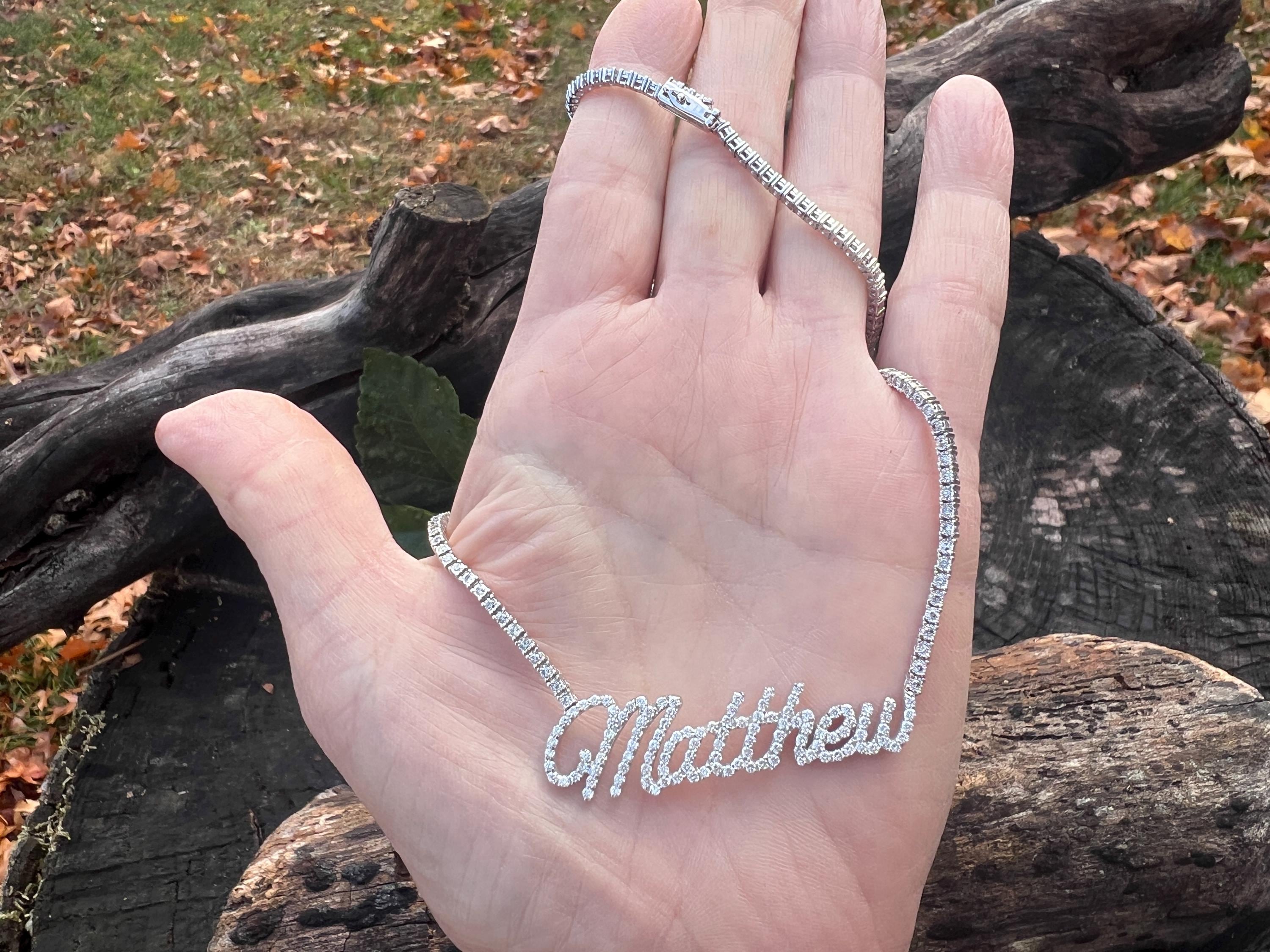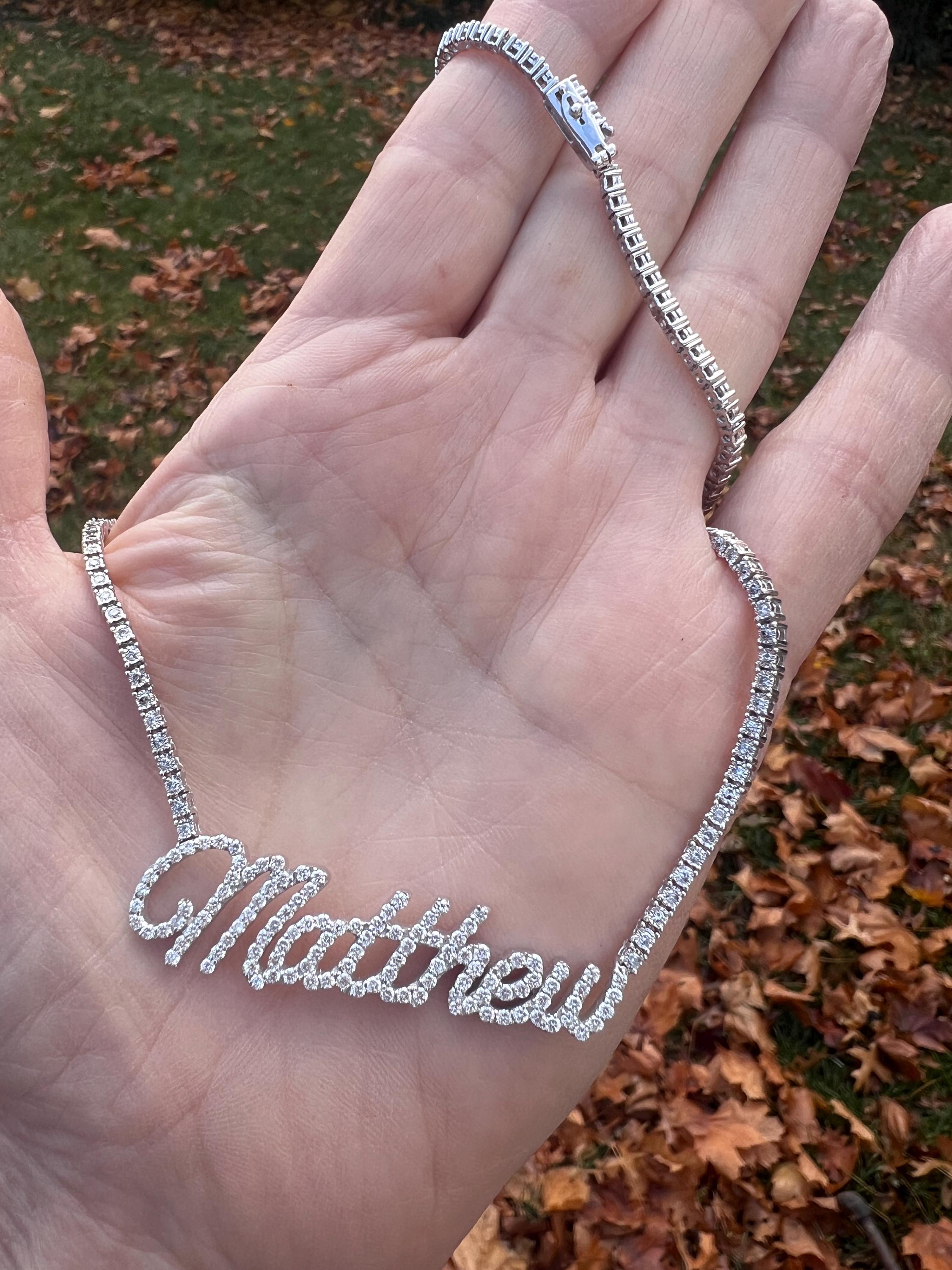 Crafted in 10k/14k white gold, this fabulous diamond Matthew pendant is a unique one. The large "Matthew" studded in diamonds is attached to diamond chain bringing blinding dazzle to your neck. It all comes together to form the special and out of the ordinary Matthew nameplate. The chain is 10k white gold and the name is 14k white gold. The diamonds in the chain have a total approx. weight of 3.00 ct. The diamonds in Matthew have a total approx. weight of 1.75 ct. The total diamond weight of the piece is approx. 4.75 ct. The diamonds are H in color and SI1 in clarity. The entire piece weighs 20.43 grams. The chain measures 16" x 1/16". Matthew measures 2" x 1/2".