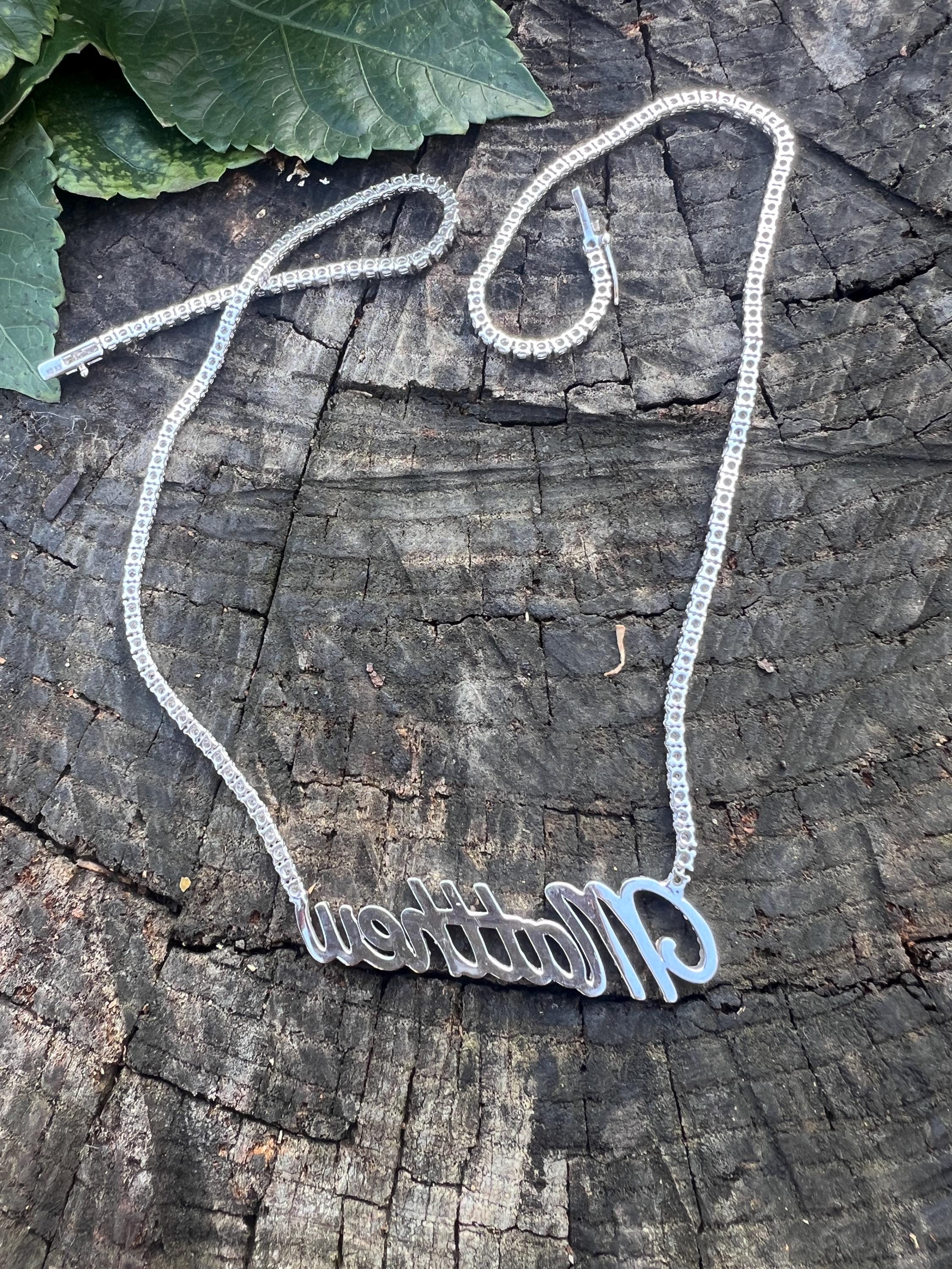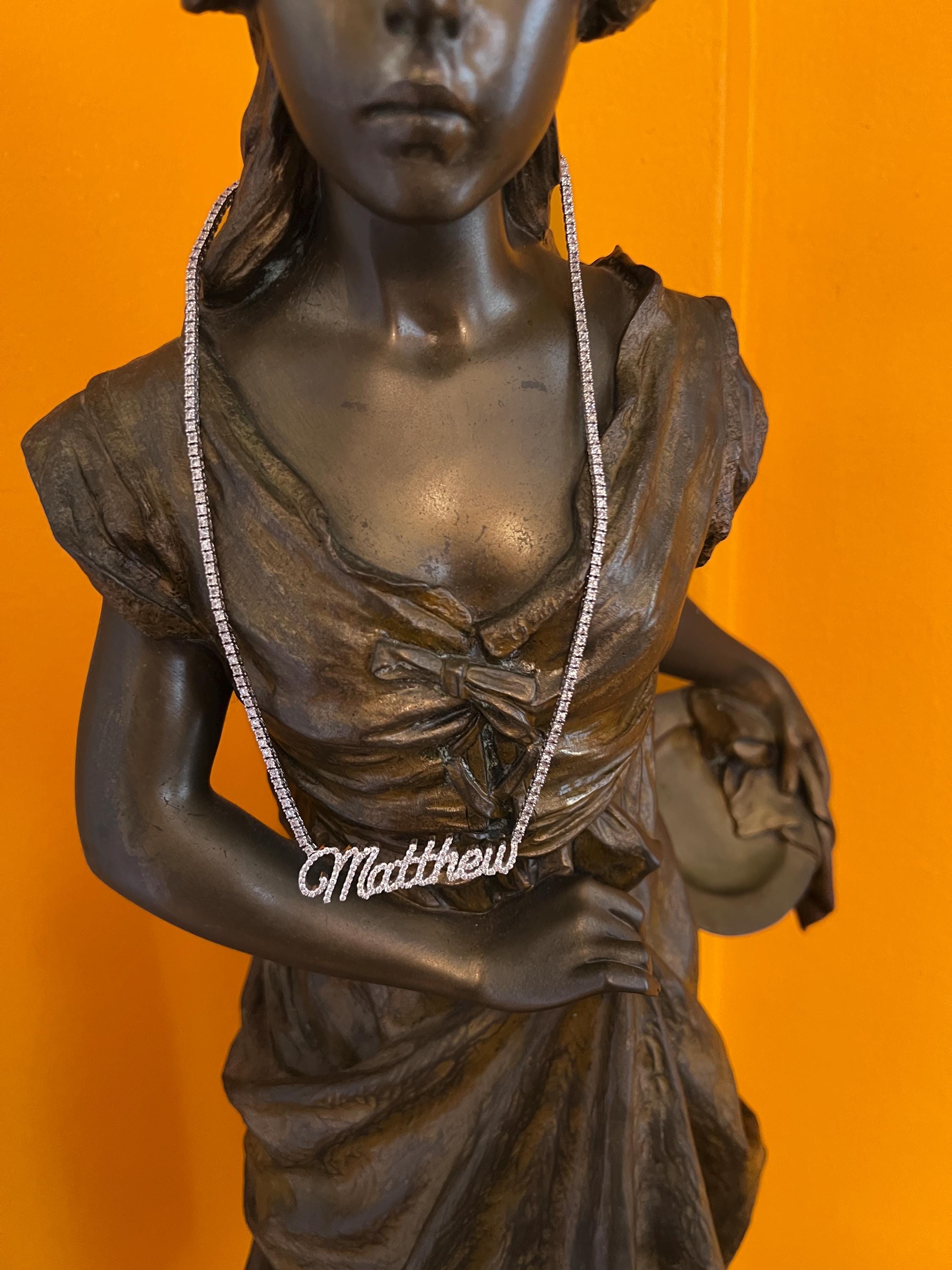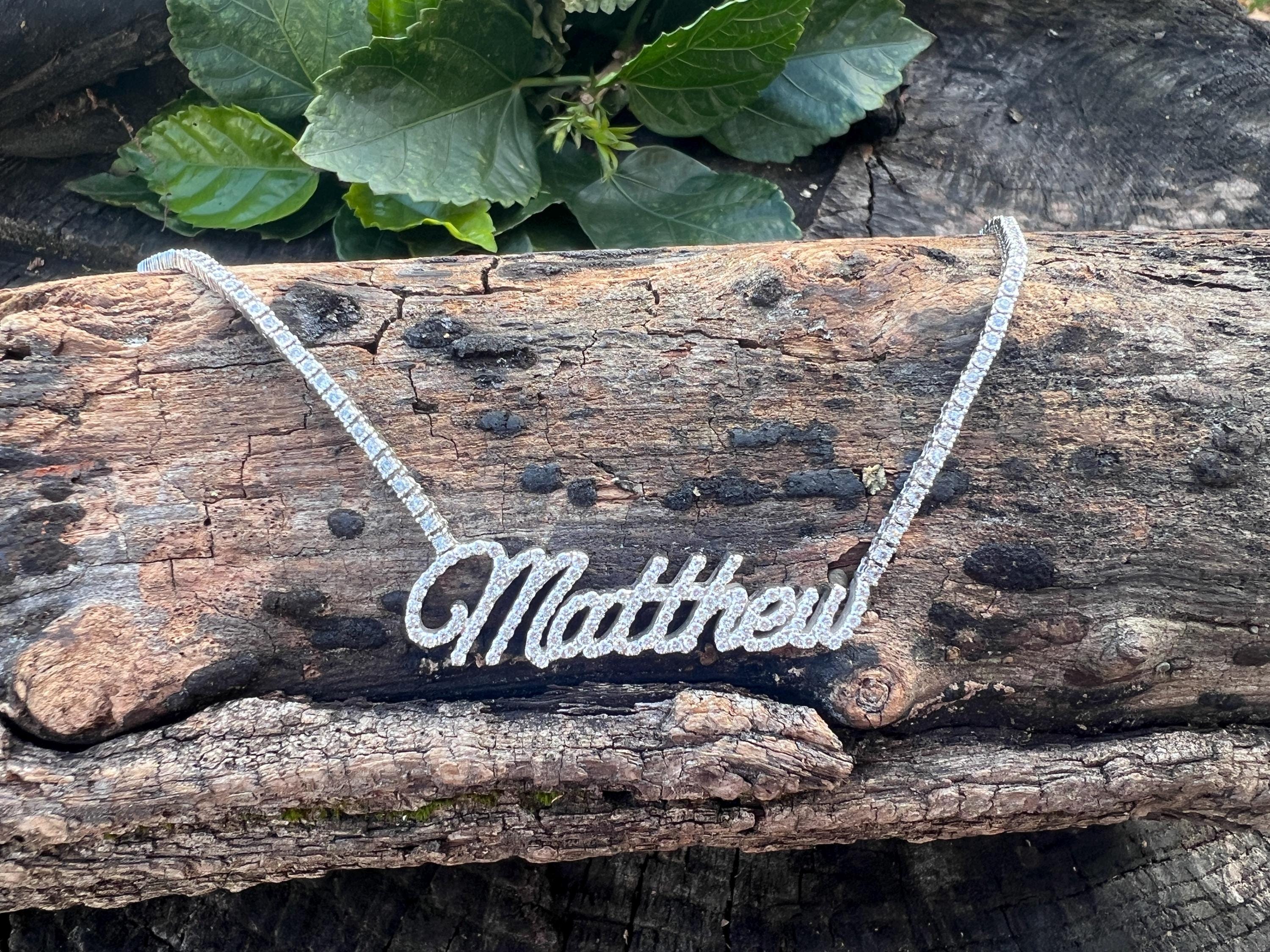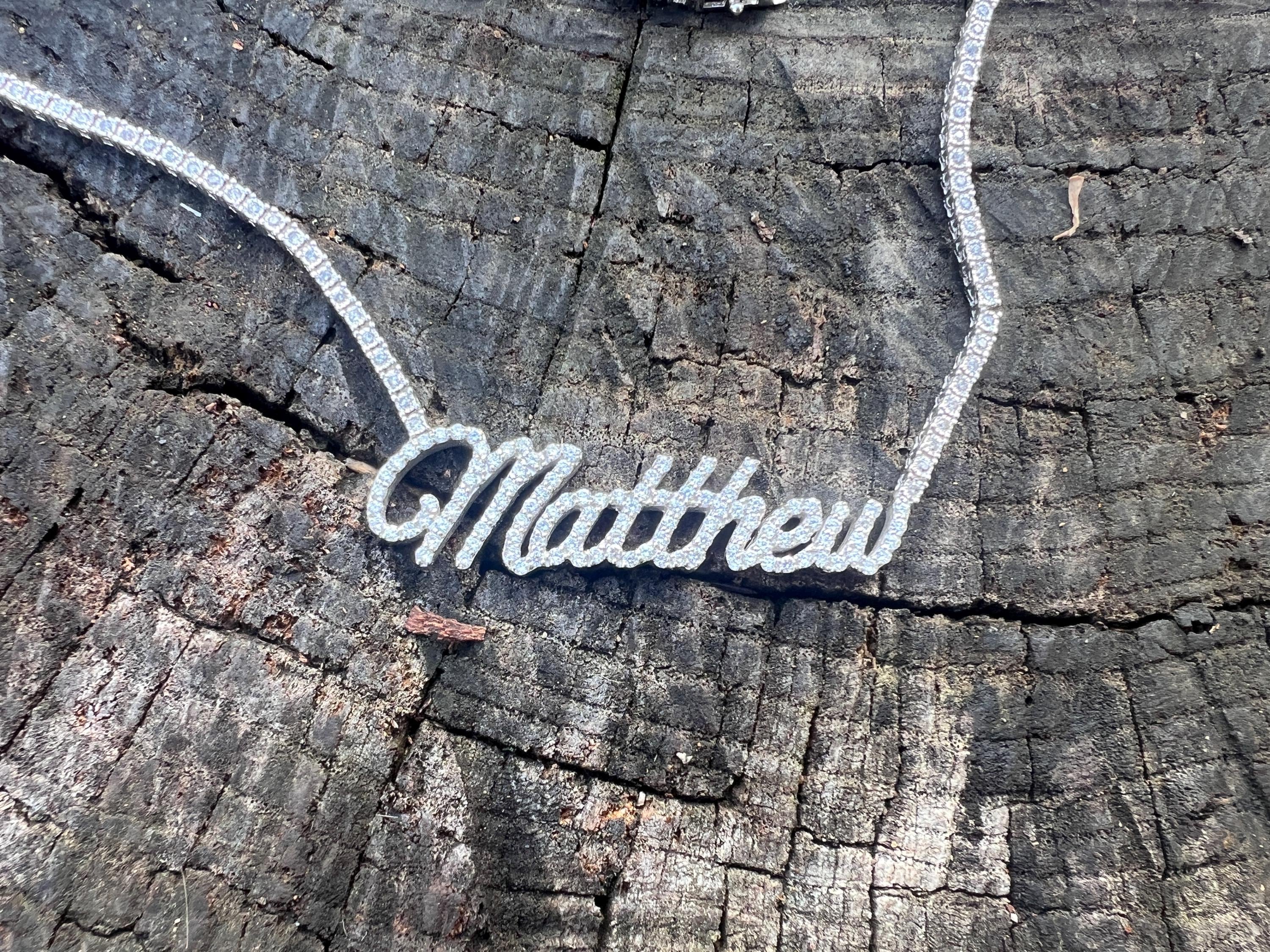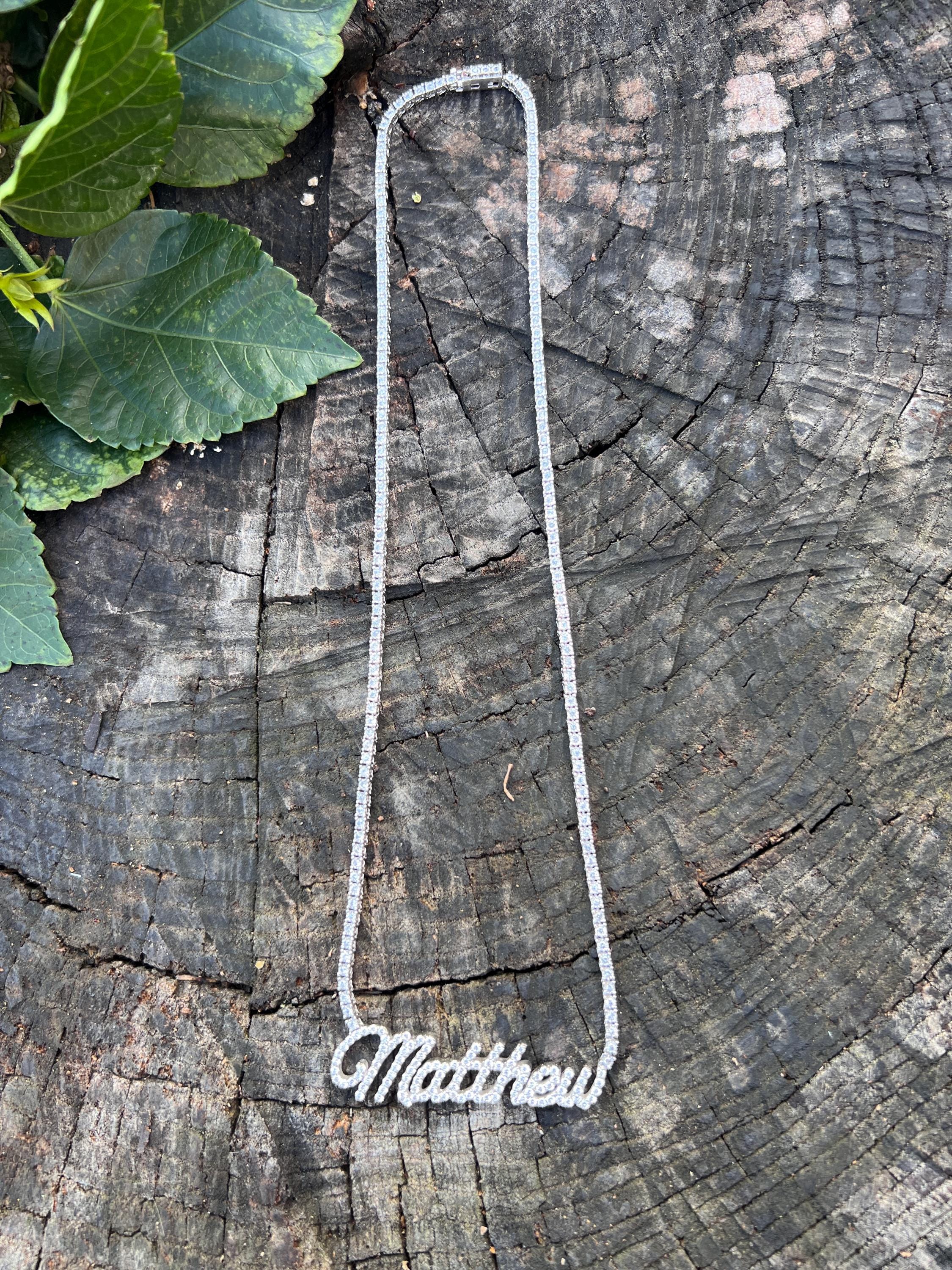 Crafted in 10k/14k white gold, this fabulous diamond Matthew pendant is a unique one. The large "Matthew" studded in diamonds is attached to diamond chain bringing blinding dazzle to your neck. It all comes together to form the special and out of the ordinary Matthew nameplate. The chain is 10k white gold and the name is 14k white gold. The diamonds in the chain have a total approx. weight of 3.00 ct. The diamonds in Matthew have a total approx. weight of 1.75 ct. The total diamond weight of the piece is approx. 4.75 ct. The diamonds are H in color and SI1 in clarity. The entire piece weighs 20.43 grams. The chain measures 16" x 1/16". Matthew measures 2" x 1/2".