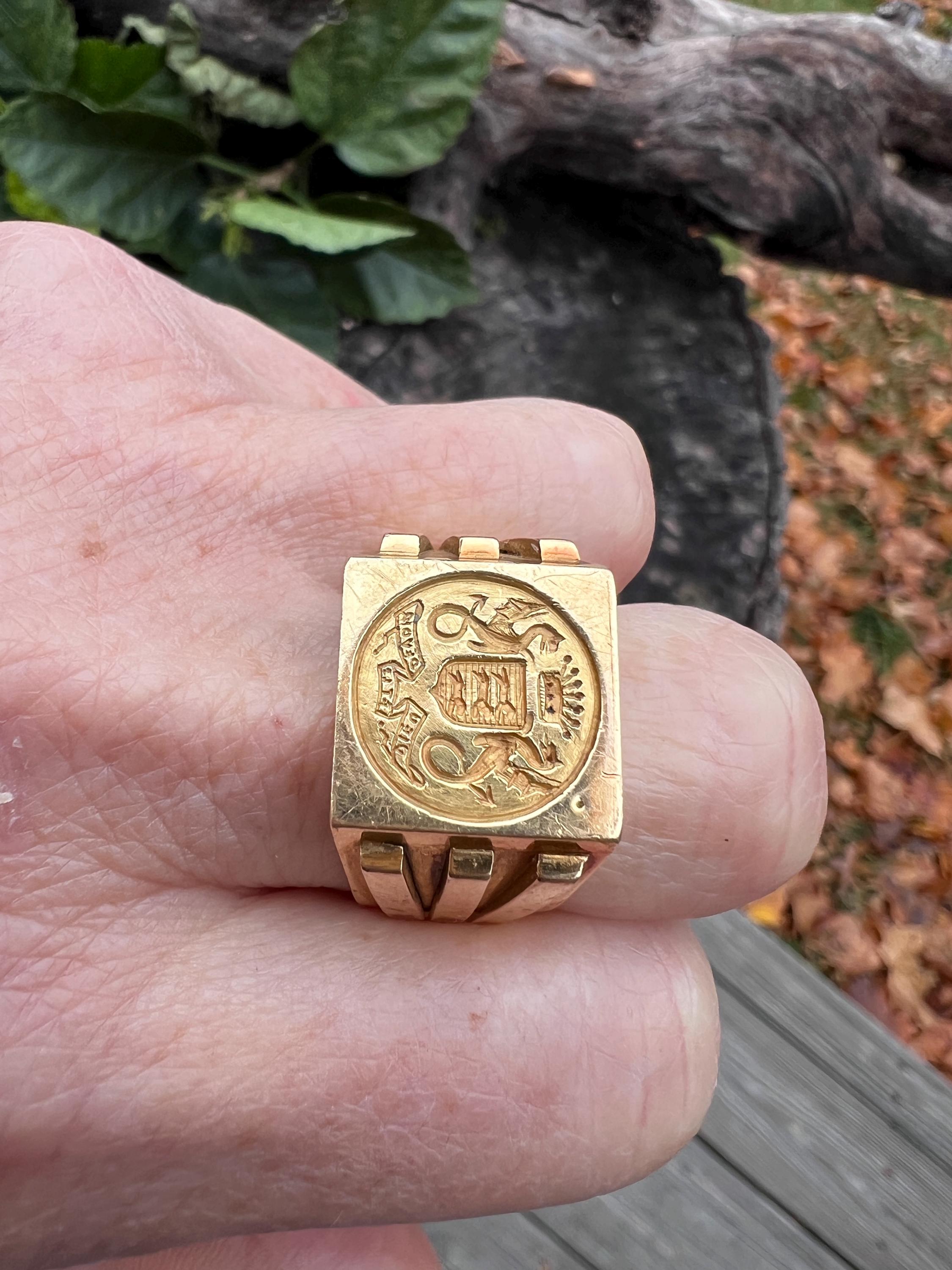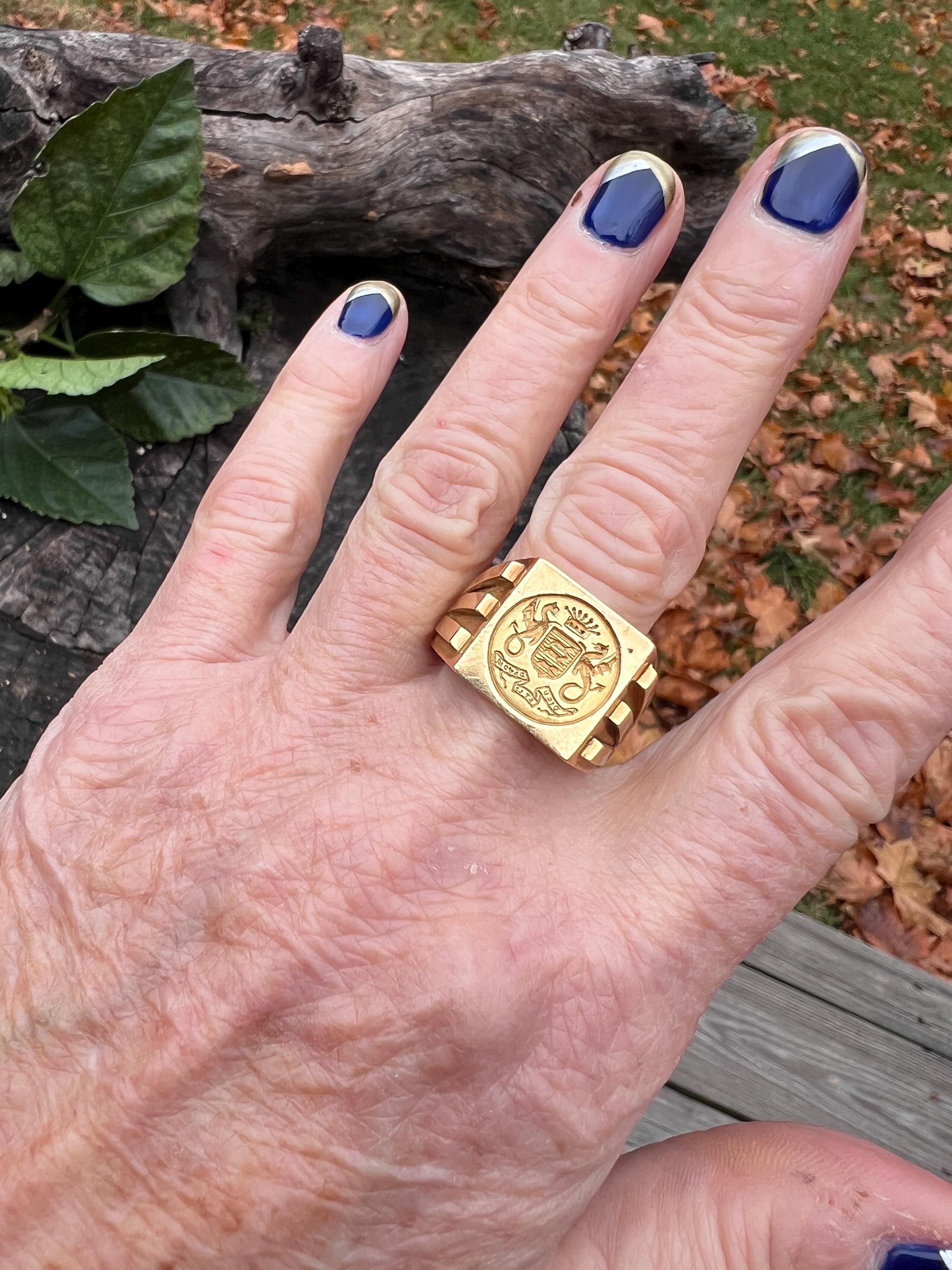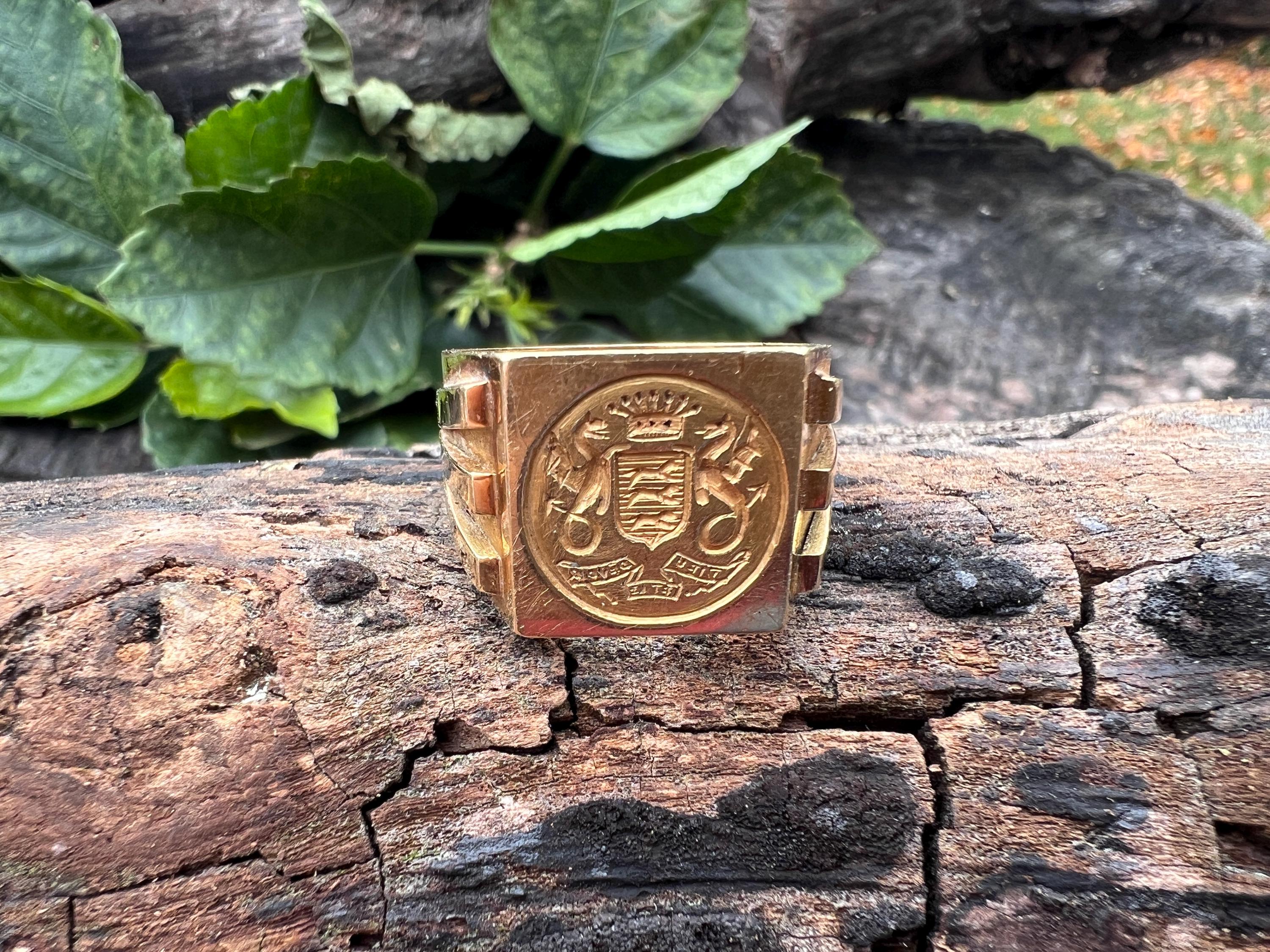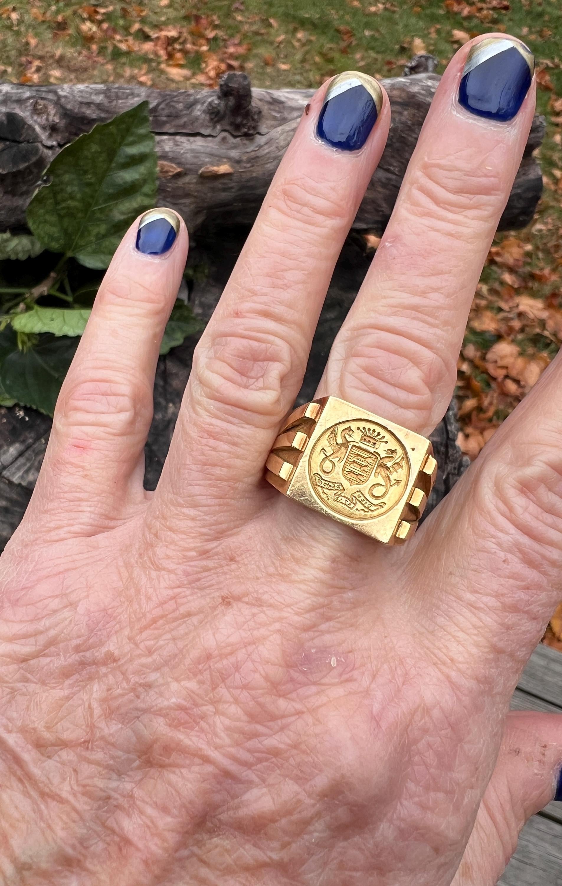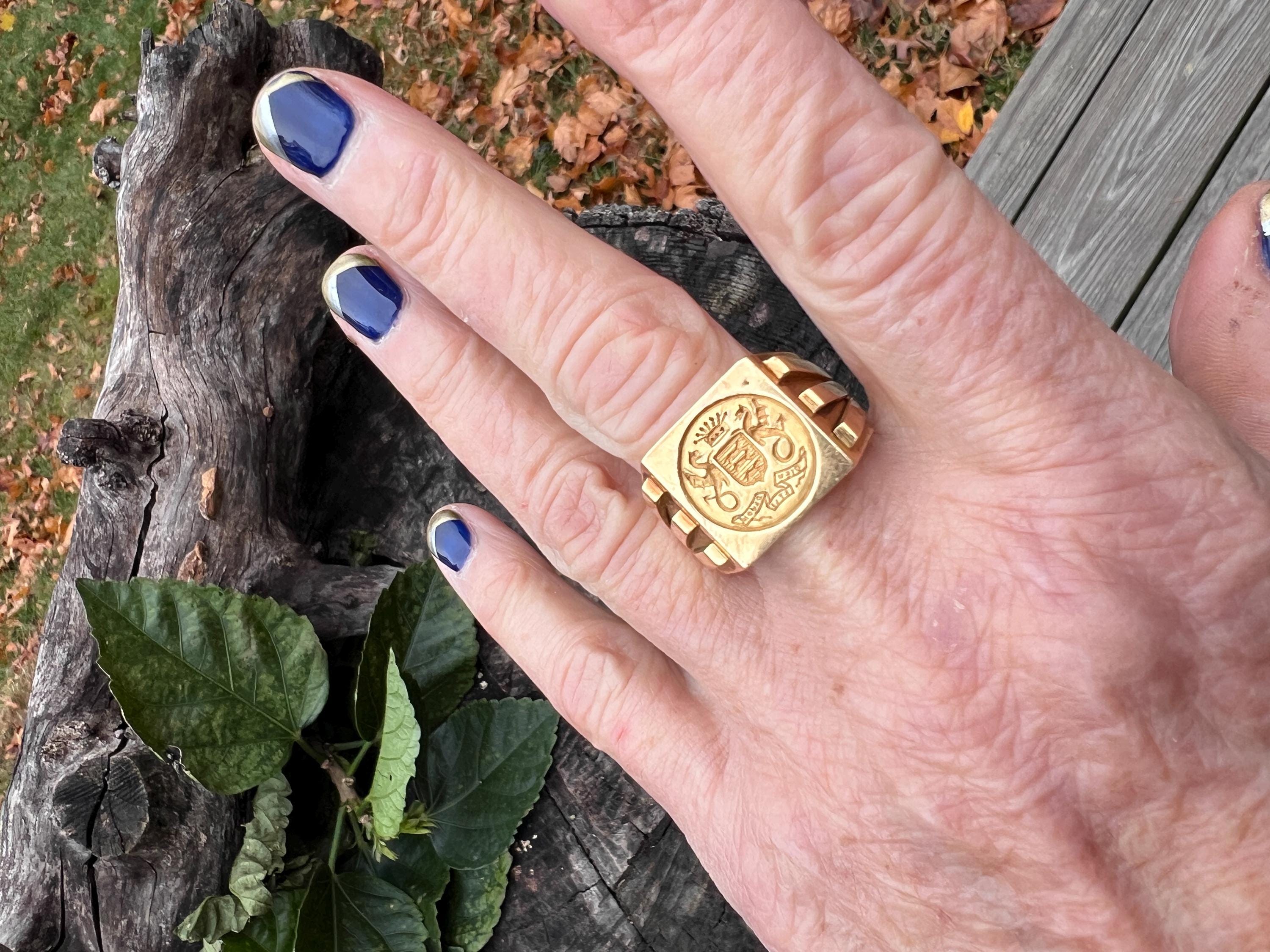 This striking vintage signet ring is set in 14k yellow gold. It dates from the 1950s. The center crest makes for an imposing and impressive look. It is boldly beautiful. A truly unique find. The ring is a size 12 1/4. It weighs 22.23 grams. The top measures 5/8"x 5/8".