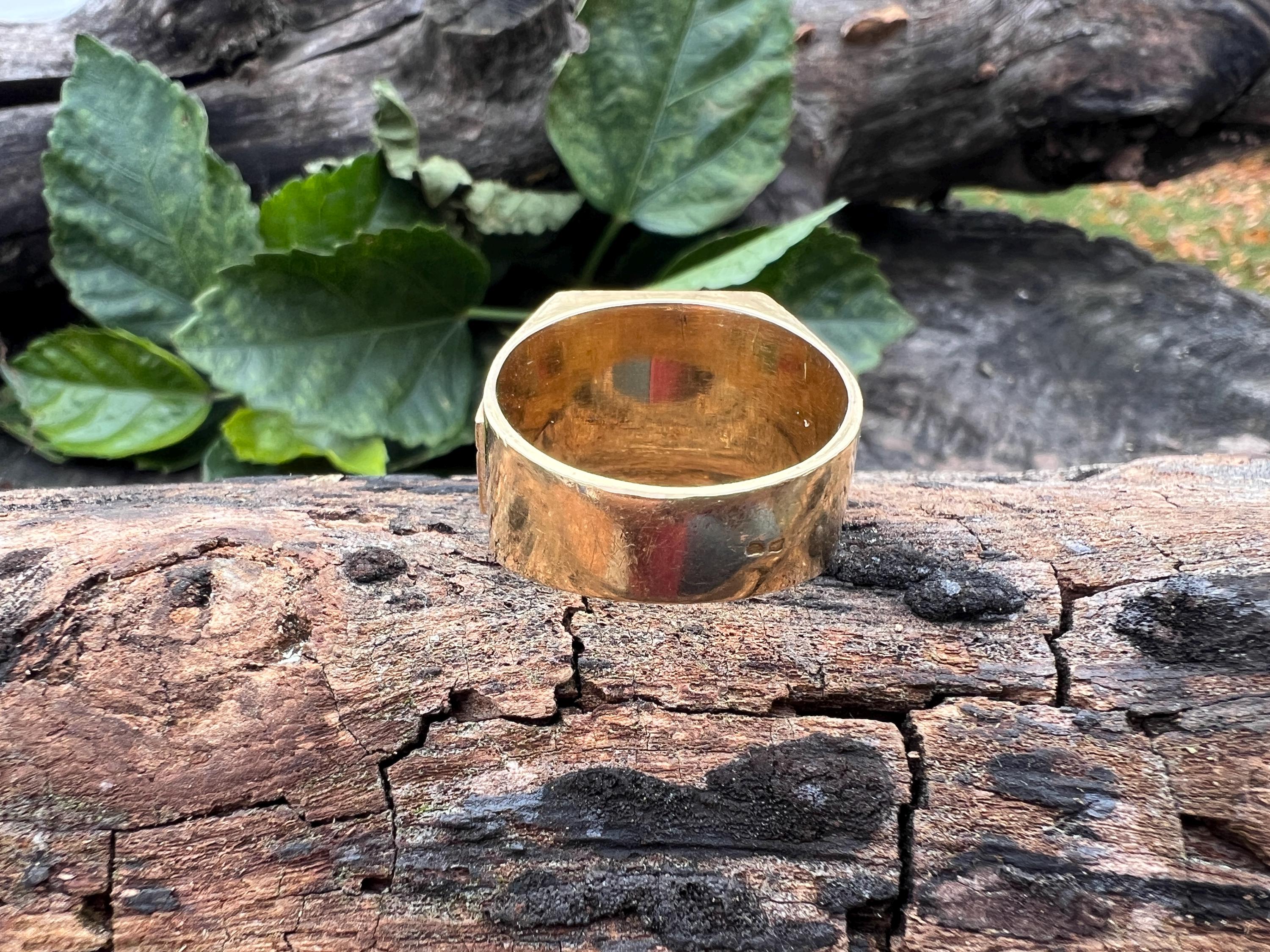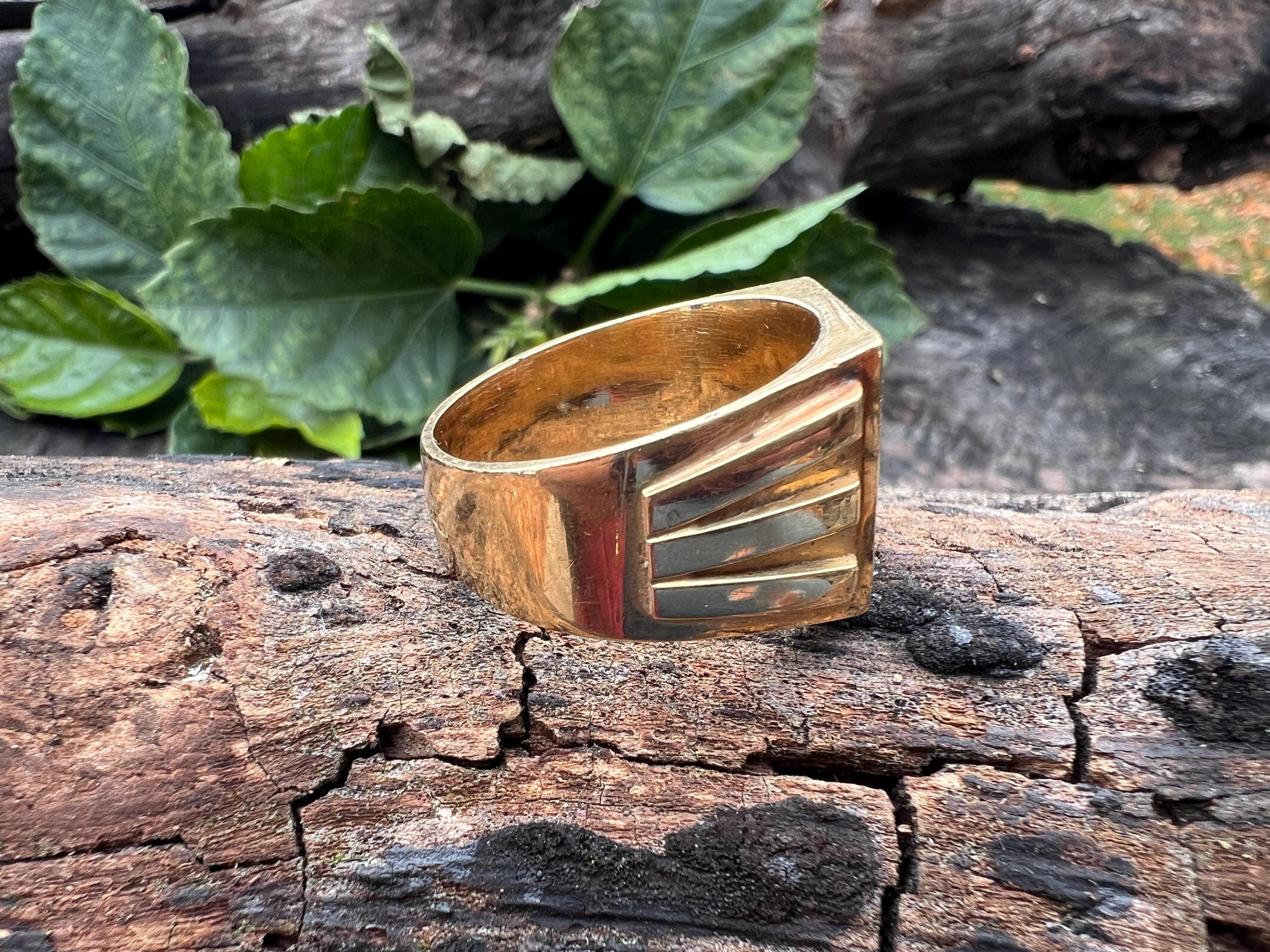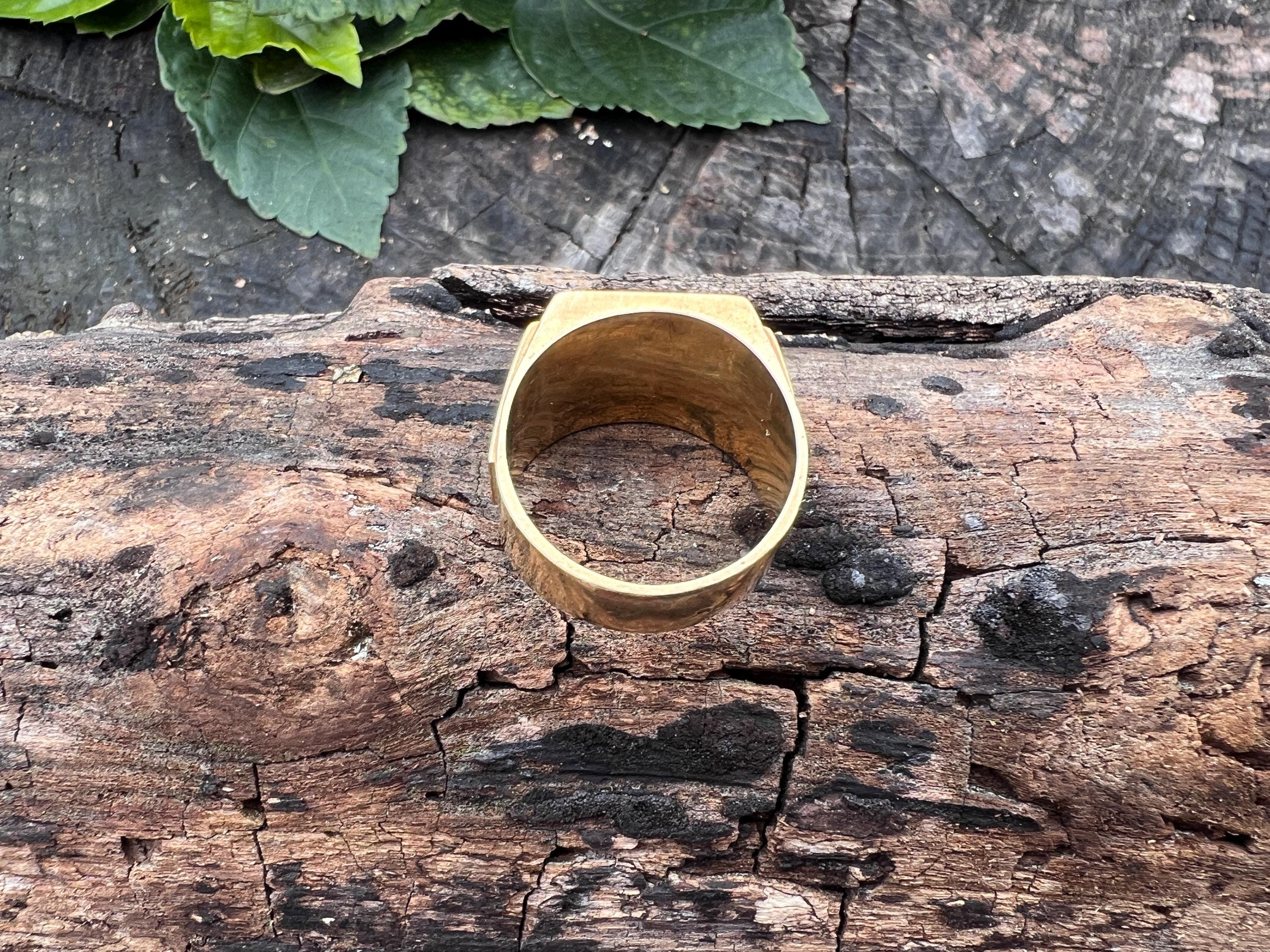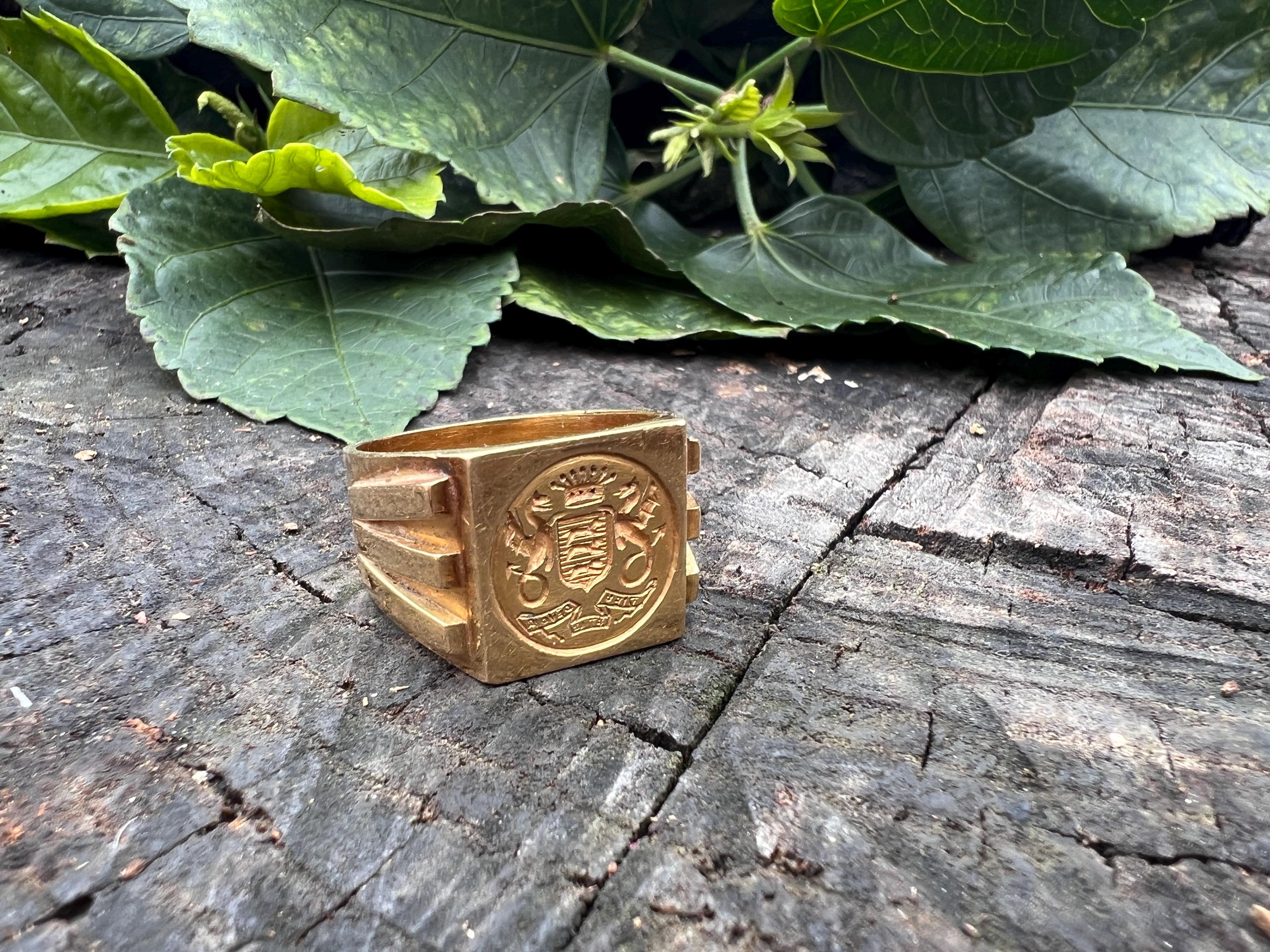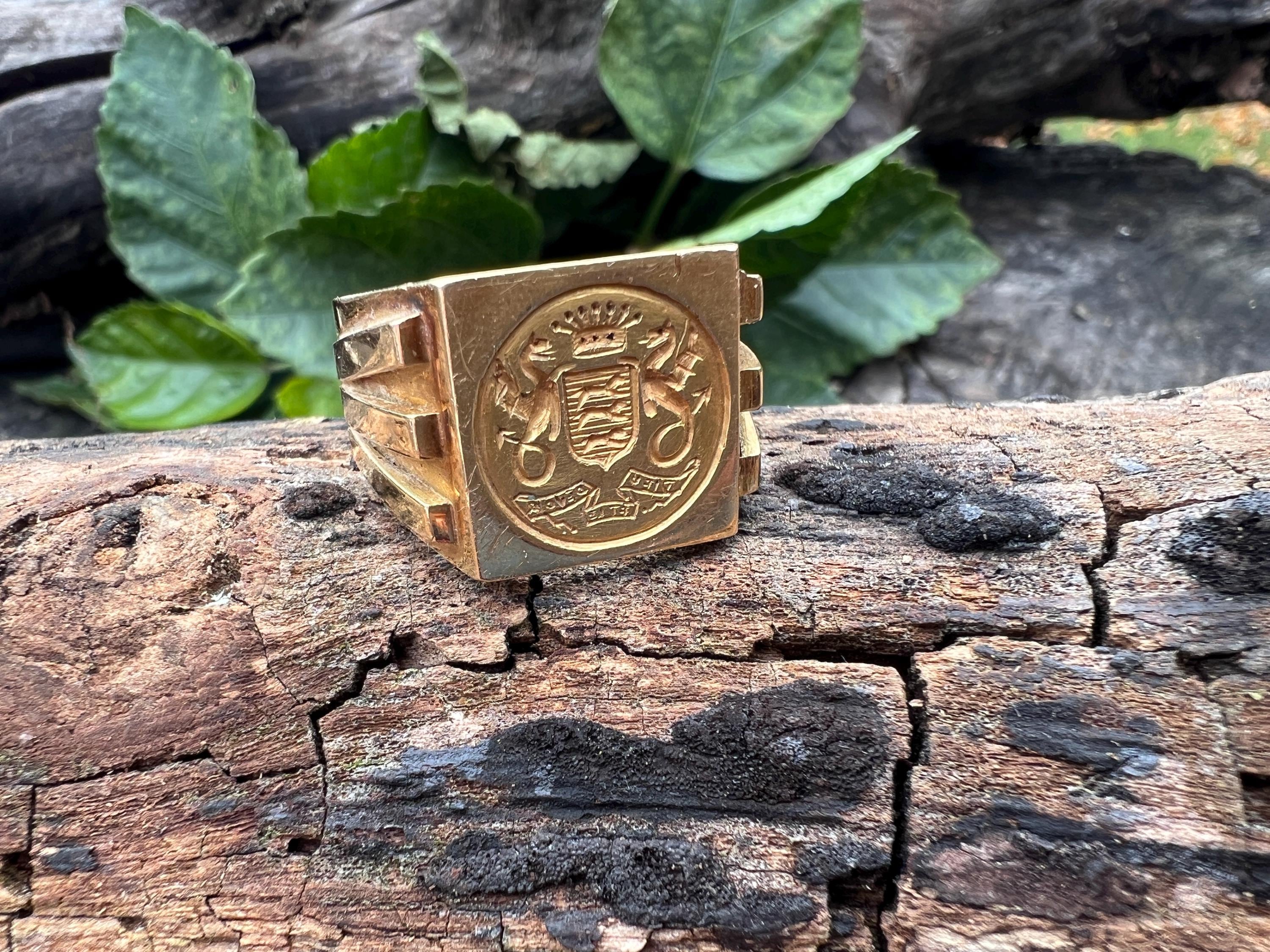This striking vintage signet ring is set in 14k yellow gold. It dates from the 1950s. The center crest makes for an imposing and impressive look. It is boldly beautiful. A truly unique find. The ring is a size 12 1/4. It weighs 22.23 grams. The top measures 5/8"x 5/8".