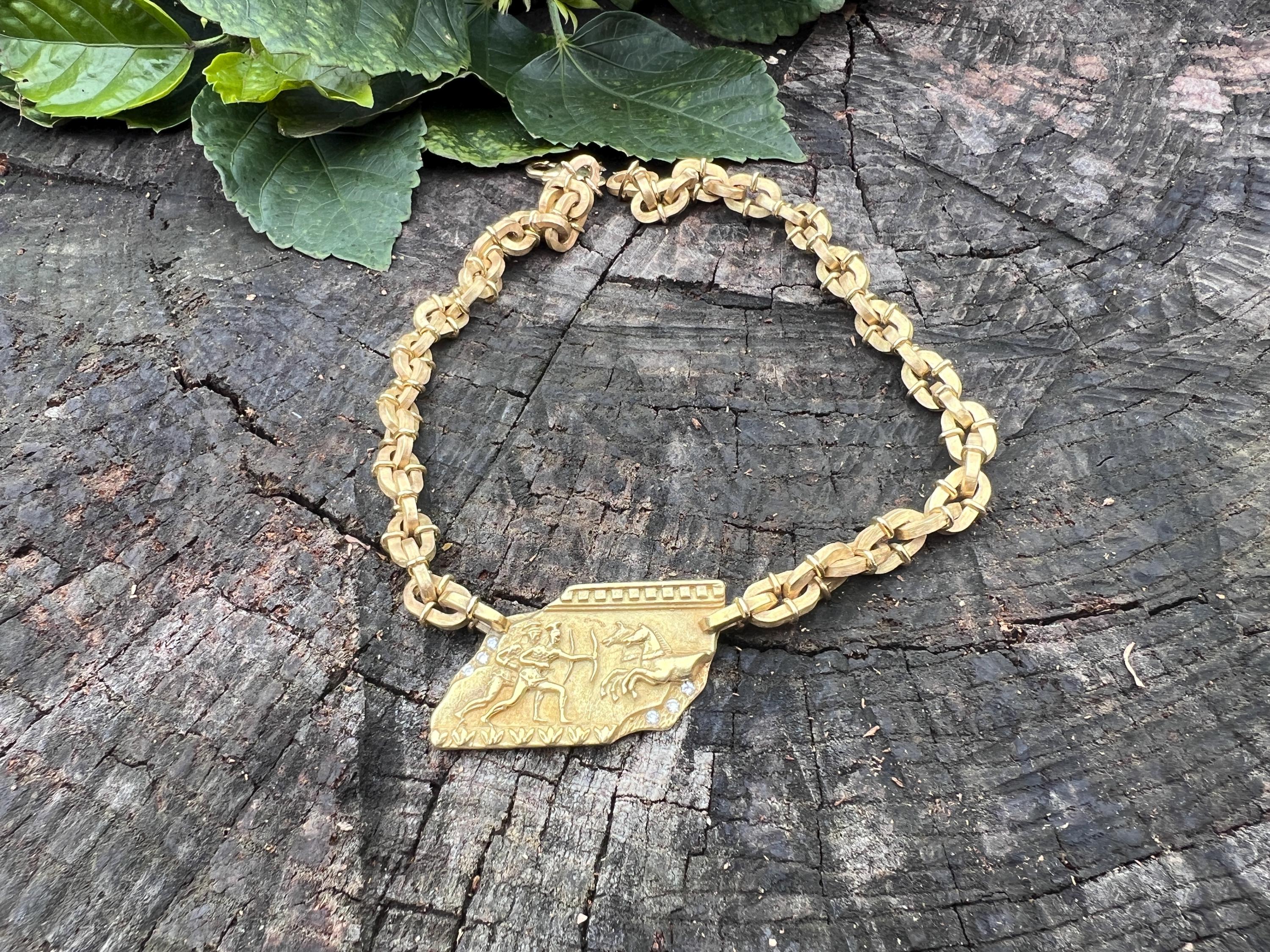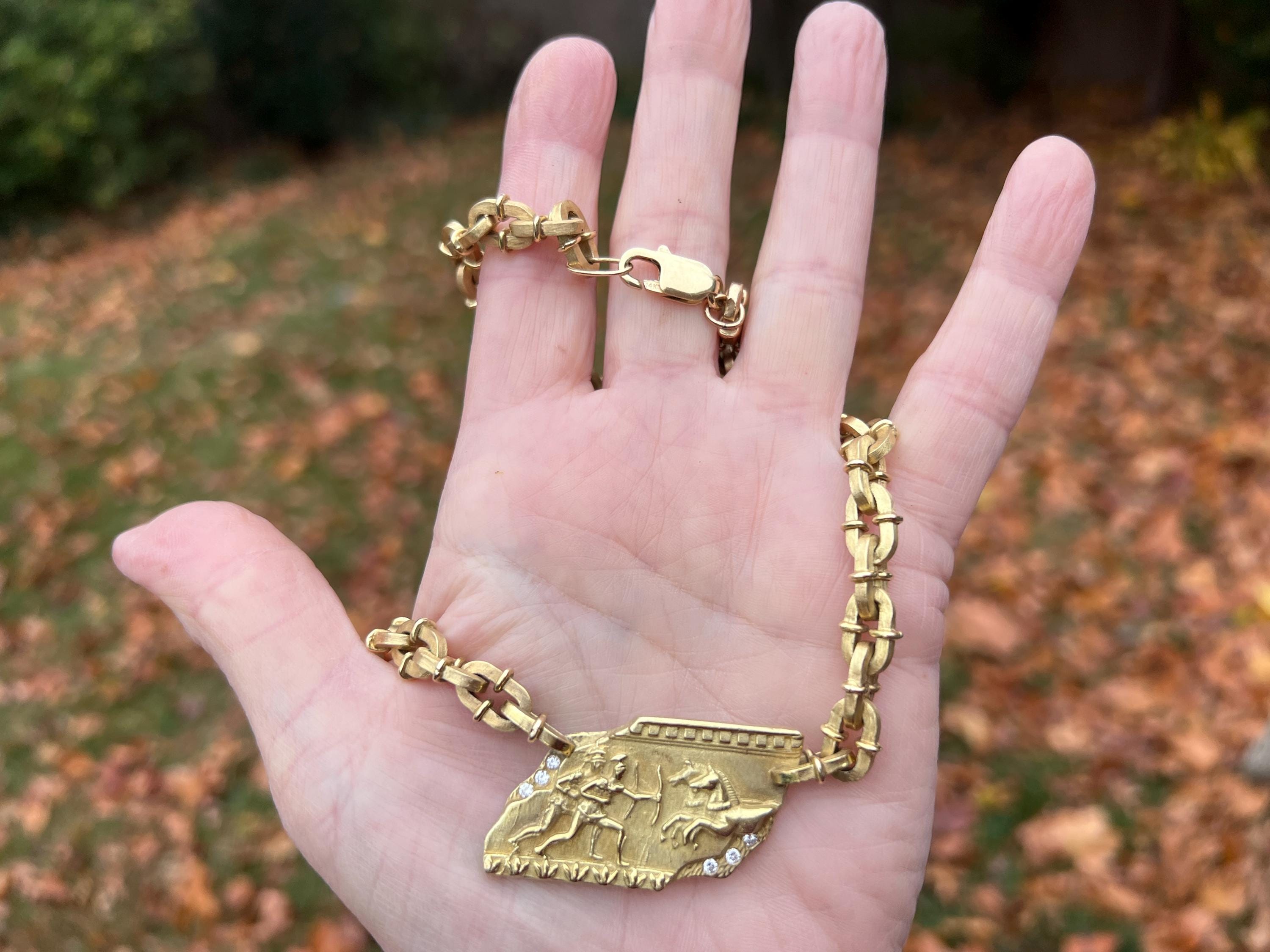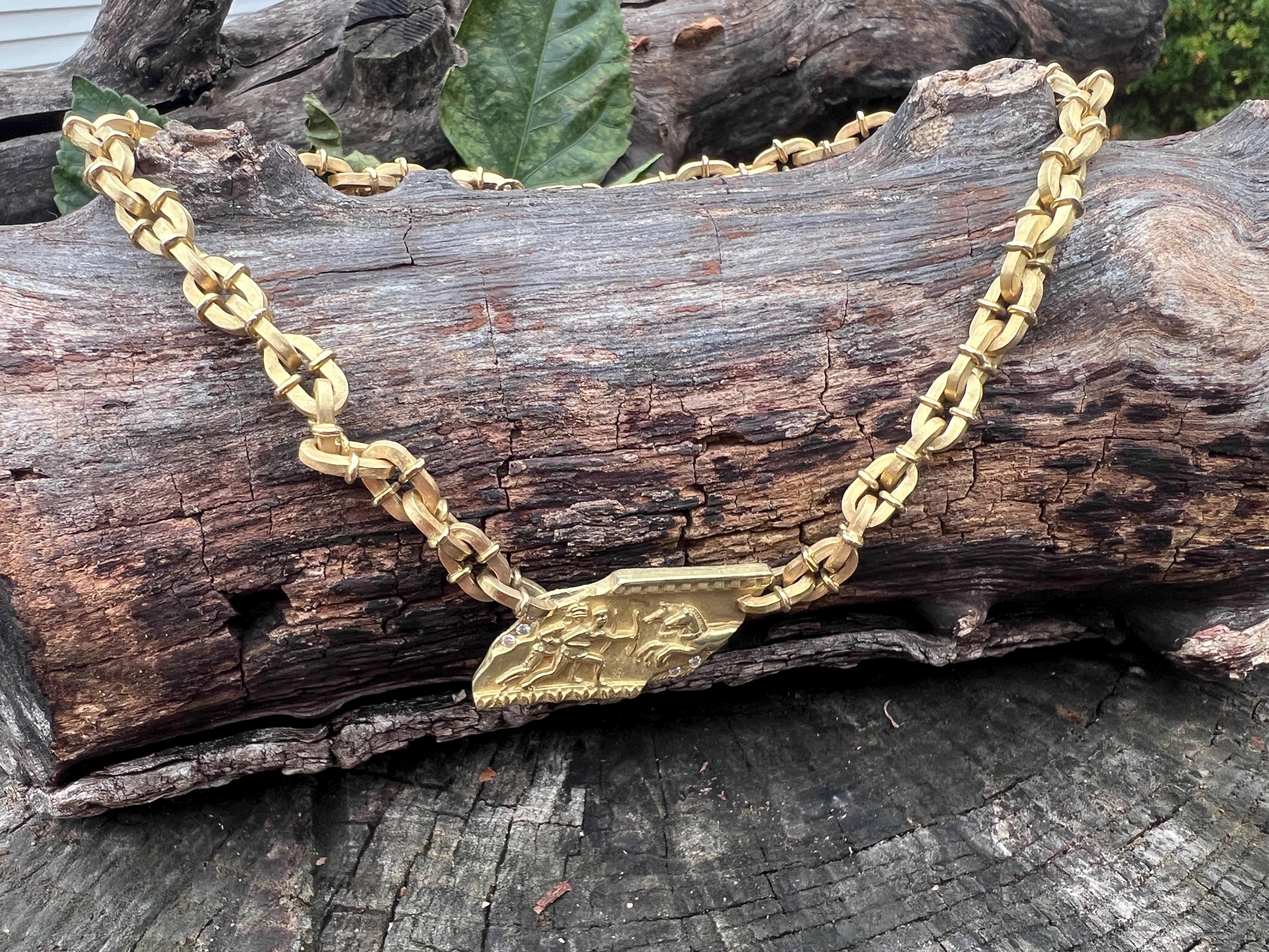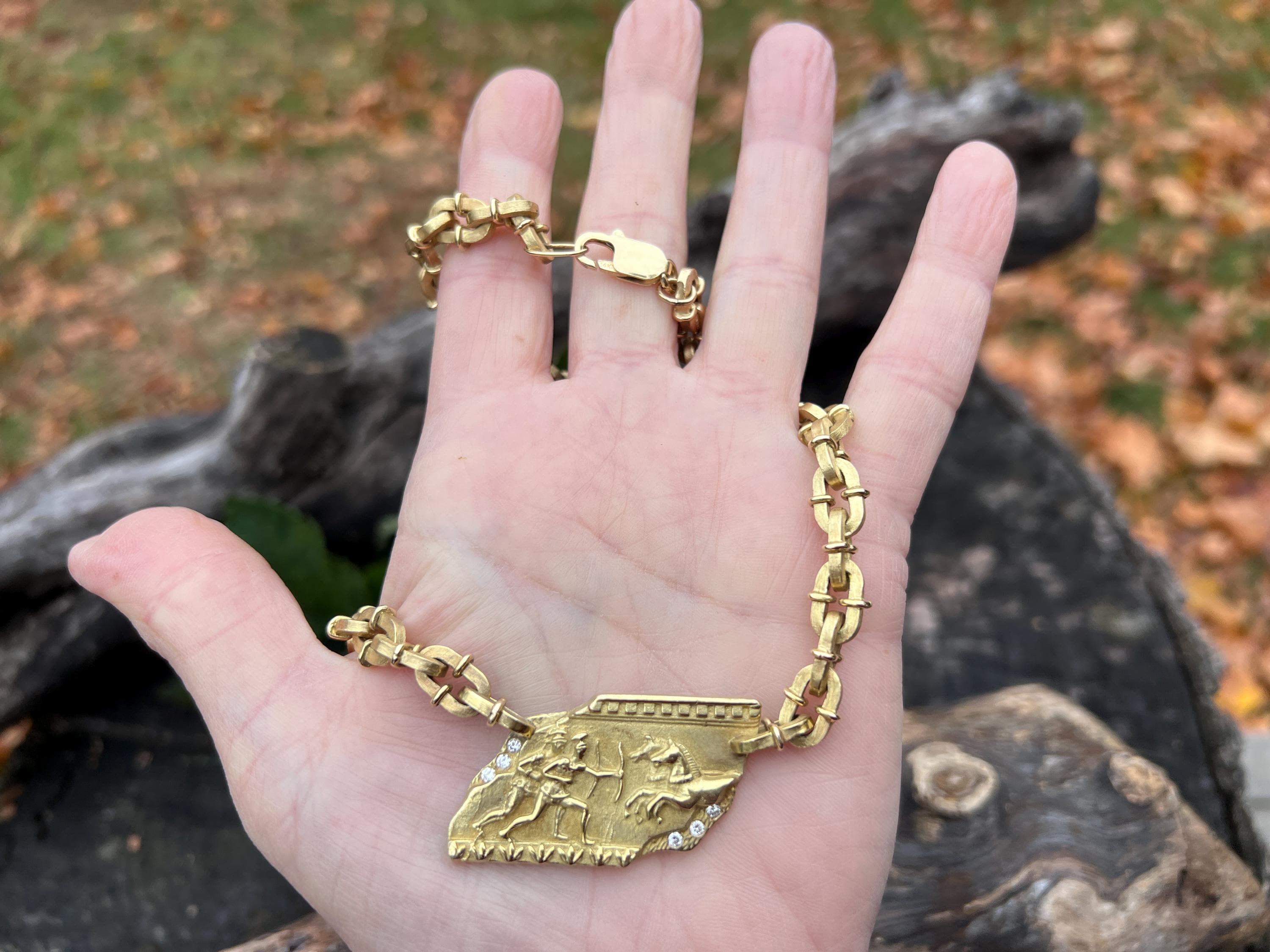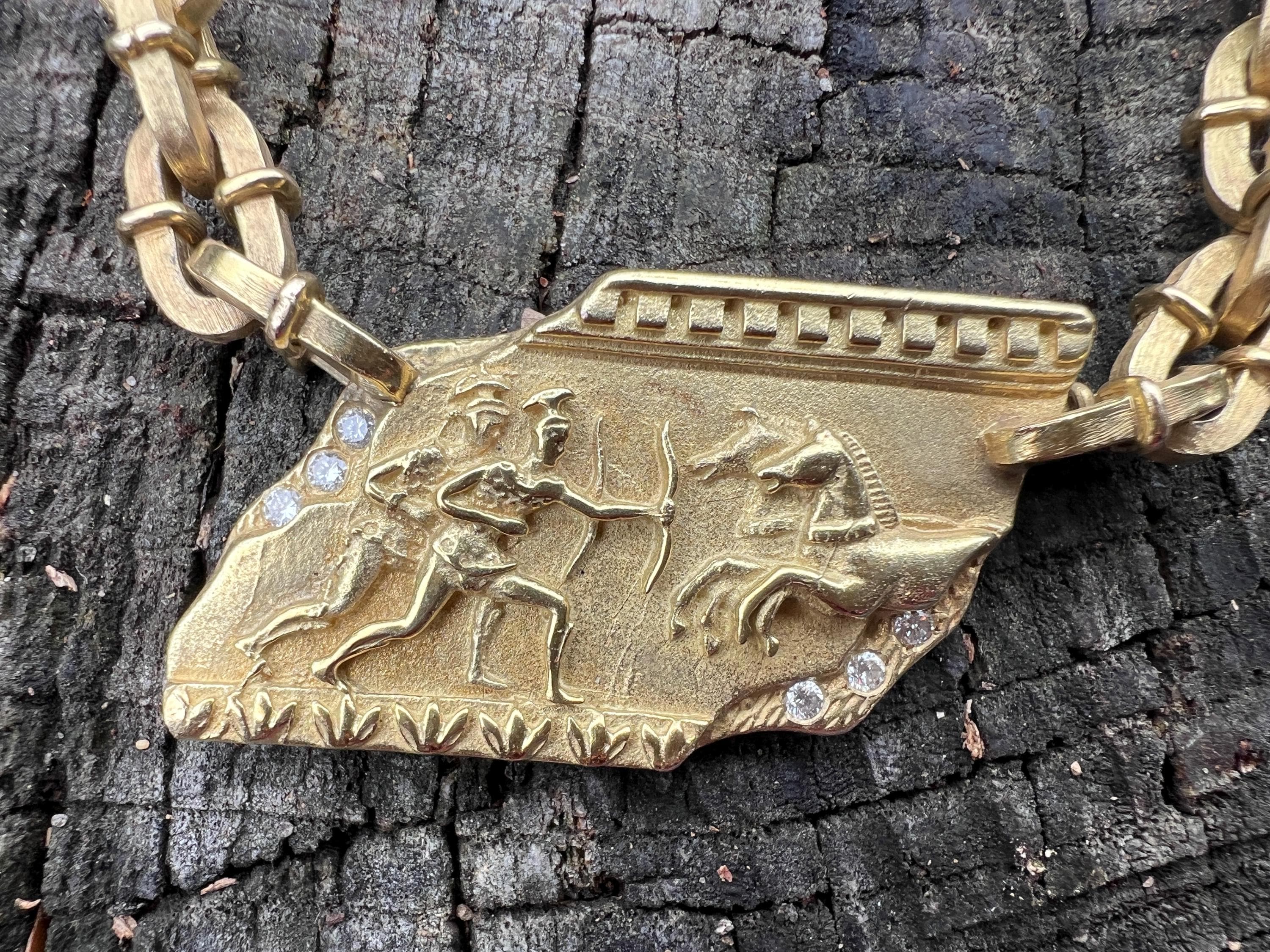 This beautiful gold pendant and chain is set in 14k yellow gold. It dates from the 1970s. The center is a uniquely shaped pendant with a mythological warrior scene. Warriors are on one side in fight mode and 2 stallions on the other. The pendant is decorated with 3 diamonds in the 2 corners for a hint of dazzle. The diamonds have a total approx. weight of .12 ct. The diamonds are H in color and VS2 in clarity. It is attached to an 14k yellow gold oval link chain. A beautiful and meaningful piece of jewelry. The pendant measures 1 1/2 " x 7/8. The entire piece measures 16 1/2". It weighs 42.39 grams. It is marked 14k.
