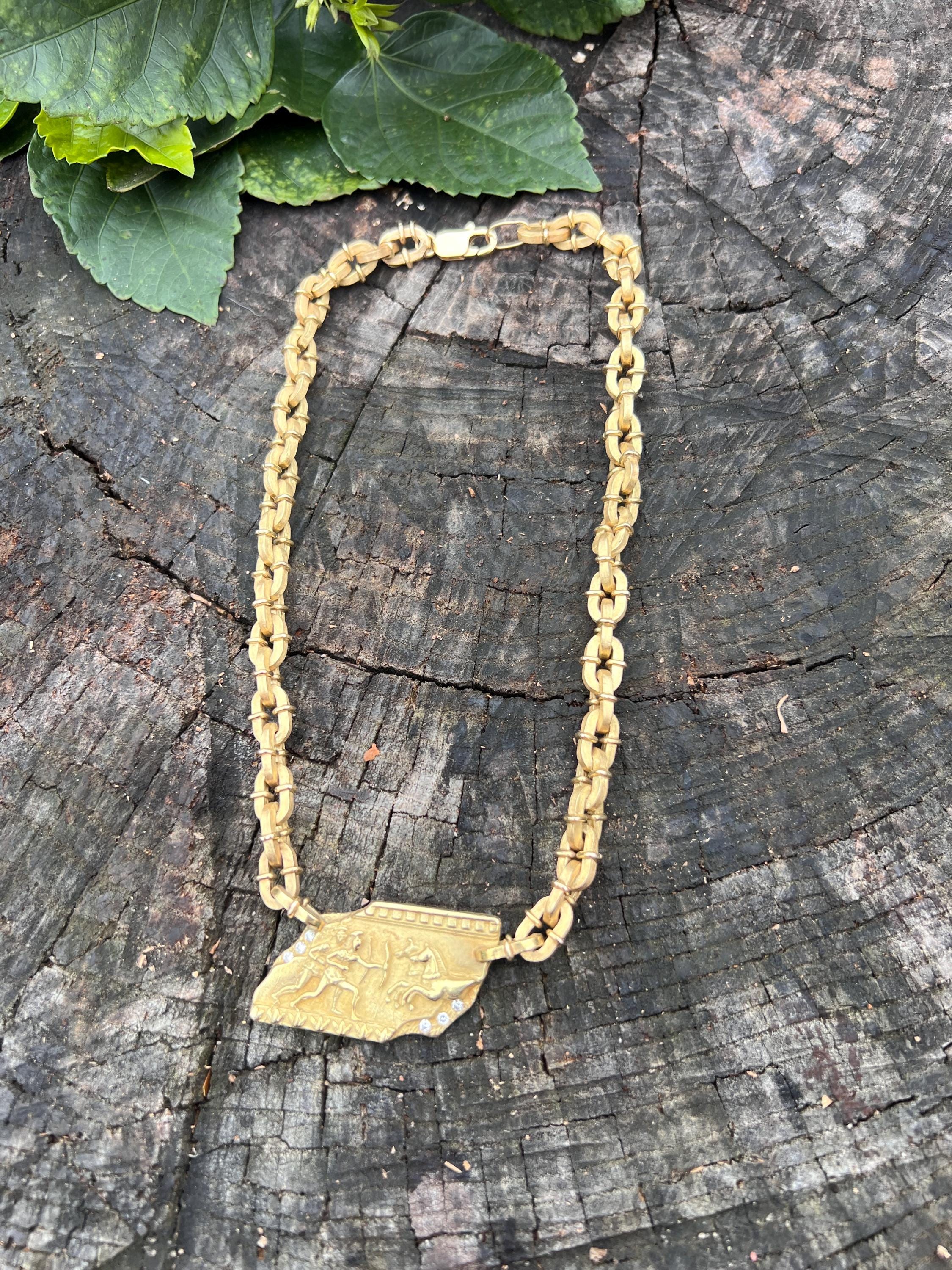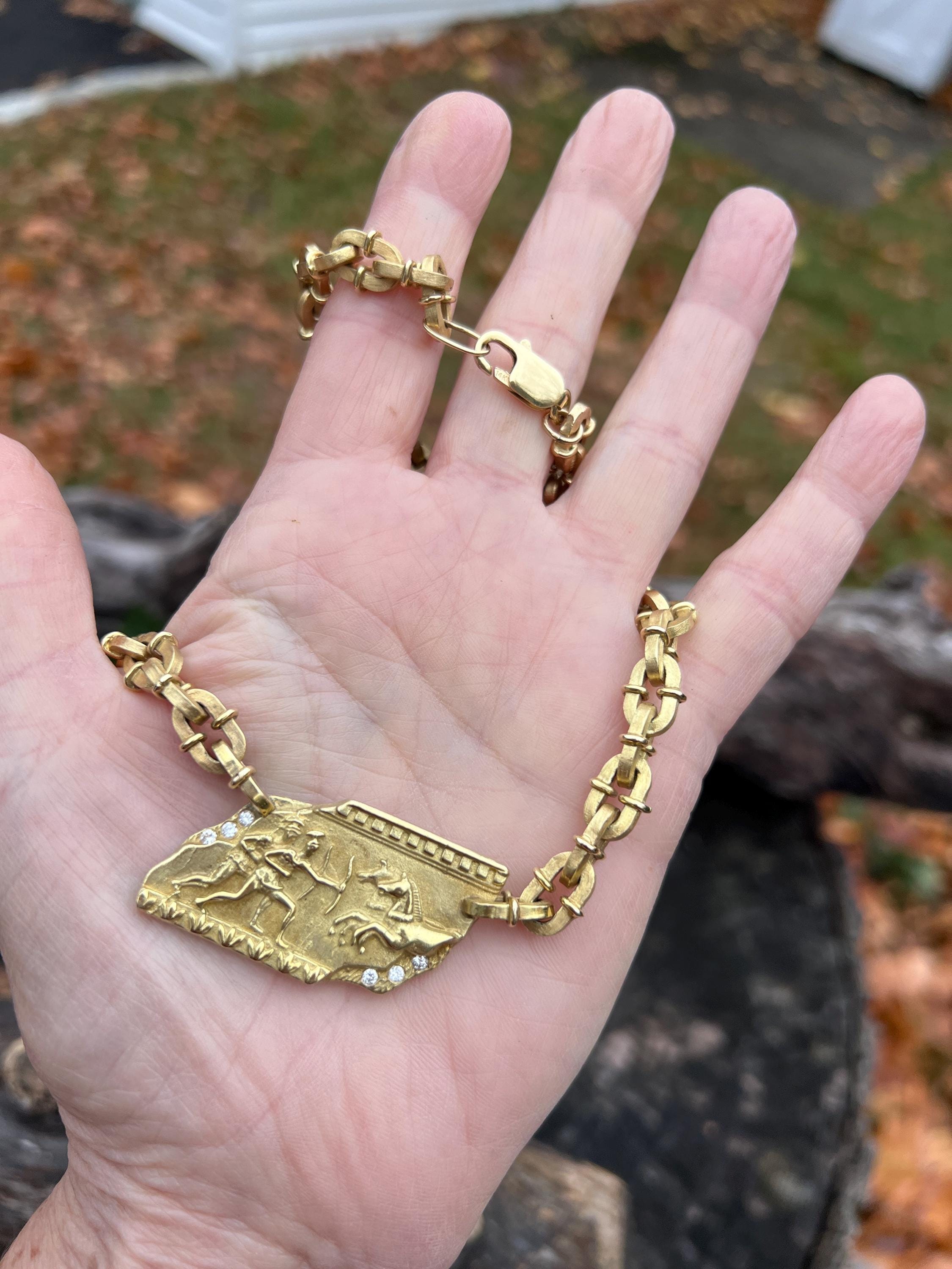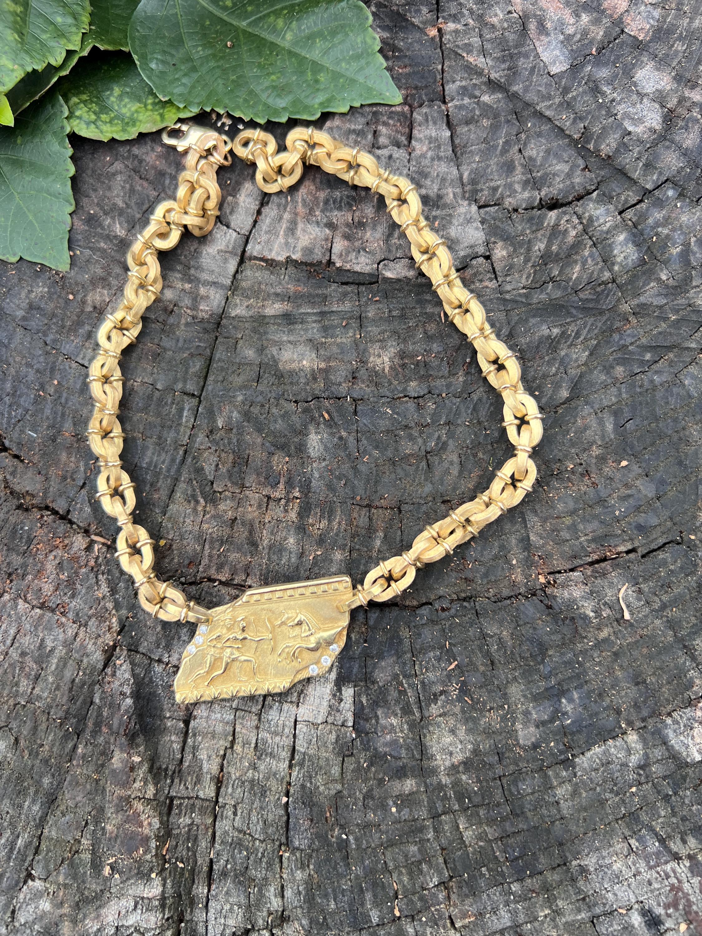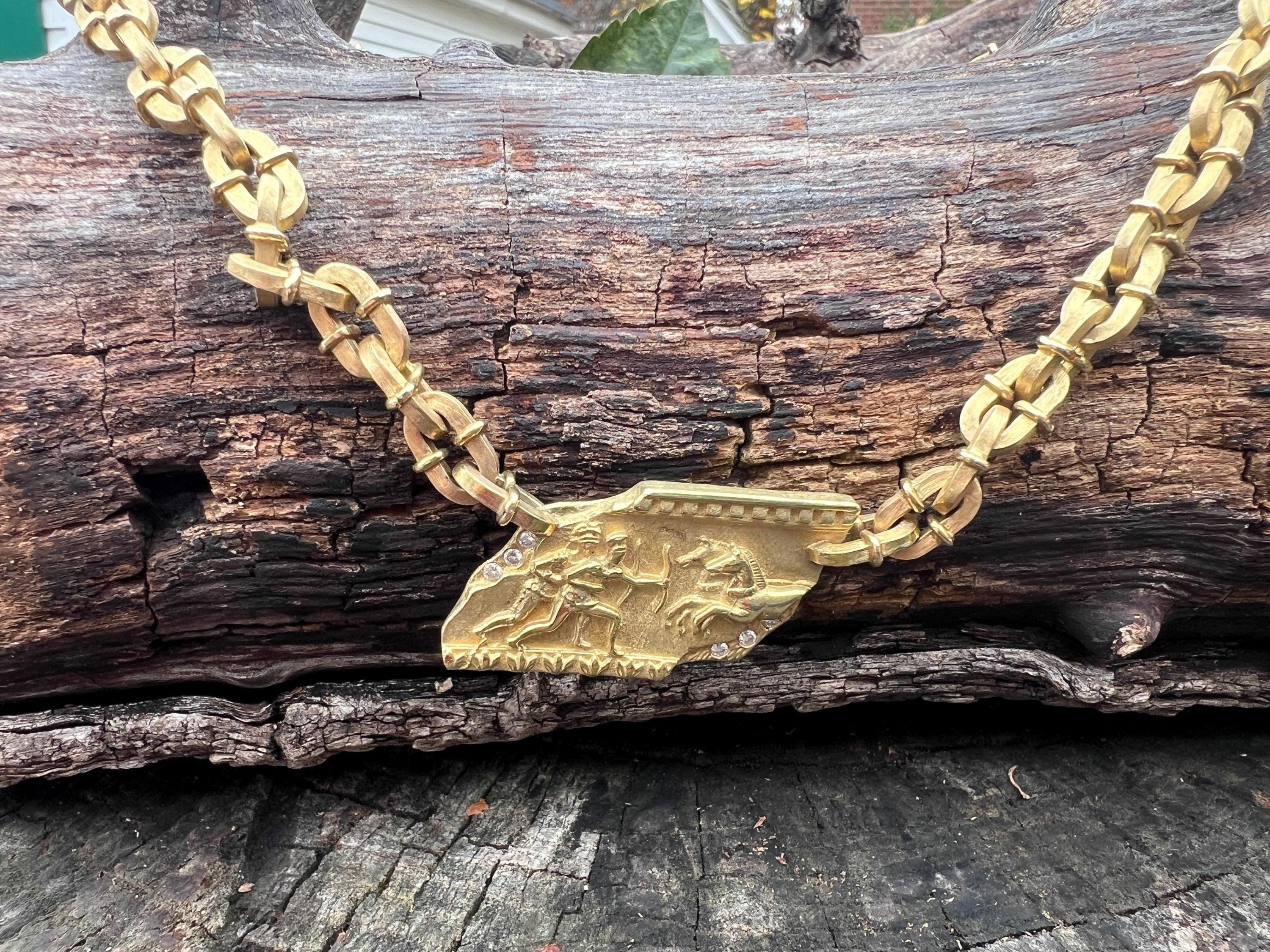 This beautiful gold pendant and chain is set in 14k yellow gold. It dates from the 1970s. The center is a uniquely shaped pendant with a mythological warrior scene. Warriors are on one side in fight mode and 2 stallions on the other. The pendant is decorated with 3 diamonds in the 2 corners for a hint of dazzle. The diamonds have a total approx. weight of .12 ct. The diamonds are H in color and VS2 in clarity. It is attached to an 14k yellow gold oval link chain. A beautiful and meaningful piece of jewelry. The pendant measures 1 1/2 " x 7/8. The entire piece measures 16 1/2". It weighs 42.39 grams. It is marked 14k.