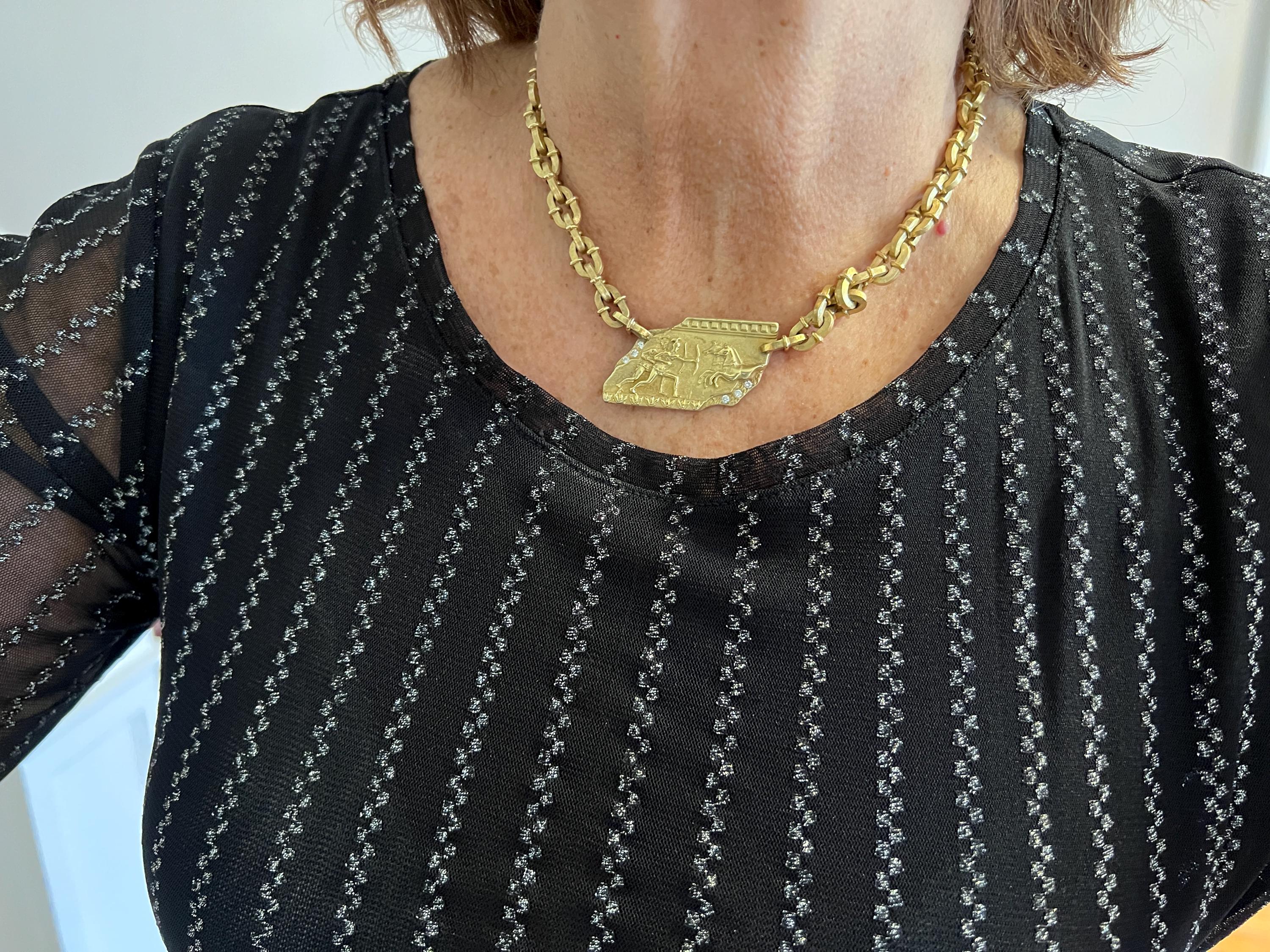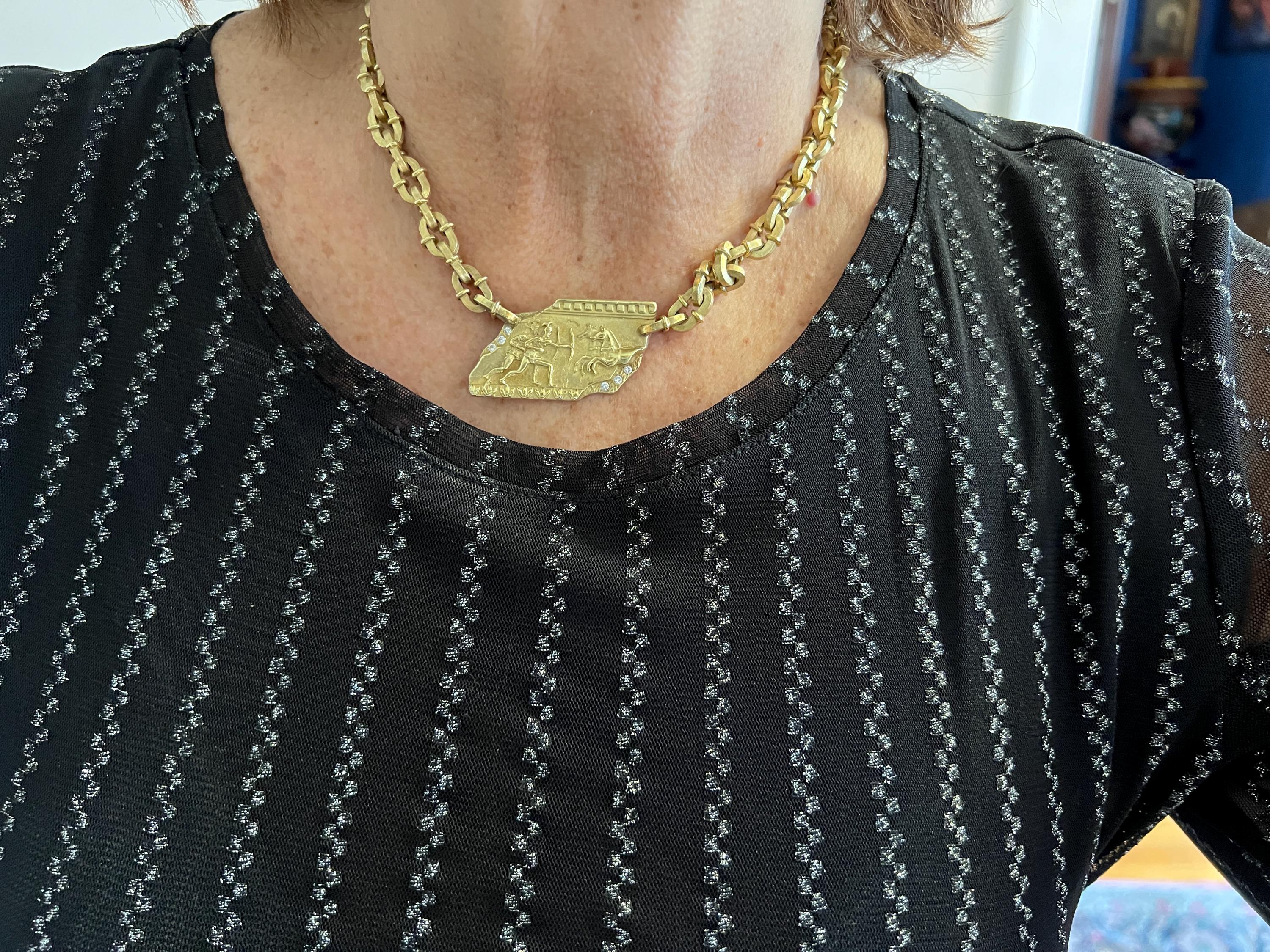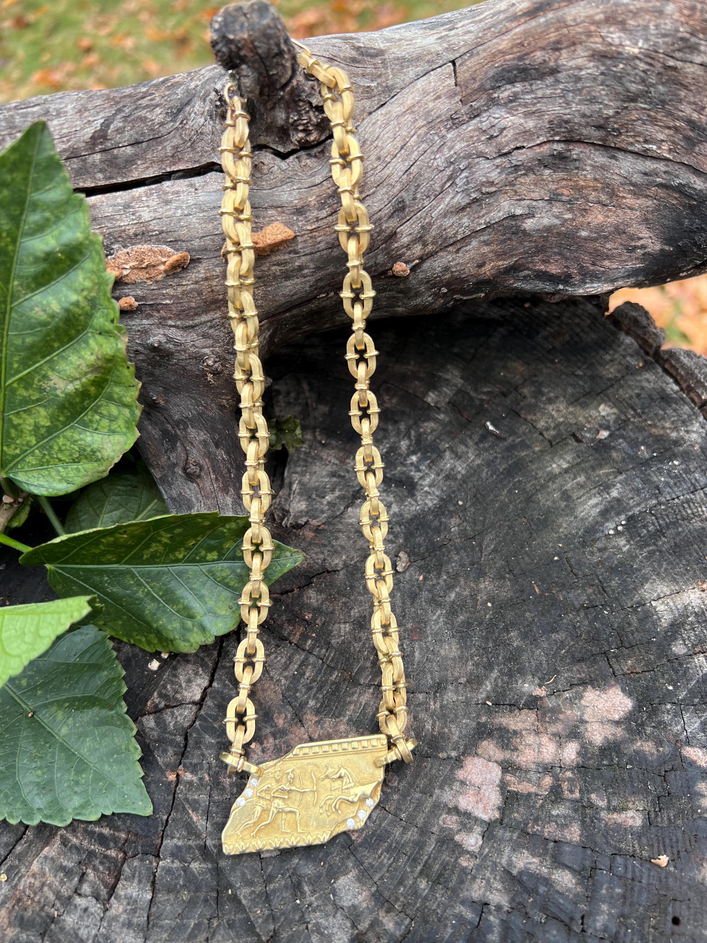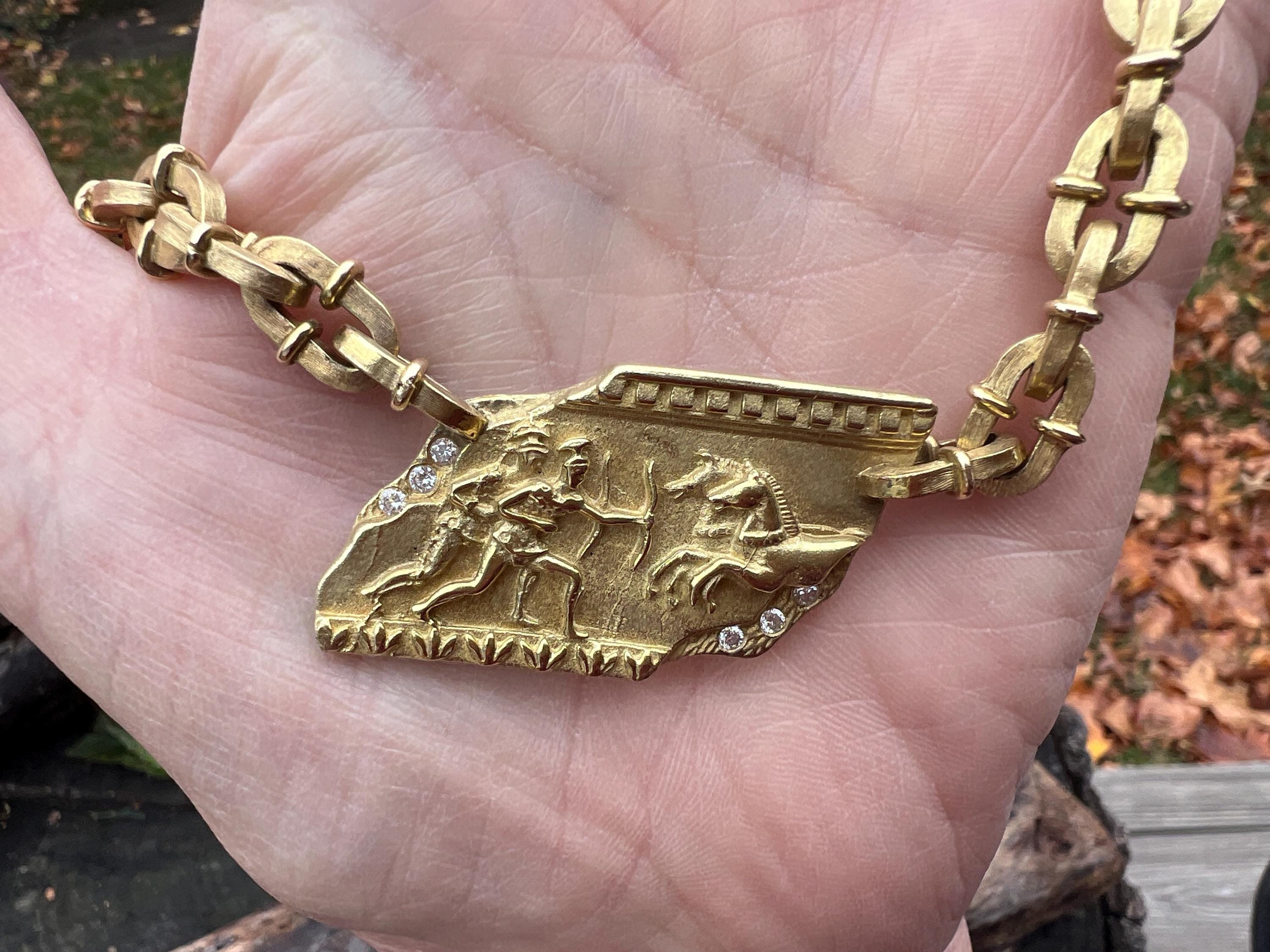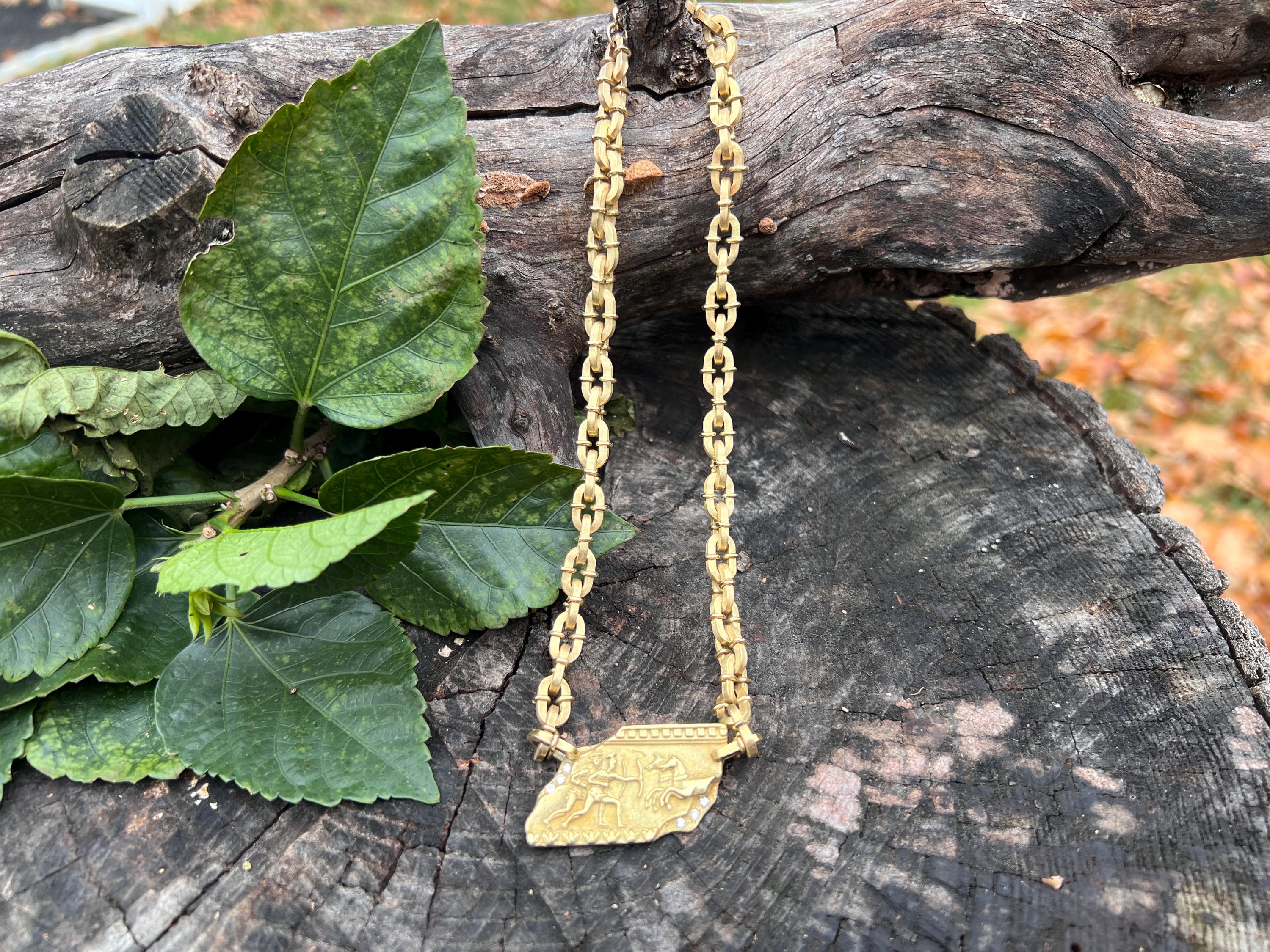 This beautiful gold pendant and chain is set in 14k yellow gold. It dates from the 1970s. The center is a uniquely shaped pendant with a mythological warrior scene. Warriors are on one side in fight mode and 2 stallions on the other. The pendant is decorated with 3 diamonds in the 2 corners for a hint of dazzle. The diamonds have a total approx. weight of .12 ct. The diamonds are H in color and VS2 in clarity. It is attached to an 14k yellow gold oval link chain. A beautiful and meaningful piece of jewelry. The pendant measures 1 1/2 " x 7/8. The entire piece measures 16 1/2". It weighs 42.39 grams. It is marked 14k.