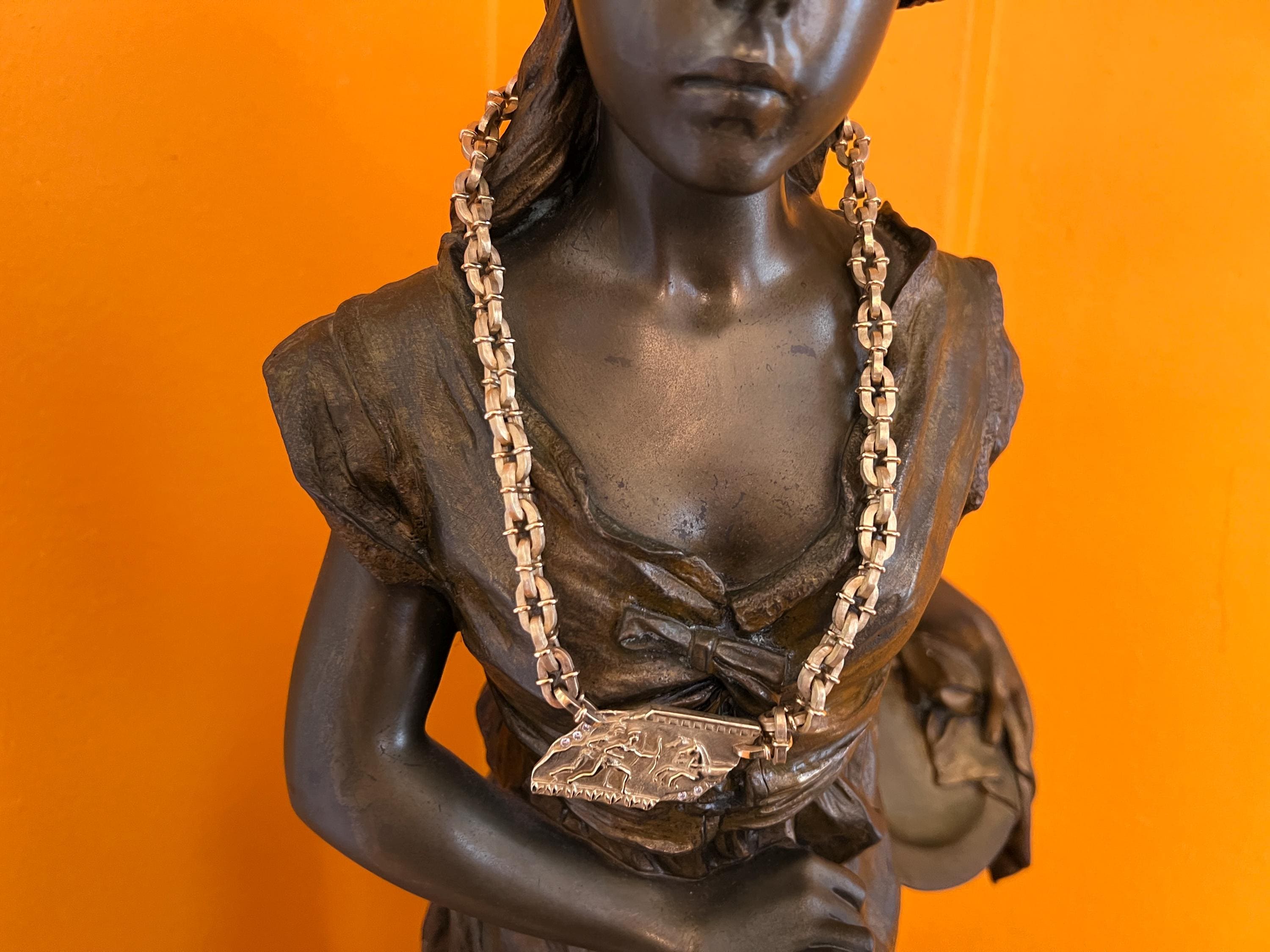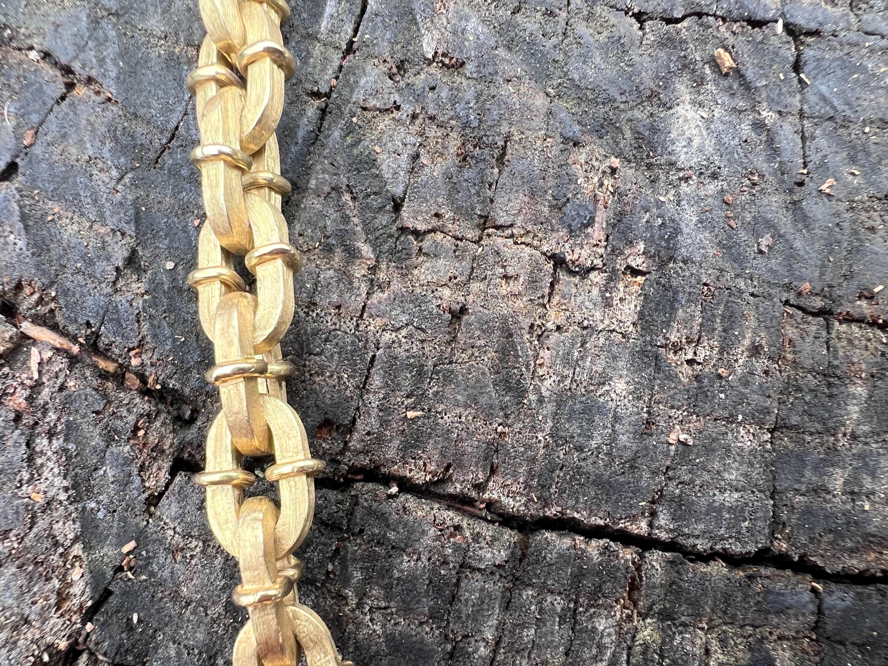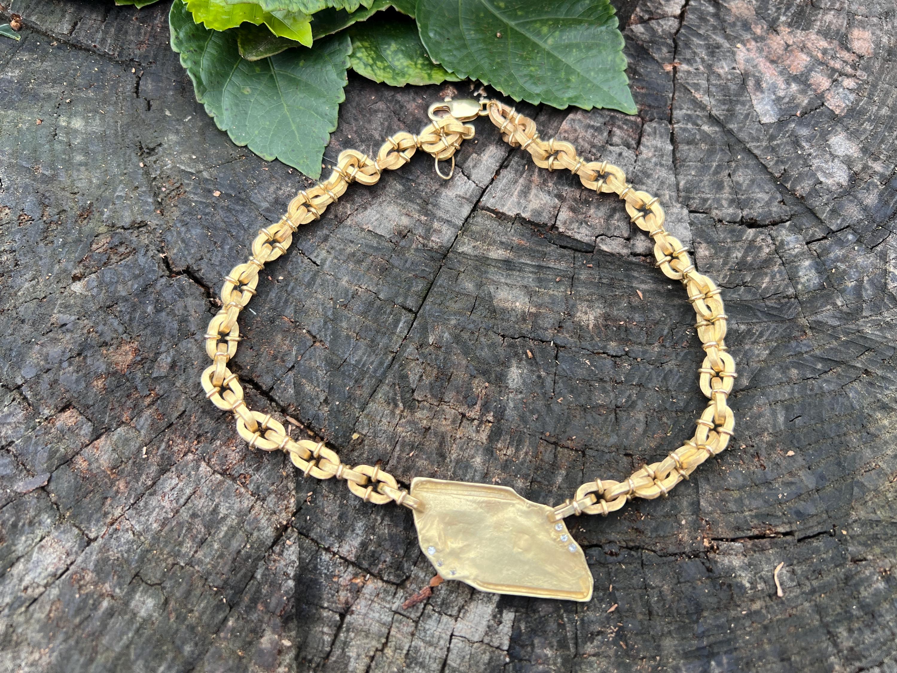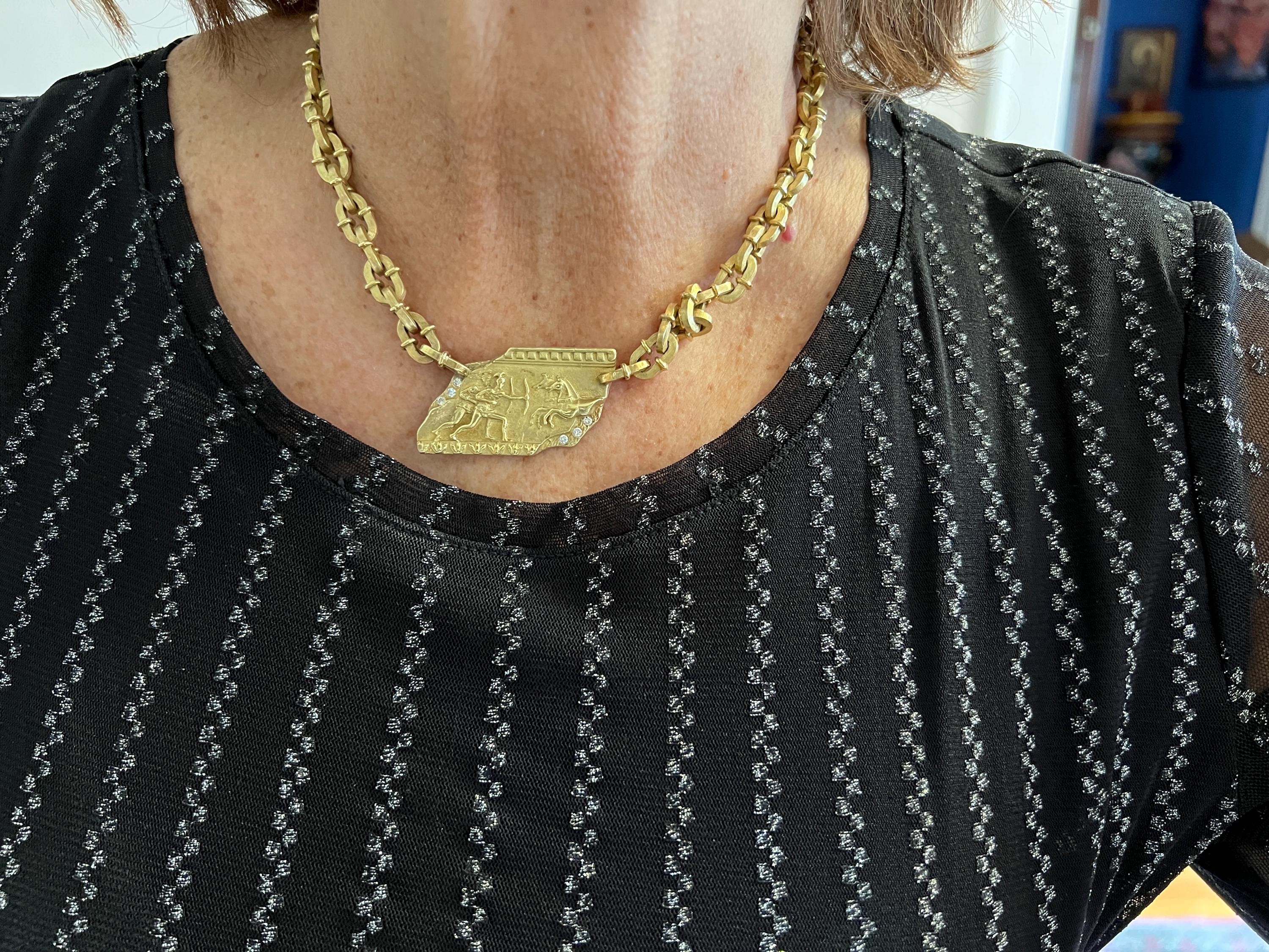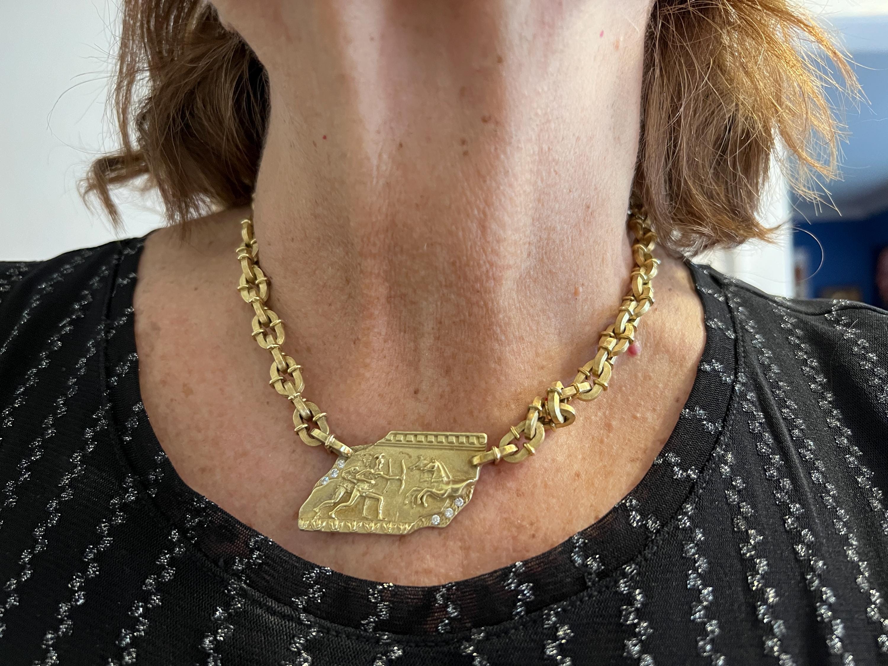 This beautiful gold pendant and chain is set in 14k yellow gold. It dates from the 1970s. The center is a uniquely shaped pendant with a mythological warrior scene. Warriors are on one side in fight mode and 2 stallions on the other. The pendant is decorated with 3 diamonds in the 2 corners for a hint of dazzle. The diamonds have a total approx. weight of .12 ct. The diamonds are H in color and VS2 in clarity. It is attached to an 14k yellow gold oval link chain. A beautiful and meaningful piece of jewelry. The pendant measures 1 1/2 " x 7/8. The entire piece measures 16 1/2". It weighs 42.39 grams. It is marked 14k.