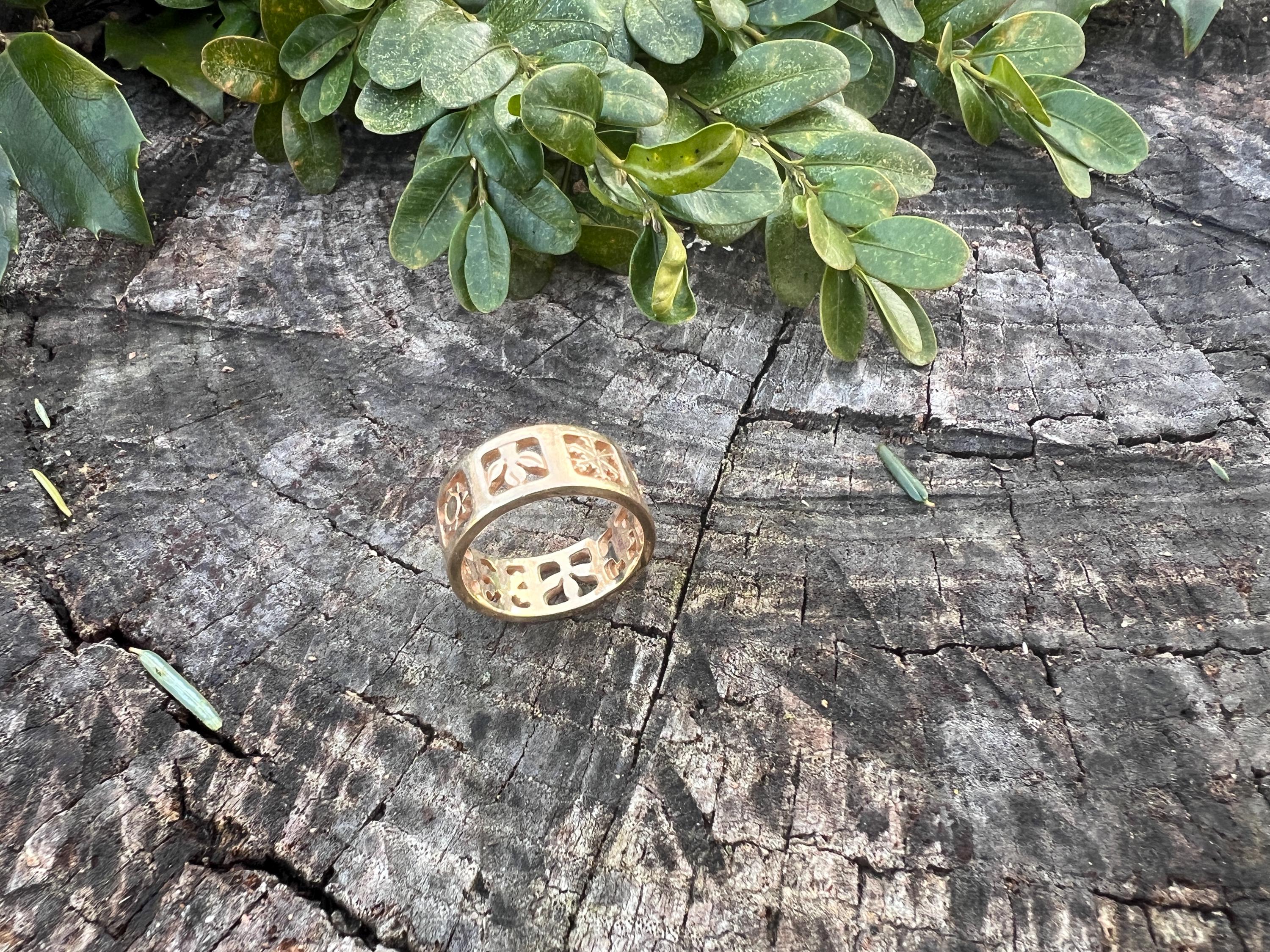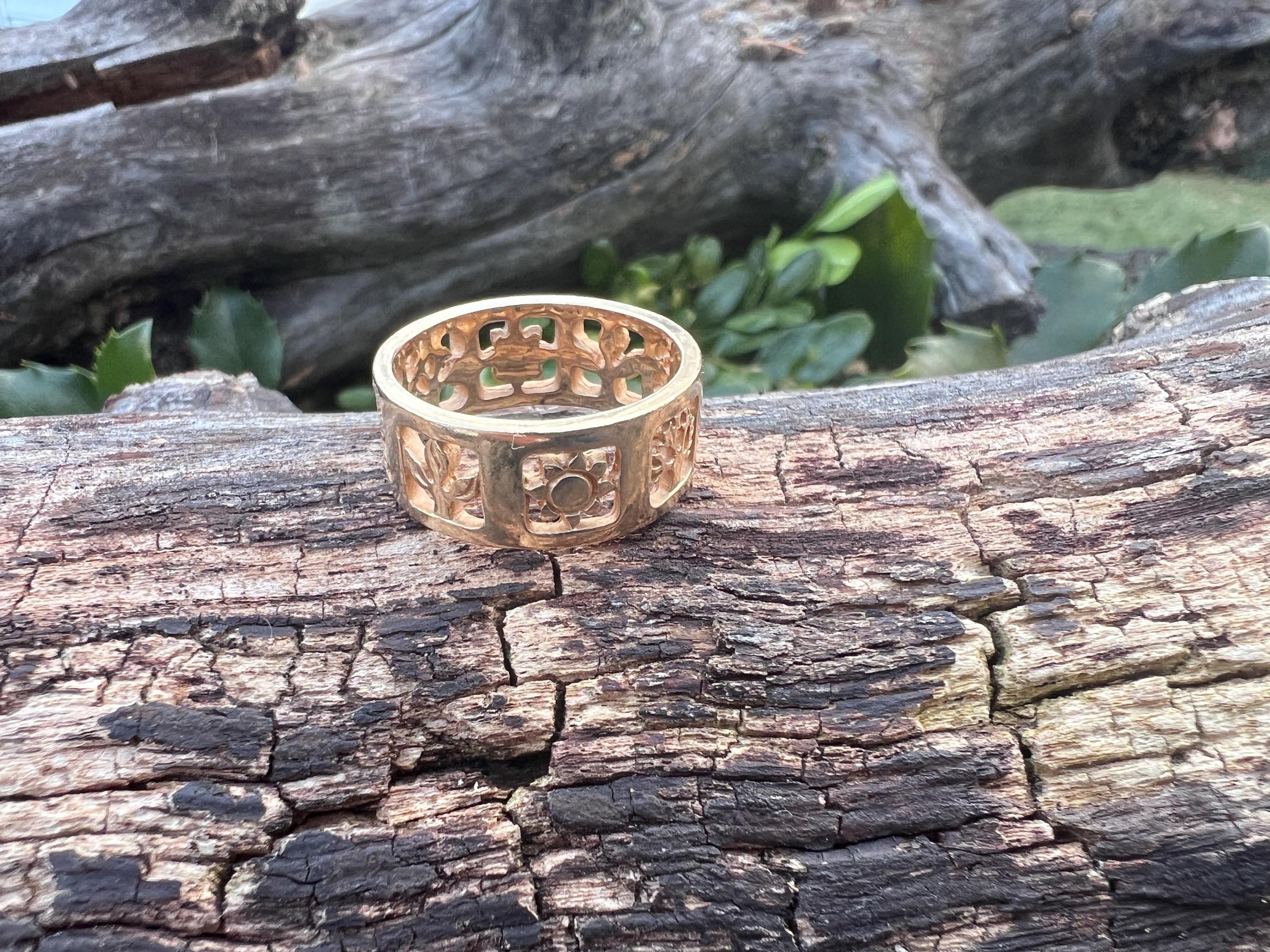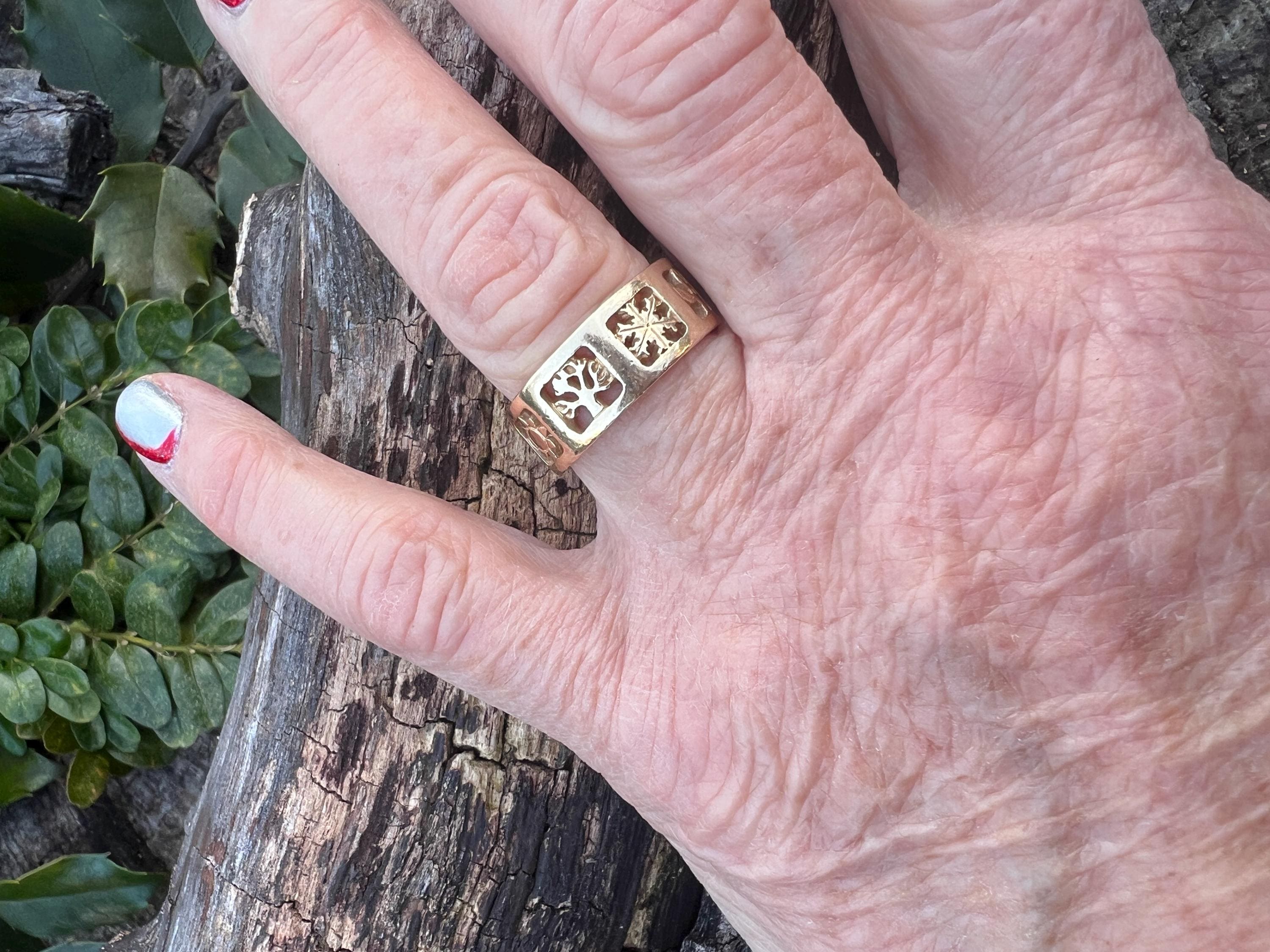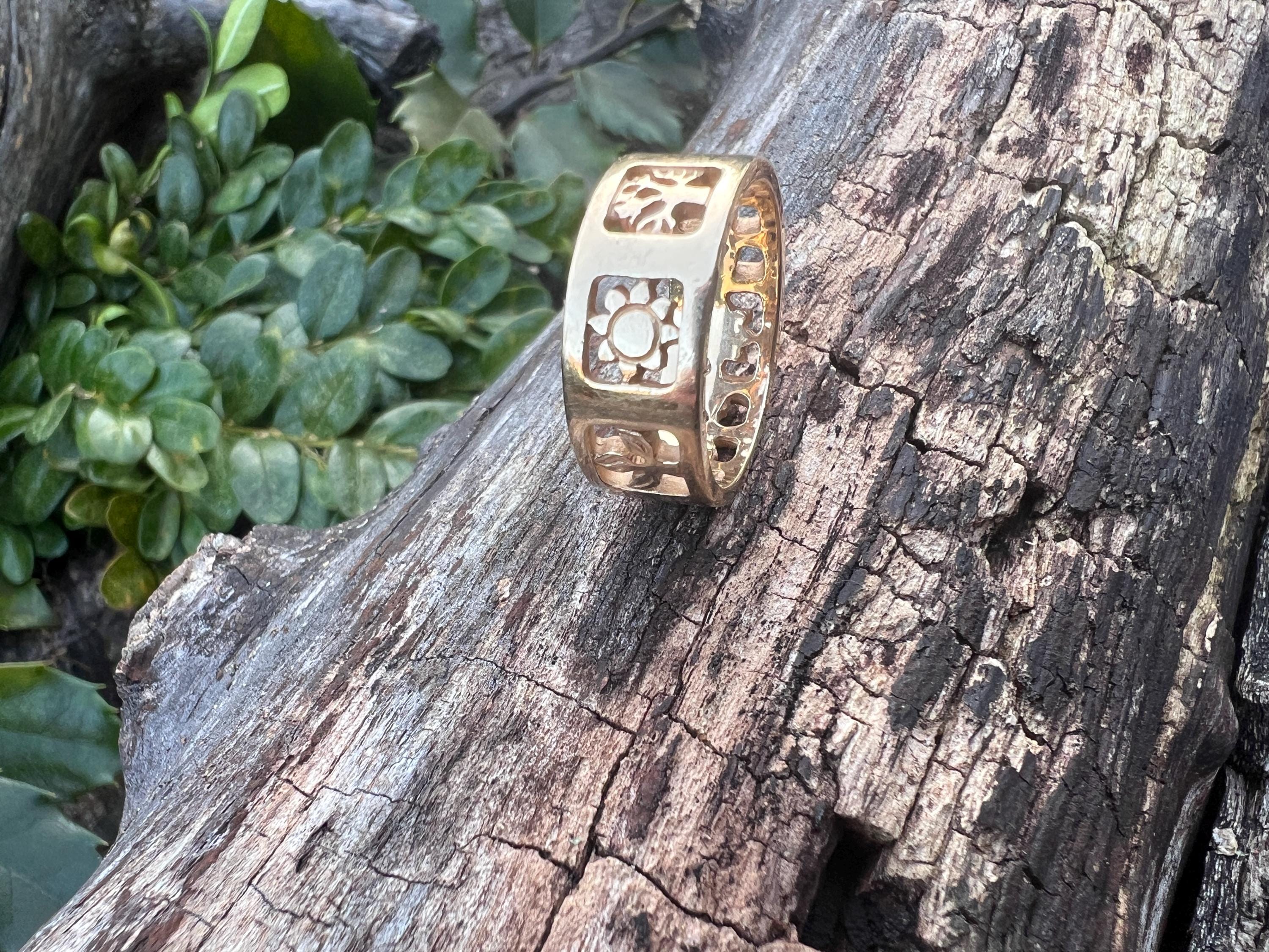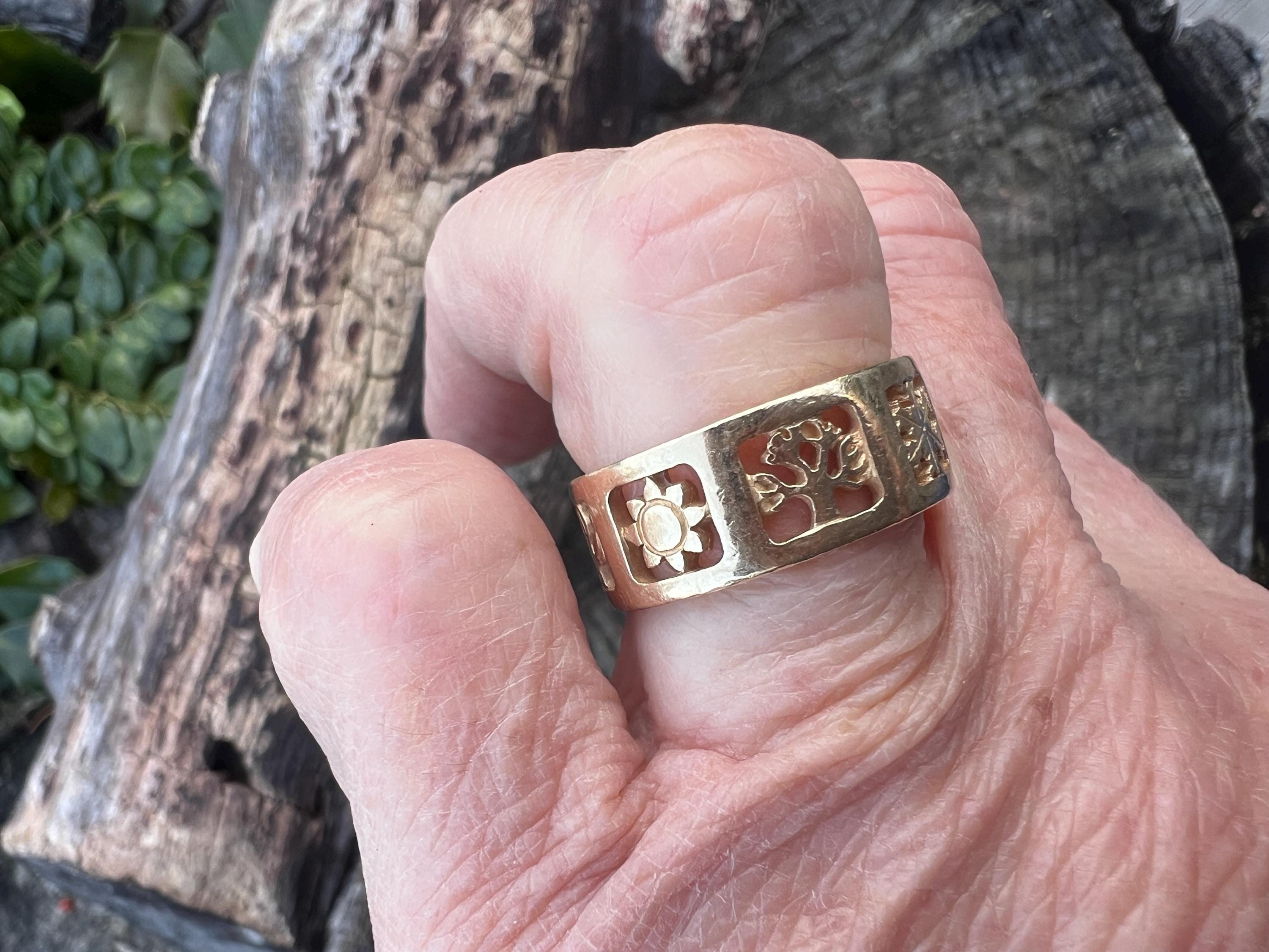 Gold and Bold, this elegant James Avery band/ring is set in 14k yellow gold. Within the chunky and wide band, the center represents the "Four" Seasons" featuring etchings of Spring, Summer, Autumn, and Winter across its surface, It is detailed in seasonal motifs like tress, flower sun and snow. Its striking aura launches a luxurious feel and land chic look on your finger. It weighs 7.22 grams. It measures 5/16" wide. It will fit a size 8. It is marked 585 (14k).