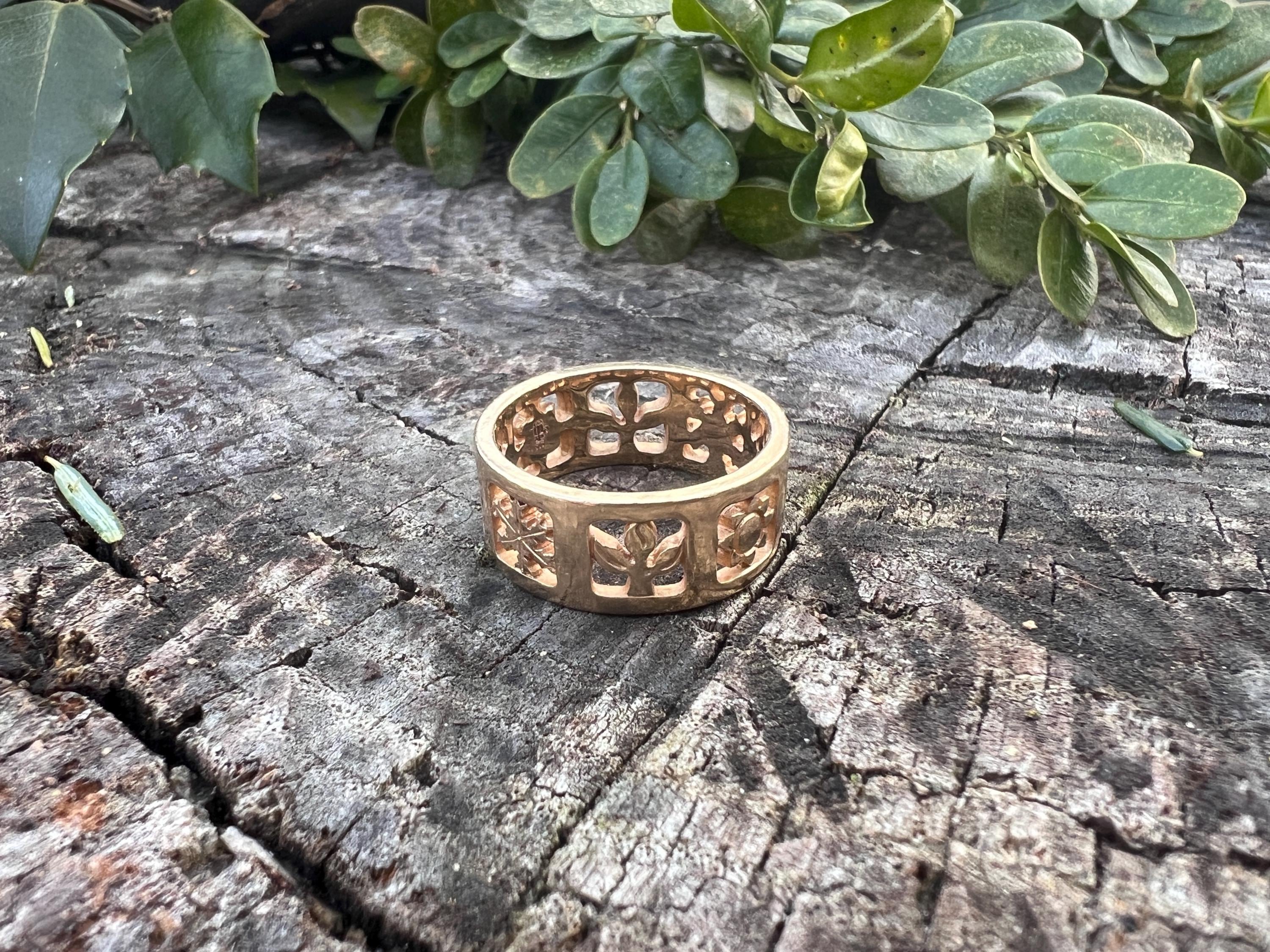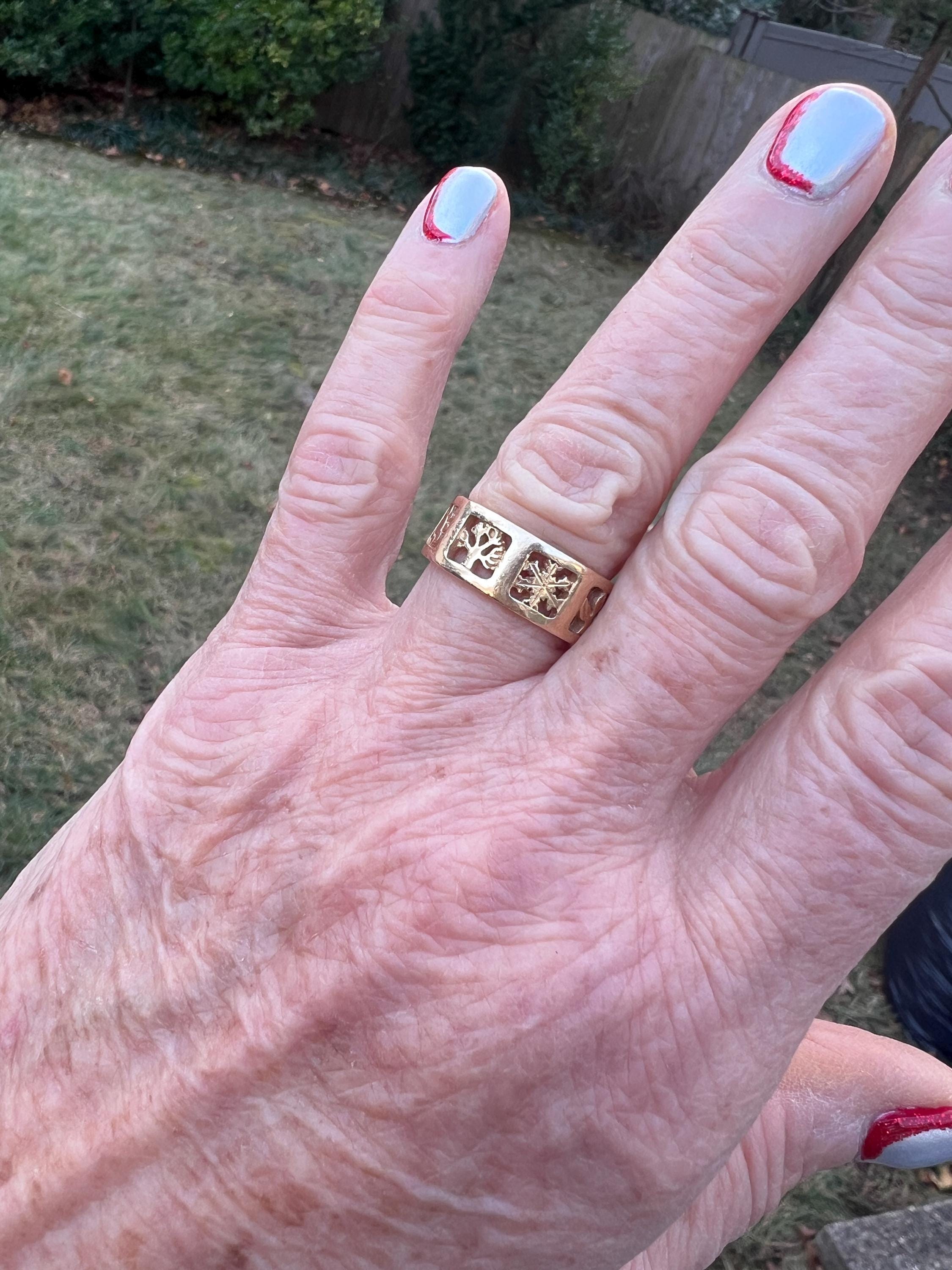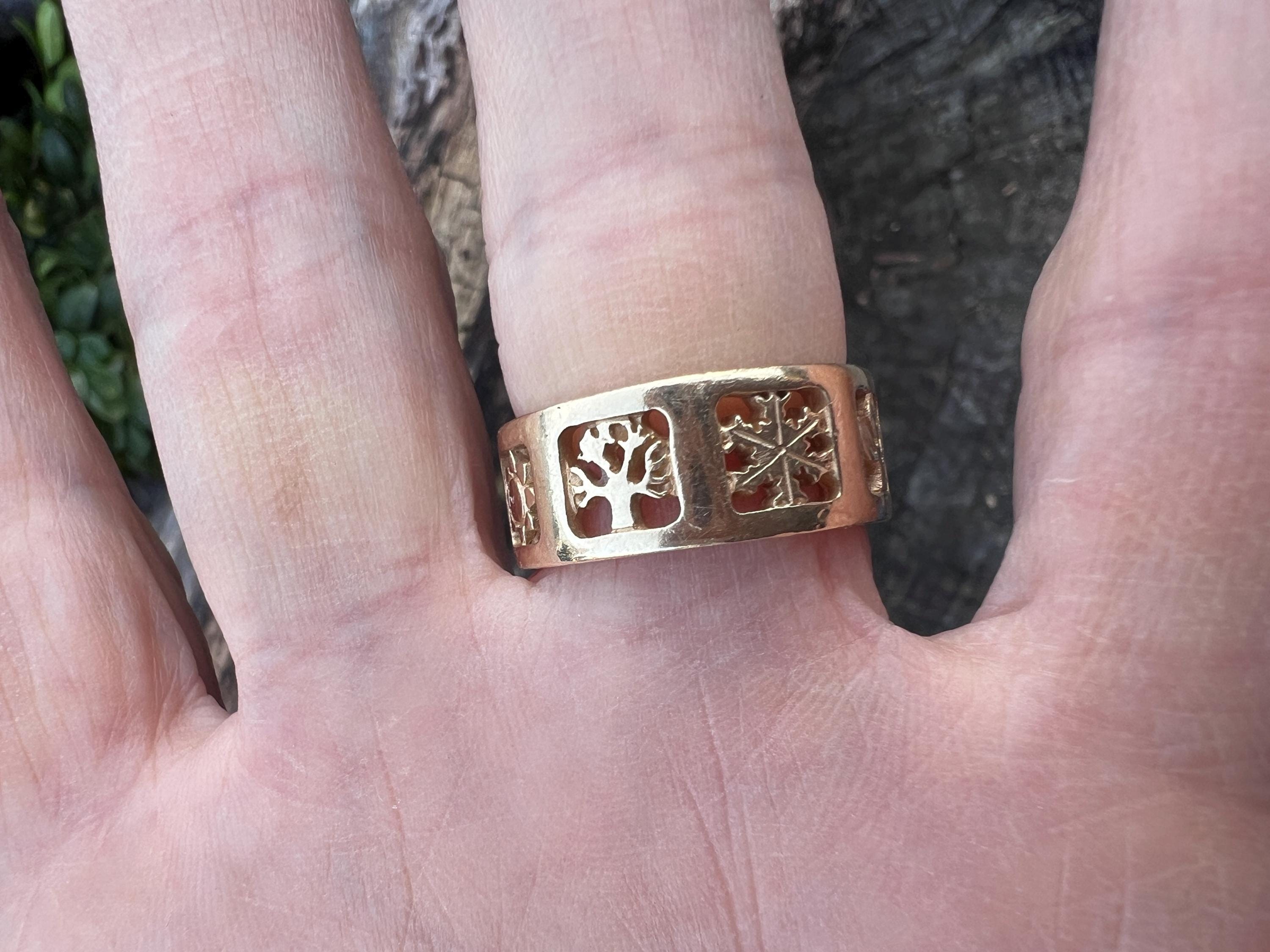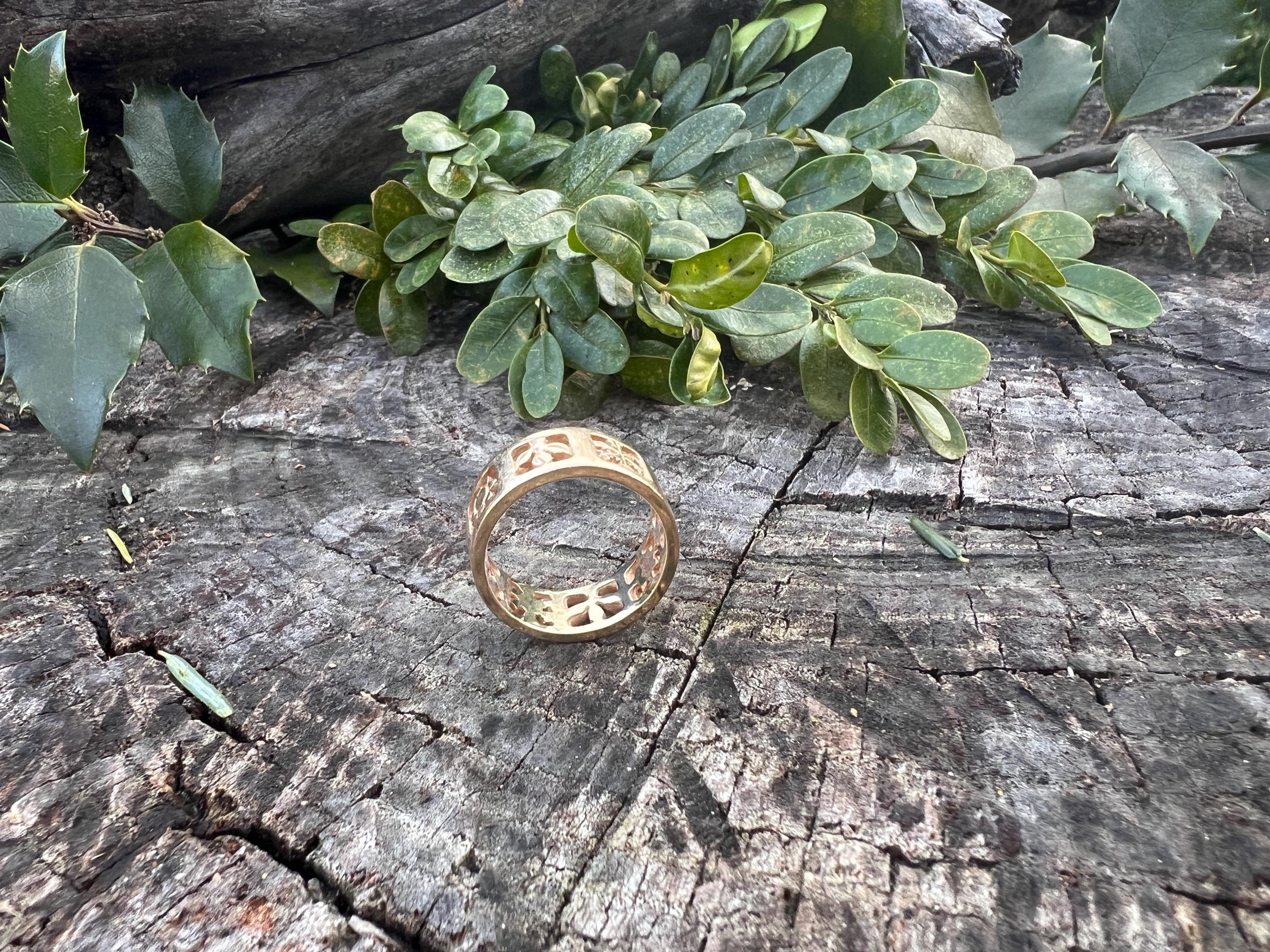 Gold and Bold, this elegant James Avery band/ring is set in 14k yellow gold. Within the chunky and wide band, the center represents the "Four" Seasons" featuring etchings of Spring, Summer, Autumn, and Winter across its surface, It is detailed in seasonal motifs like tress, flower sun and snow. Its striking aura launches a luxurious feel and land chic look on your finger. It weighs 7.22 grams. It measures 5/16" wide. It will fit a size 8. It is marked 585 (14k).