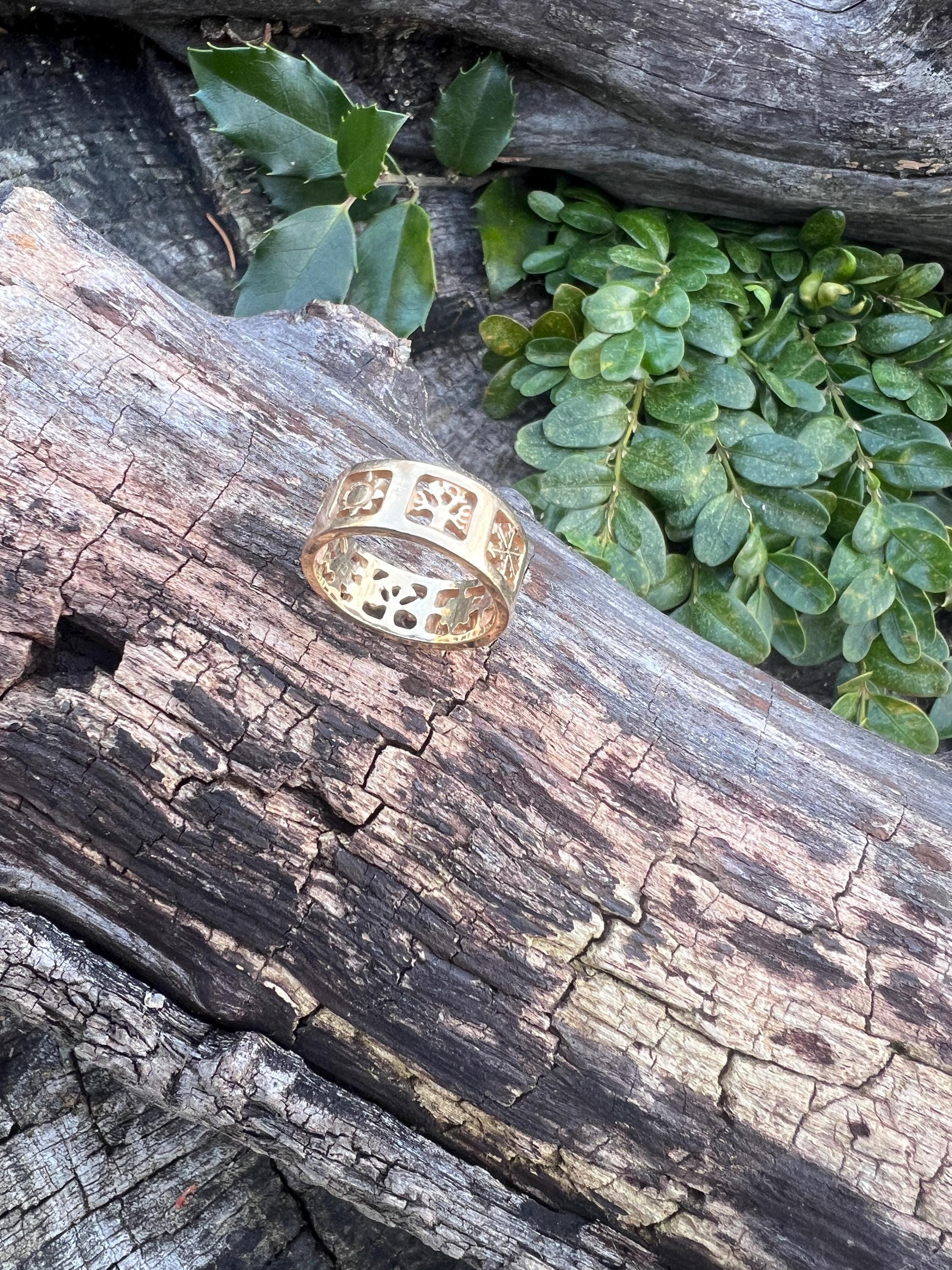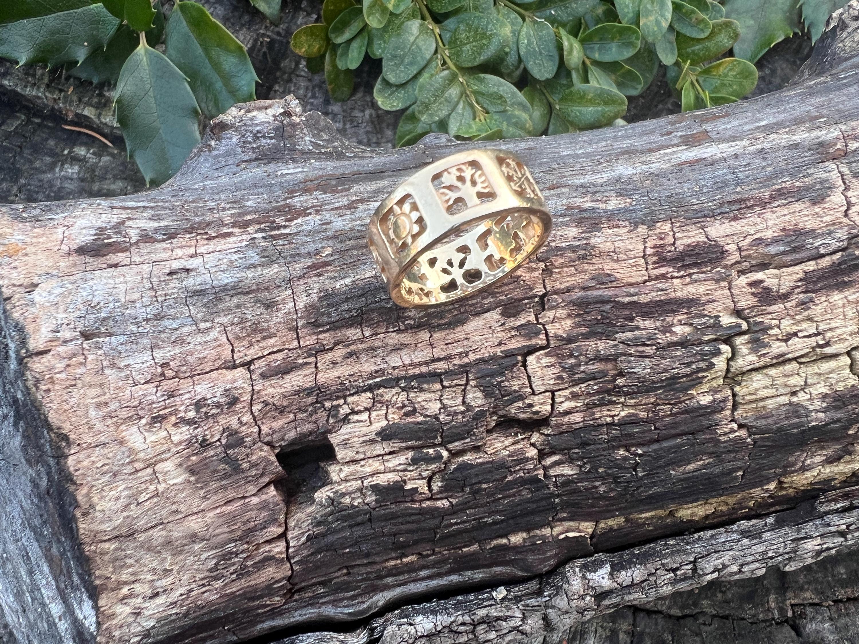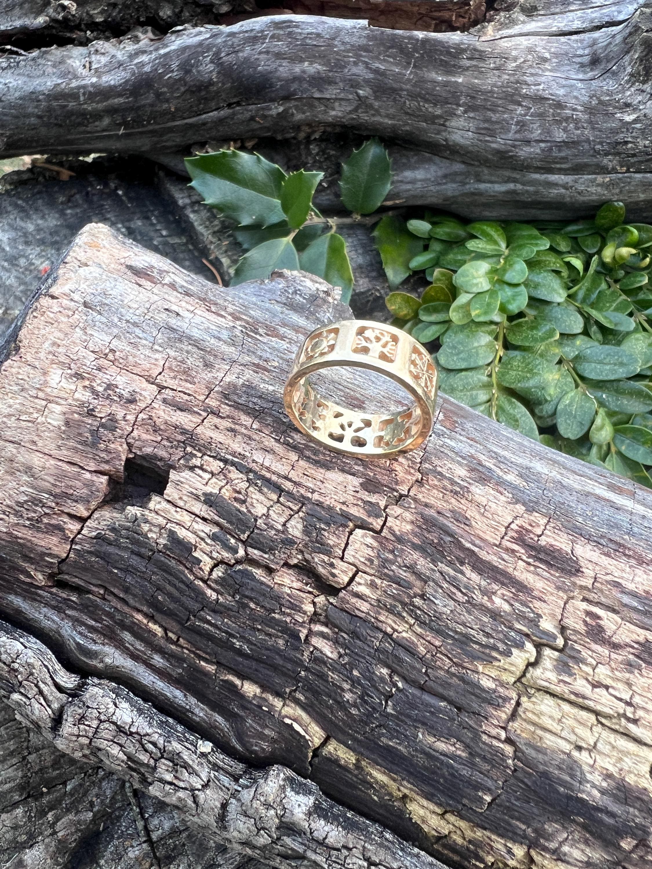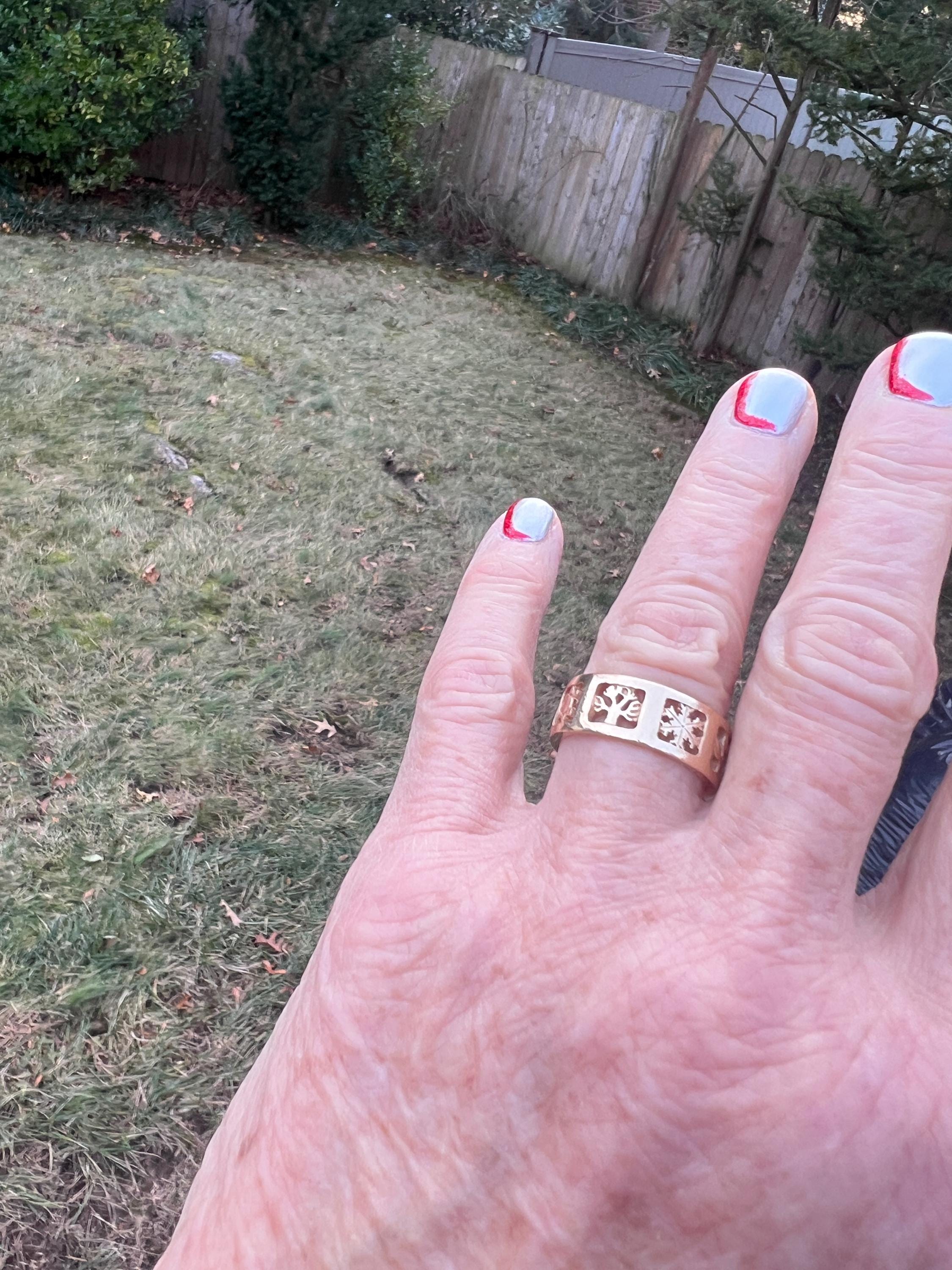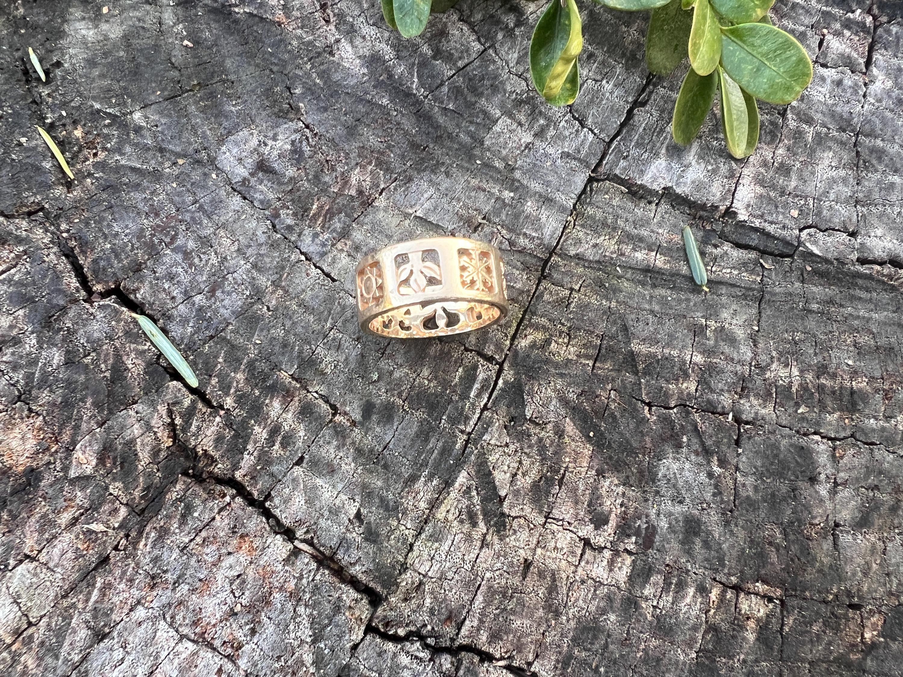 Gold and Bold, this elegant James Avery band/ring is set in 14k yellow gold. Within the chunky and wide band, the center represents the "Four" Seasons" featuring etchings of Spring, Summer, Autumn, and Winter across its surface, It is detailed in seasonal motifs like tress, flower sun and snow. Its striking aura launches a luxurious feel and land chic look on your finger. It weighs 7.22 grams. It measures 5/16" wide. It will fit a size 8. It is marked 585 (14k).
