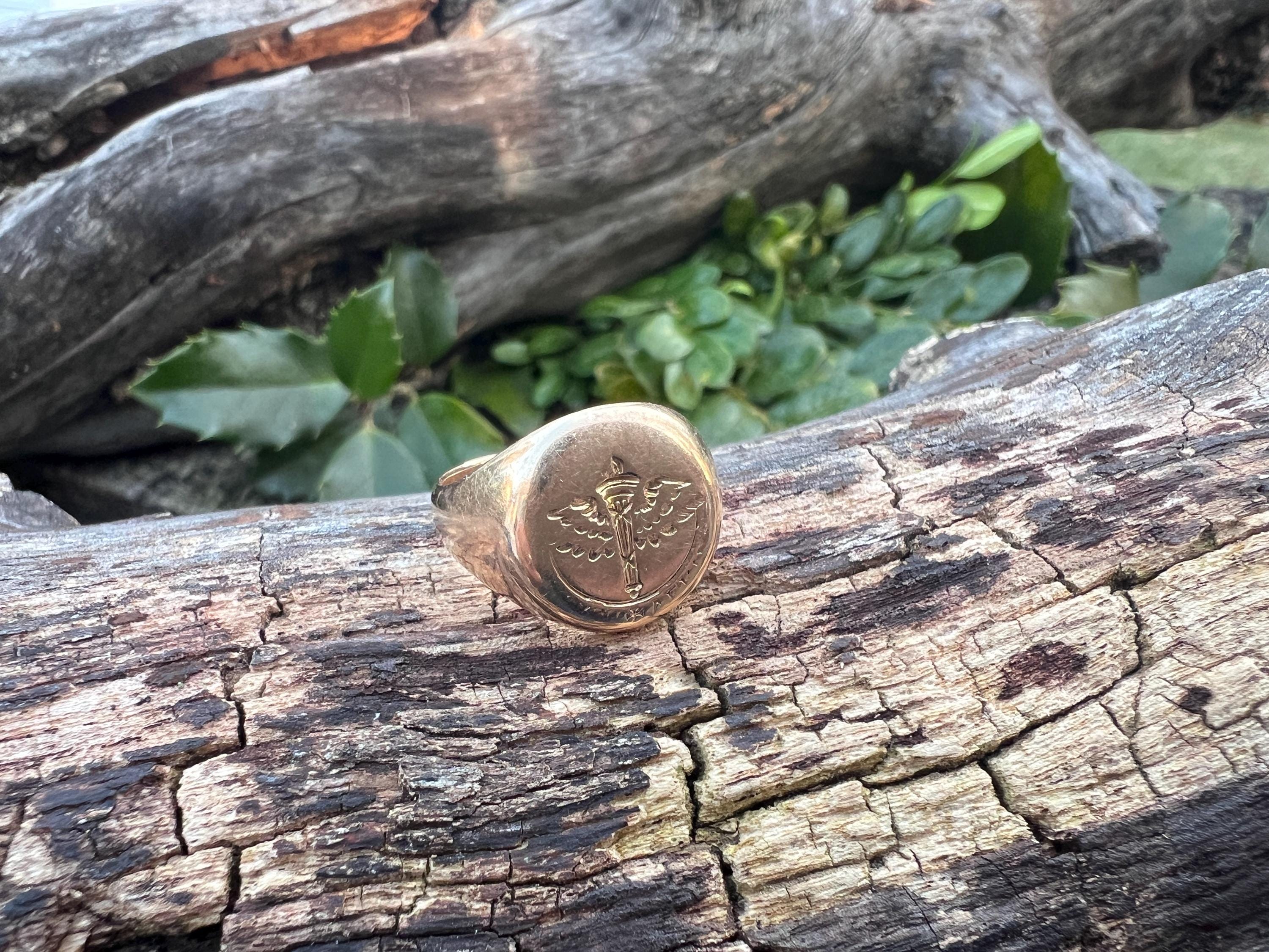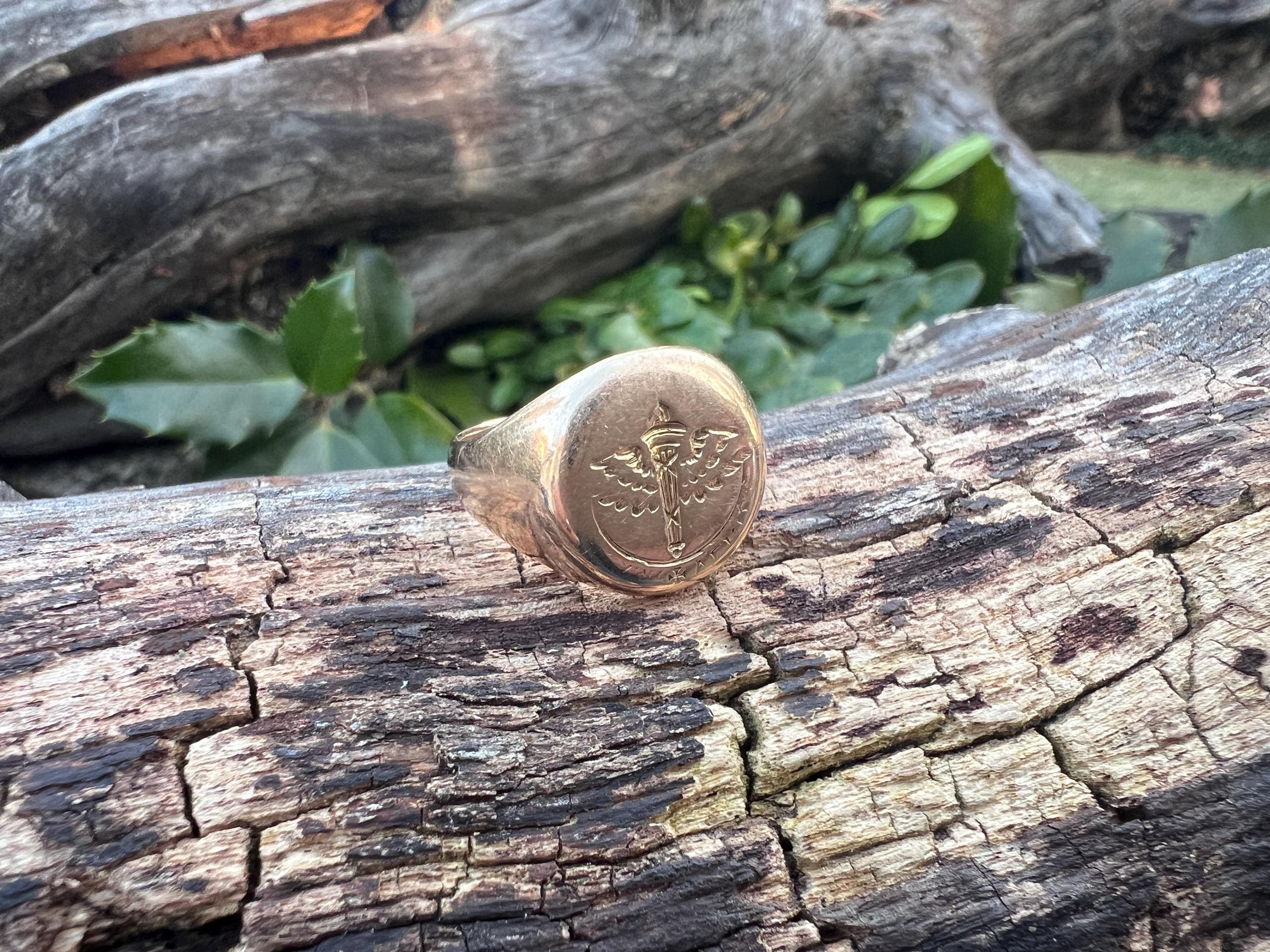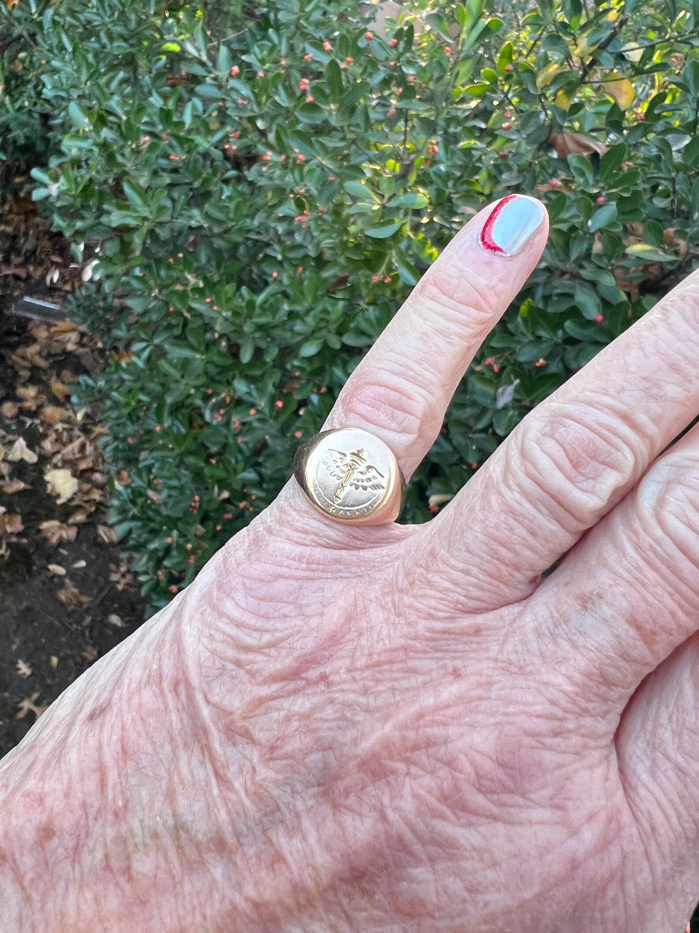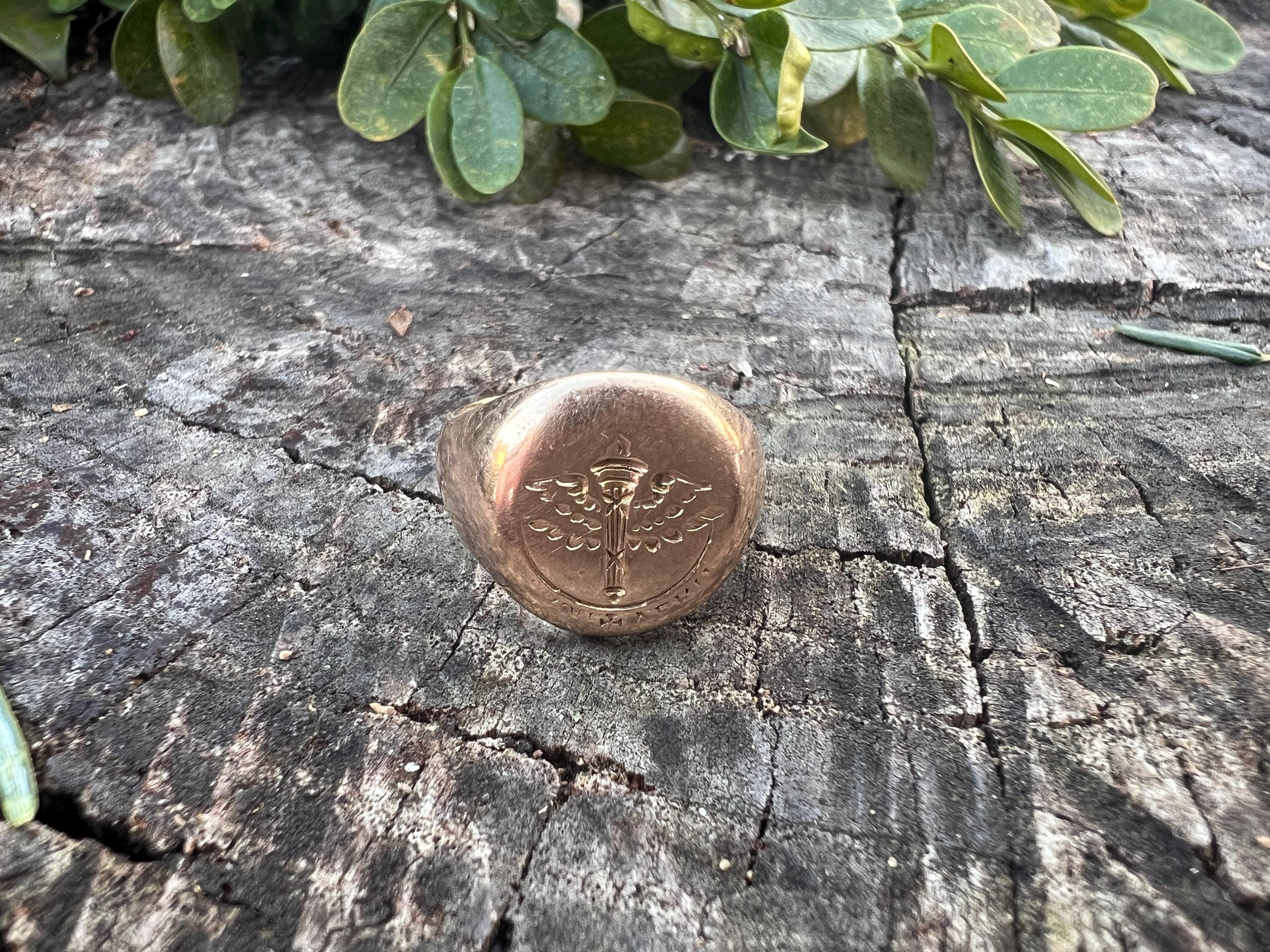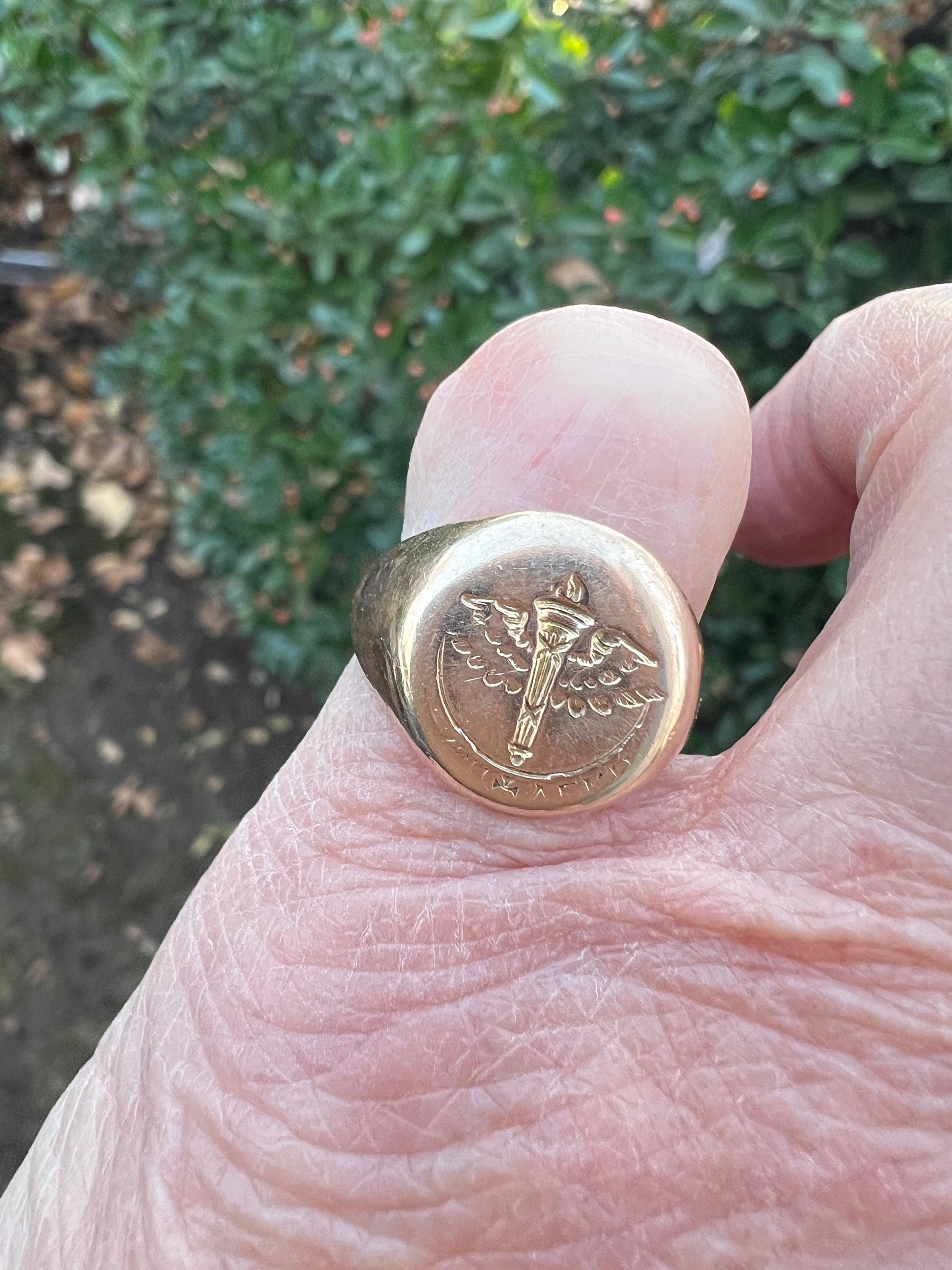 This striking art deco signet ring is set in 10k yellow gold. It dates from the 1930s. The center crest makes for an imposing and impressive look. It is a military aviation crest. It is boldly beautiful. A truly unique find. The ring is a size 6. It weighs 7.72 grams. The top measures 1/2"x 7/16". It is marked 10k, Lambert Bros, AEG and 1932.