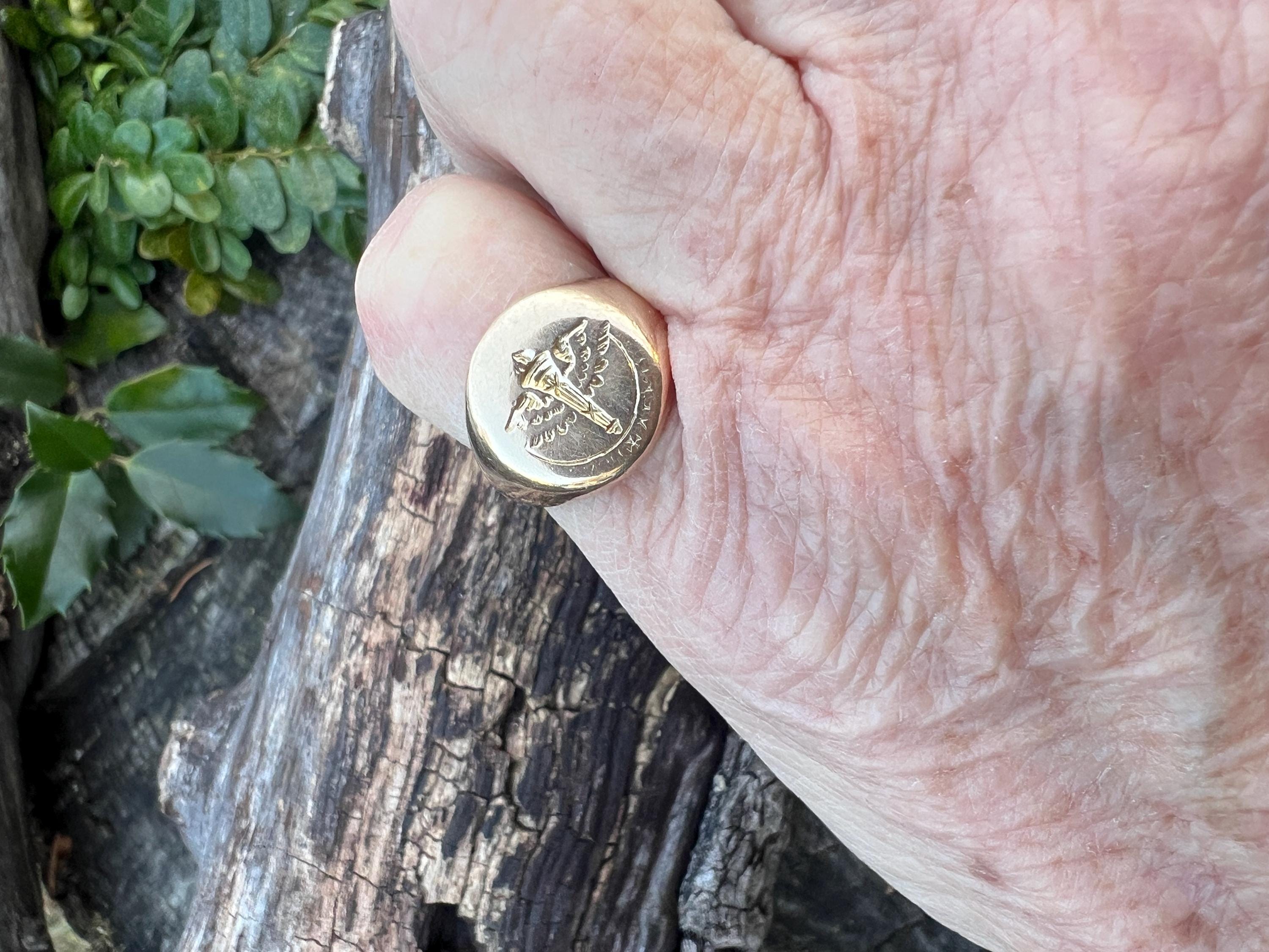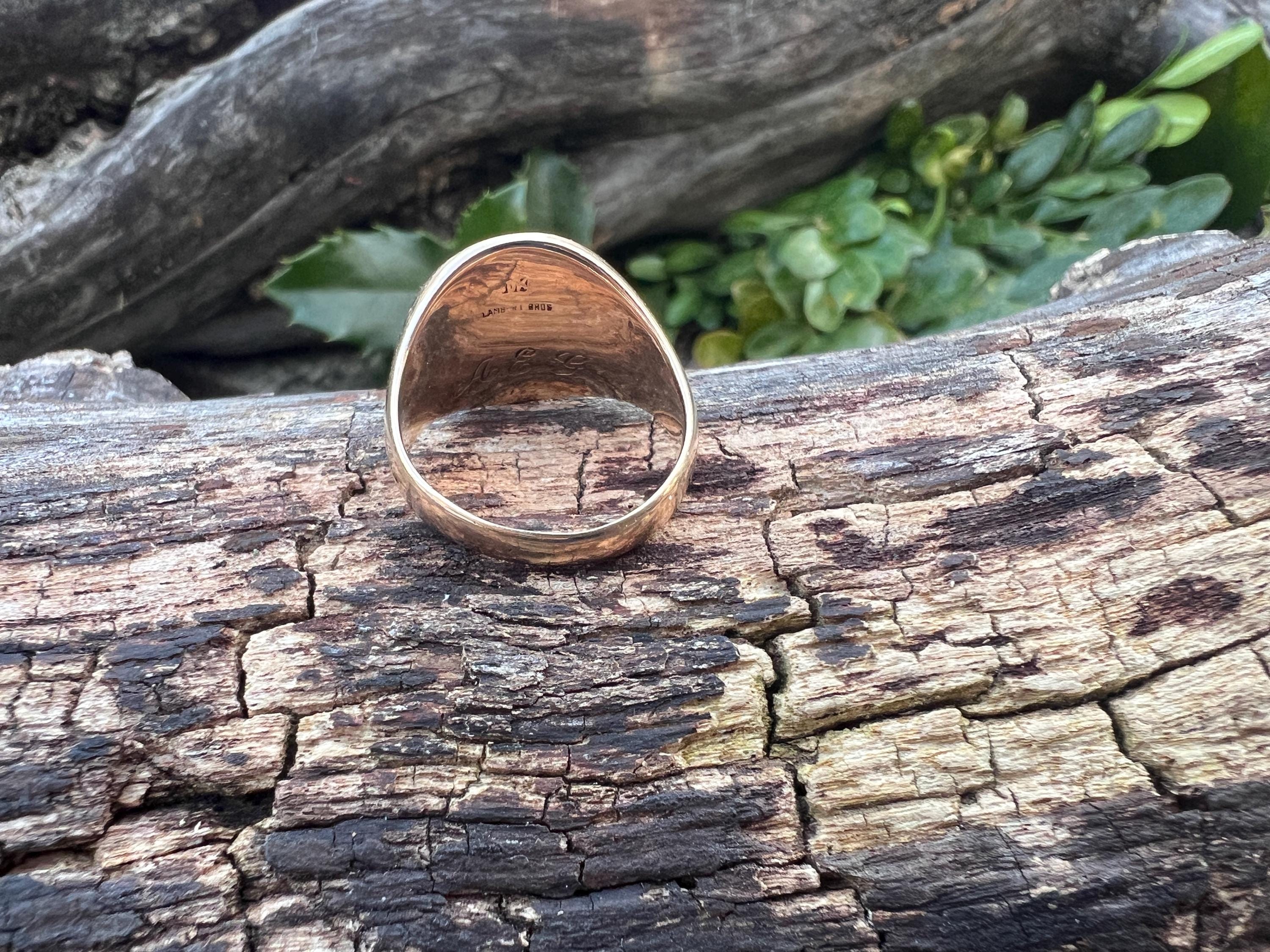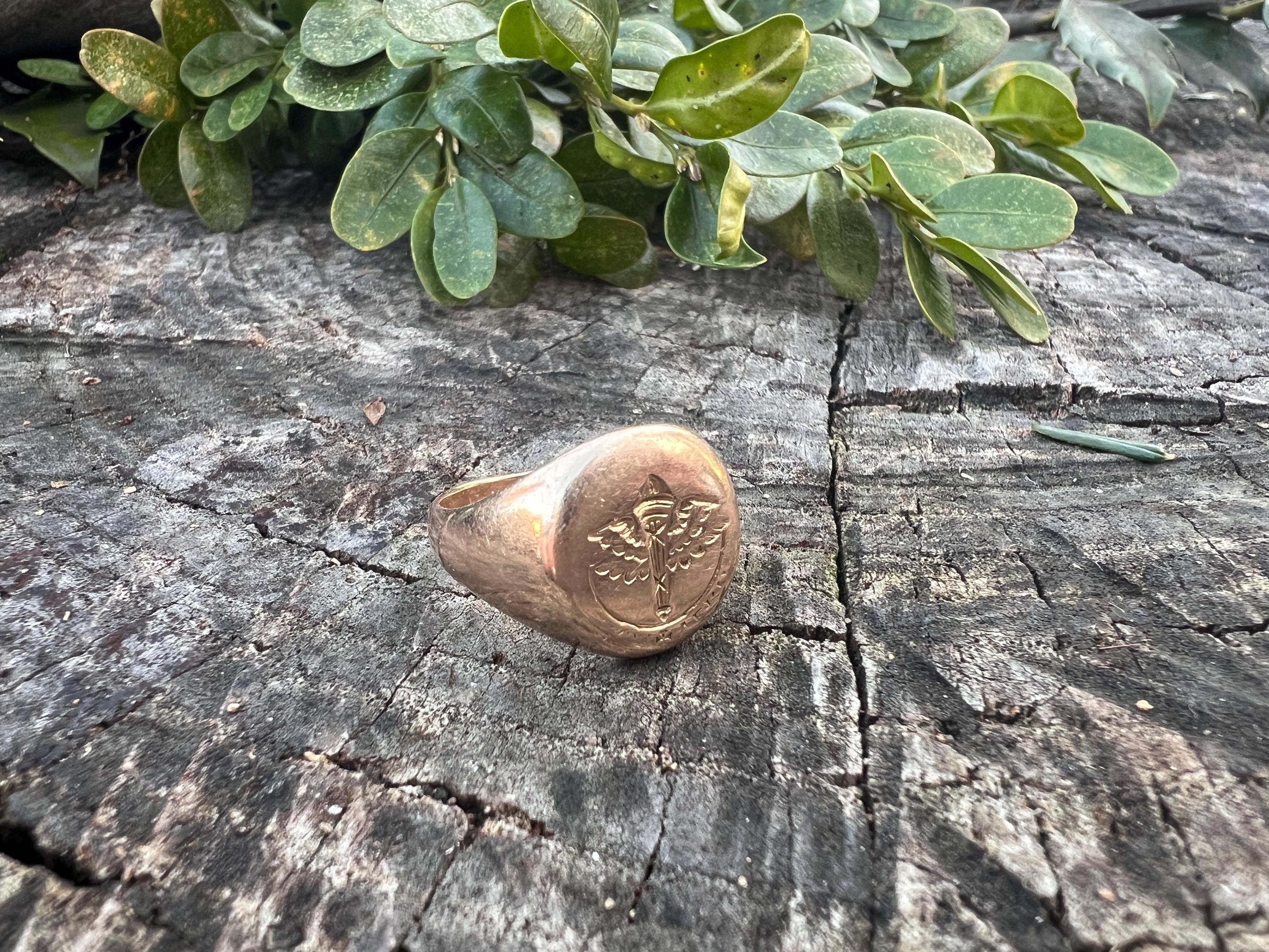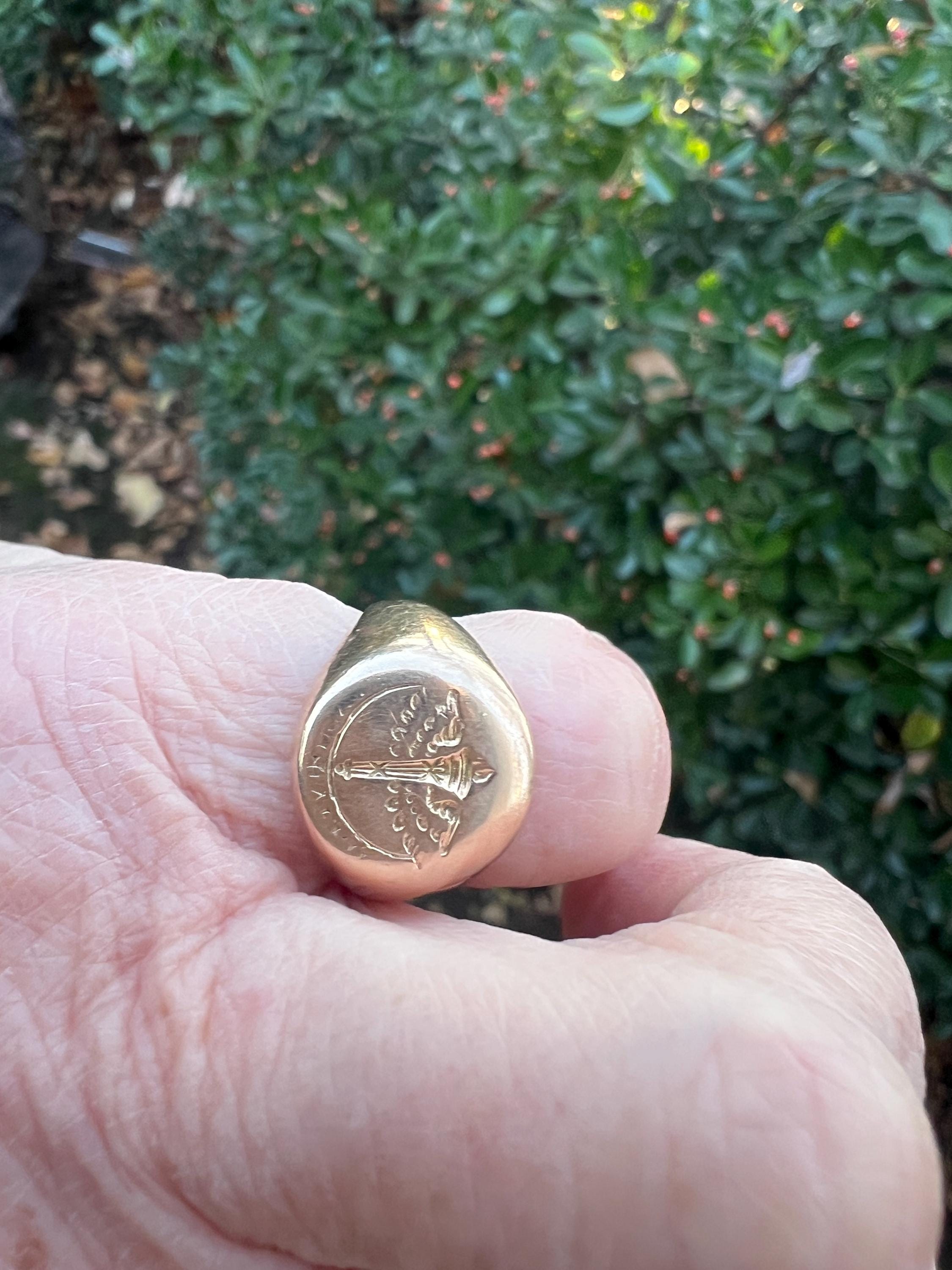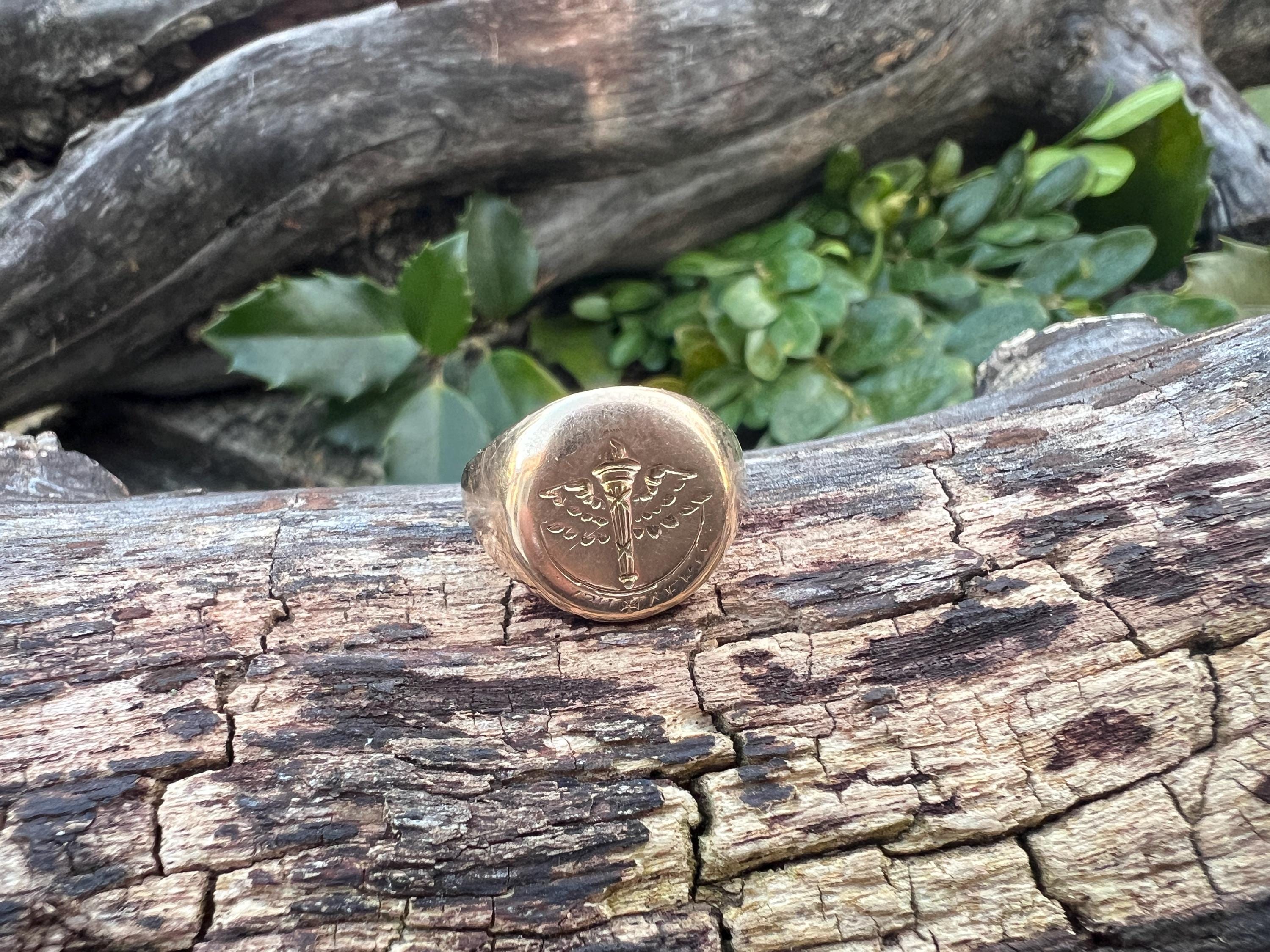 This striking art deco signet ring is set in 10k yellow gold. It dates from the 1930s. The center crest makes for an imposing and impressive look. It is a military aviation crest. It is boldly beautiful. A truly unique find. The ring is a size 6. It weighs 7.72 grams. The top measures 1/2"x 7/16". It is marked 10k, Lambert Bros, AEG and 1932.