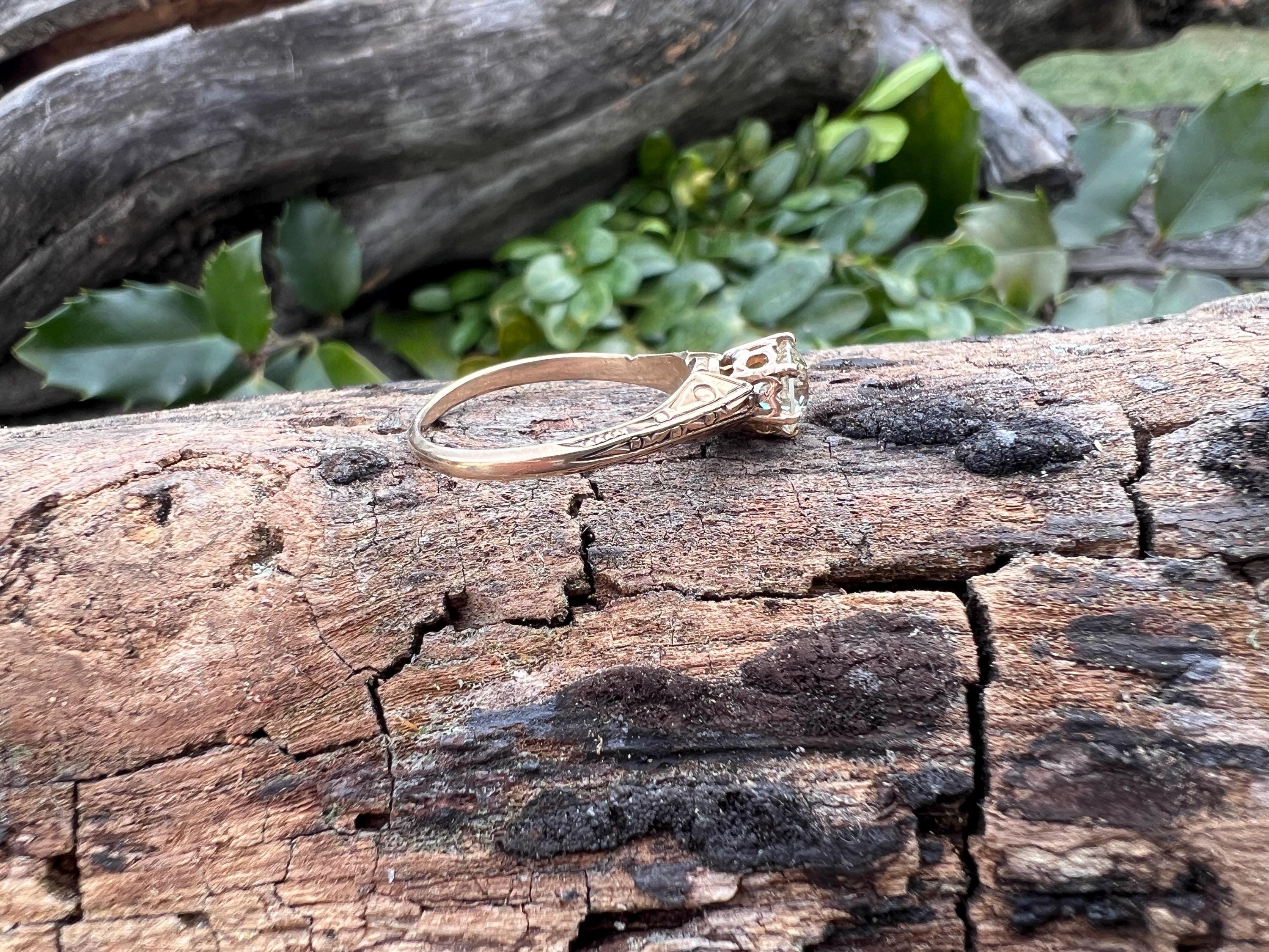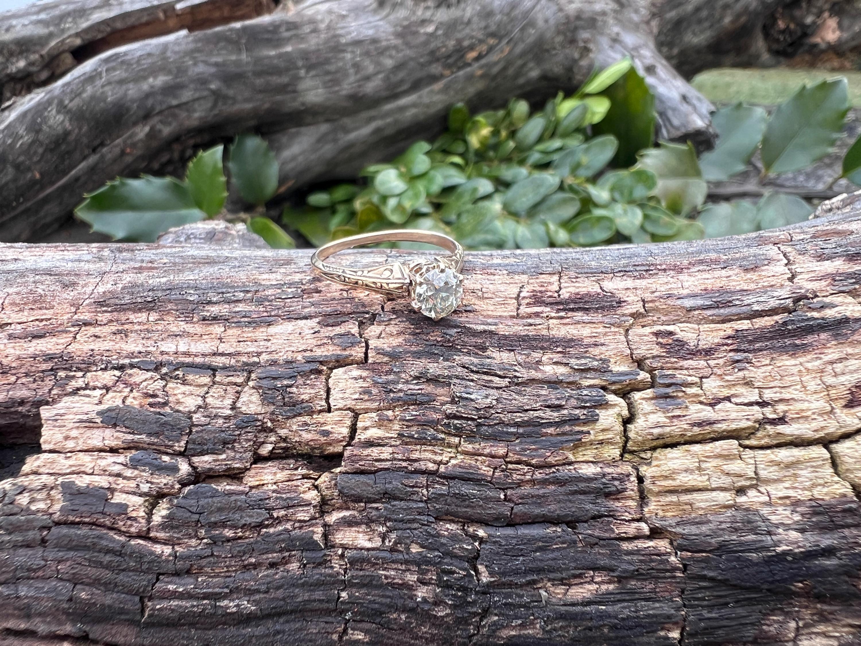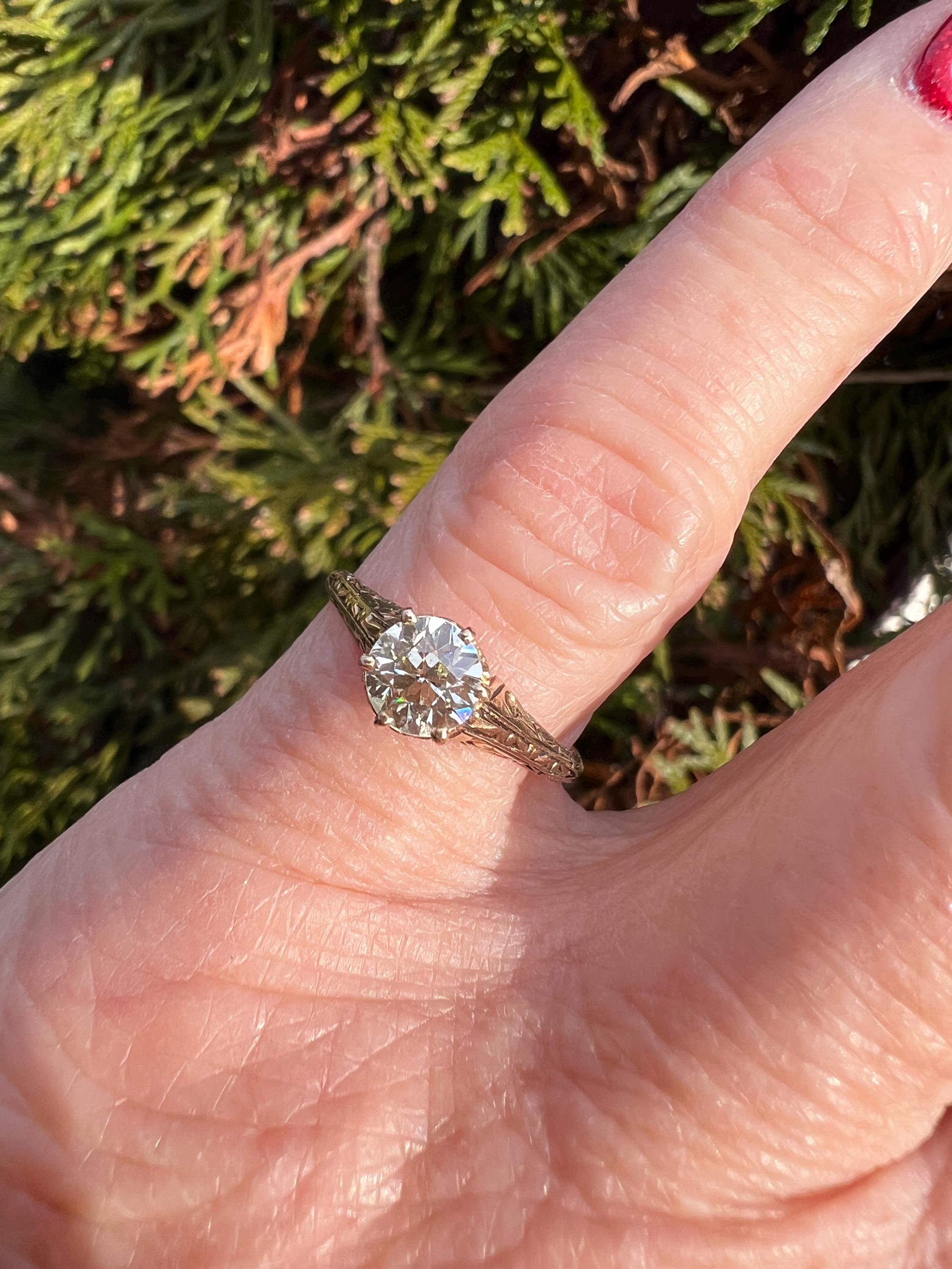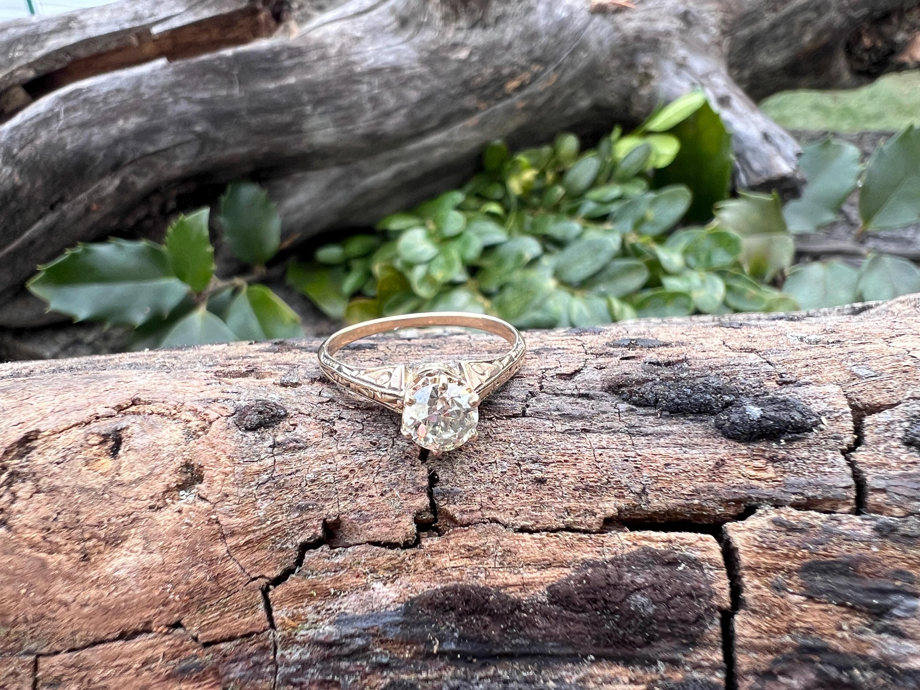 Striking and eloquent, this Victorian engagement ring is set in 10k yellow gold. It dates from the late 1800s. A solitary old European cut diamond that weighs approx. .70 ct is set in the center. The diamond is I/J in color and SI1 clarity. With elaborate engraving cascading down the sides for allure, this is a whimsically effortless piece. It is a size 6, but can be easily resized. It weighs 1.93 grams.It sits 5/16" off the finger. It is marked 10k.
