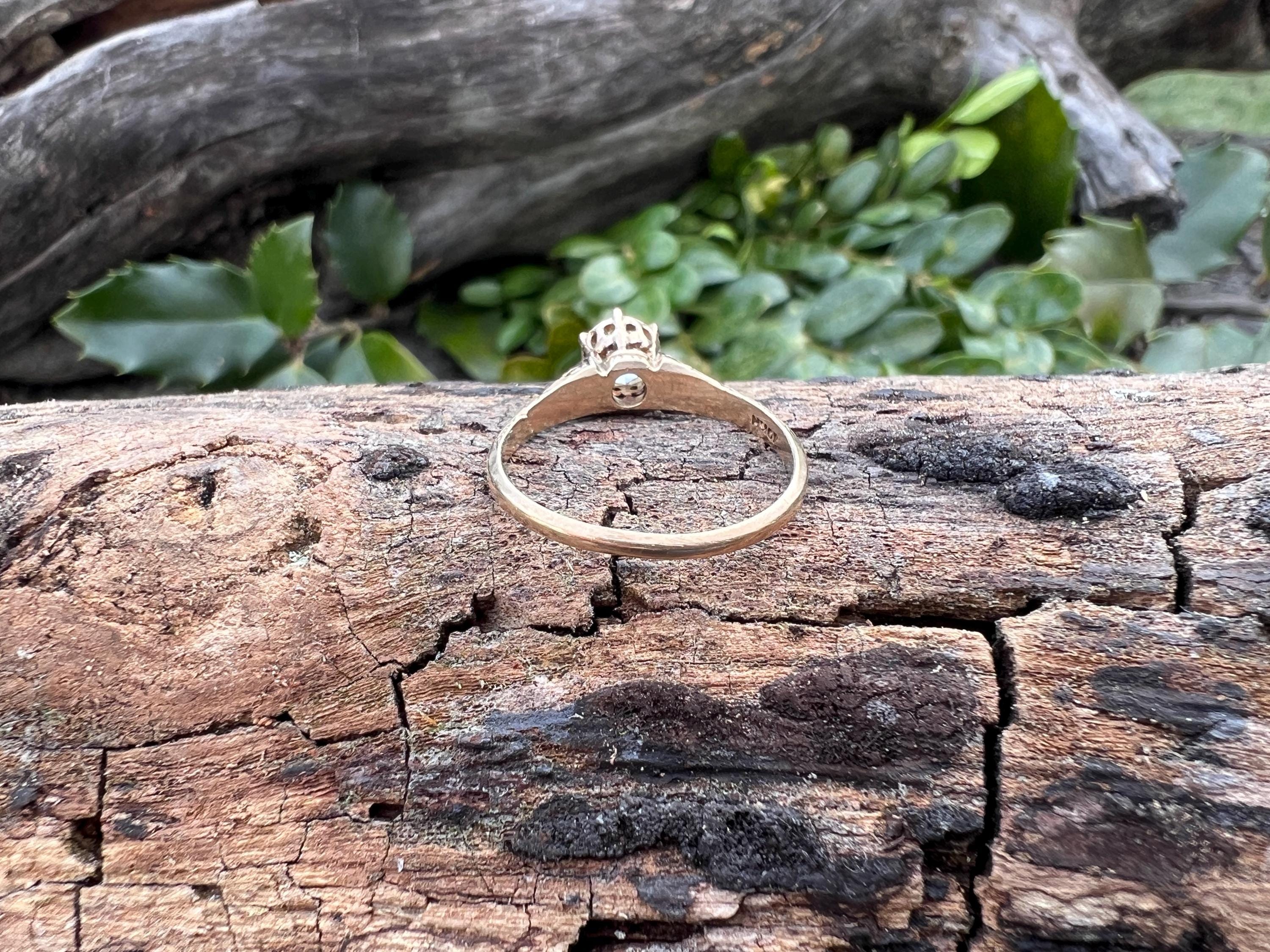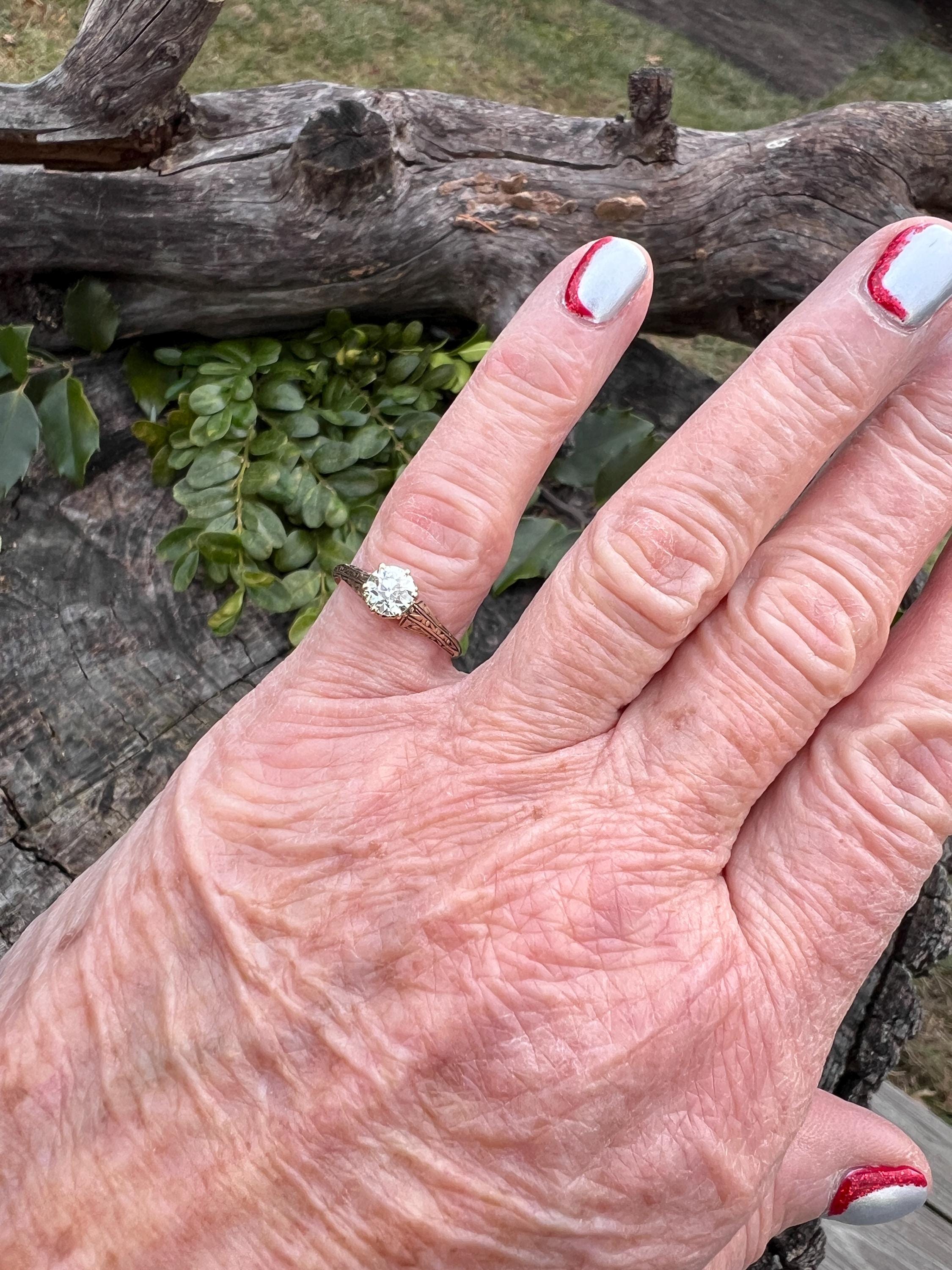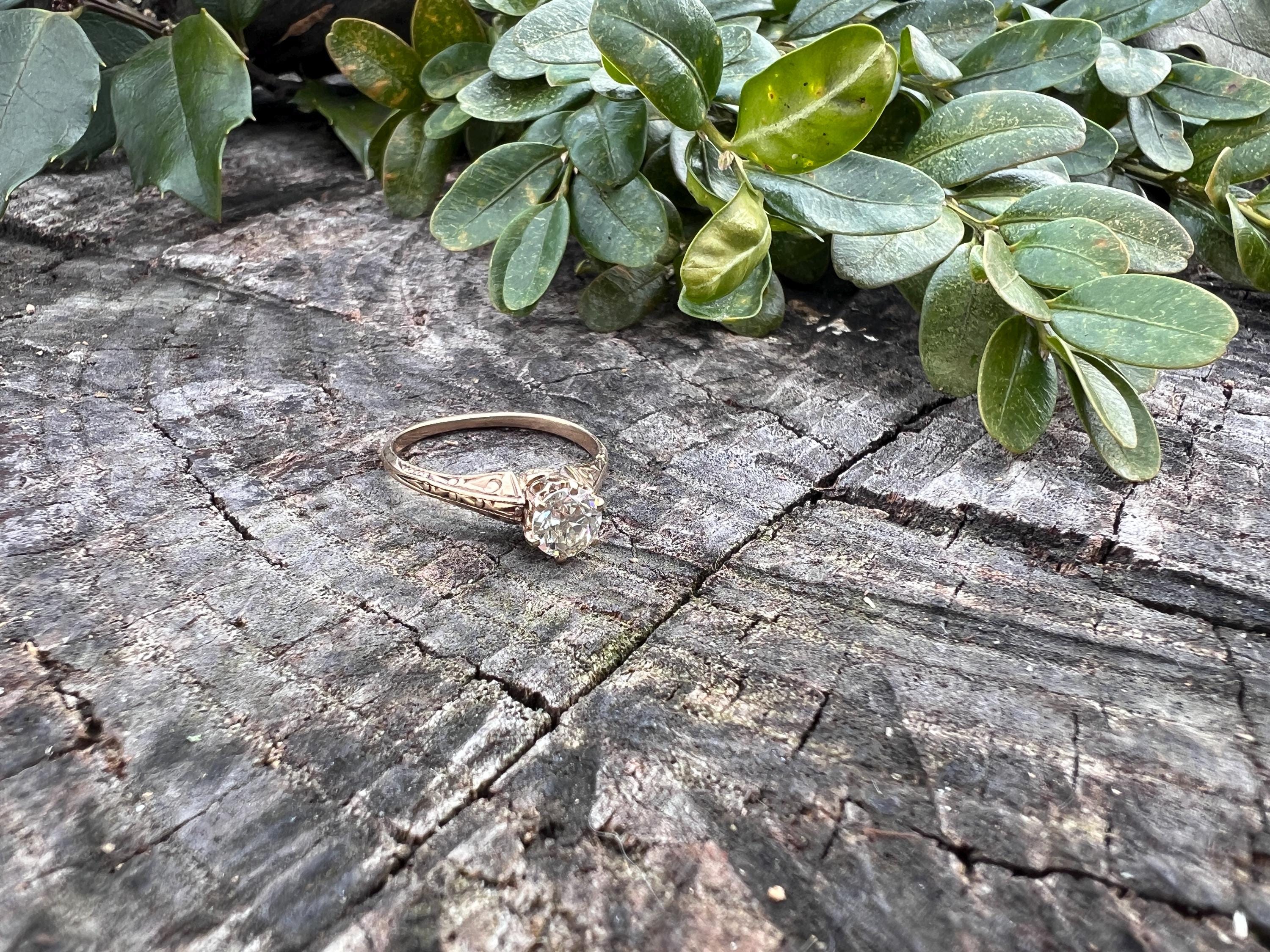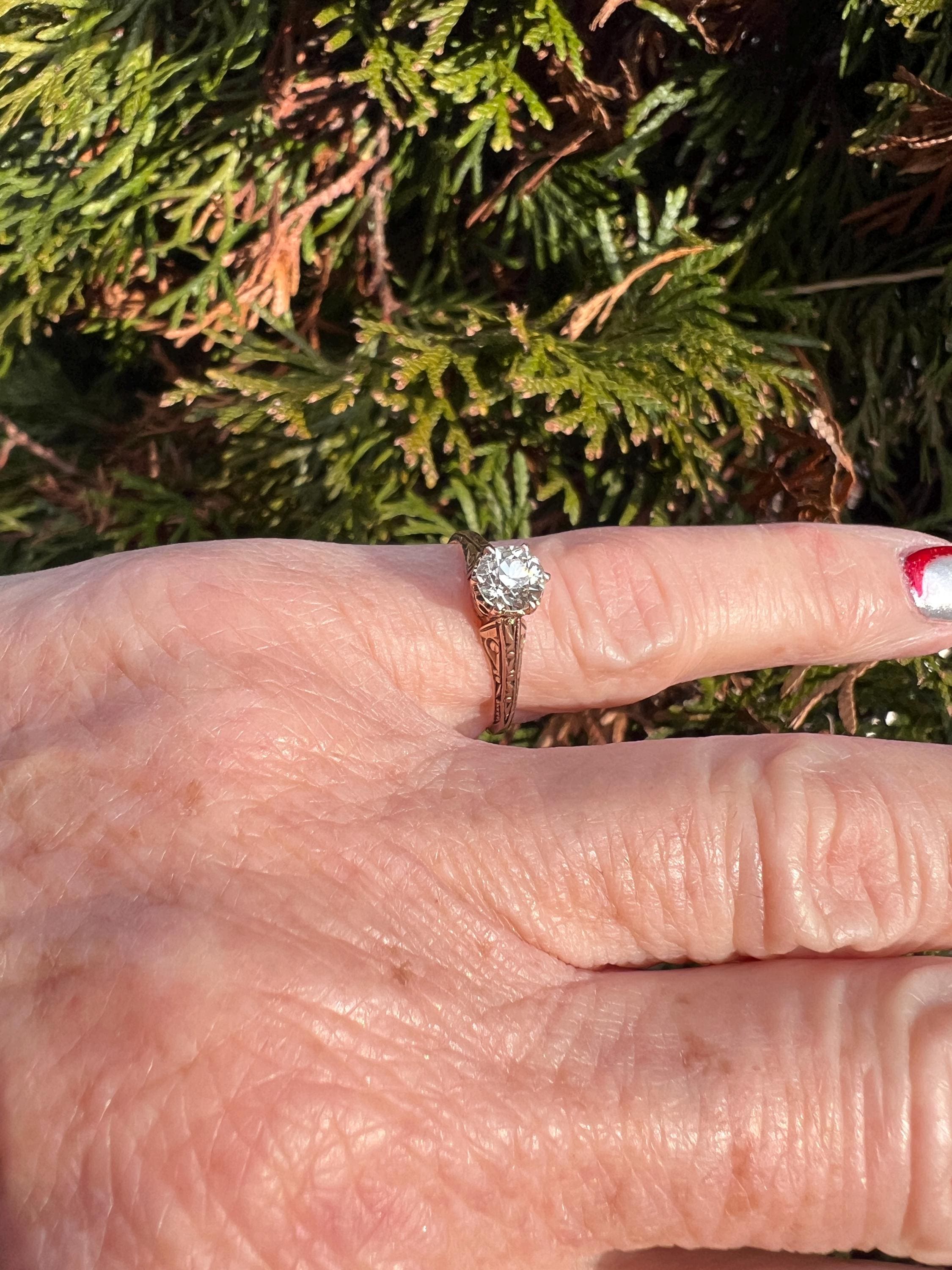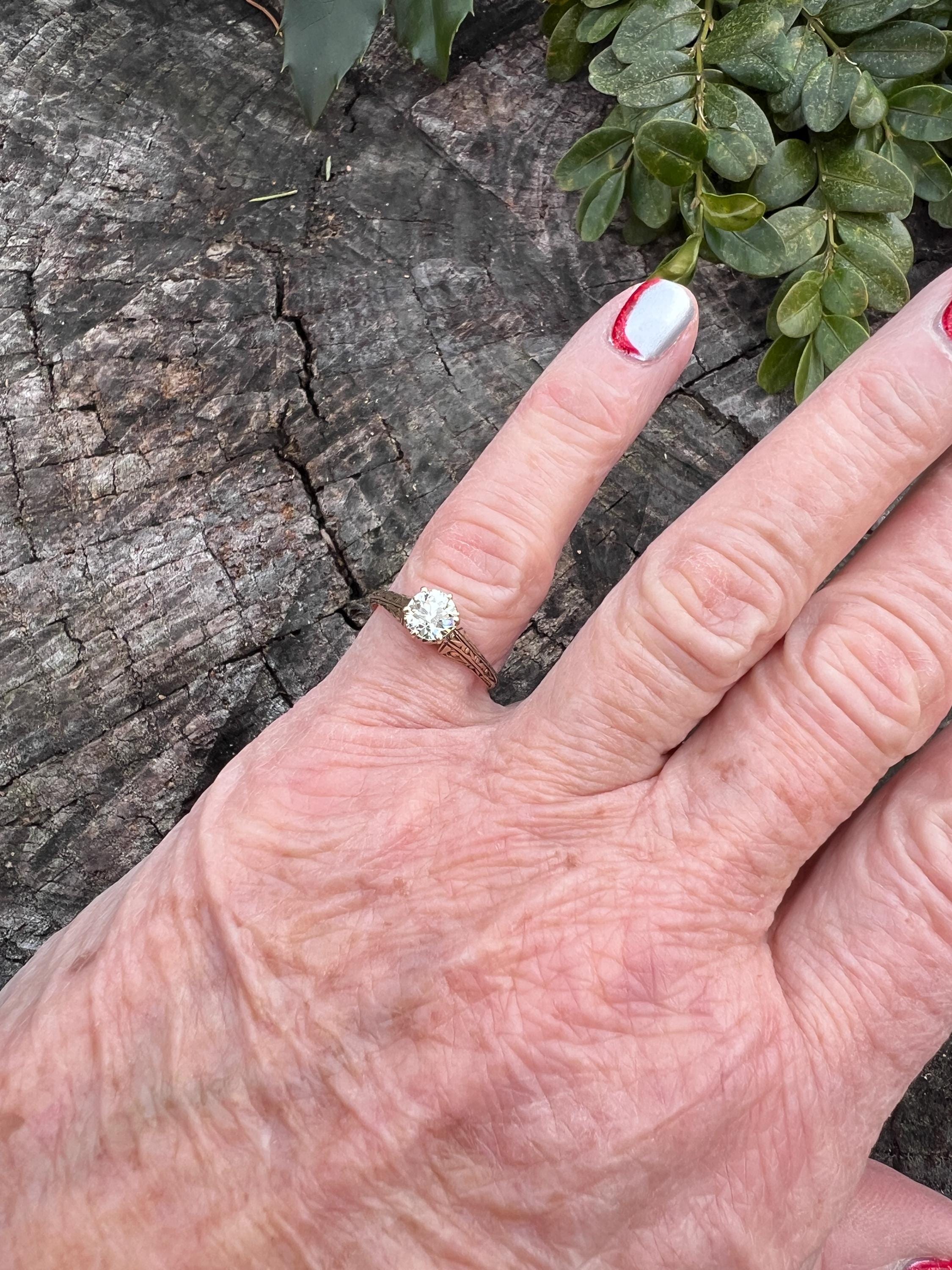Striking and eloquent, this Victorian engagement ring is set in 10k yellow gold. It dates from the late 1800s. A solitary old European cut diamond that weighs approx. .70 ct is set in the center. The diamond is I/J in color and SI1 clarity. With elaborate engraving cascading down the sides for allure, this is a whimsically effortless piece. It is a size 6, but can be easily resized. It weighs 1.93 grams.It sits 5/16" off the finger. It is marked 10k.