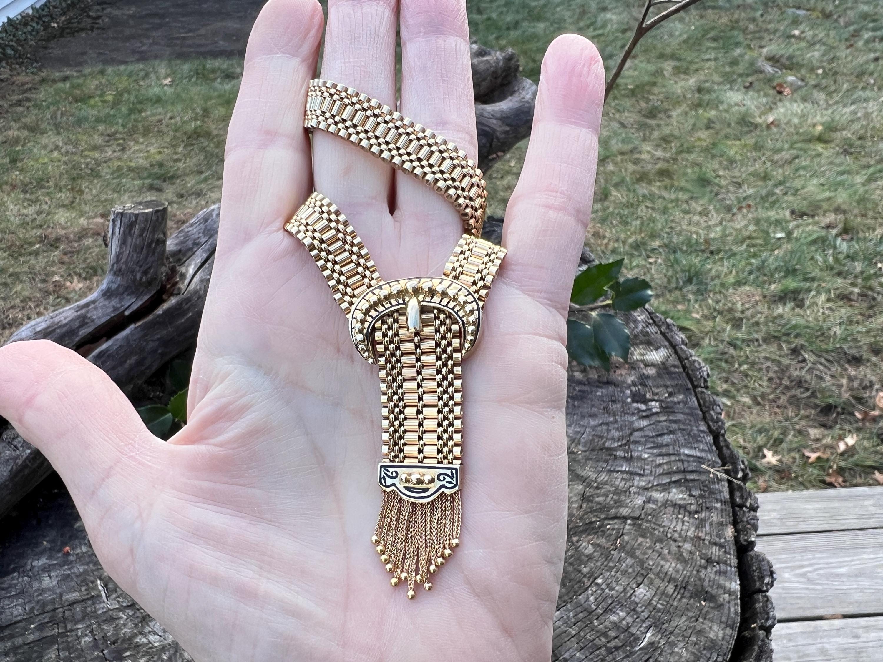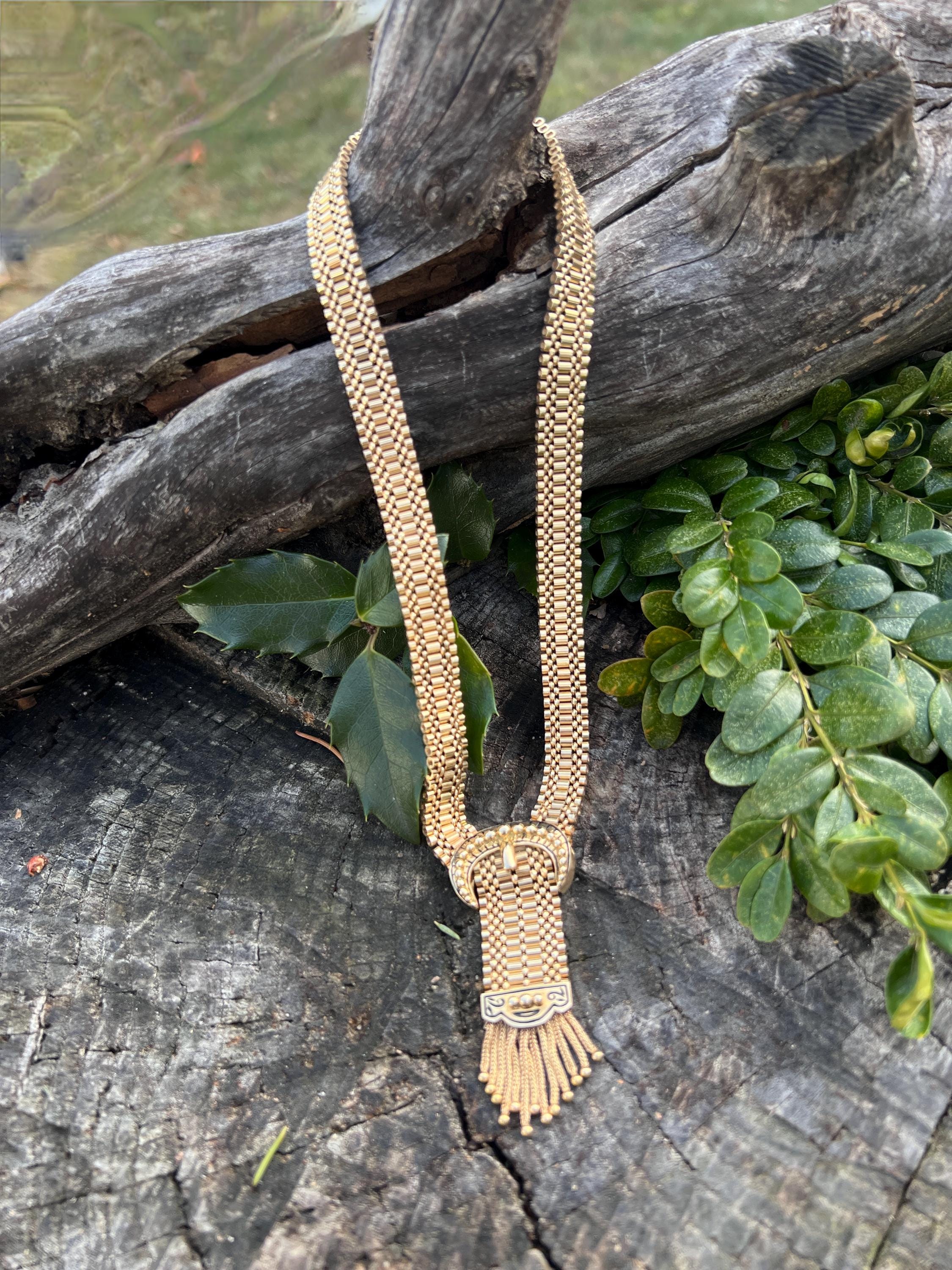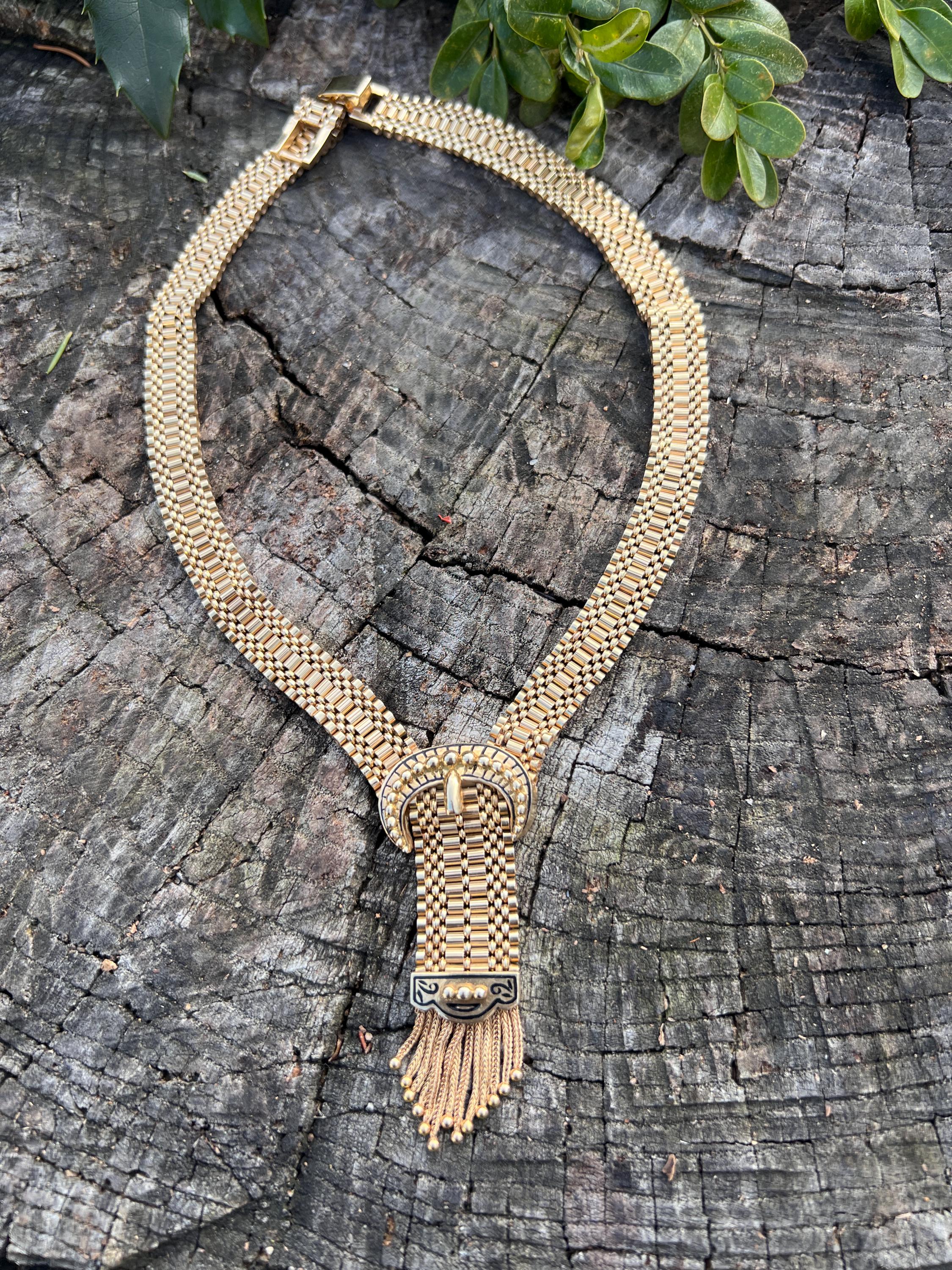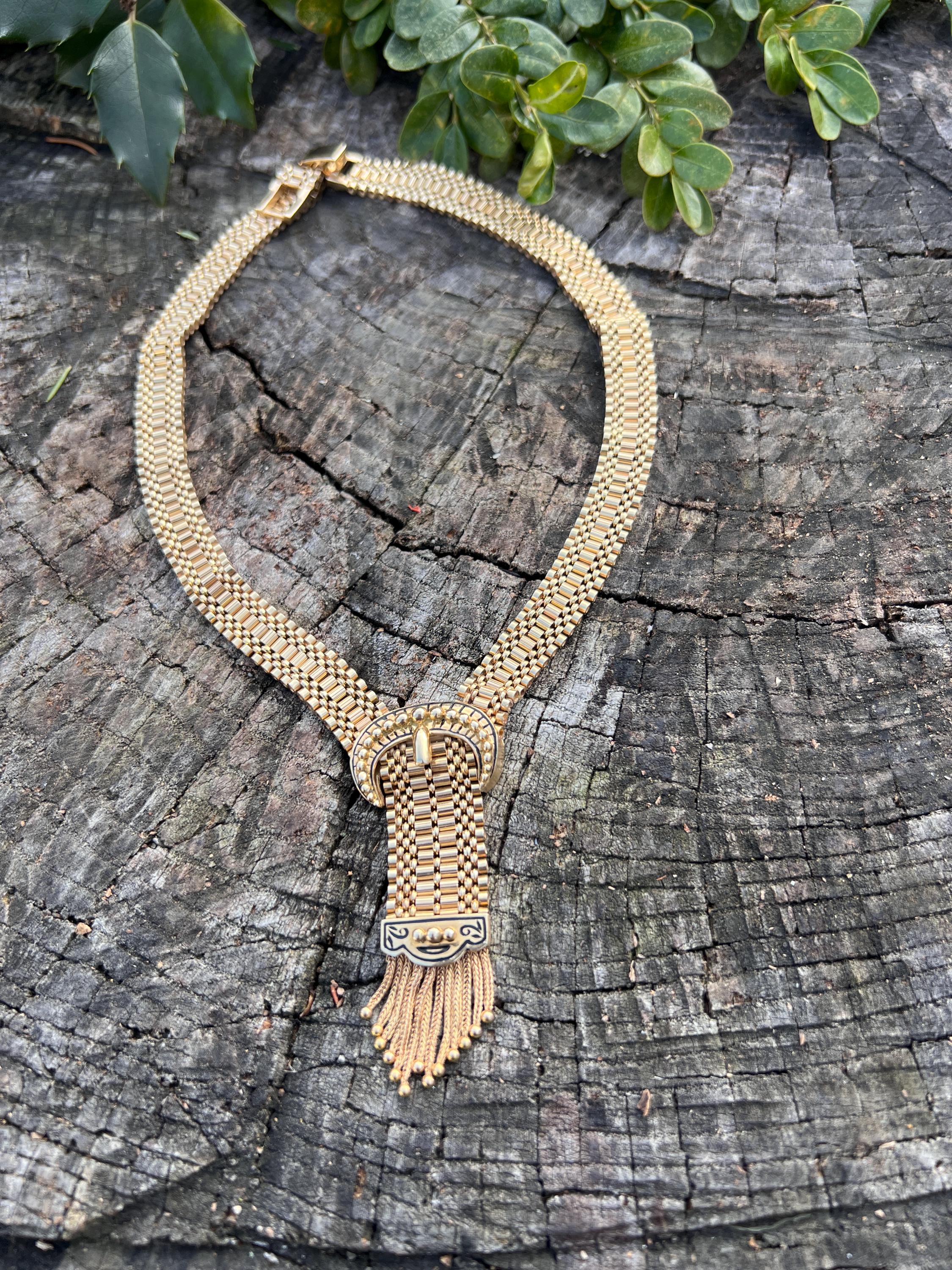 This savvy retro fringe buckle necklace is set in 14k yellow gold. It dates from the 1940s. Its exquisite rows of textured gold cylindrical like pieces form this wide impressive look coming together with the gold buckle. The buckle itself is adorned with a gorgeous enamel pattern. The buckle is adorned with the movement of exquisite gold fringe. The necklace is 15 1/2" long. The buckle pendant measures 2 1/4" x 3/4". It weighs 56.37 grams. It is marked 14k. Fun and flirty.