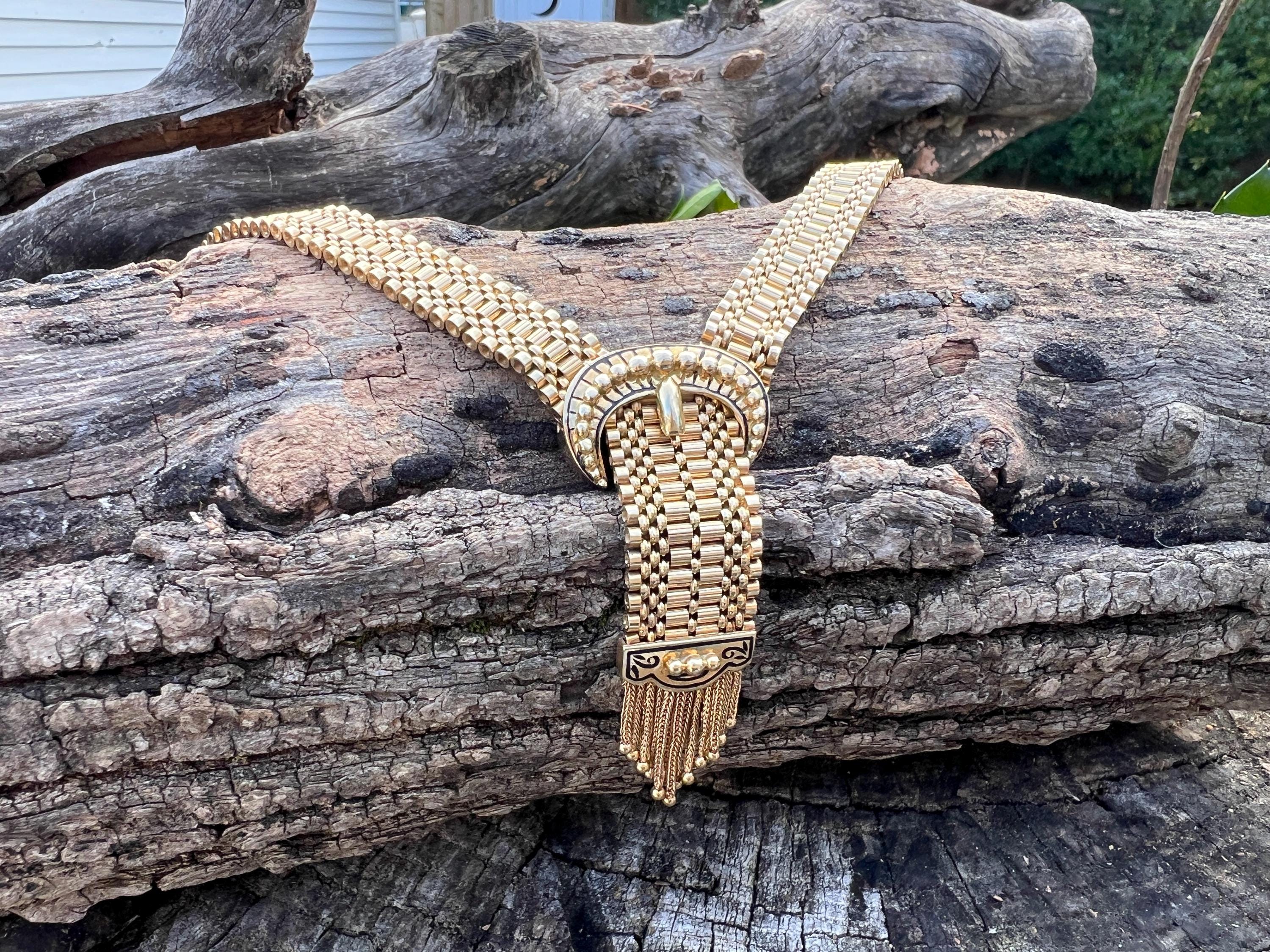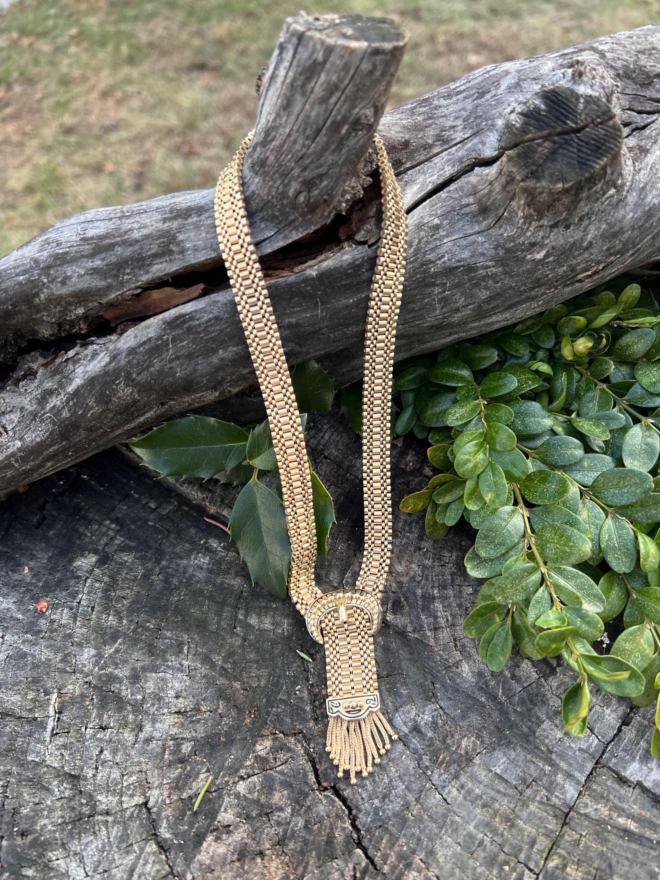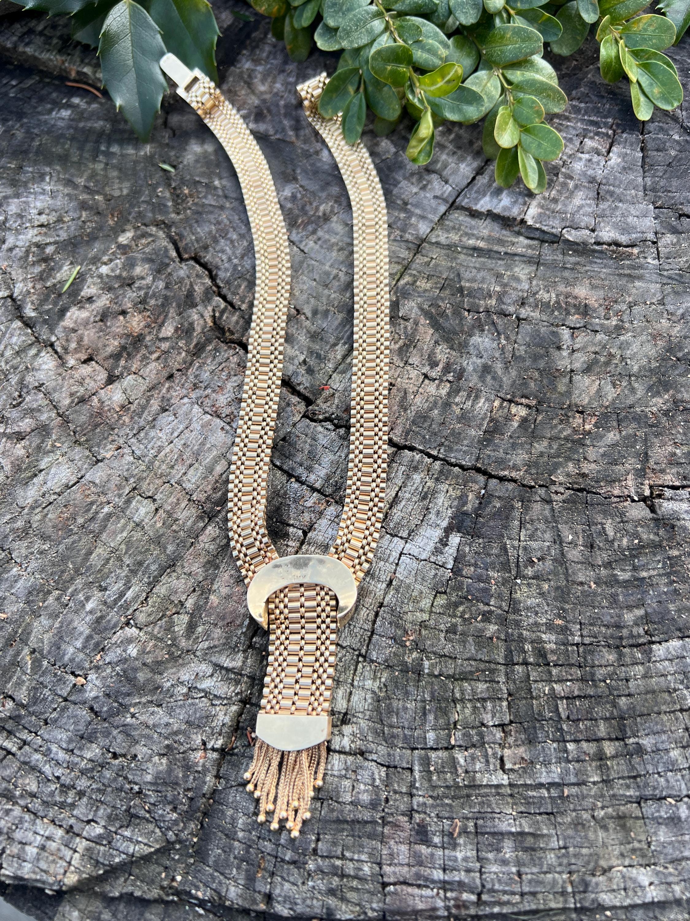 This savvy retro fringe buckle necklace is set in 14k yellow gold. It dates from the 1940s. Its exquisite rows of textured gold cylindrical like pieces form this wide impressive look coming together with the gold buckle. The buckle itself is adorned with a gorgeous enamel pattern. The buckle is adorned with the movement of exquisite gold fringe. The necklace is 15 1/2" long. The buckle pendant measures 2 1/4" x 3/4". It weighs 56.37 grams. It is marked 14k. Fun and flirty.