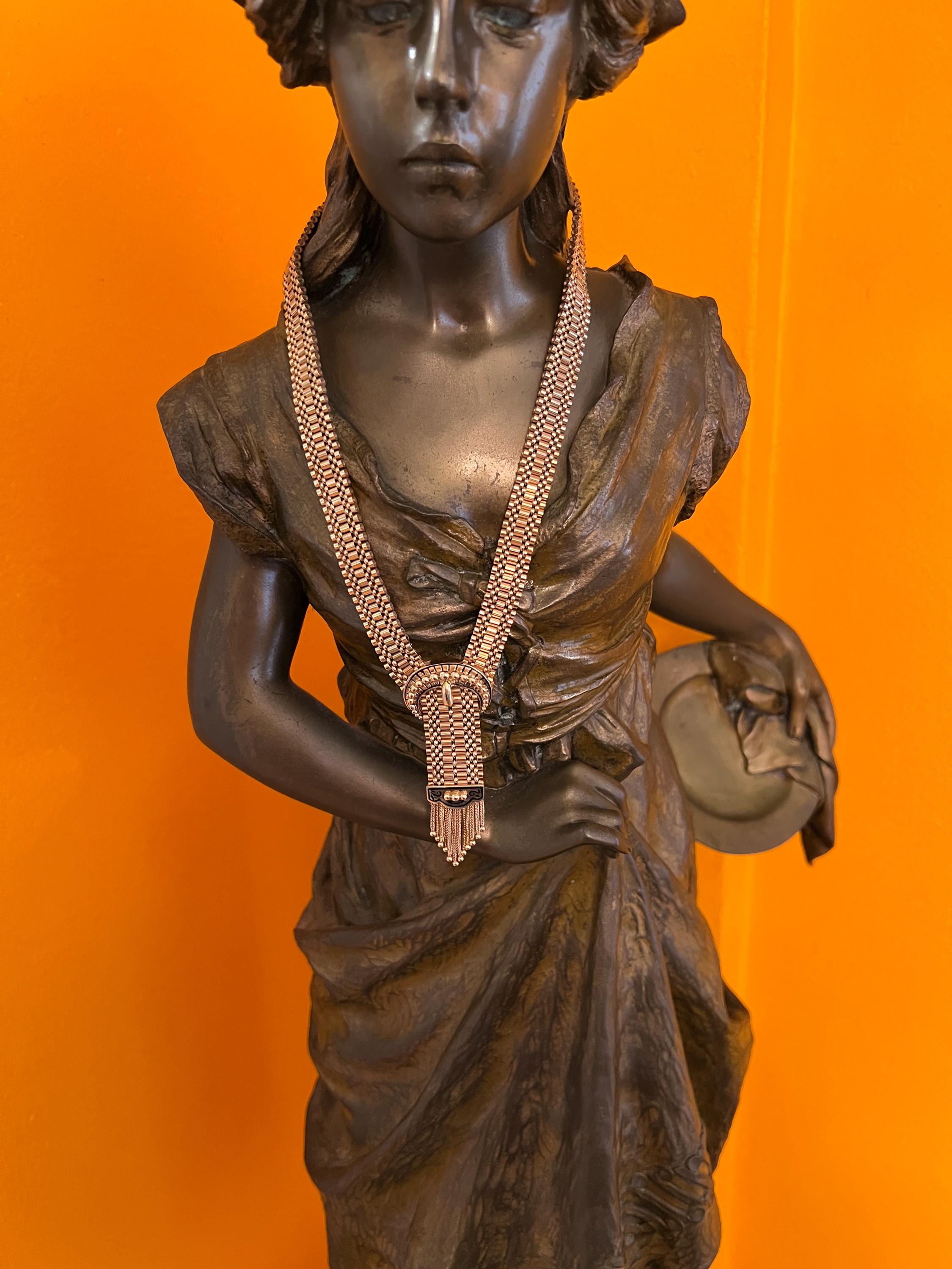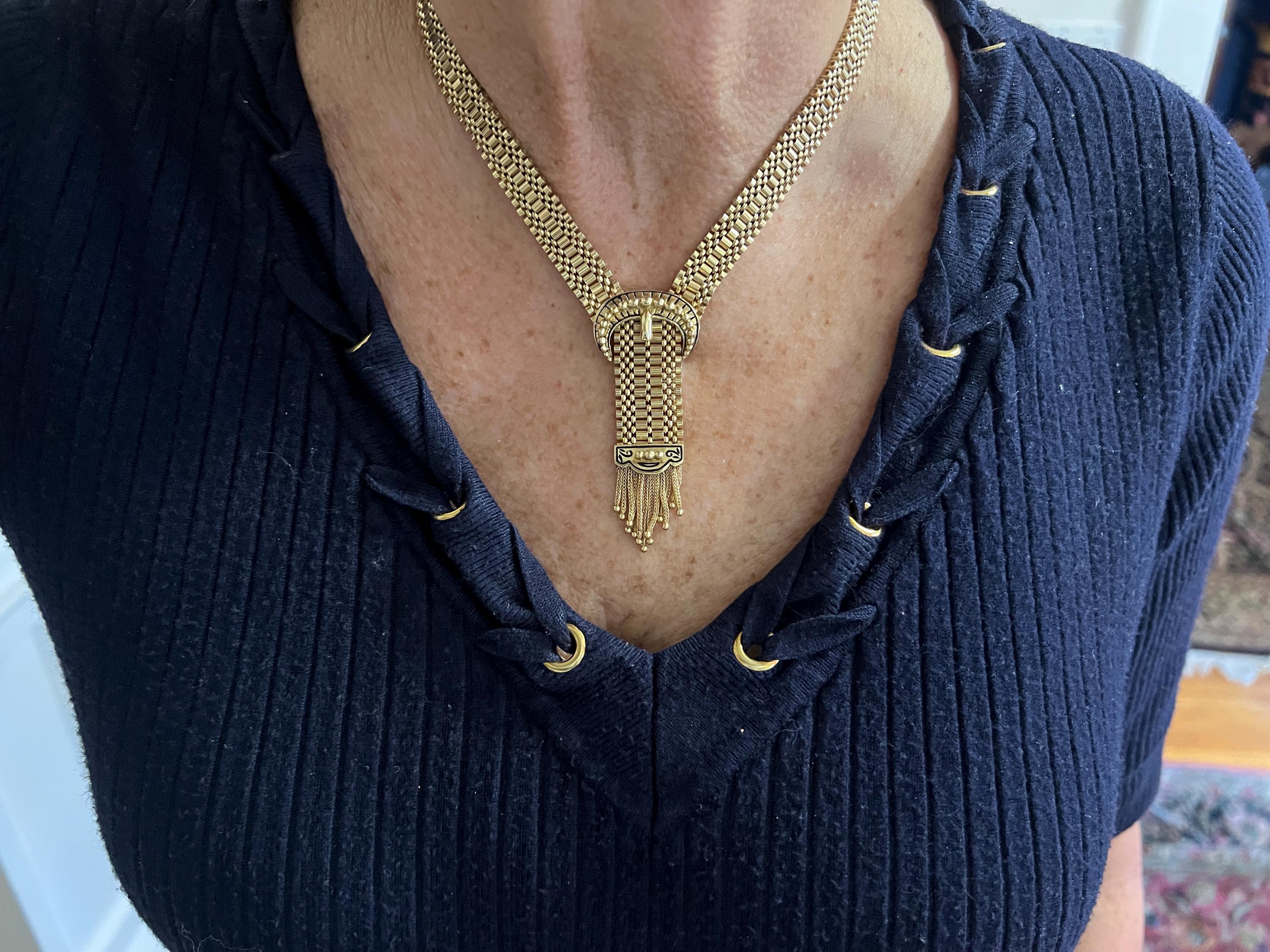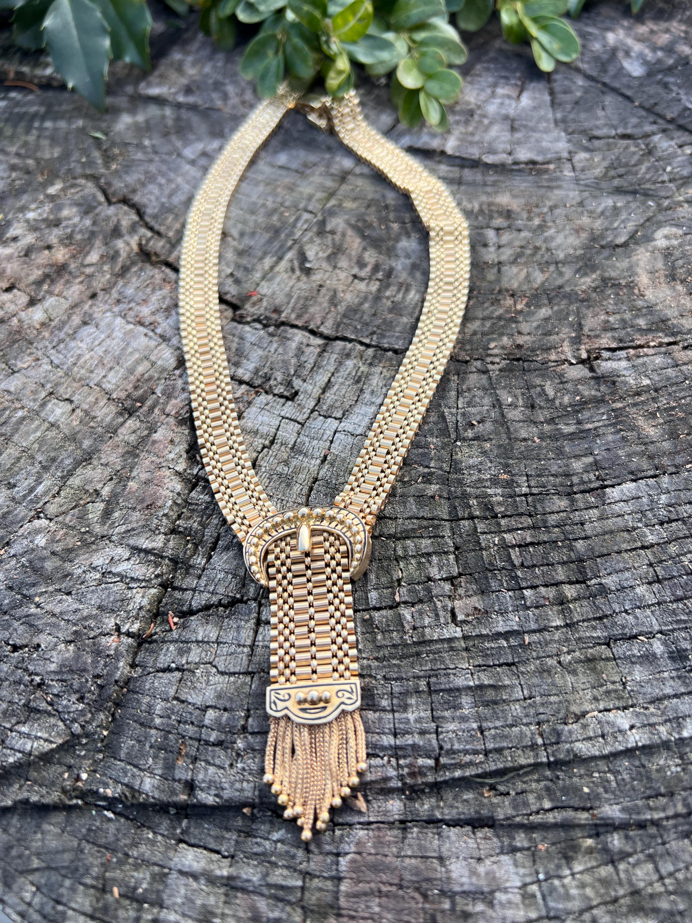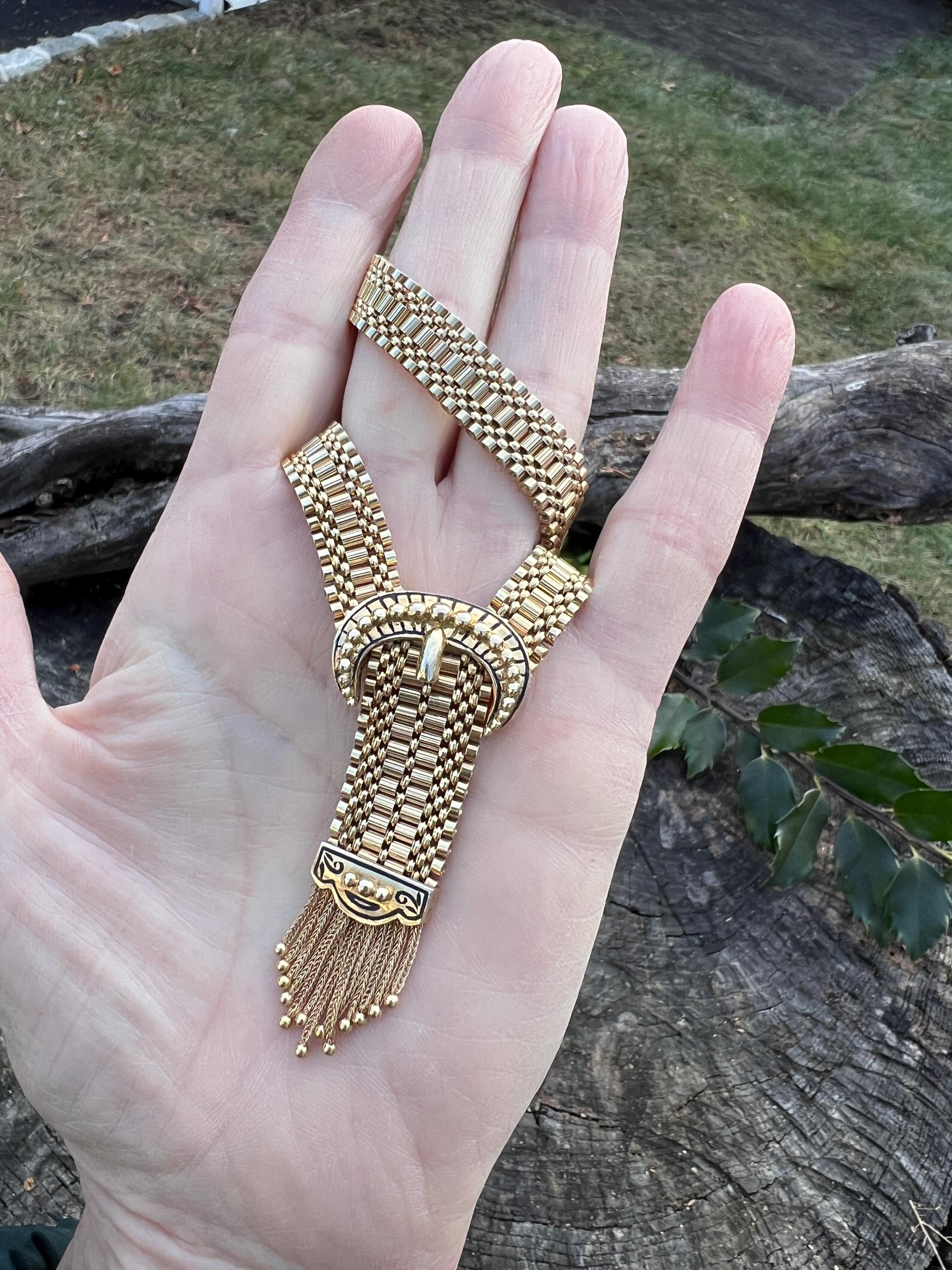 This savvy retro fringe buckle necklace is set in 14k yellow gold. It dates from the 1940s. Its exquisite rows of textured gold cylindrical like pieces form this wide impressive look coming together with the gold buckle. The buckle itself is adorned with a gorgeous enamel pattern. The buckle is adorned with the movement of exquisite gold fringe. The necklace is 15 1/2" long. The buckle pendant measures 2 1/4" x 3/4". It weighs 56.37 grams. It is marked 14k. Fun and flirty.