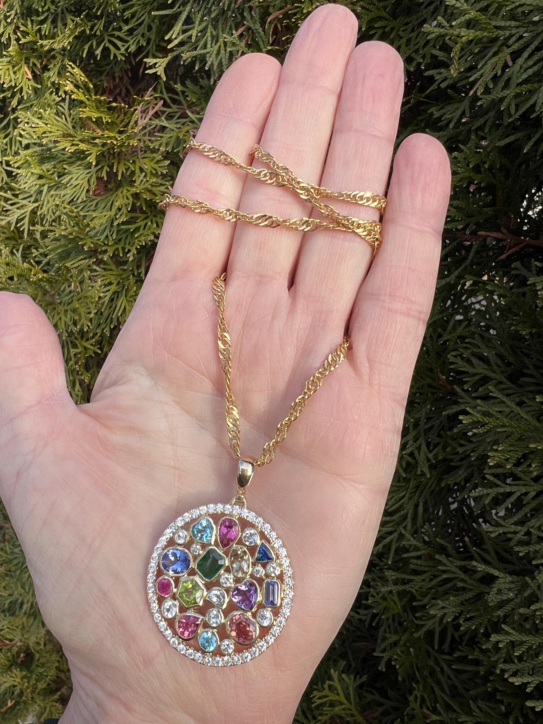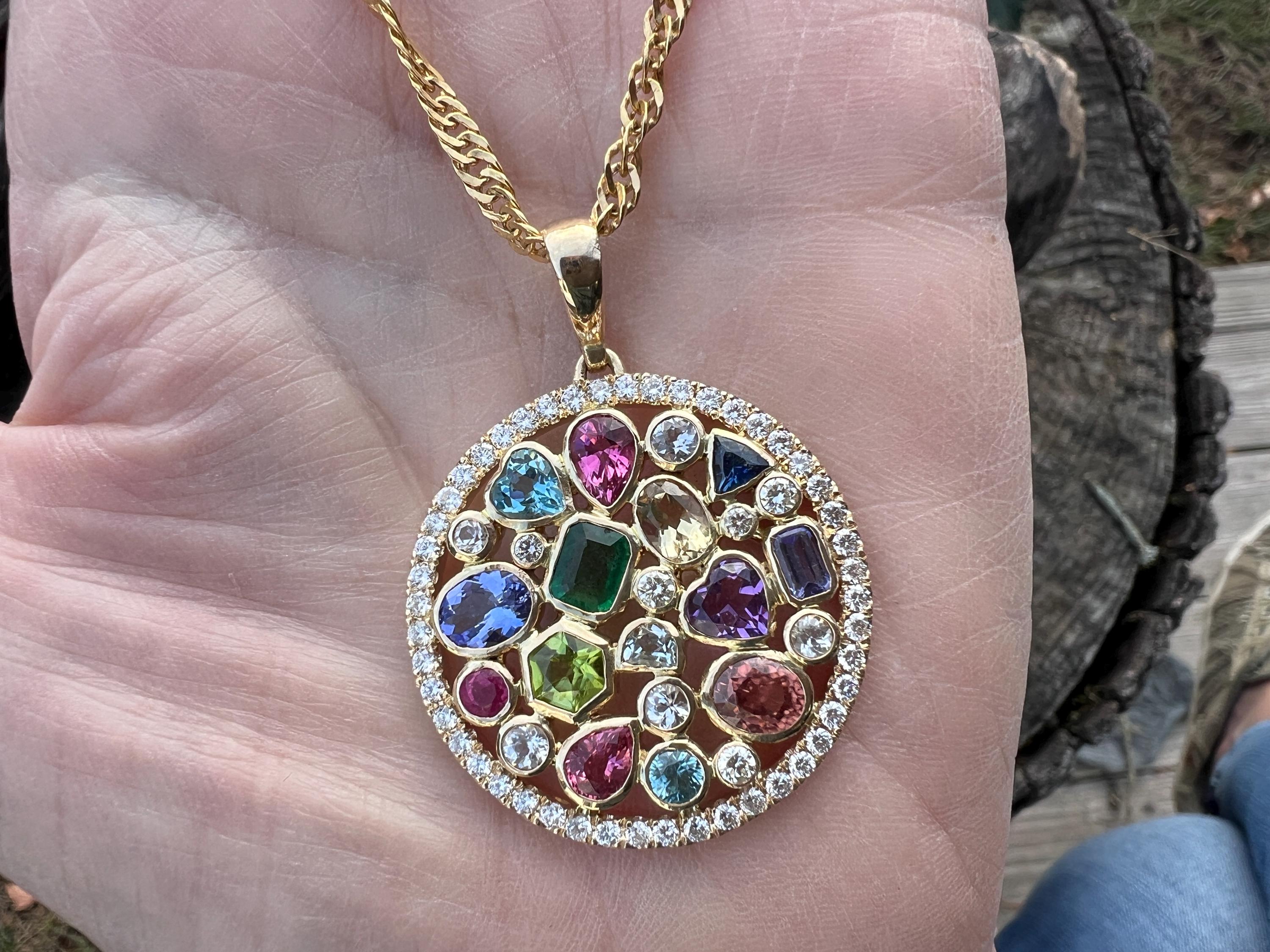 This vivid and eye catching vintage multi gem and diamond pendant is set in 14k yellow gold. It dates from the 1970s. The center of the large disc shaped pendant is studded with a melange of faceted gems creating this striking look. They include amethyst, garnet, pink and green tourmaline, blue, topaz, sapphire and diamond strategically placed to generate this imposing beauty. The center is enveloped by an orb of diamond dazzle. Casual opulence. The diamonds have a total approx. weight of 2.00 ct. The diamonds are H/I in color and VS2 in clarity. It's all attached to a beautifully braided gold chain to finish the look. Te pendant weighs 14.81 grams. It measures 1 1/4" and the bale adds another 1/4". The chain weighs 3.52 grams. The chain measures 21 1/2" and is 1/8" wide. It is marked 14k.