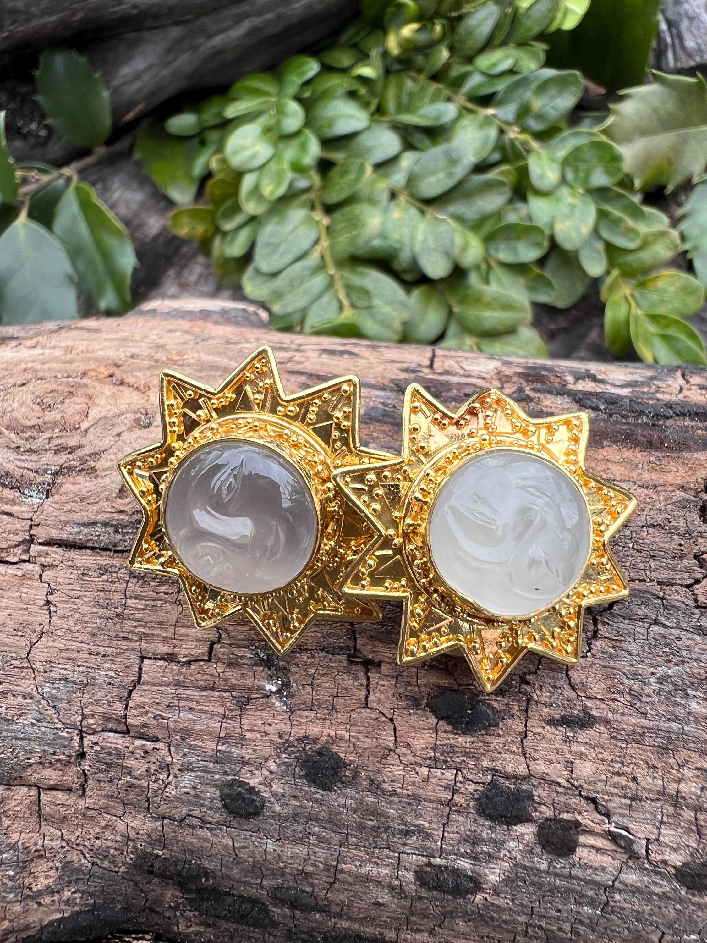 This enchanting 22k/18k yellow gold carved moonstone pin and earring set is stunning. The captivating sun shaped mounting is beautifully engraved. Unfolding in the center are the most stunning, translucent round carved moonstones. The matching earrings exude the same beauty all together giving an air of whimsy. The pin weighs 6.18 grams. It measures 3/4" x 7/8". The earrings weigh 15.47 grams. They measures 1" x 7/8". They are marked 22k and 18k. The back of the pin and backs of the earrings are 18k.