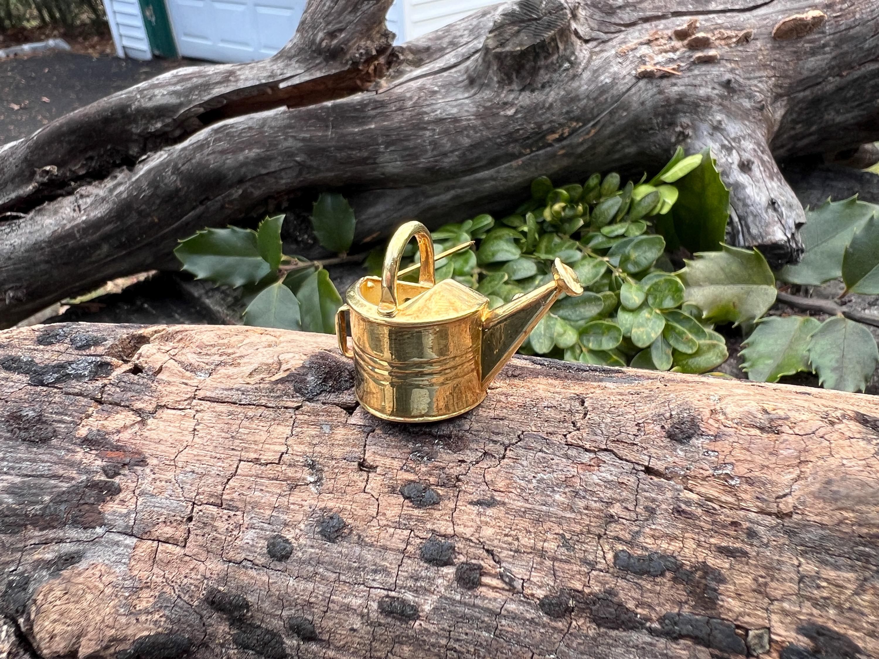 Set in 18k yellow gold, this charming watering can pin is just endearing. The lovely gold brooch is designed to mimic the real thing. A mini version with attention to intricate details. The brooch weighs 14.30 grams. It measures 1 1/4" x 1" including the bale. It beams with happiness. It is marked on the back 750 (18k) and Garden Gems.