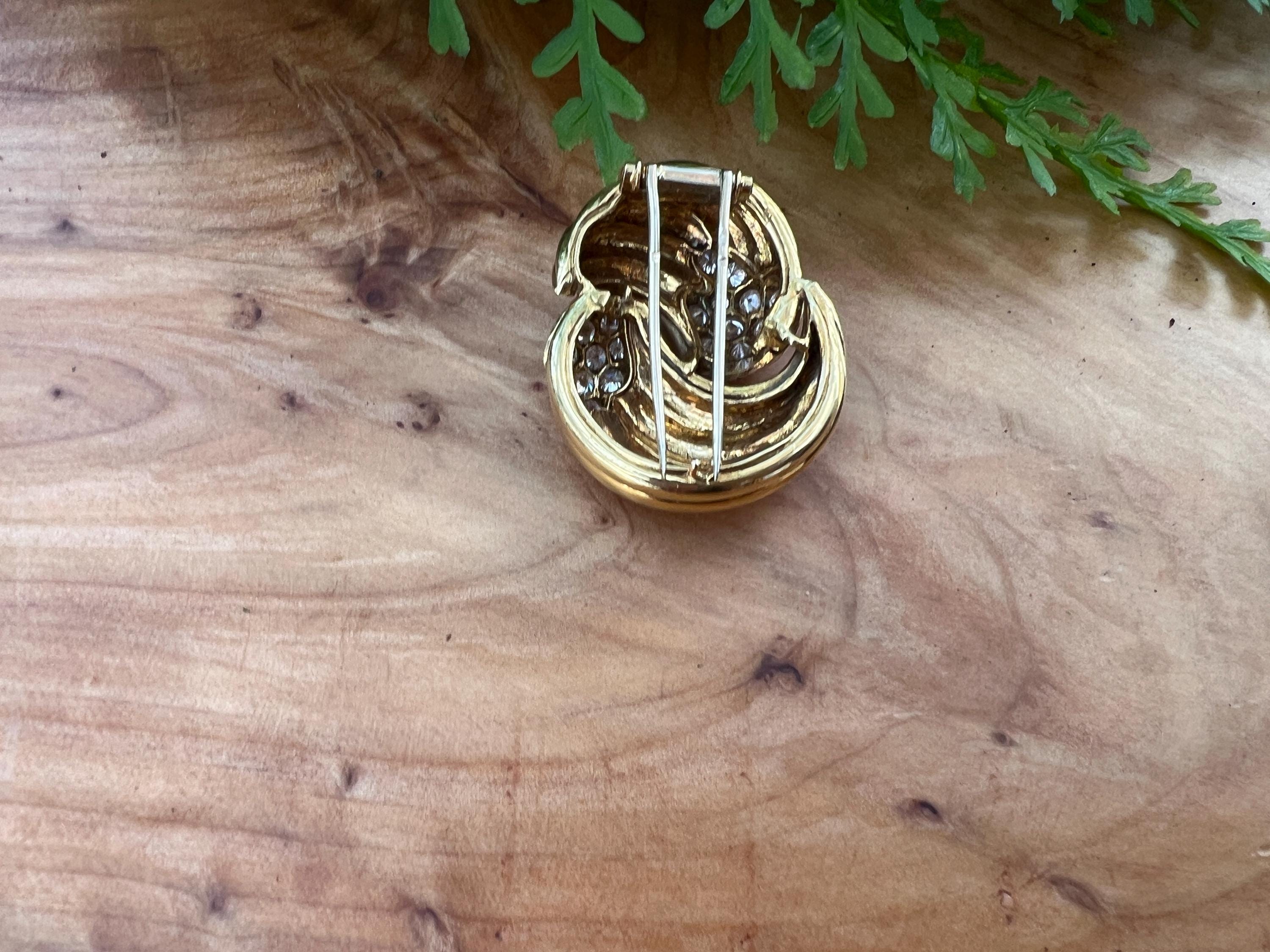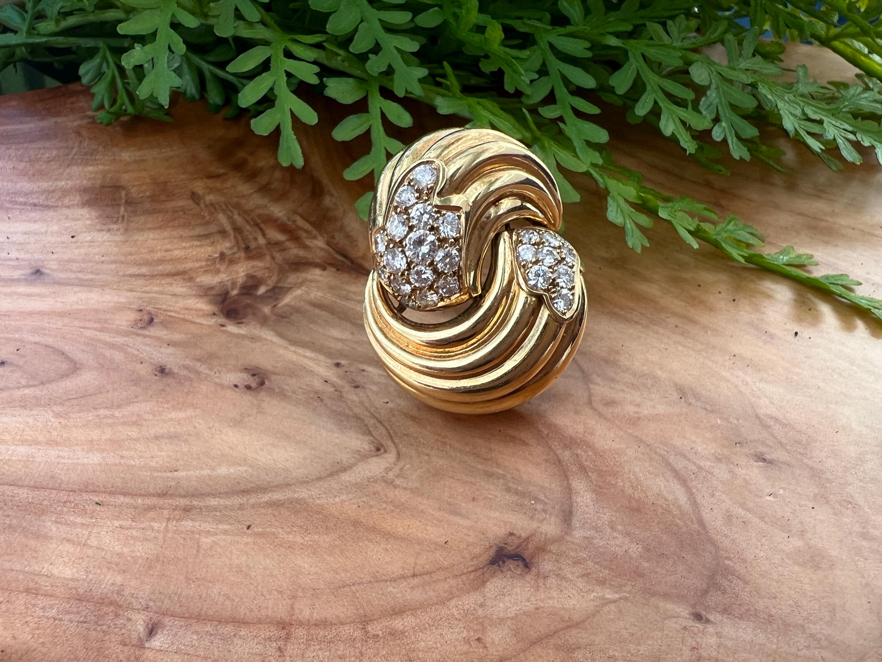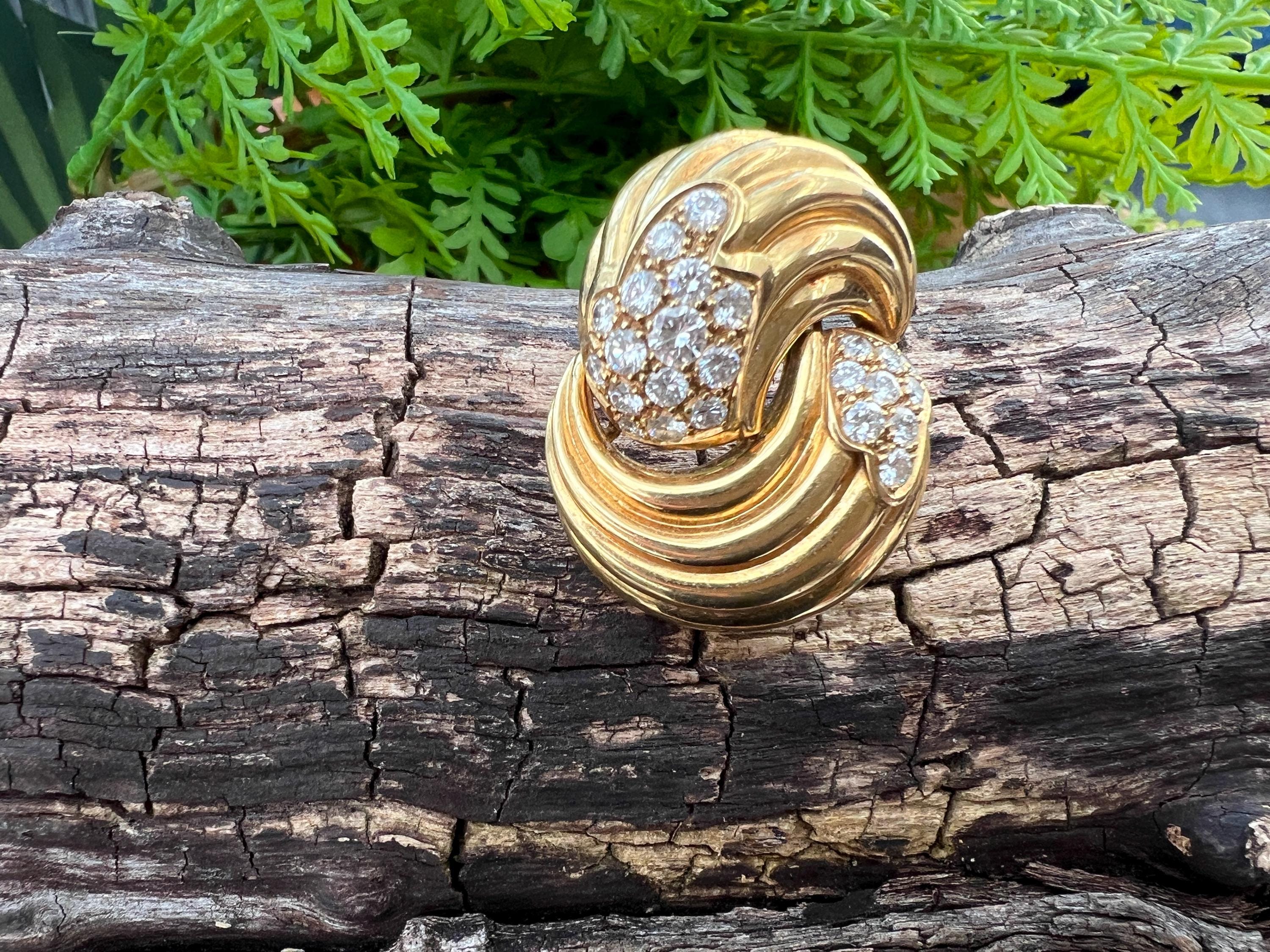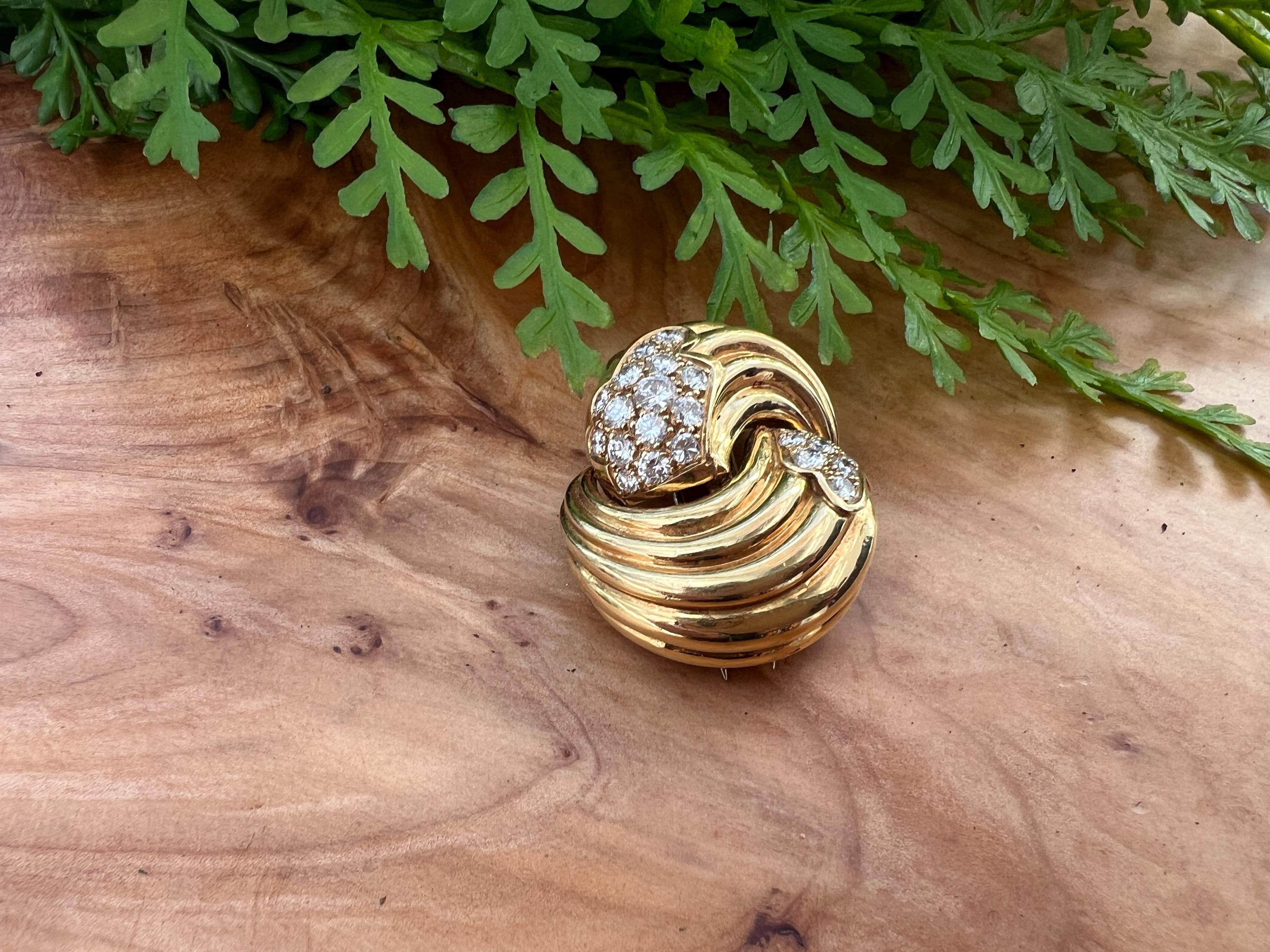 Set in 18k yellow gold, this spin on a classic diamond pin is spectacular. It holds round brilliant cut diamonds that swirl around the front and side into a scintillating trail of blinding dazzle. There is an approx. total weight of 2.50 ct of diamonds. The diamonds are G in color and VS2 in clarity. The diamonds swerve and curve like a pinwheel of shimmer around the mounting of polished golden coils stacked upon each other creating a captivating design with a sculptural effect. The pin measures 1 3/16" long and 1" wide. This is maximum luxury with a twist. The pin weighs 24.60 grams. It is marked 18k and Fred.