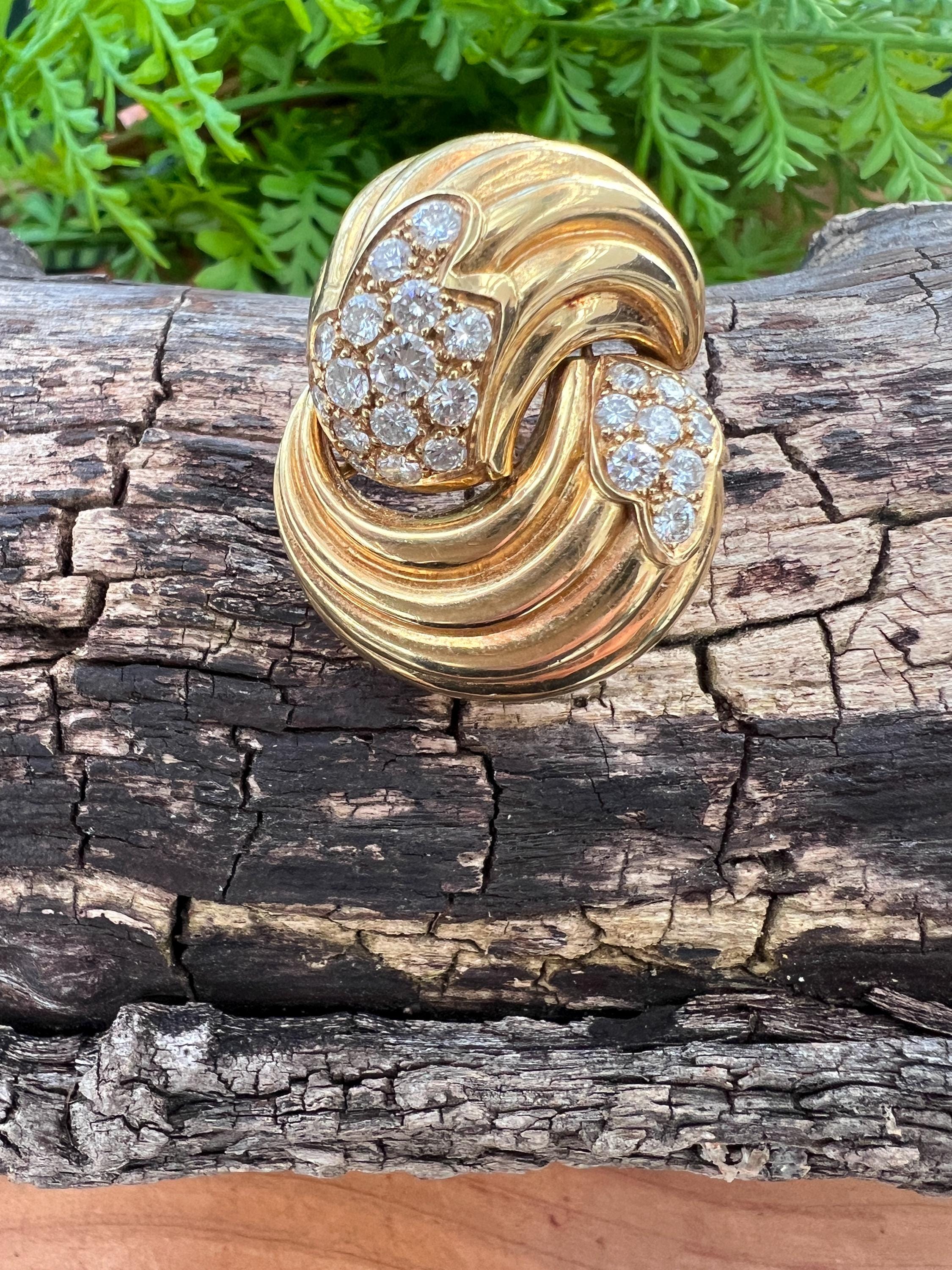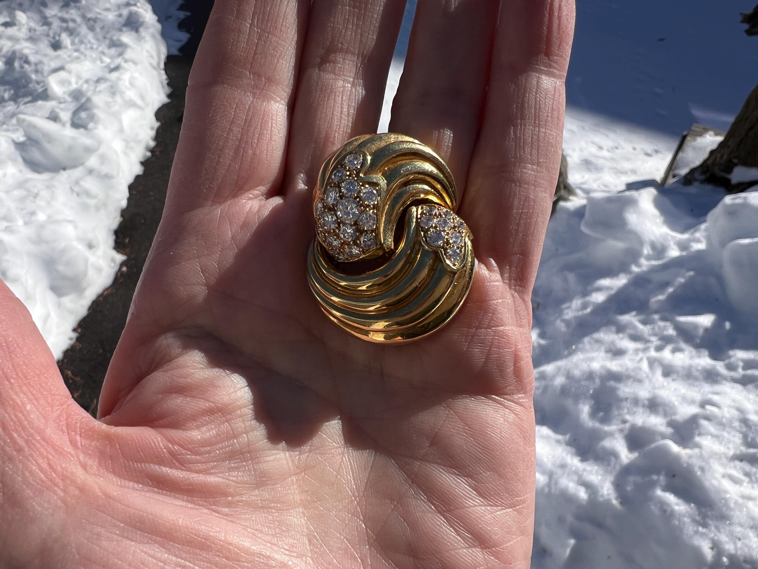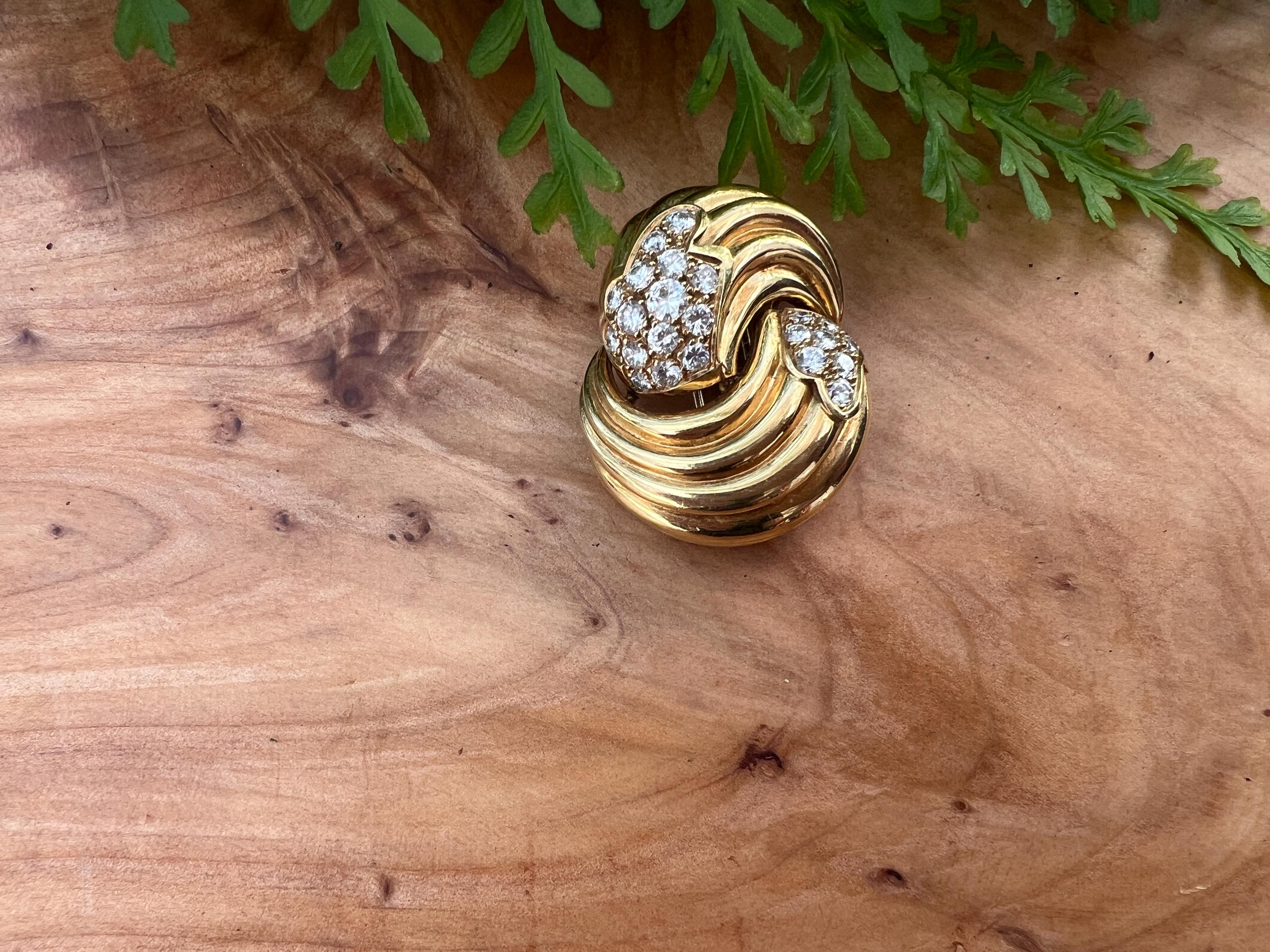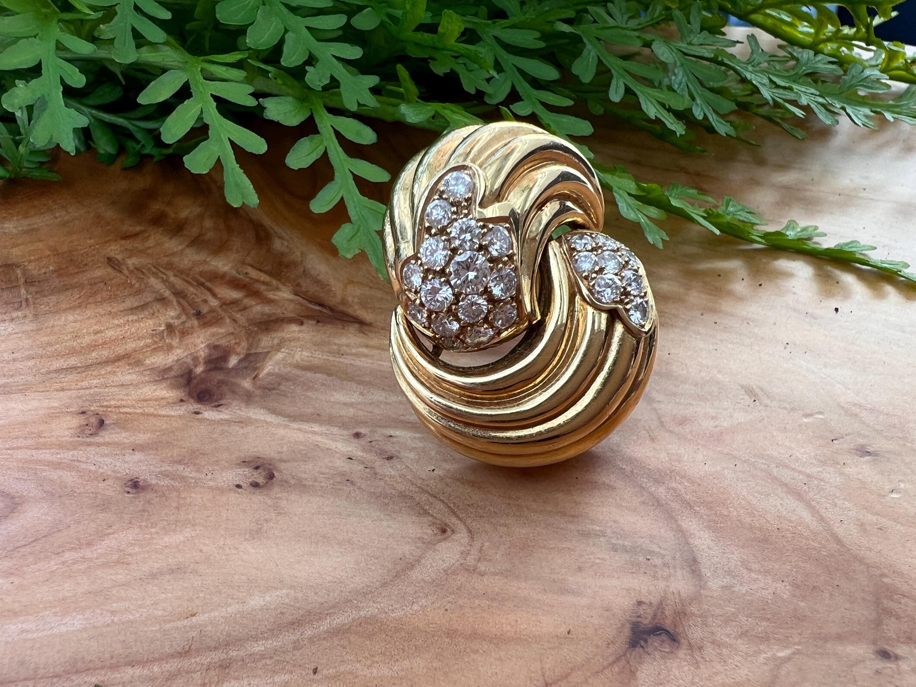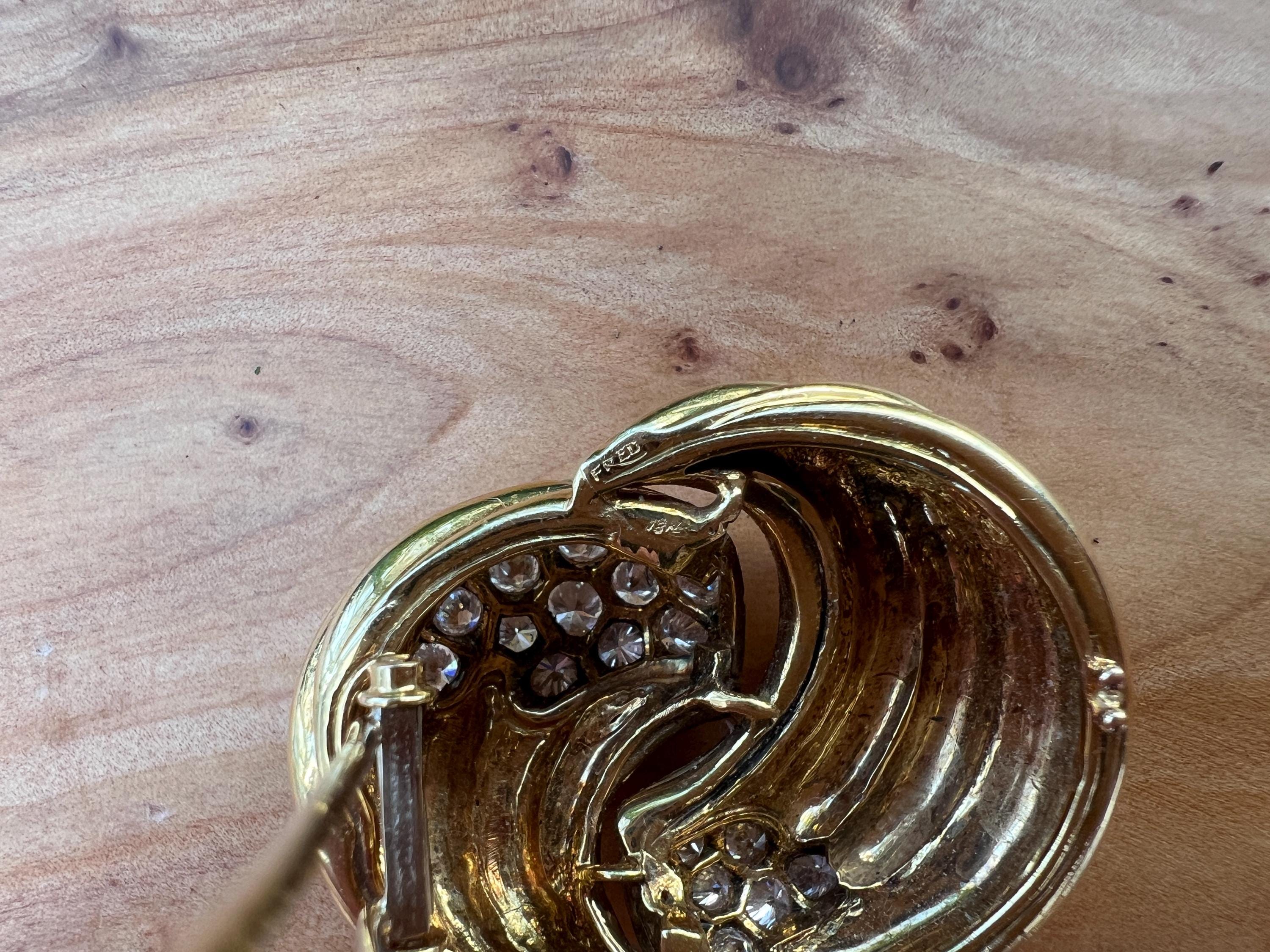 Set in 18k yellow gold, this spin on a classic diamond pin is spectacular. It holds round brilliant cut diamonds that swirl around the front and side into a scintillating trail of blinding dazzle. There is an approx. total weight of 2.50 ct of diamonds. The diamonds are G in color and VS2 in clarity. The diamonds swerve and curve like a pinwheel of shimmer around the mounting of polished golden coils stacked upon each other creating a captivating design with a sculptural effect. The pin measures 1 3/16" long and 1" wide. This is maximum luxury with a twist. The pin weighs 24.60 grams. It is marked 18k and Fred.
