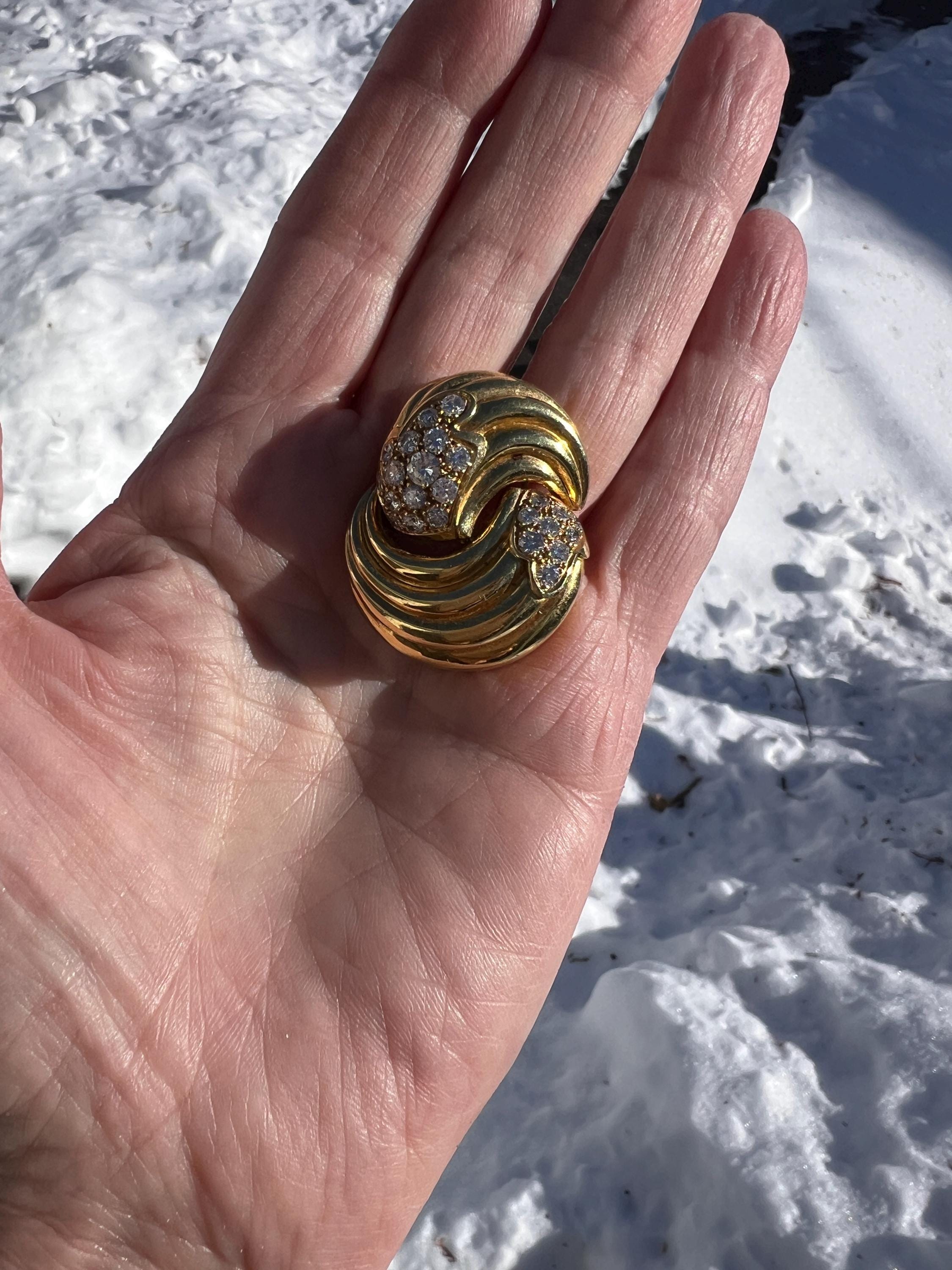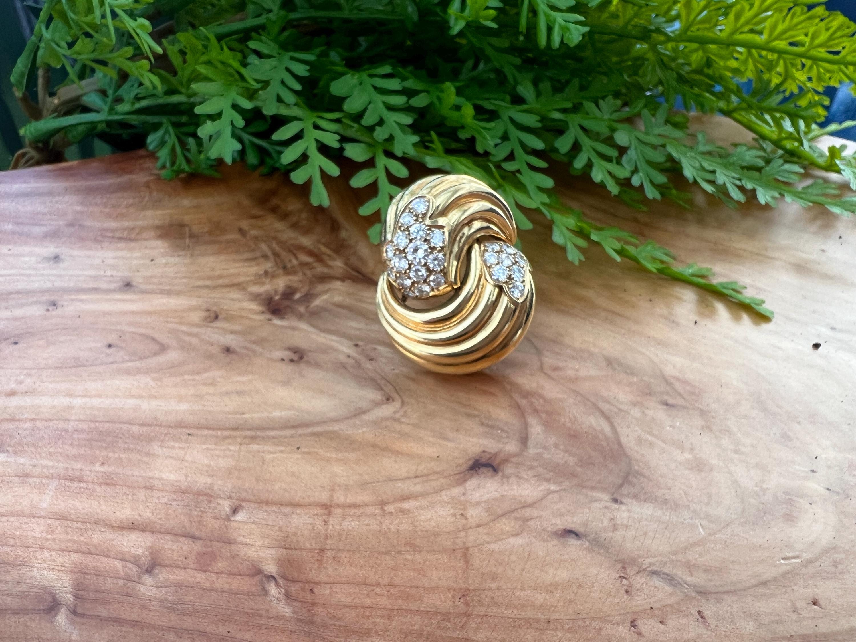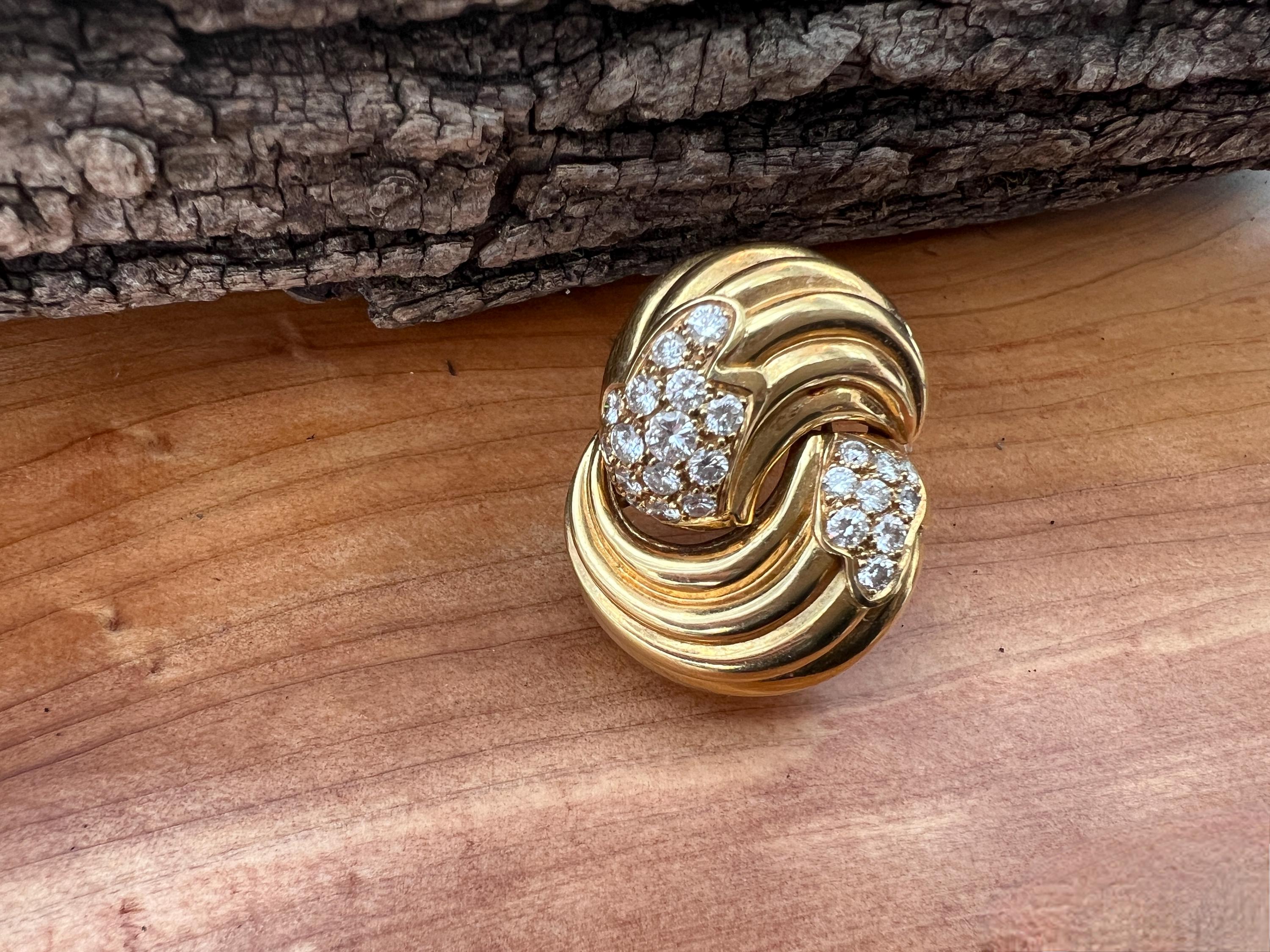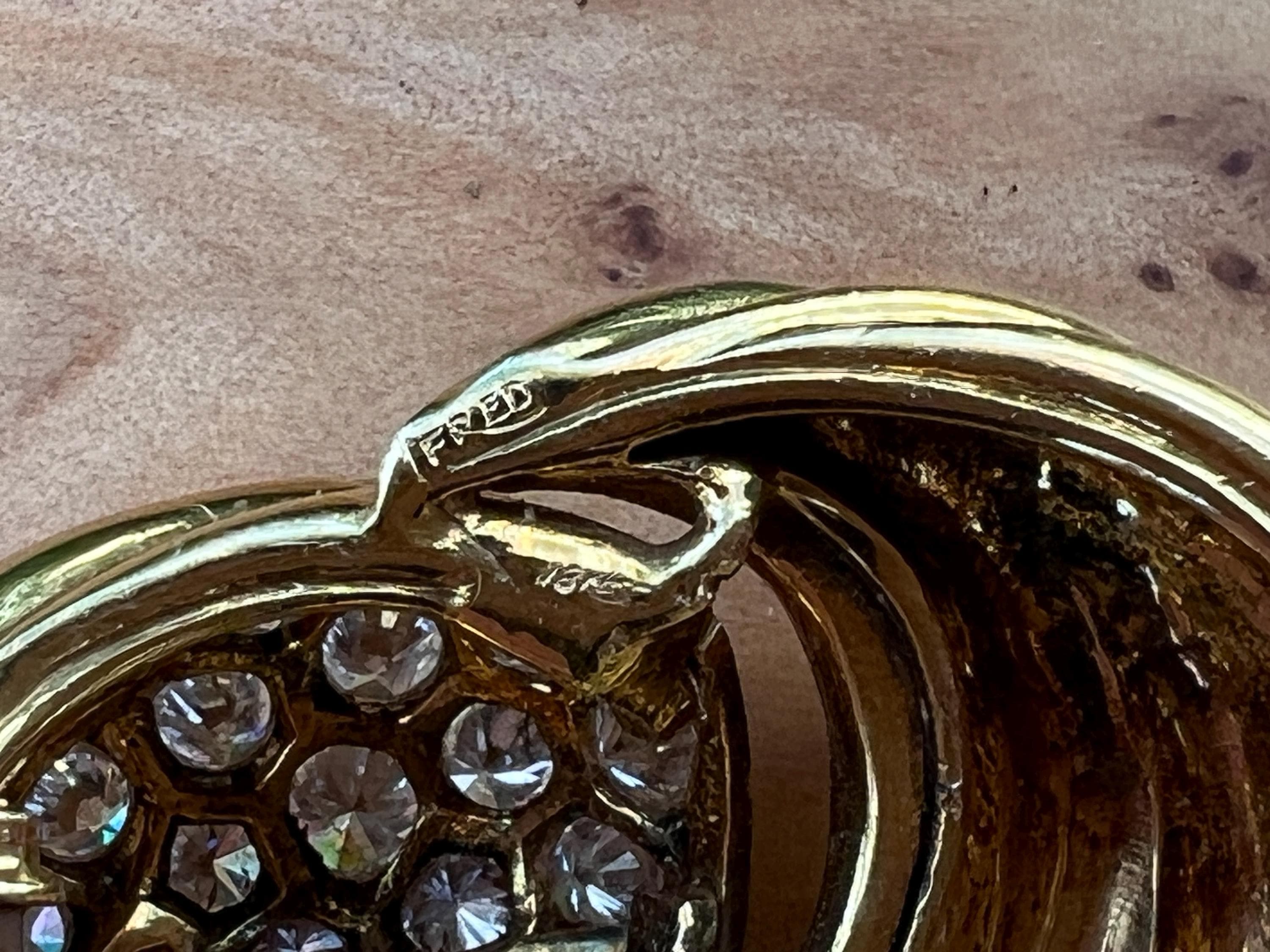 Set in 18k yellow gold, this spin on a classic diamond pin is spectacular. It holds round brilliant cut diamonds that swirl around the front and side into a scintillating trail of blinding dazzle. There is an approx. total weight of 2.50 ct of diamonds. The diamonds are G in color and VS2 in clarity. The diamonds swerve and curve like a pinwheel of shimmer around the mounting of polished golden coils stacked upon each other creating a captivating design with a sculptural effect. The pin measures 1 3/16" long and 1" wide. This is maximum luxury with a twist. The pin weighs 24.60 grams. It is marked 18k and Fred.