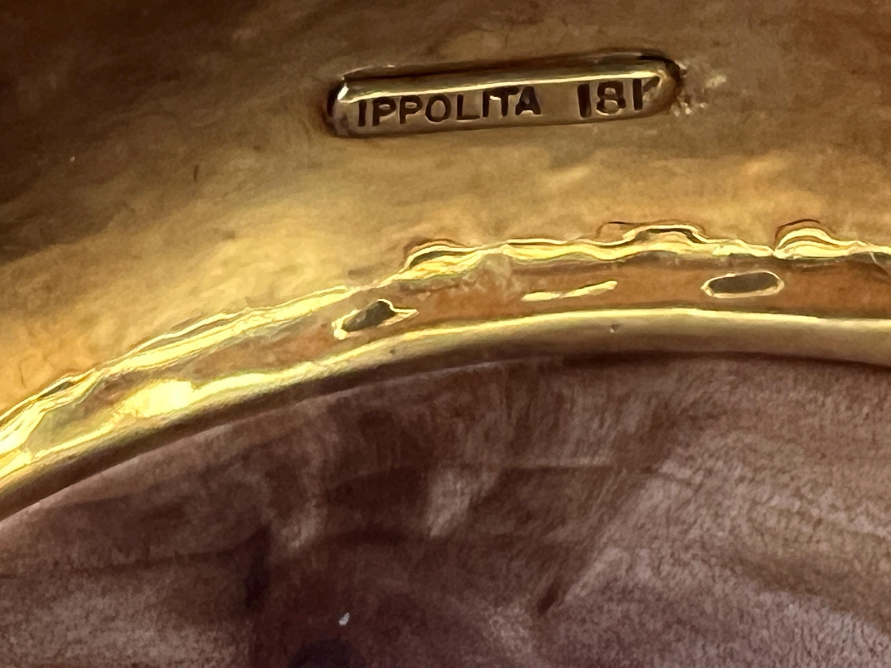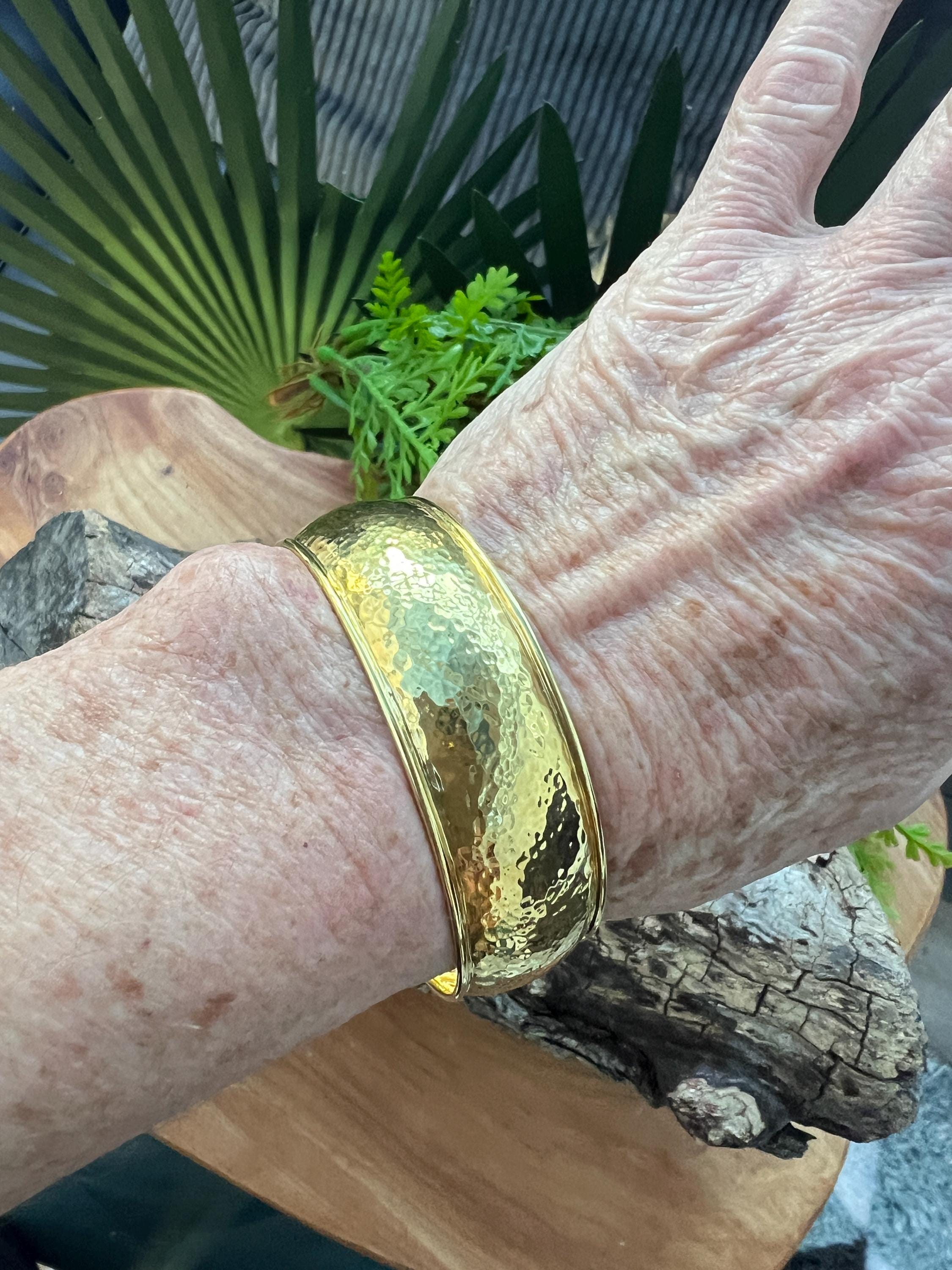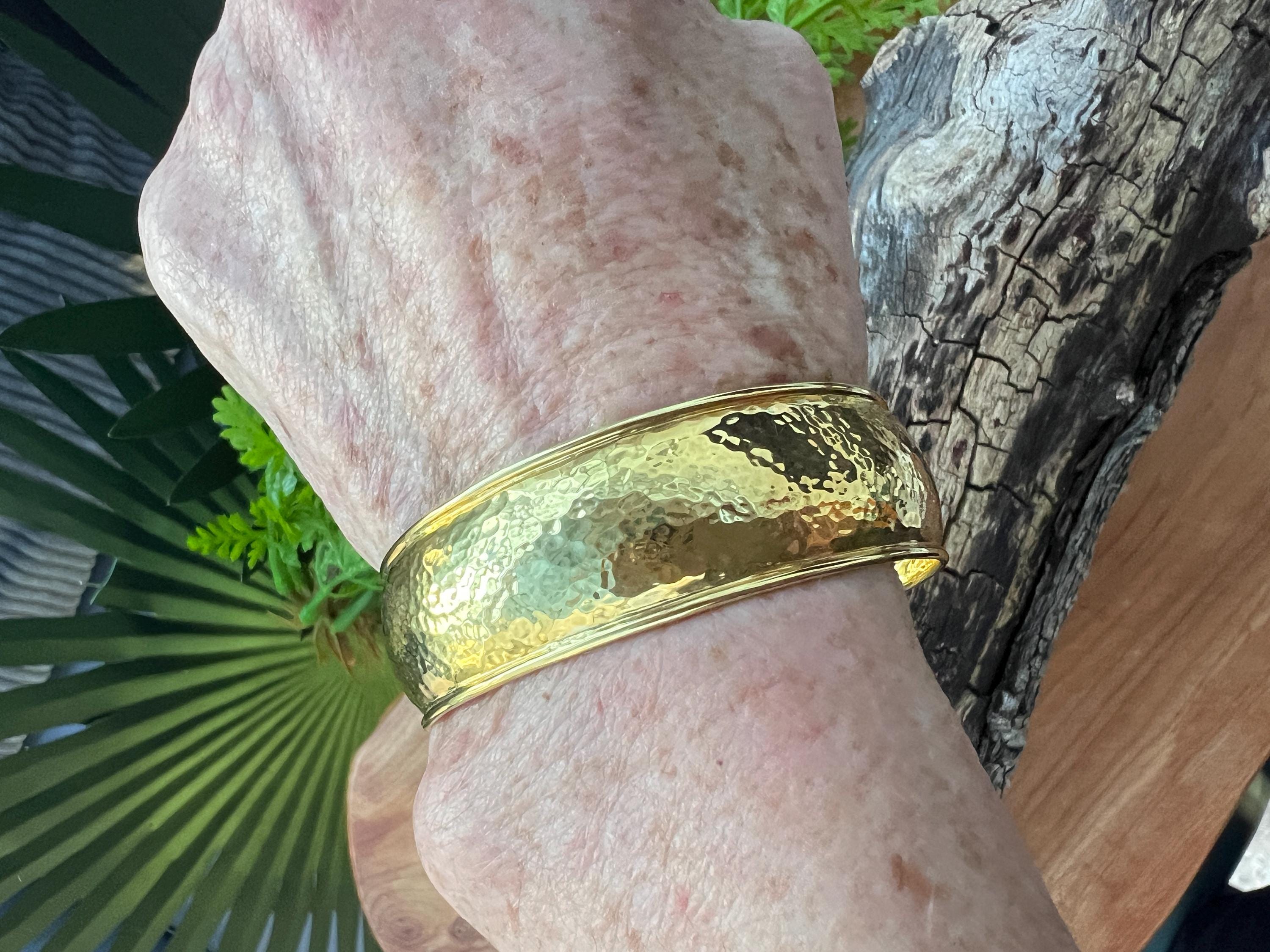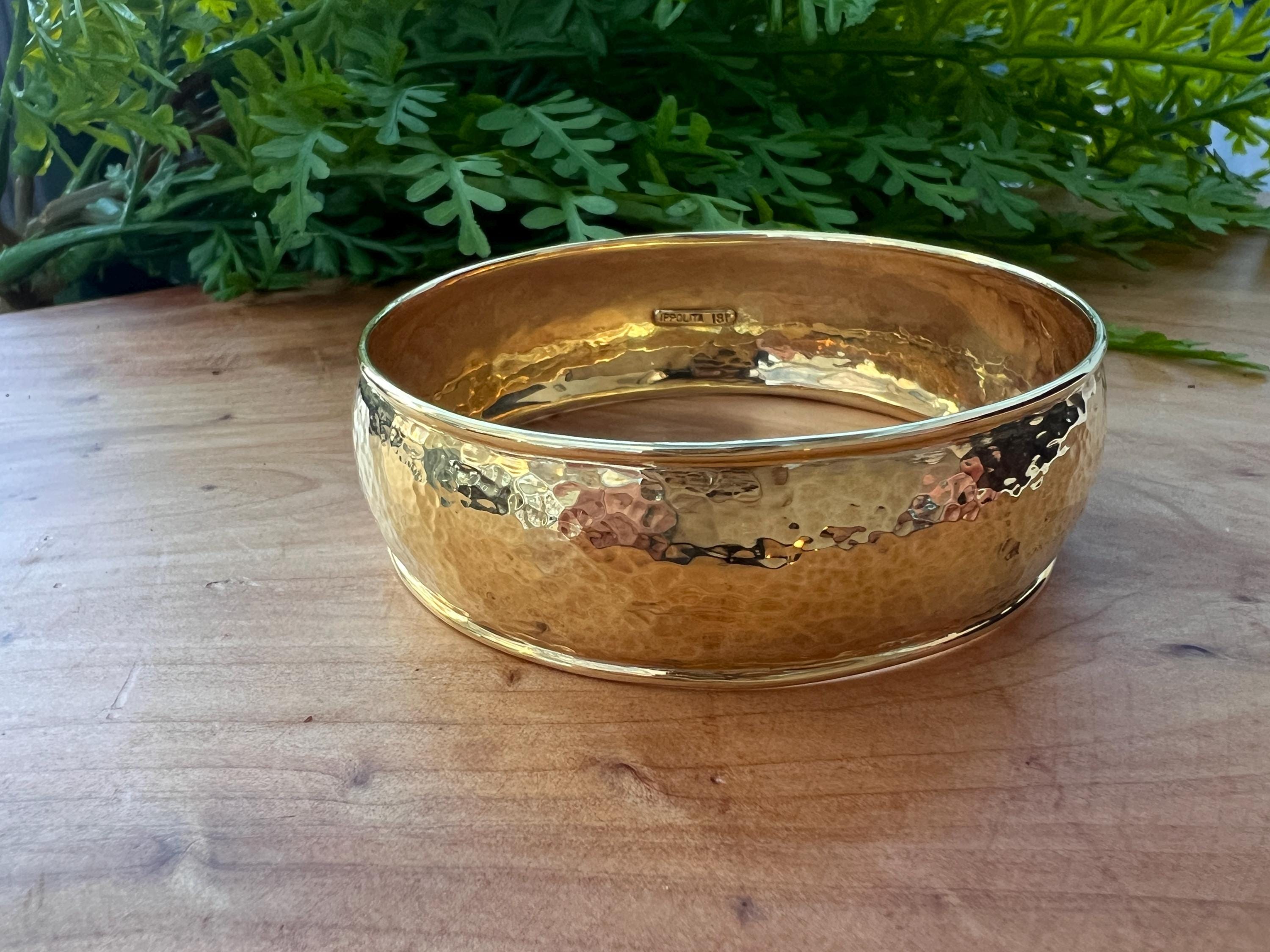 Set in 18k yellow gold, this quietly lavish vintage Ippolita bangle is the essence of elegance. It dates from the 1980's. The bangle is beautifully sculpted in a high polish hammered gold finish to create magnificence. Striking in its simplicity, yet power on the wrist. The inside circumference is 8". The inside diameter is 2 3/8". It is 3/4" wide. It is a slip on style bangle. It will fit a small/medium wrist. It weighs 36.06 grams. It is marked Ippolita and 18k.