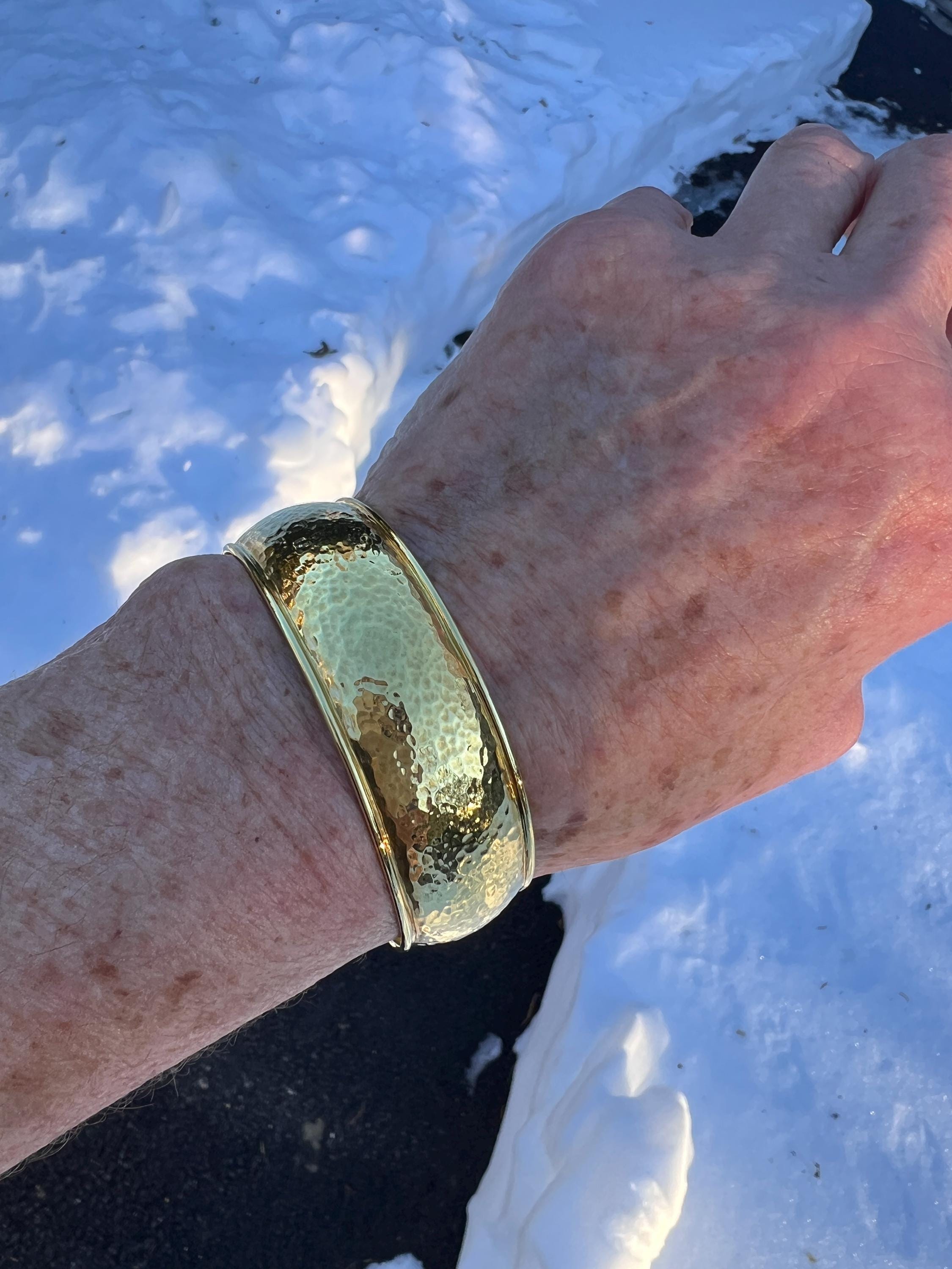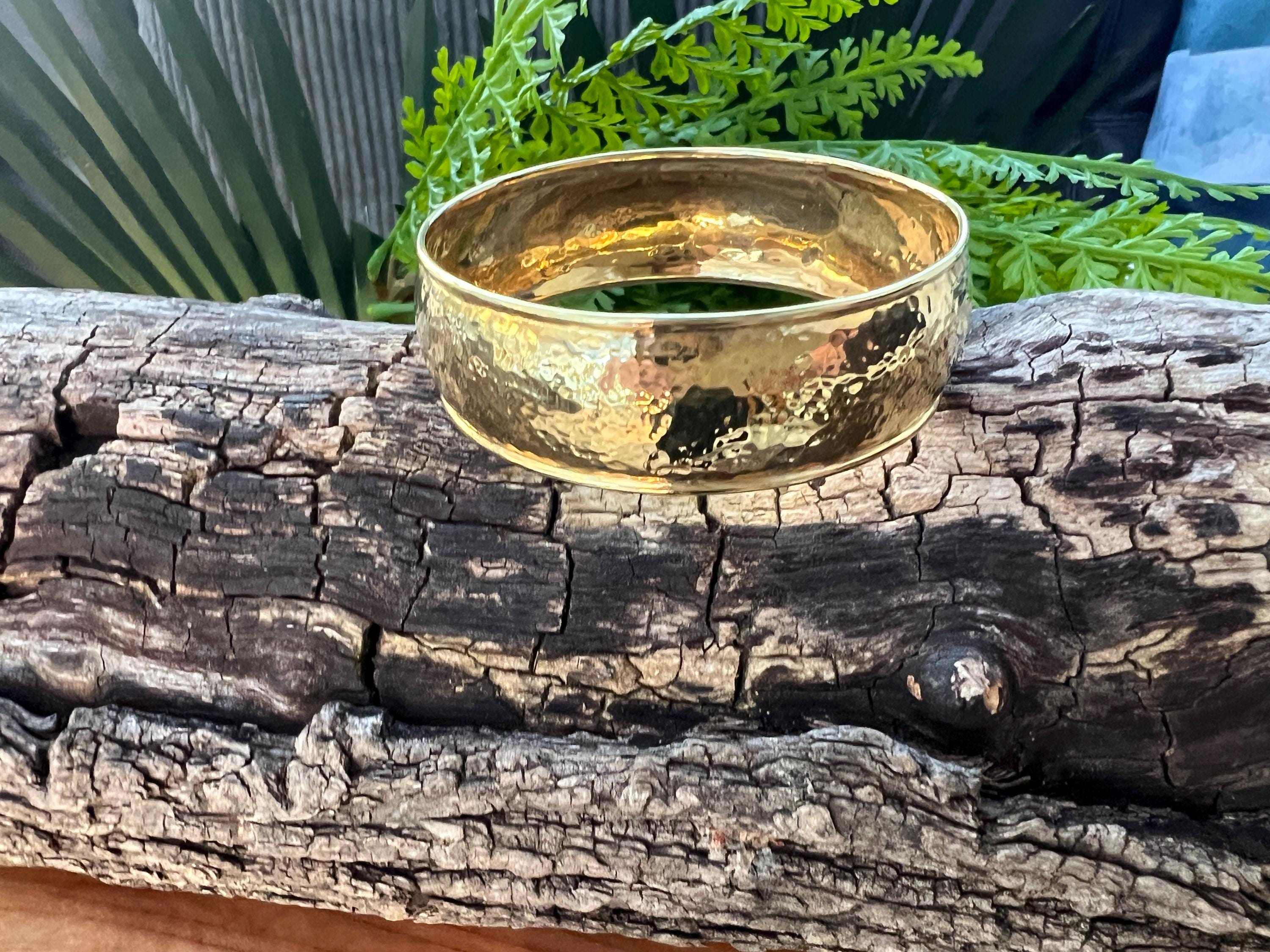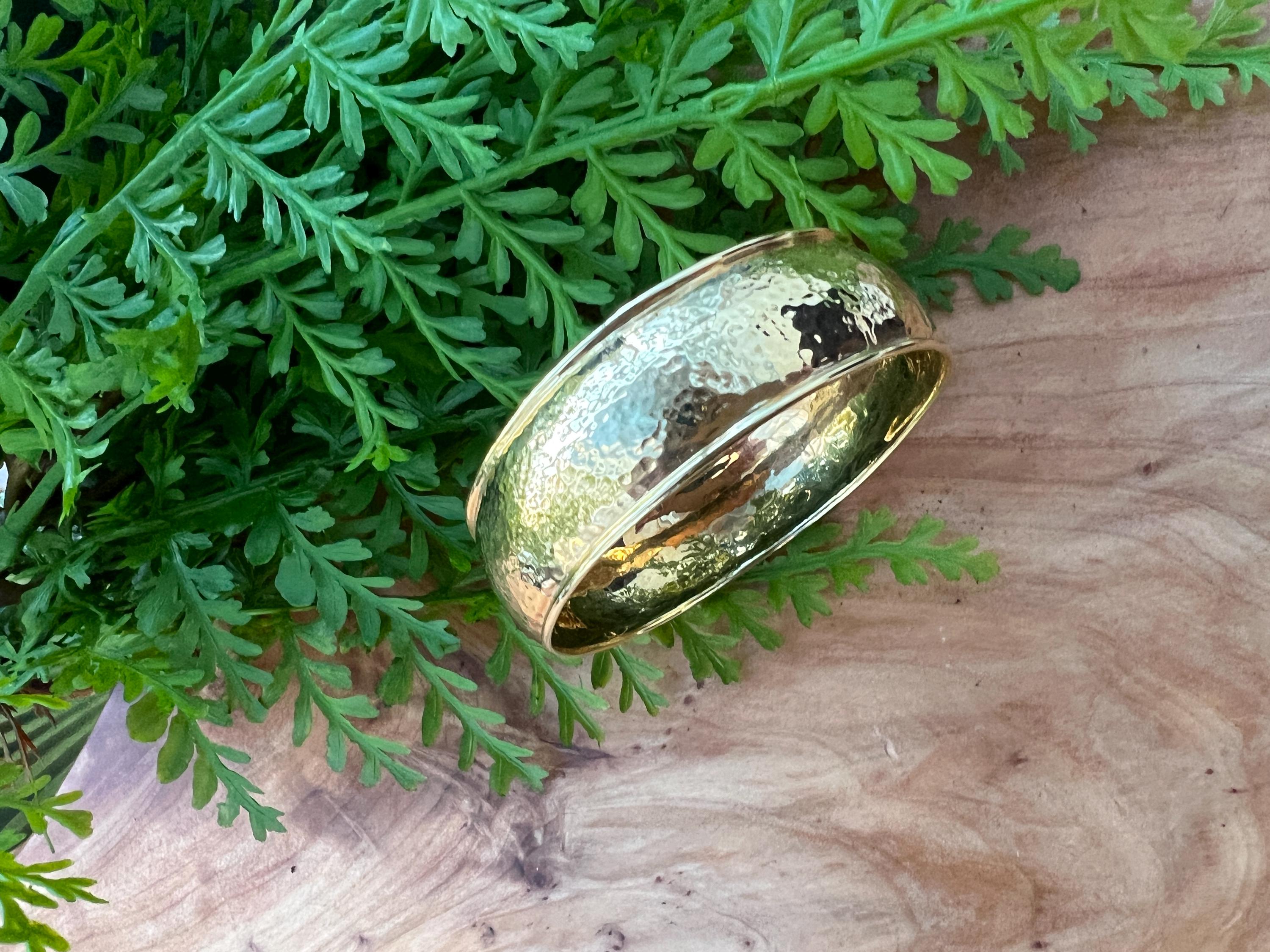 Set in 18k yellow gold, this quietly lavish vintage Ippolita bangle is the essence of elegance. It dates from the 1980's. The bangle is beautifully sculpted in a high polish hammered gold finish to create magnificence. Striking in its simplicity, yet power on the wrist. The inside circumference is 8". The inside diameter is 2 3/8". It is 3/4" wide. It is a slip on style bangle. It will fit a small/medium wrist. It weighs 36.06 grams. It is marked Ippolita and 18k.