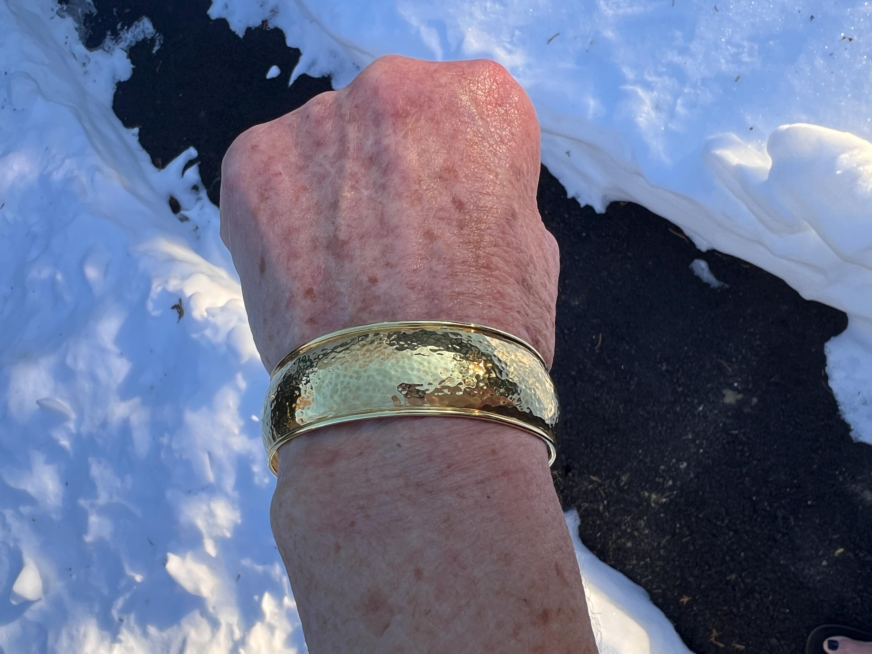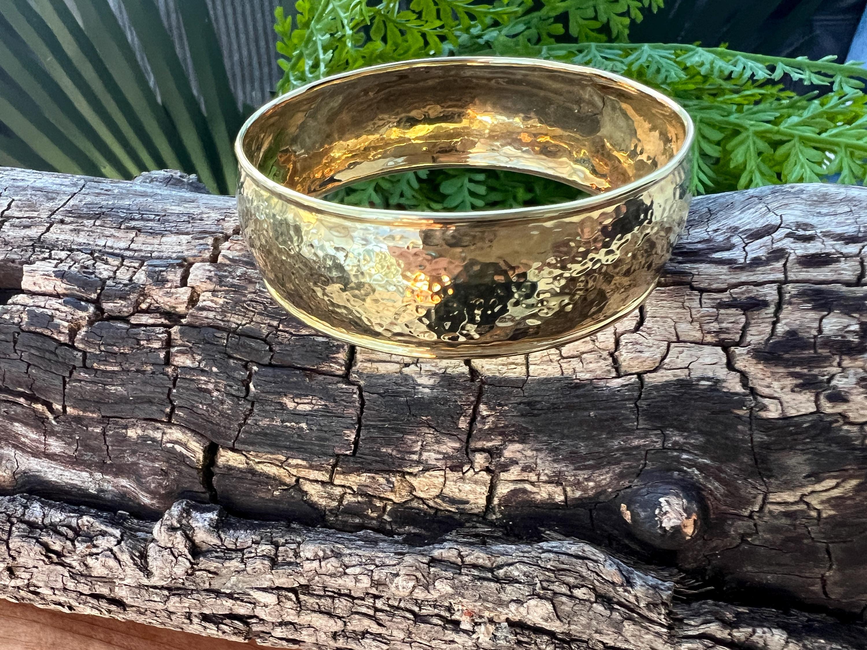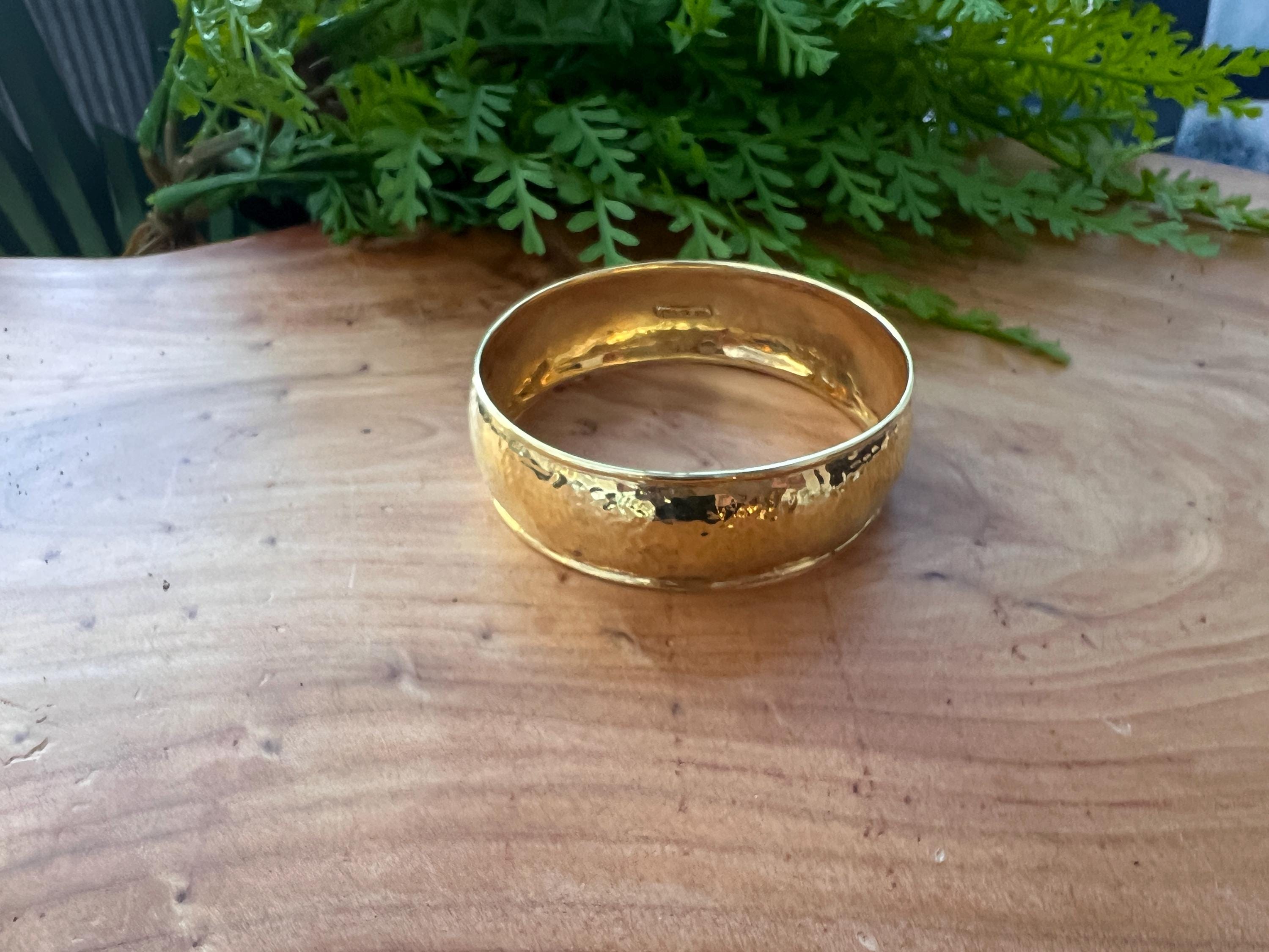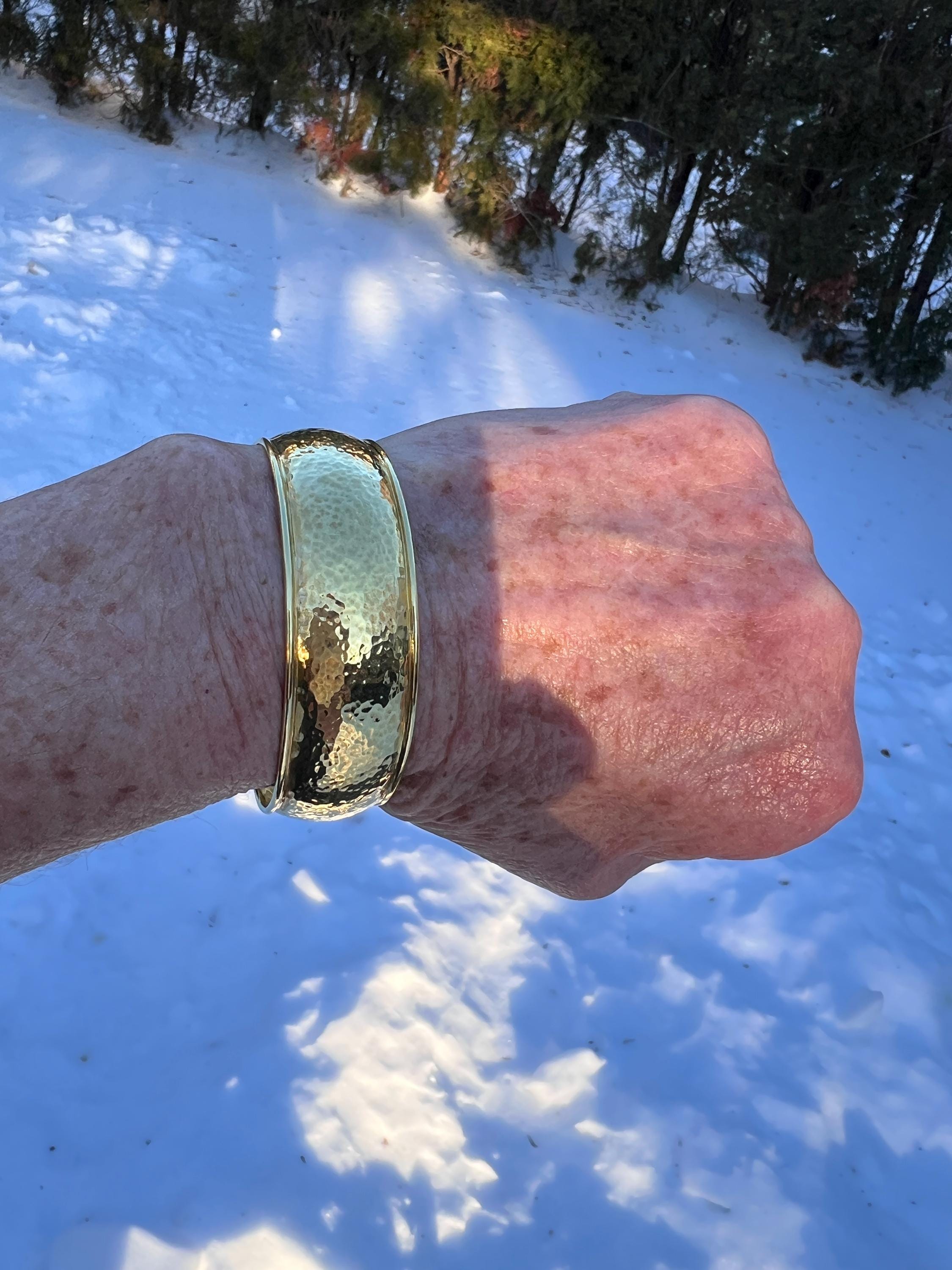 Set in 18k yellow gold, this quietly lavish vintage Ippolita bangle is the essence of elegance. It dates from the 1980's. The bangle is beautifully sculpted in a high polish hammered gold finish to create magnificence. Striking in its simplicity, yet power on the wrist. The inside circumference is 8". The inside diameter is 2 3/8". It is 3/4" wide. It is a slip on style bangle. It will fit a small/medium wrist. It weighs 36.06 grams. It is marked Ippolita and 18k.