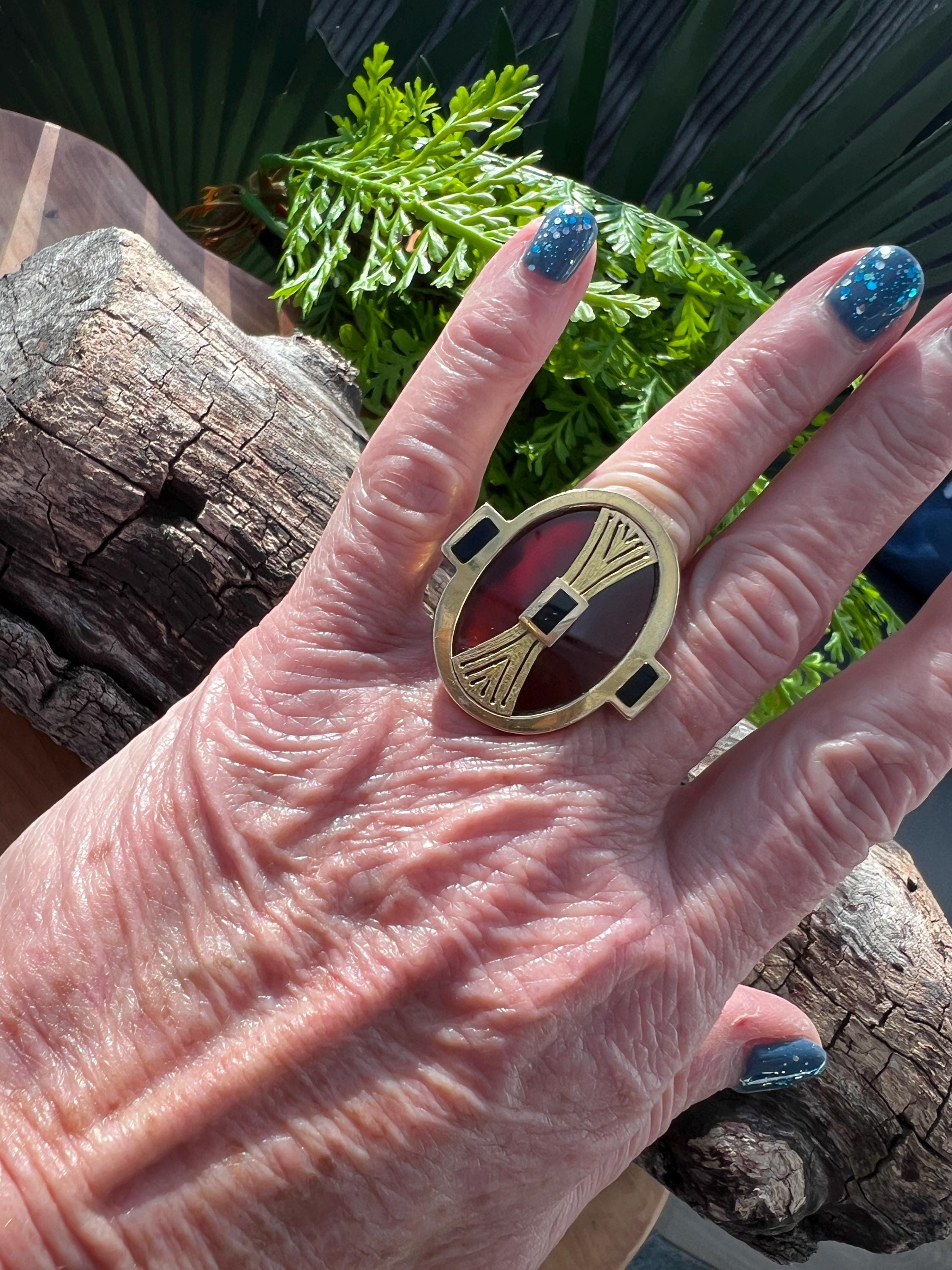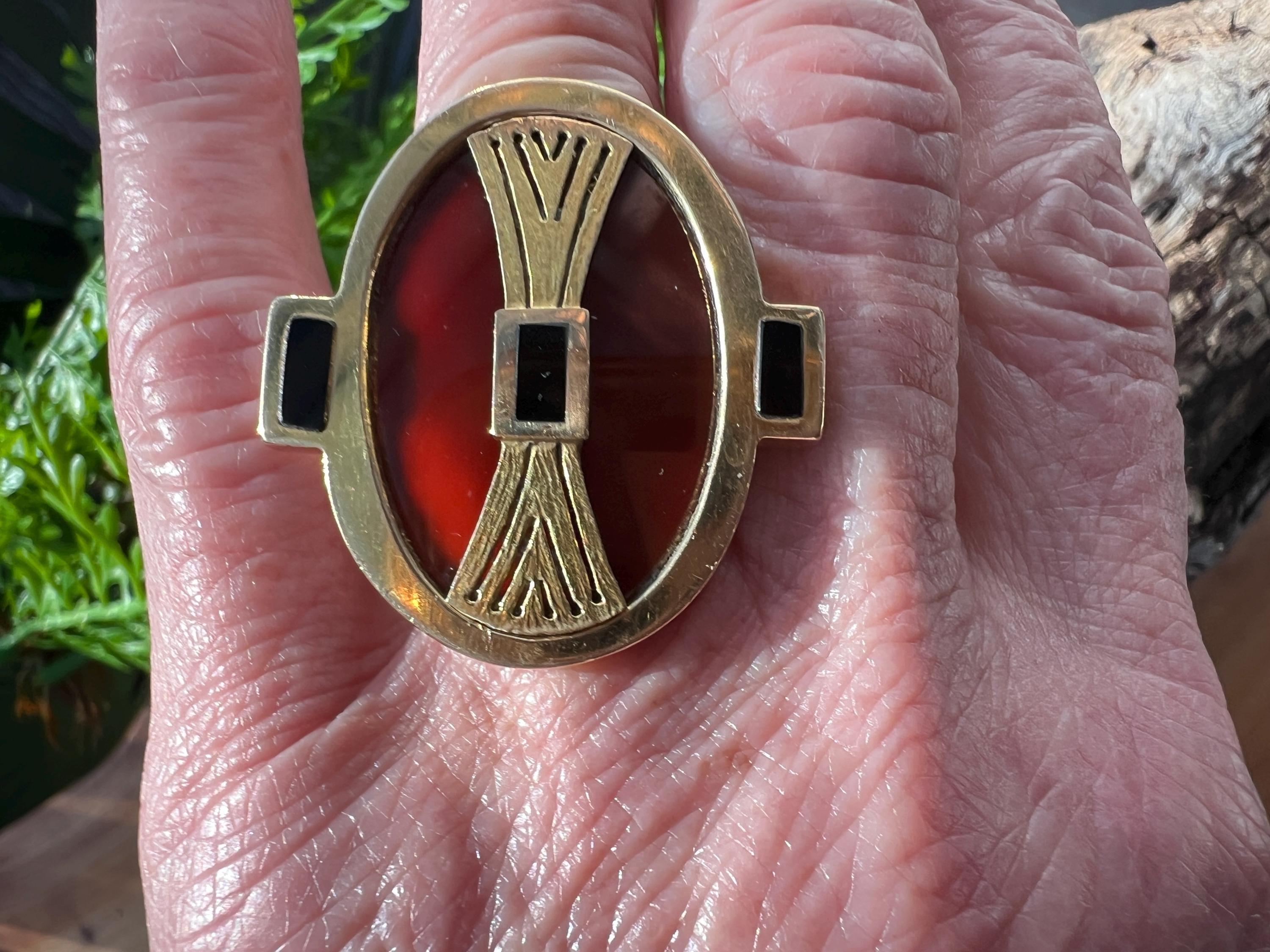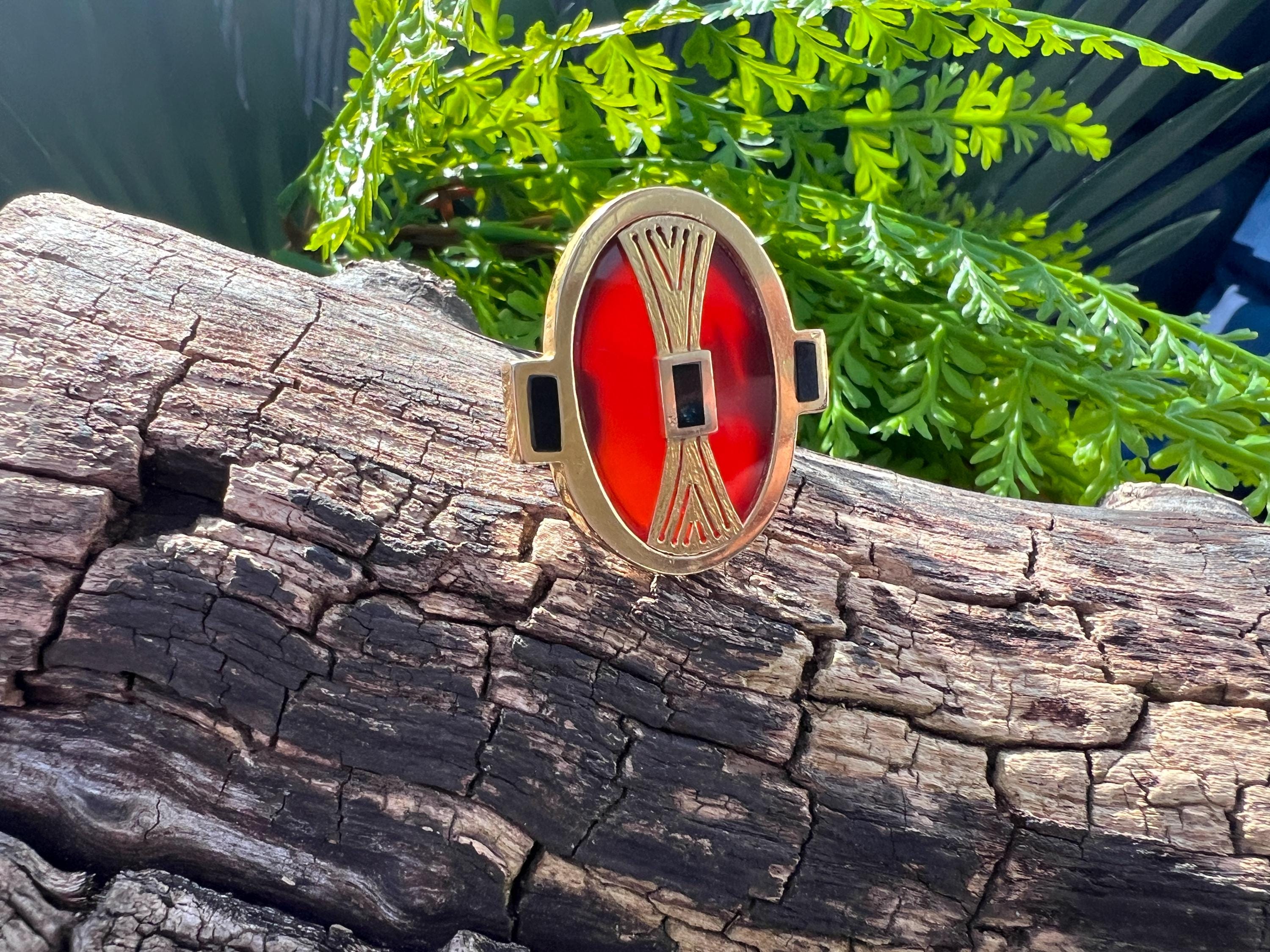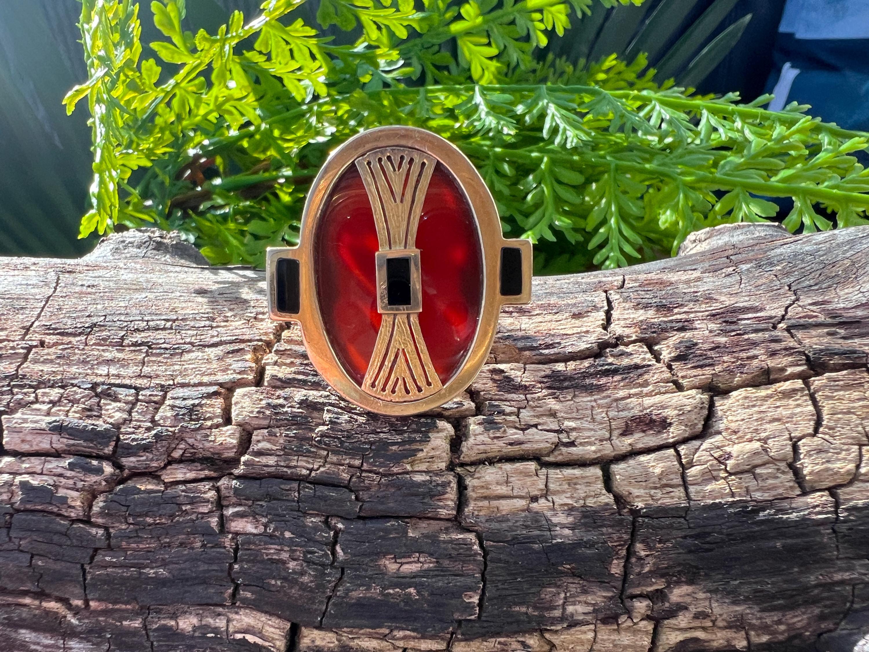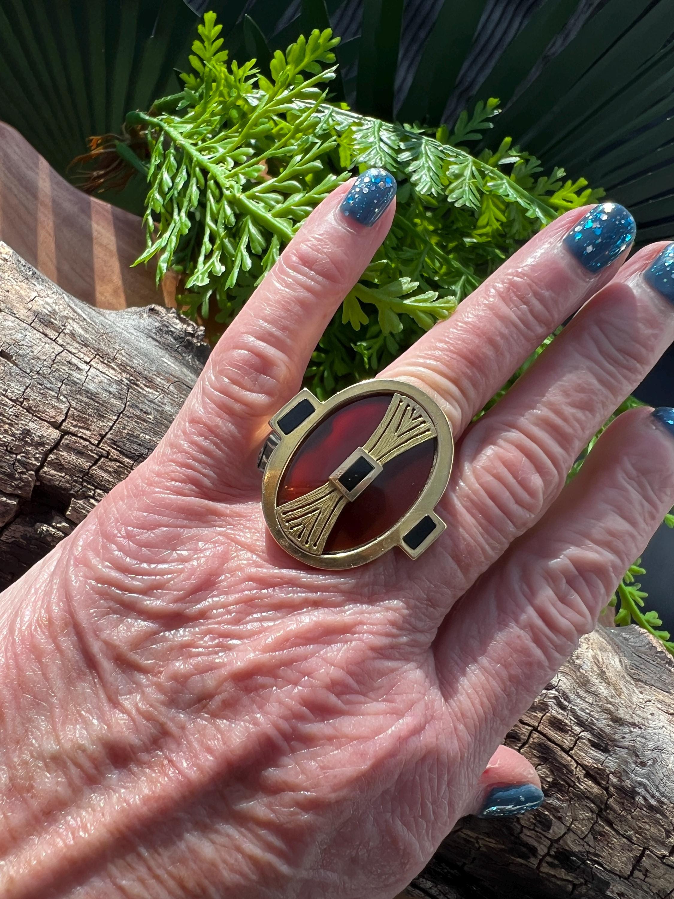 Lavish and striking is this carnelian and onyx retro ring. Set in 18k yellow gold, it dates from the late 1940s. Set in in the center is an impressive oval shaped uniquely translucent carnelian. A piece of ridged gold cascades down the center grasped by an emerald cut piece of jet black onyx to bring the drama. Each side of the weighty mounting is also graced with a piece of the onyx creating its captivating presence. look. Impressive, imposing and spectacular. The ring measures 1 3/16" x 1 5/16" across the top. The band is 1/4" wide. It weighs 17.03 grams. It will fit a size 7 finger. It is marked MI Swiss and 750.