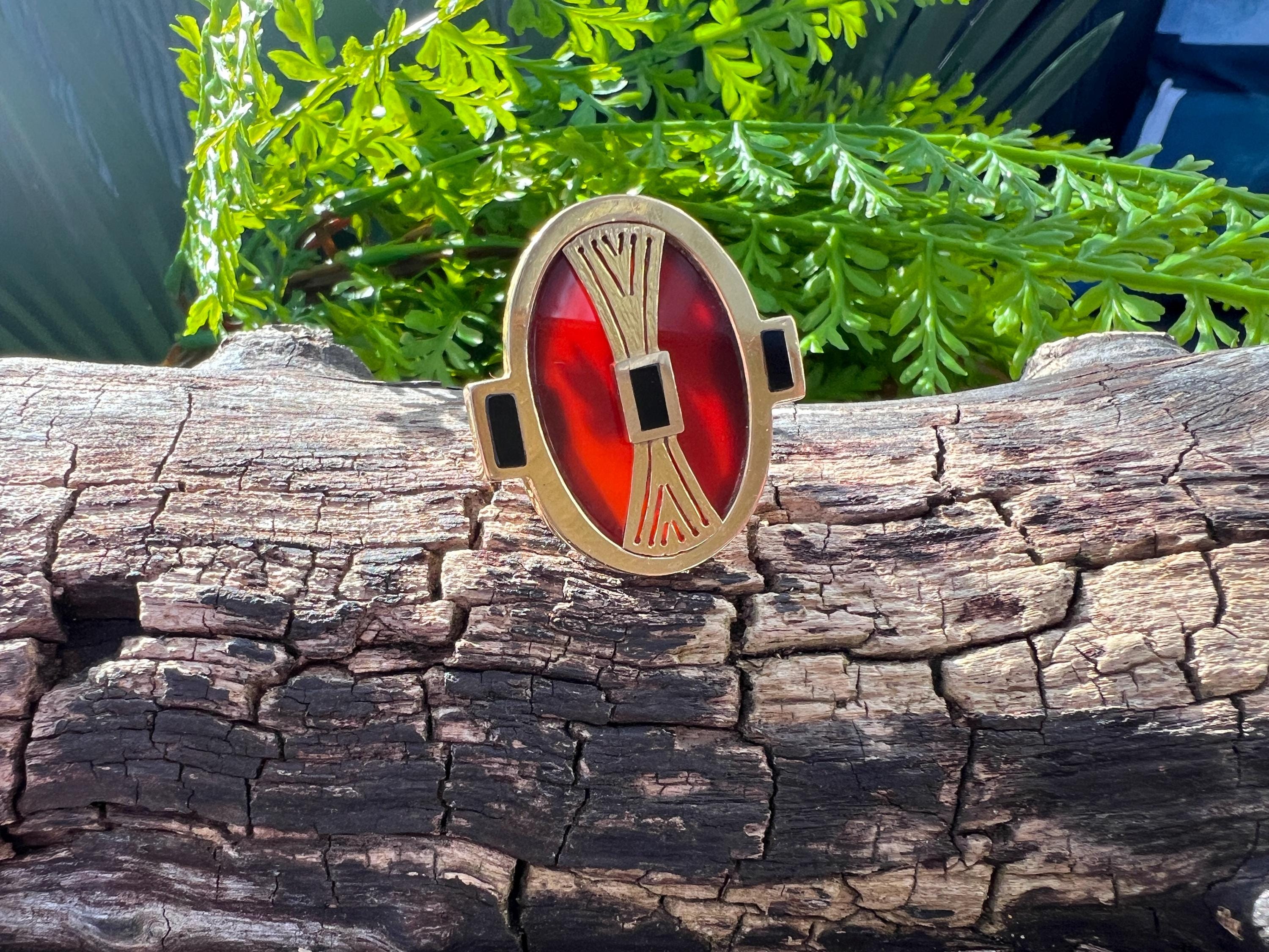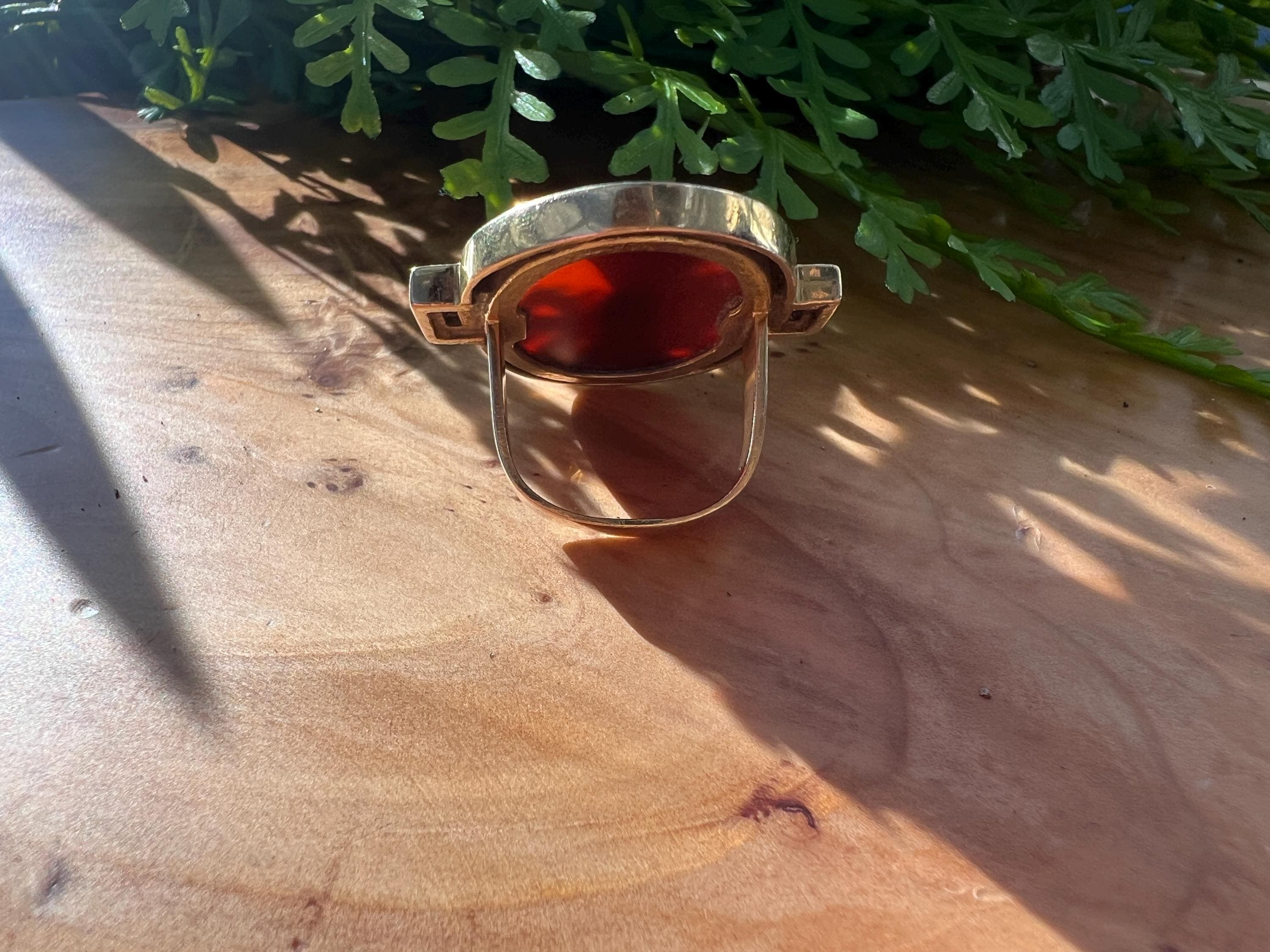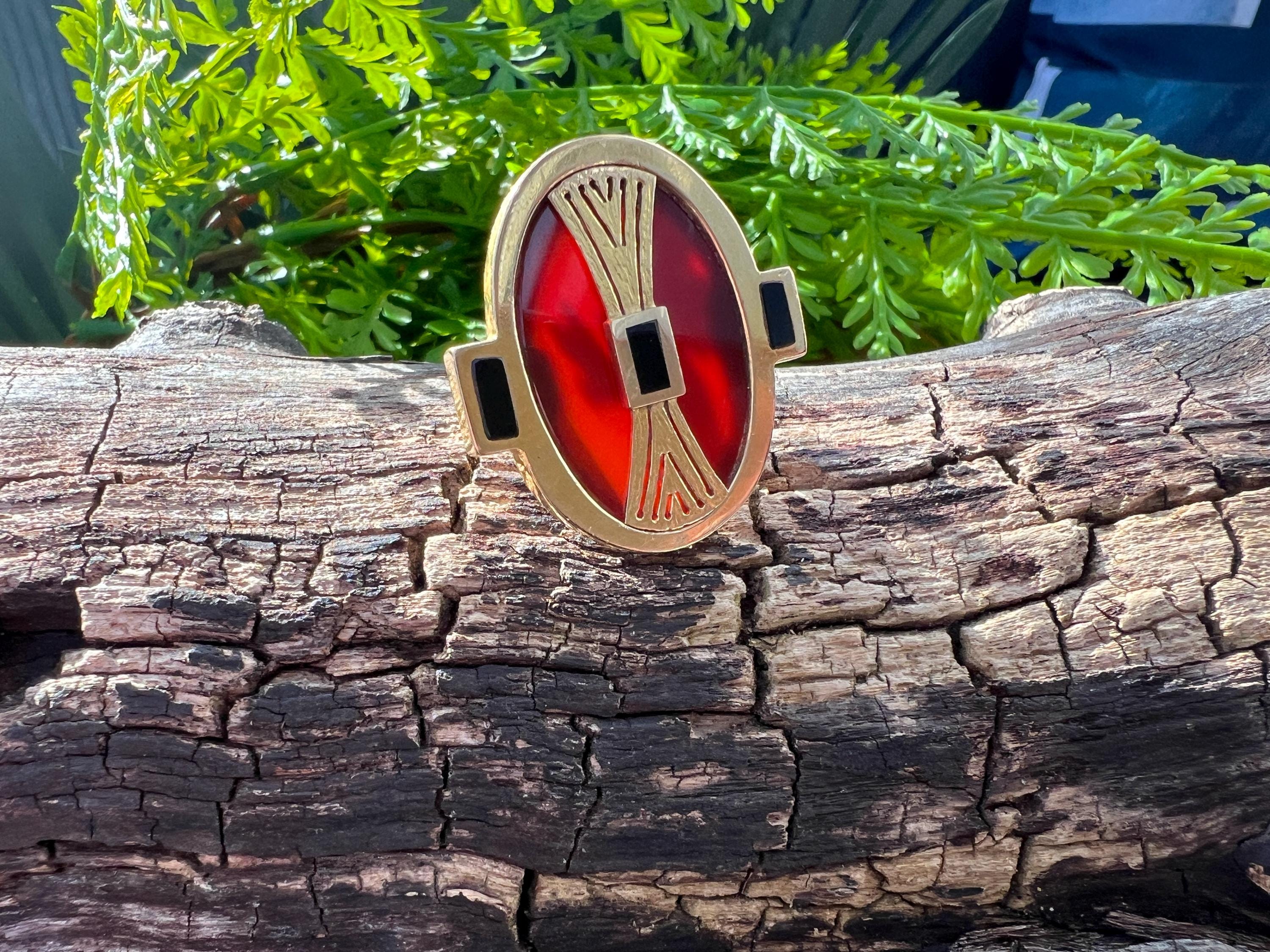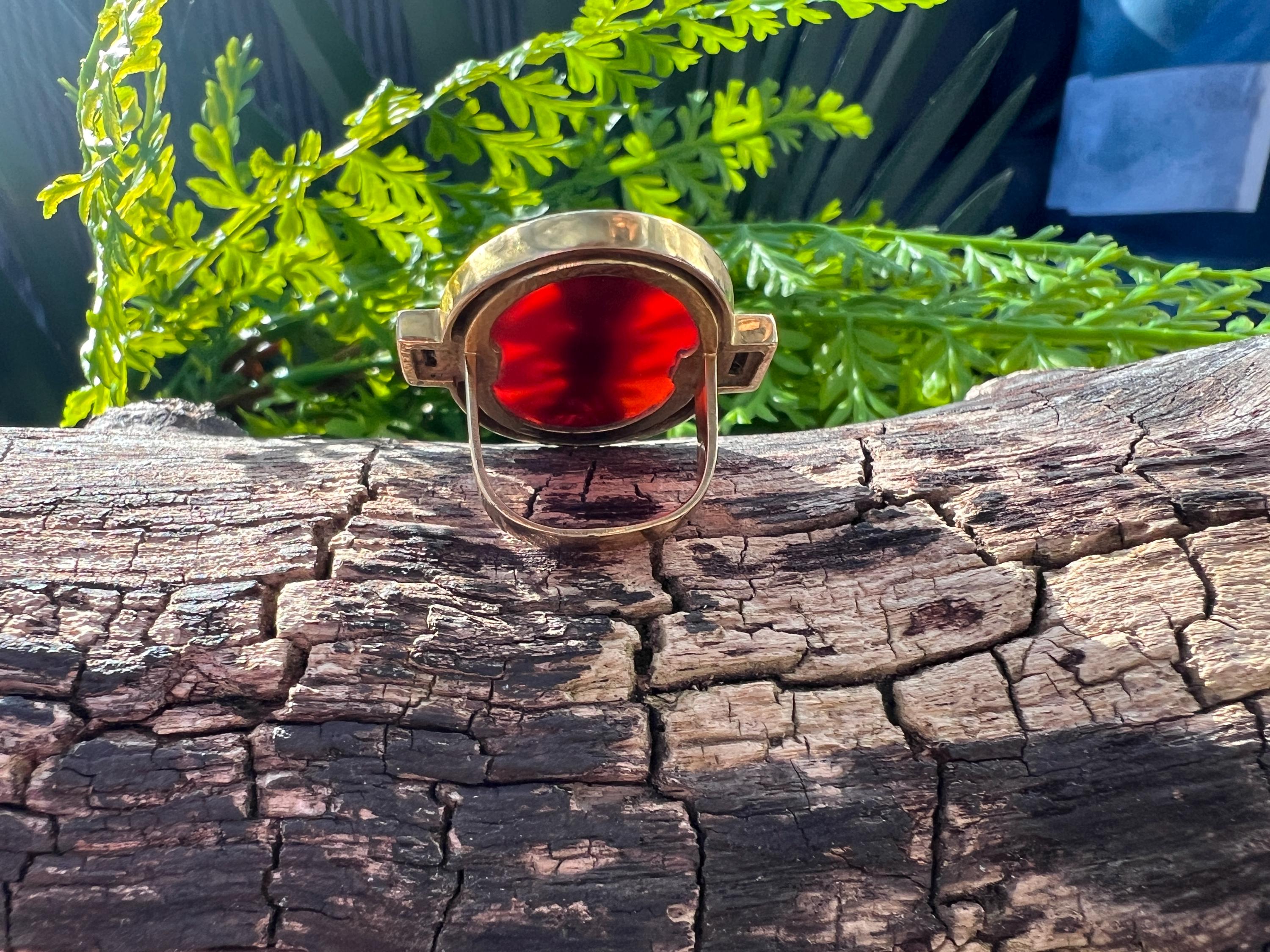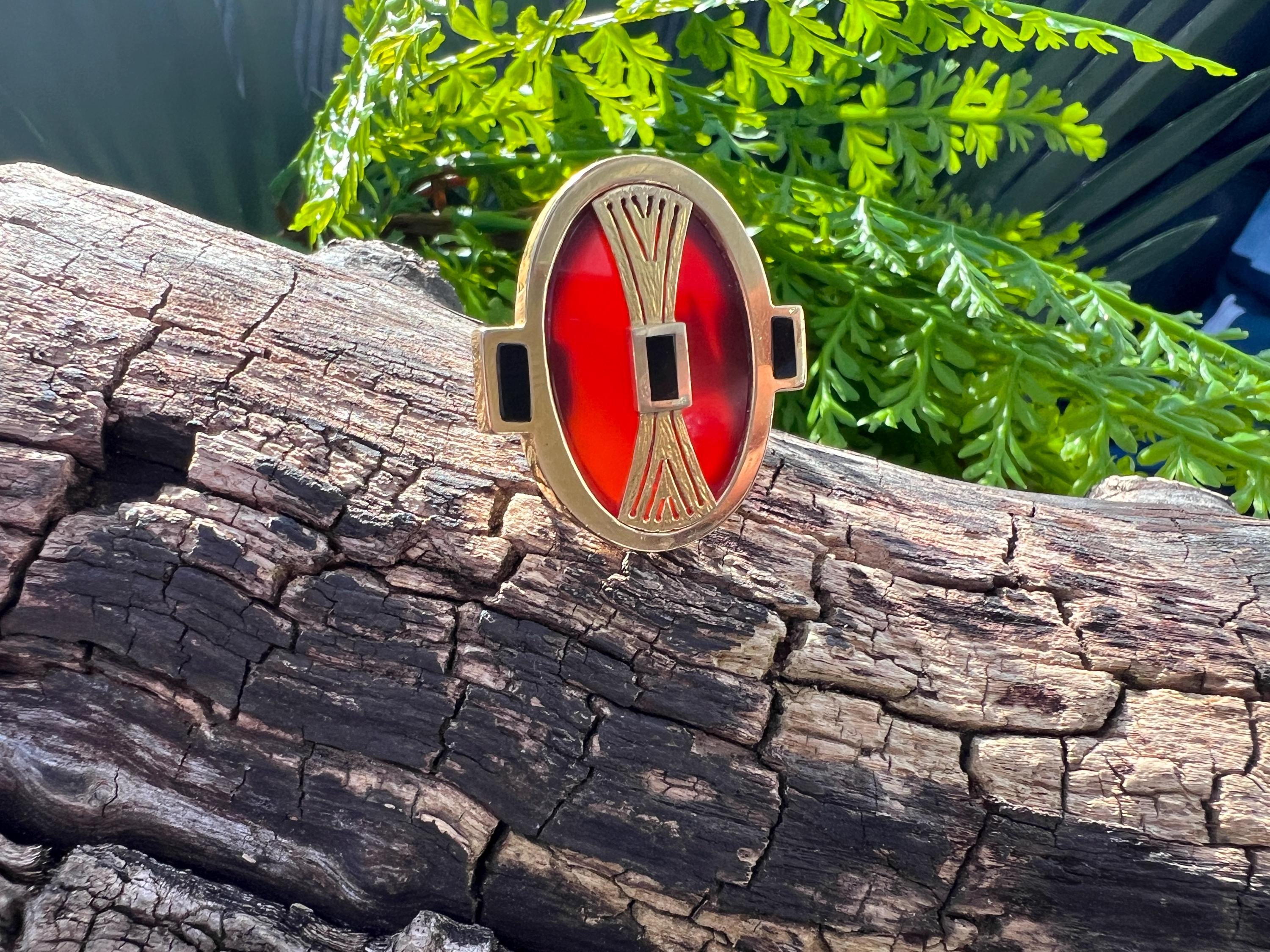 Lavish and striking is this carnelian and onyx retro ring. Set in 18k yellow gold, it dates from the late 1940s. Set in in the center is an impressive oval shaped uniquely translucent carnelian. A piece of ridged gold cascades down the center grasped by an emerald cut piece of jet black onyx to bring the drama. Each side of the weighty mounting is also graced with a piece of the onyx creating its captivating presence. look. Impressive, imposing and spectacular. The ring measures 1 3/16" x 1 5/16" across the top. The band is 1/4" wide. It weighs 17.03 grams. It will fit a size 7 finger. It is marked MI Swiss and 750.