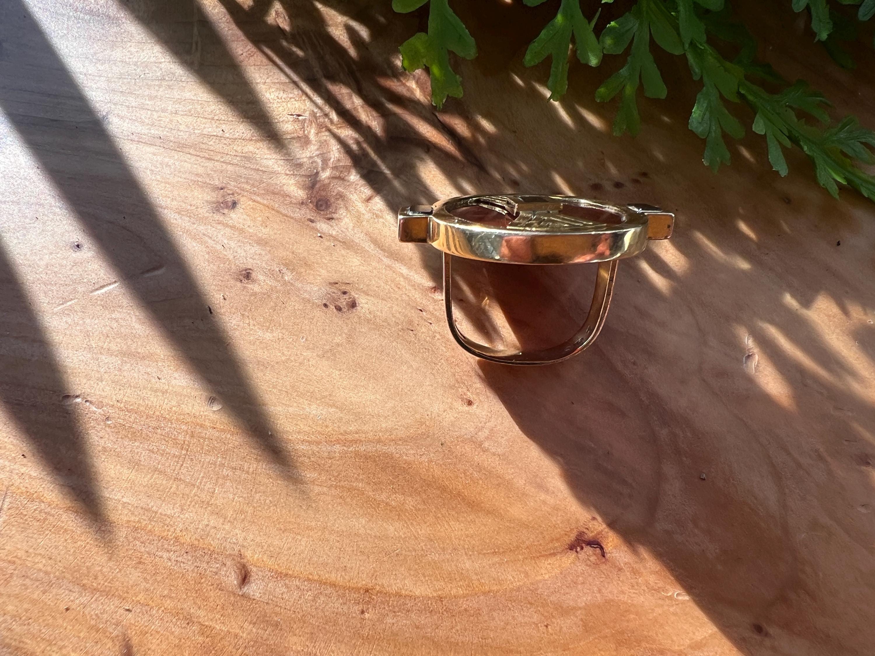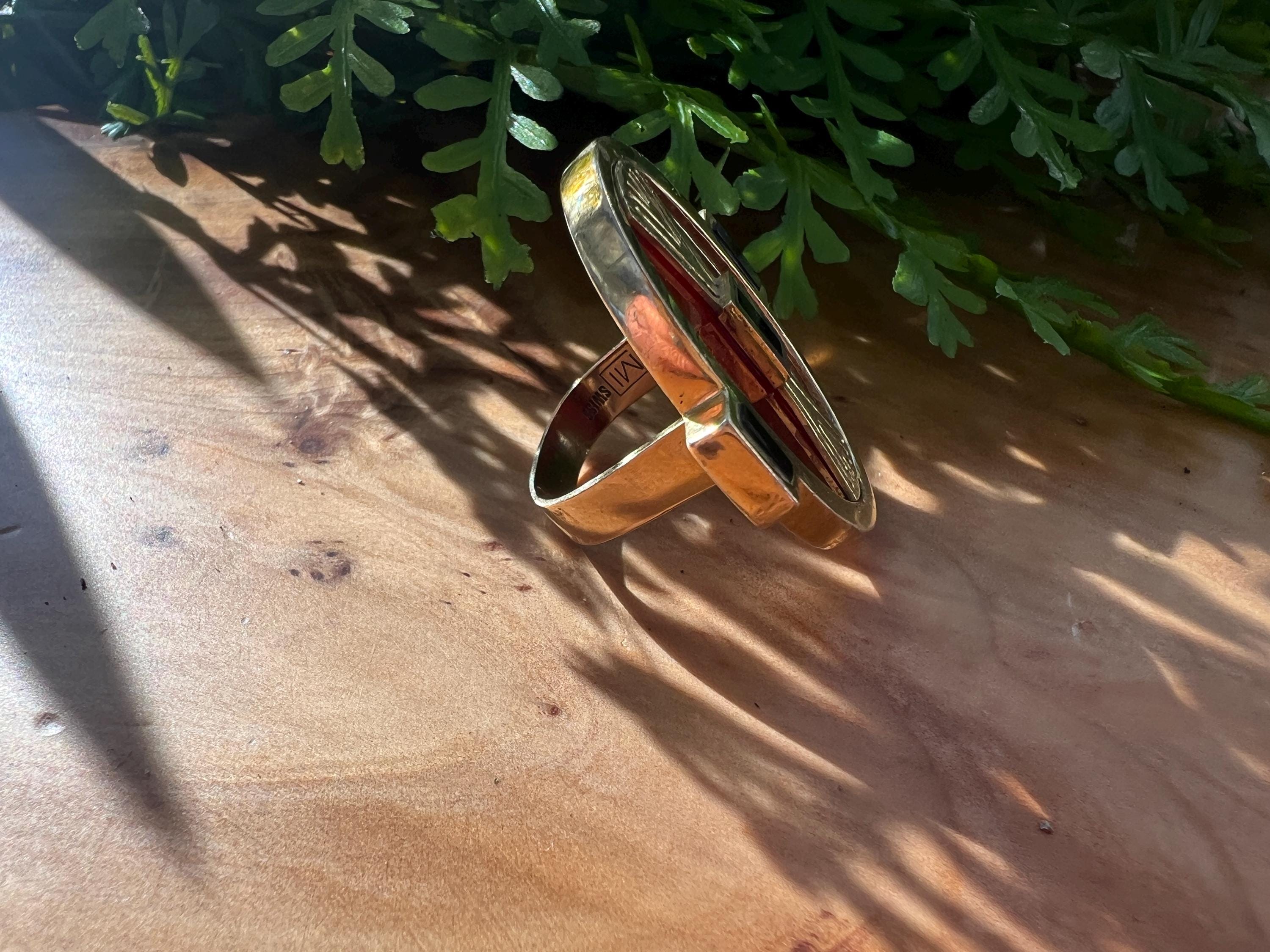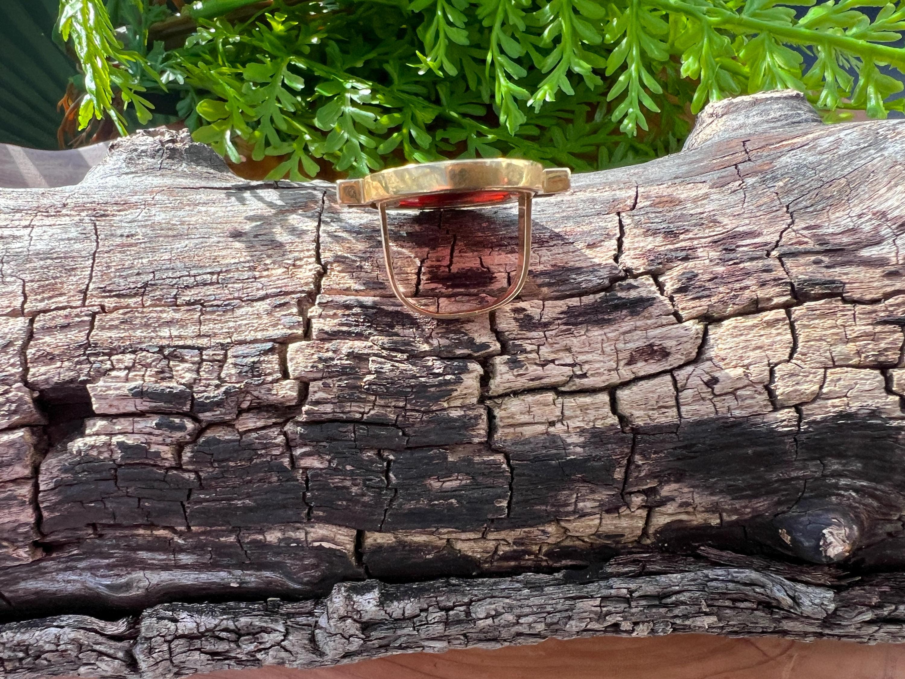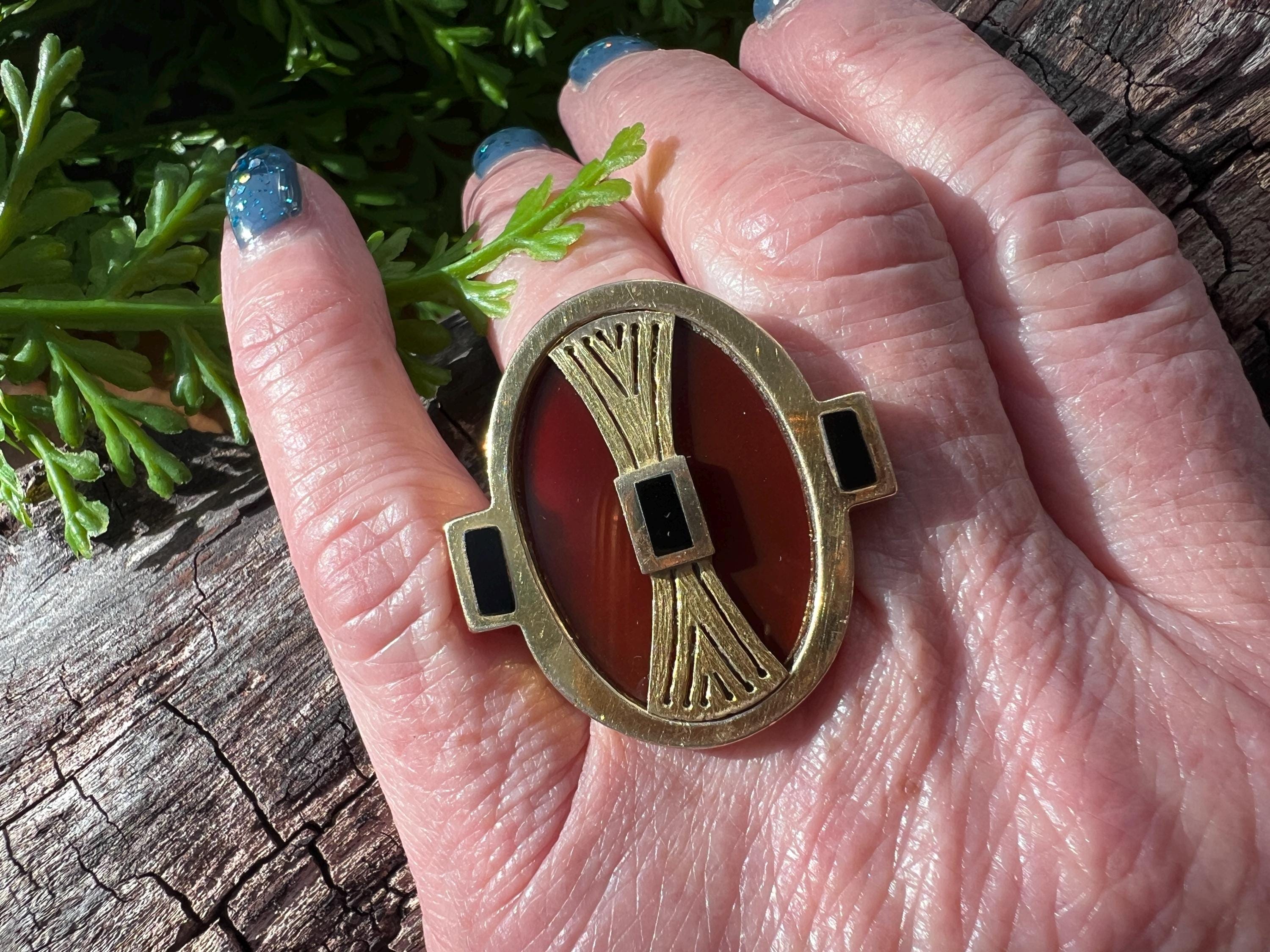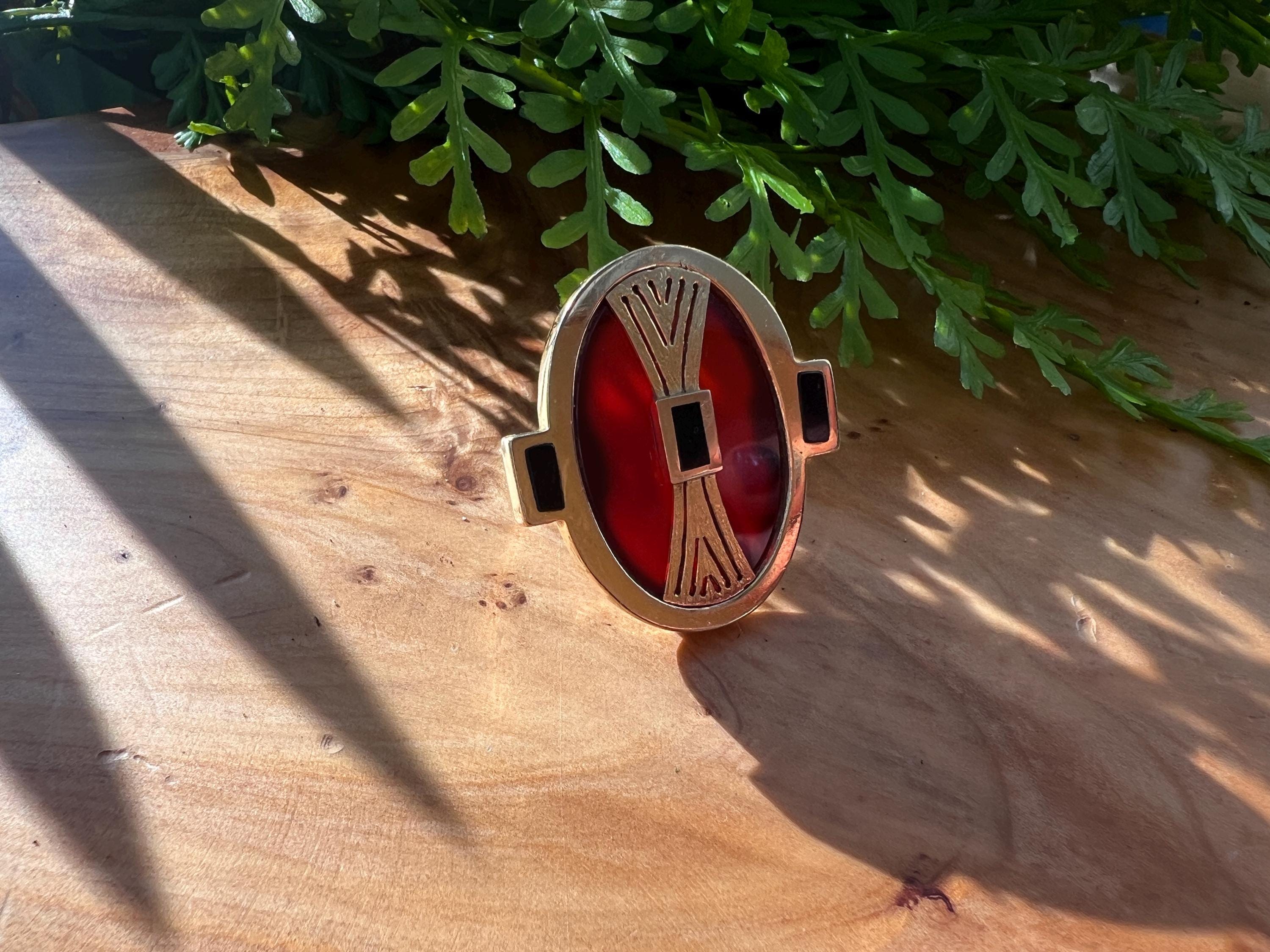 Lavish and striking is this carnelian and onyx retro ring. Set in 18k yellow gold, it dates from the late 1940s. Set in in the center is an impressive oval shaped uniquely translucent carnelian. A piece of ridged gold cascades down the center grasped by an emerald cut piece of jet black onyx to bring the drama. Each side of the weighty mounting is also graced with a piece of the onyx creating its captivating presence. look. Impressive, imposing and spectacular. The ring measures 1 3/16" x 1 5/16" across the top. The band is 1/4" wide. It weighs 17.03 grams. It will fit a size 7 finger. It is marked MI Swiss and 750.