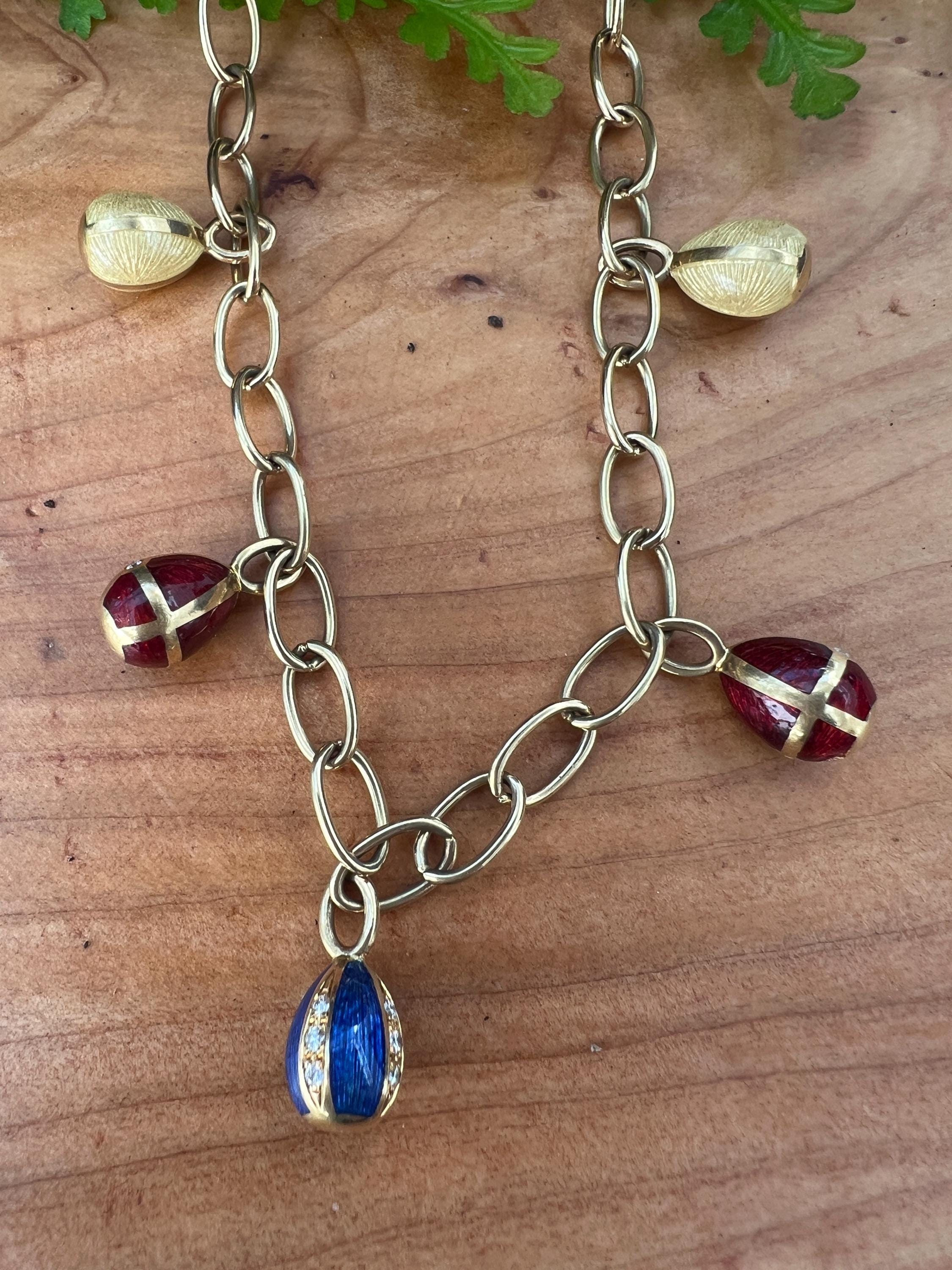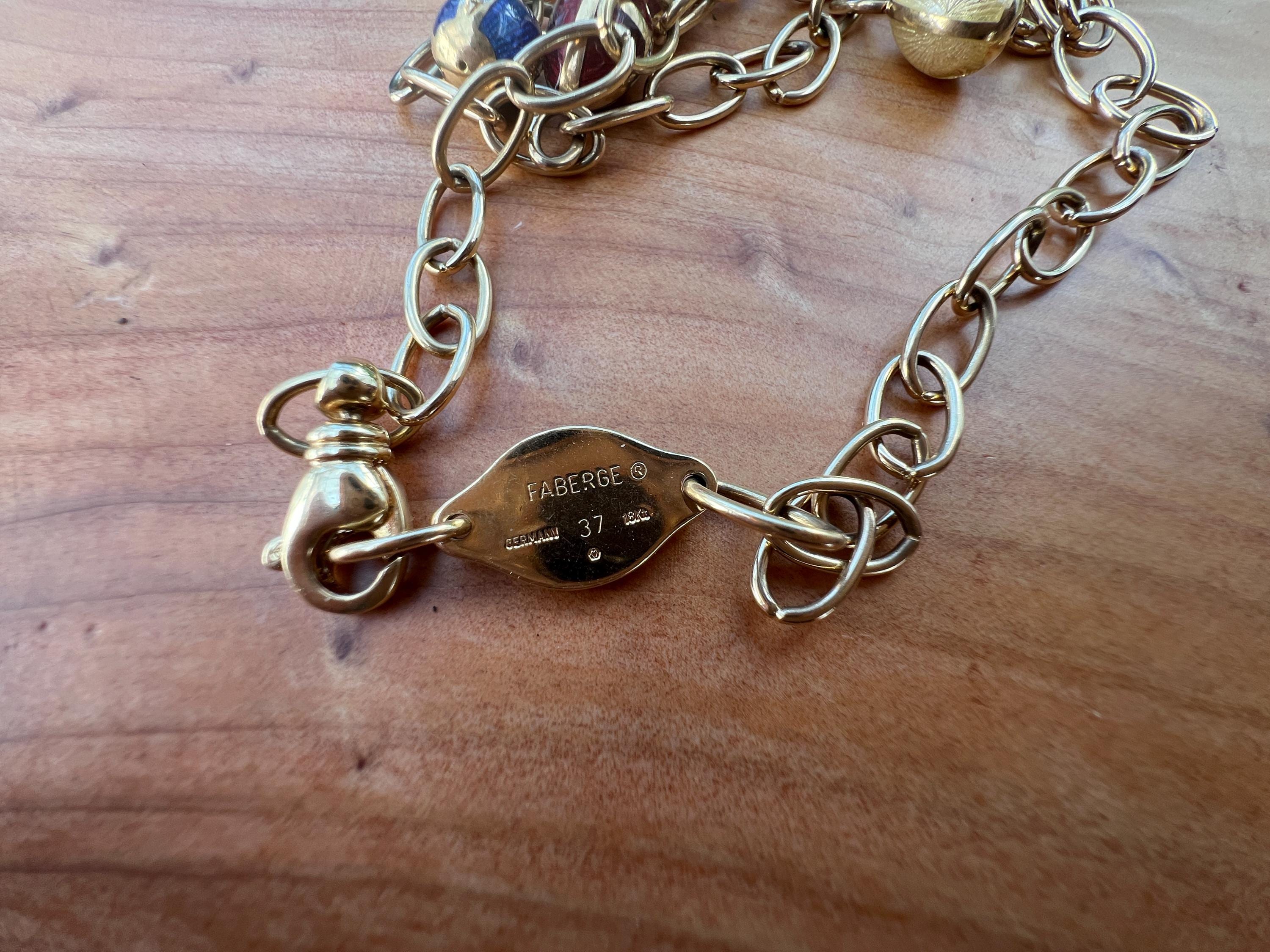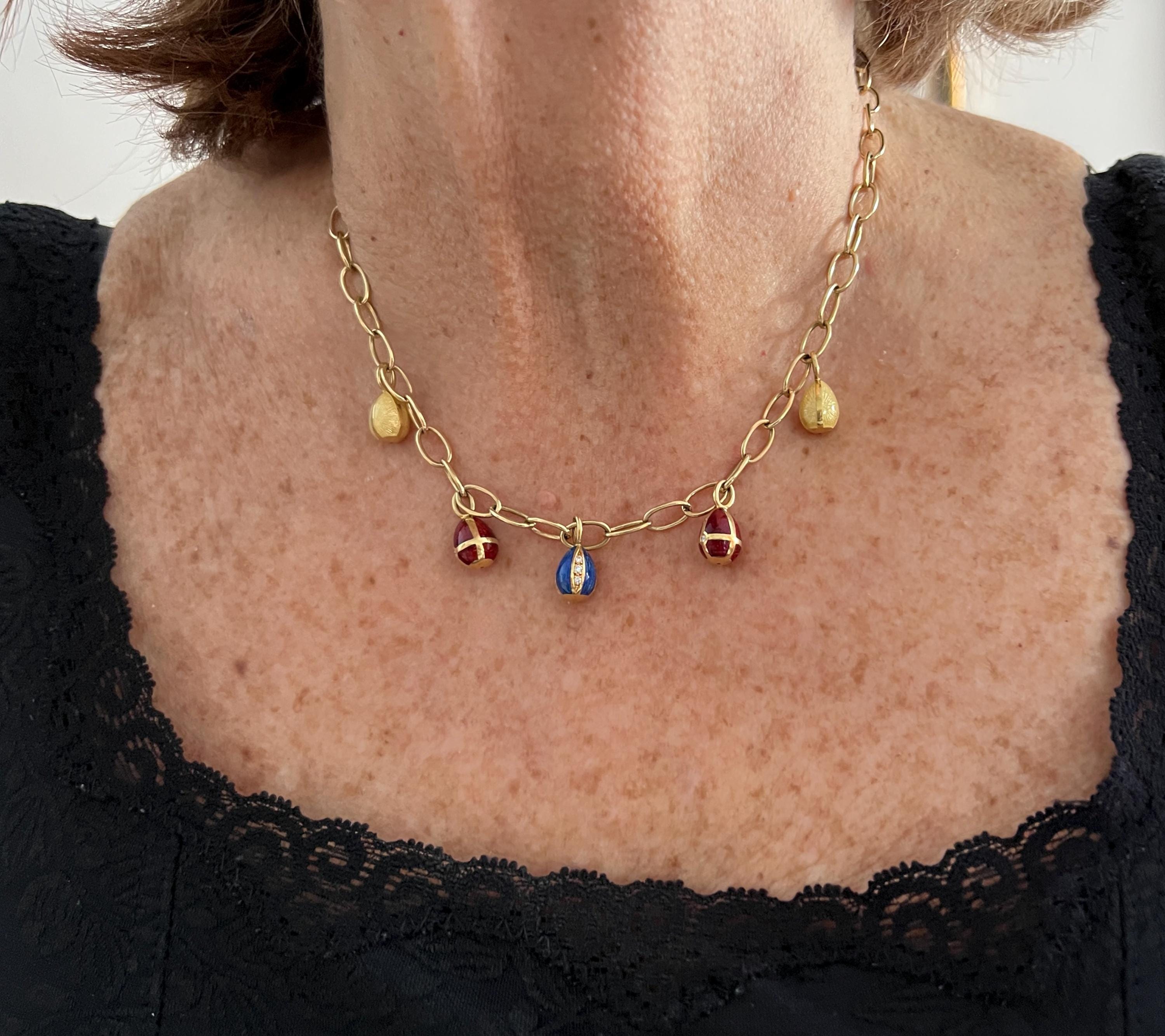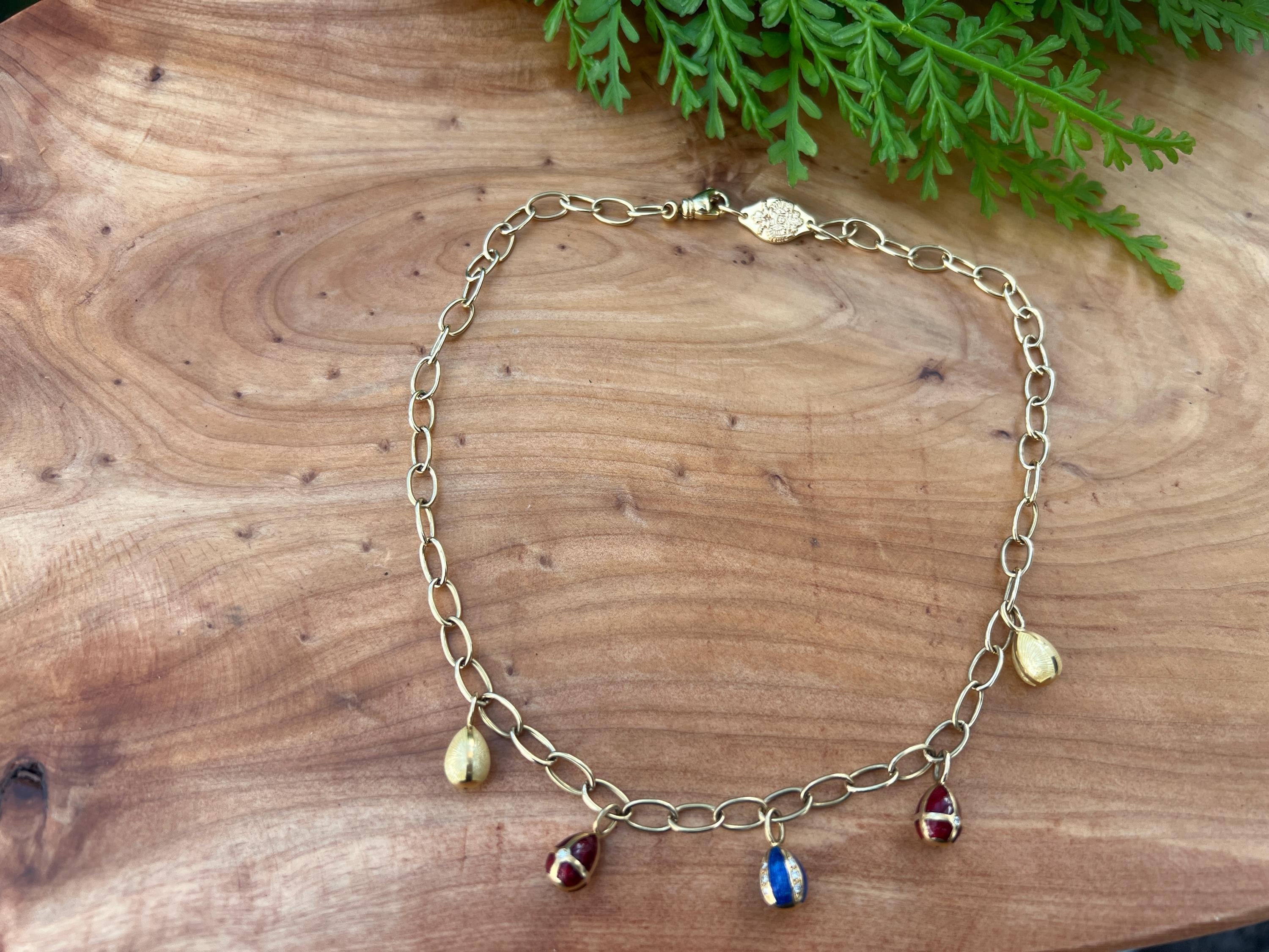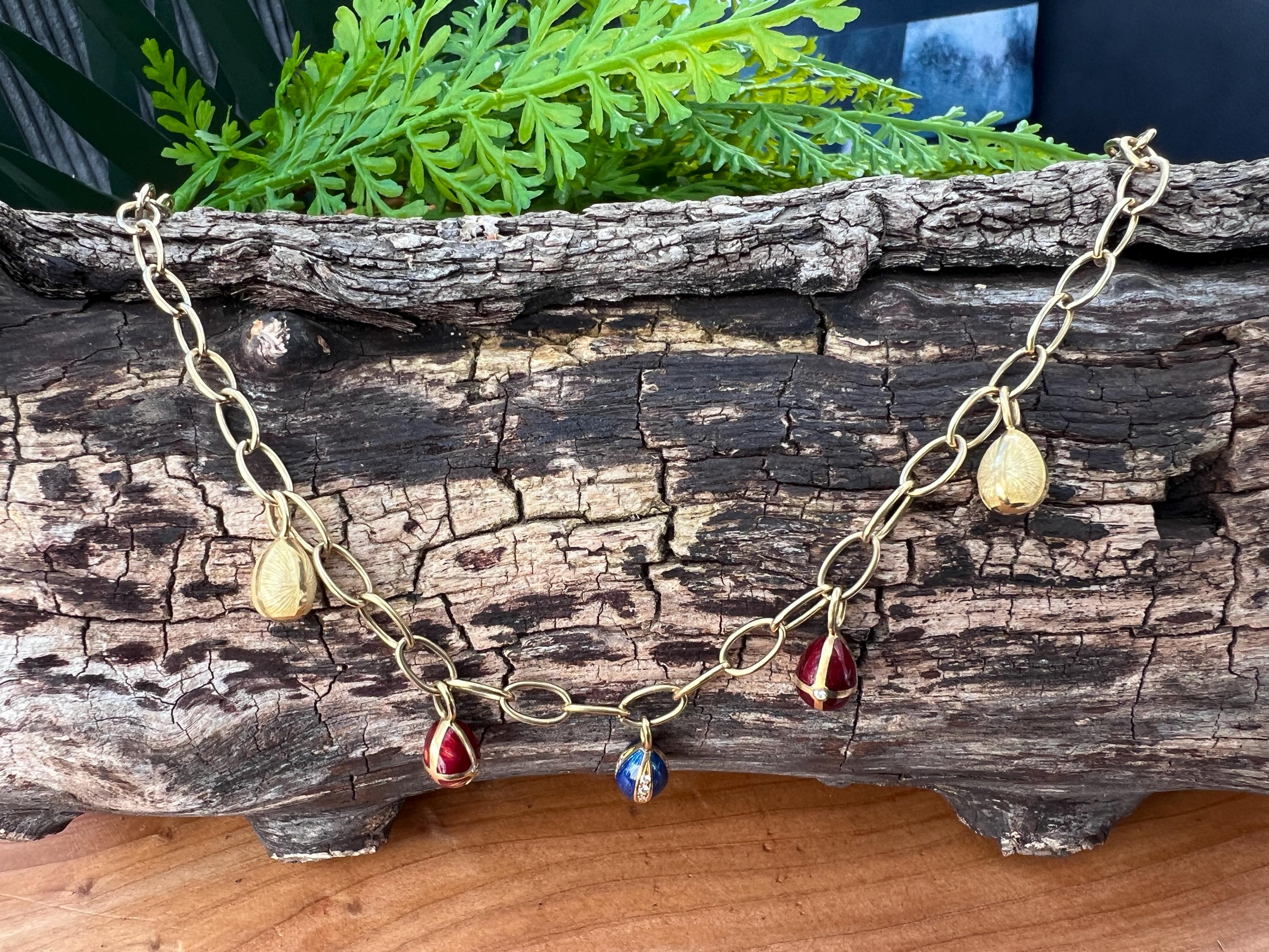 Radiating elegance, this striking vintage Faberge egg choker necklace is made in 18k yellow gold. This dramatic piece dates from the 1960’s. The spectacular decorated and vibrant enamel colored eggs fall like colorful fringe and join together to create a magnificent shaped necklace for a glamorous contrast. They are suspended from an oval link chain creating a strong and eye catching look. The necklace measures 16” long. It is 3/16" wide. The eggs including the bale measure 5/8" x 1/4'. It weighs 29.29 grams. It is marked 18k , Germany, 37 and Faberge.