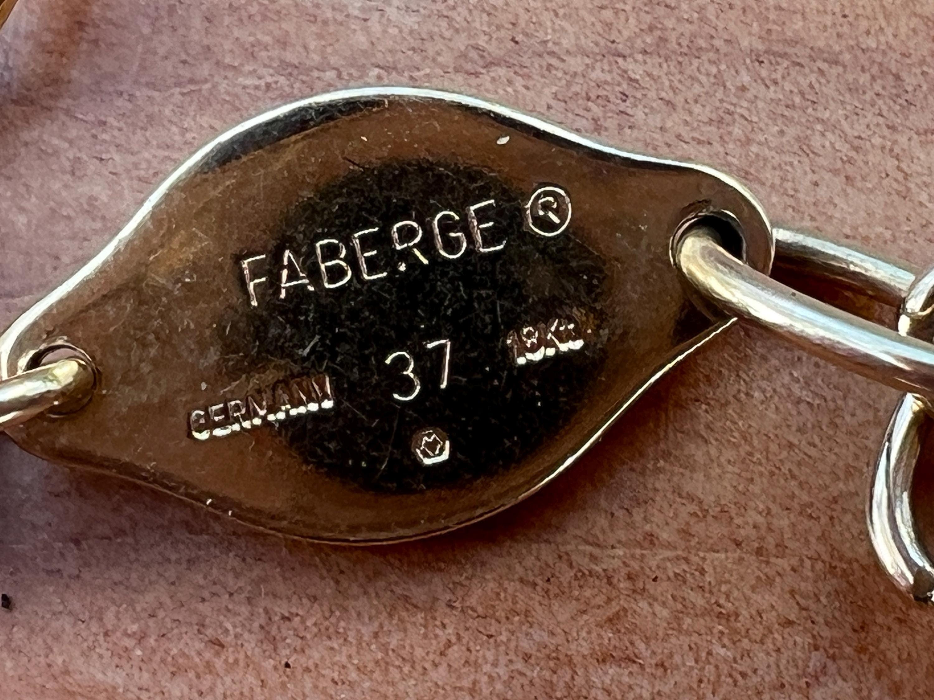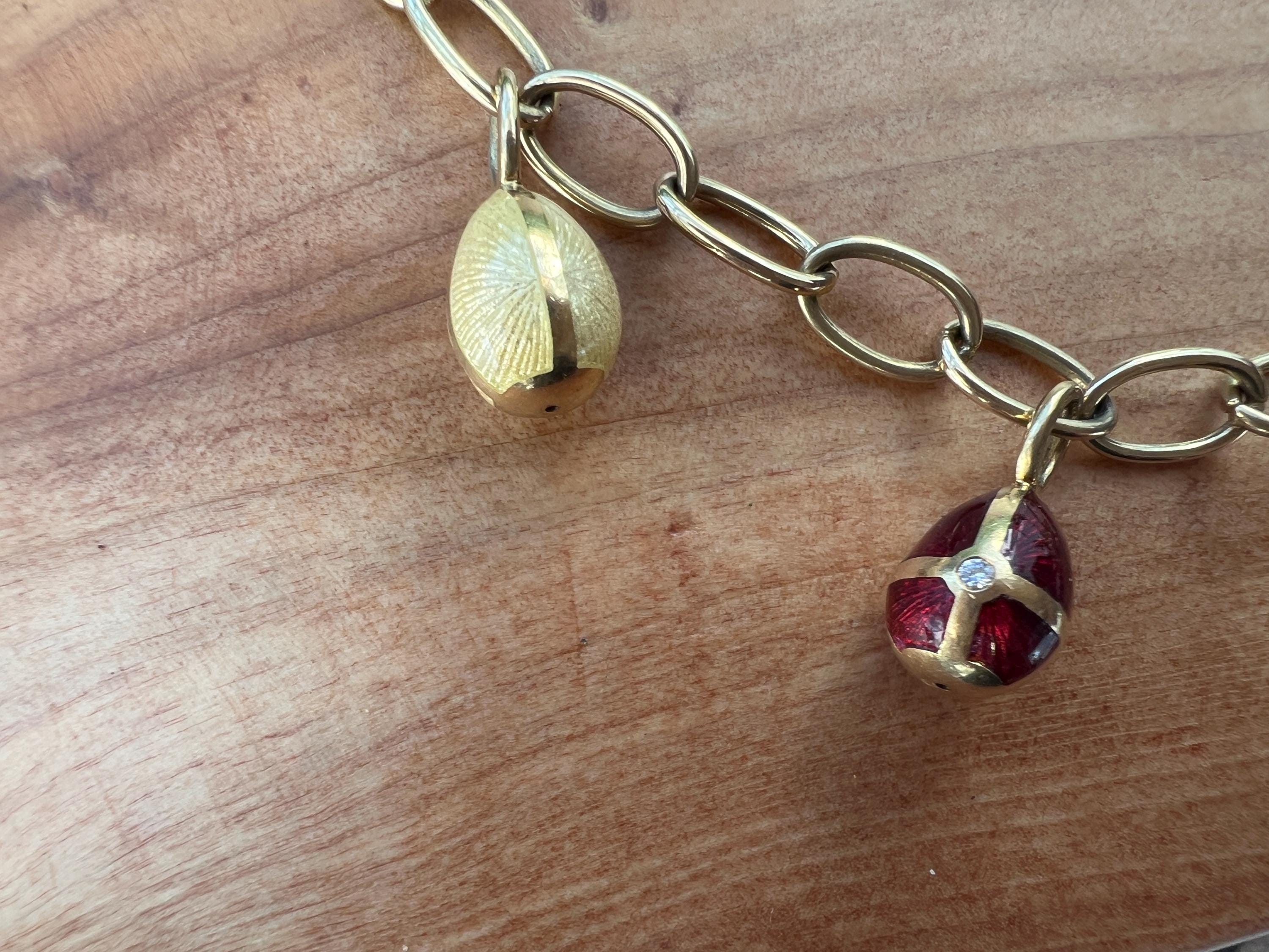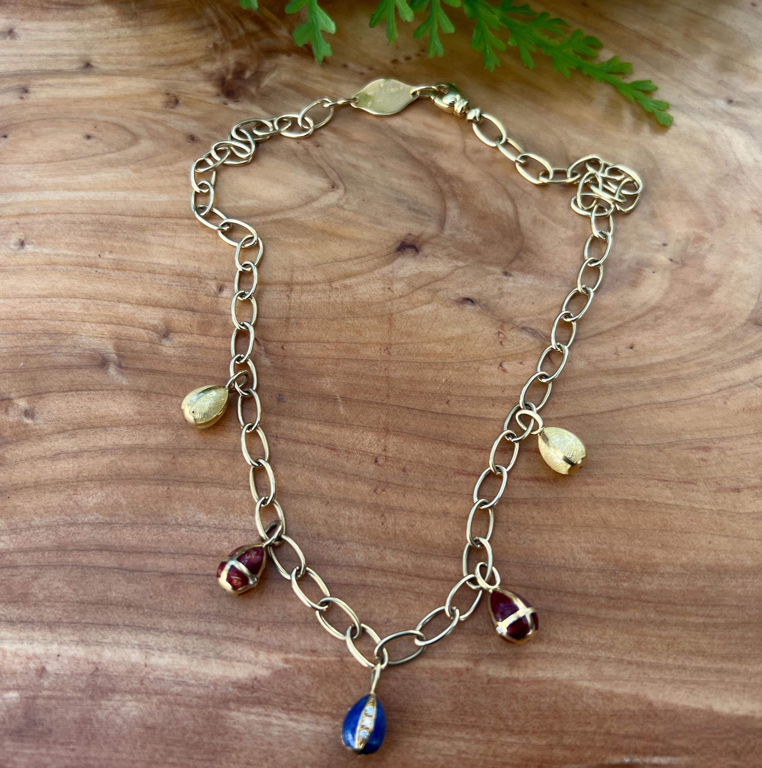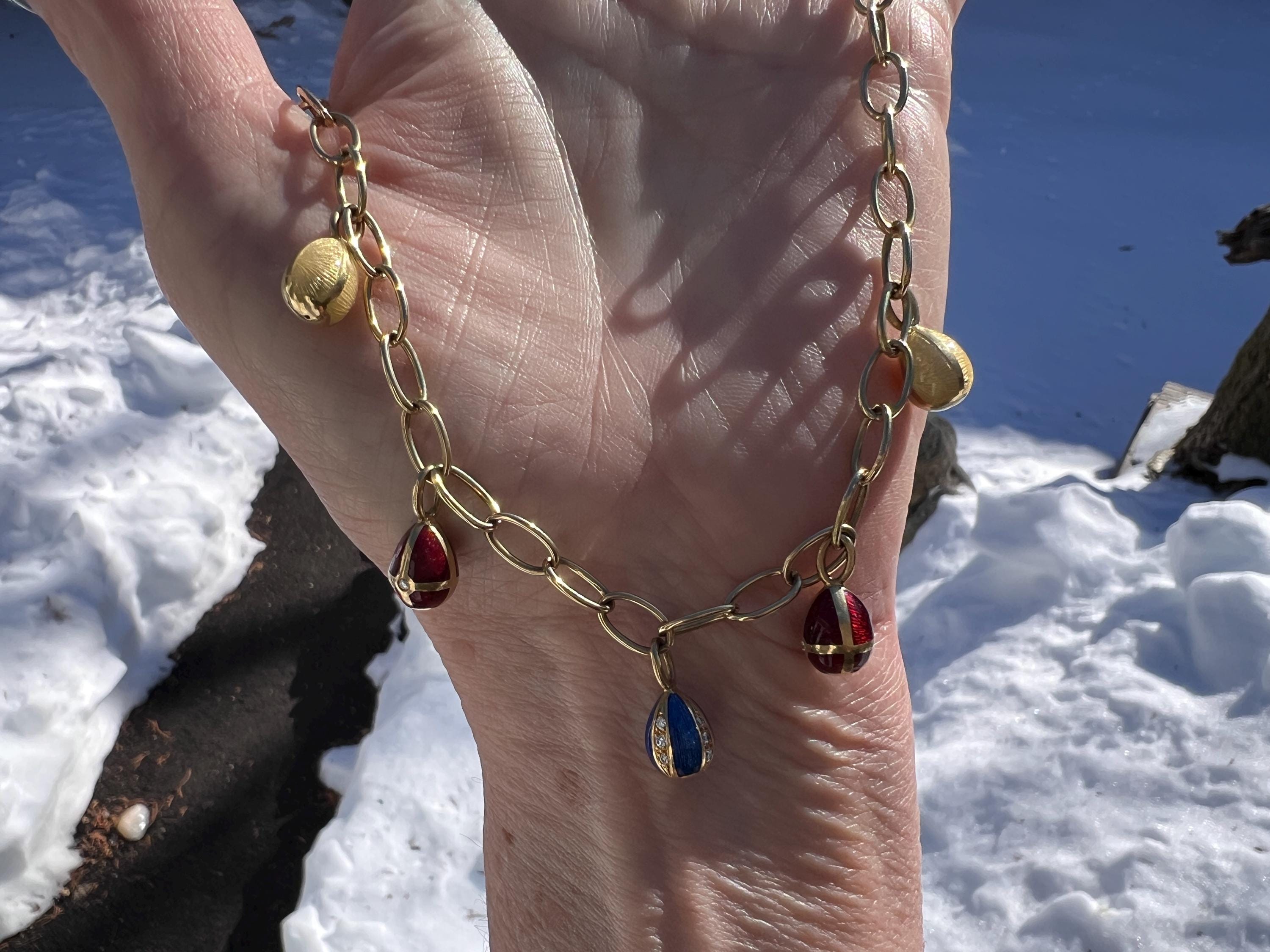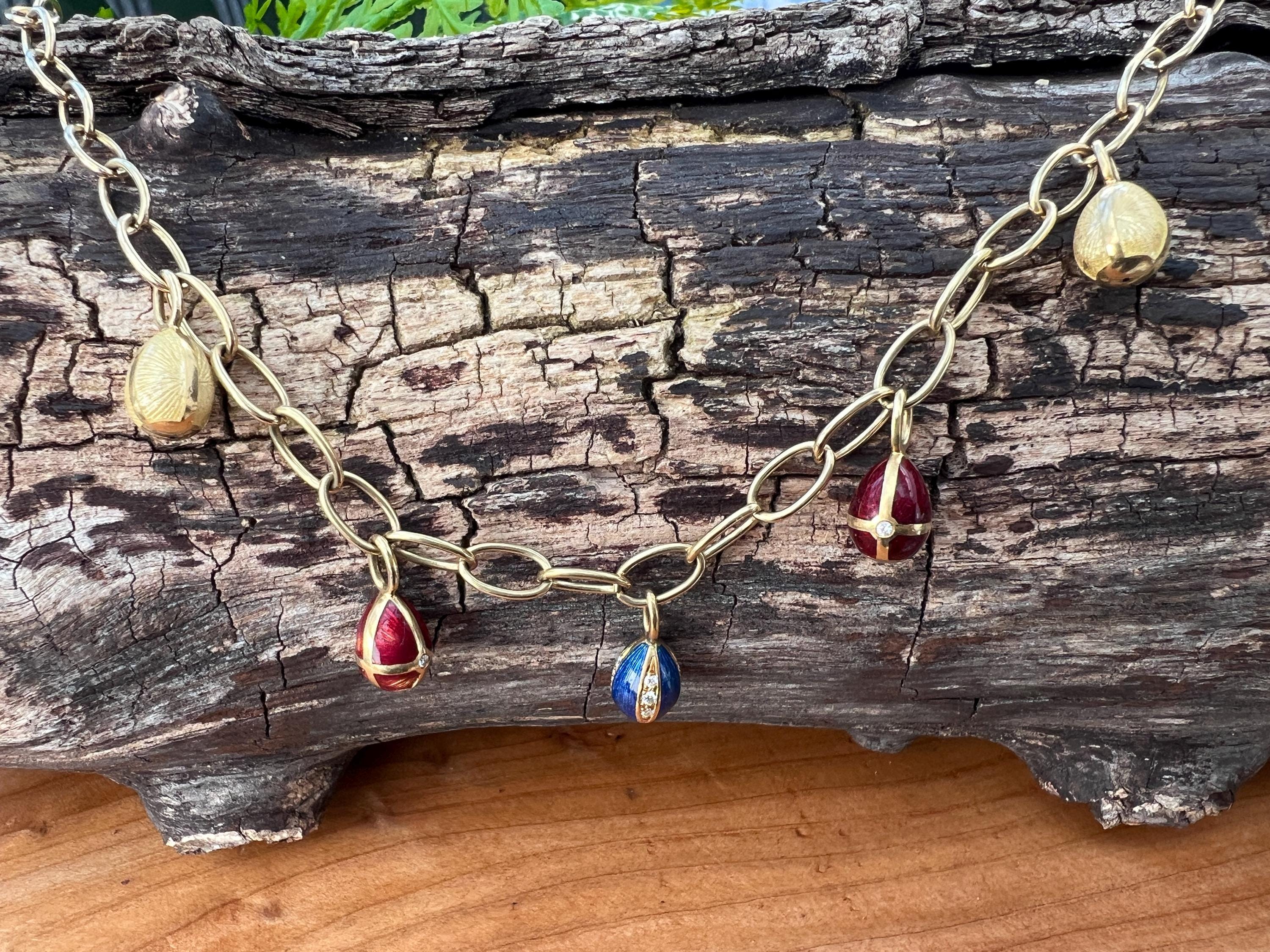 Radiating elegance, this striking vintage Faberge egg choker necklace is made in 18k yellow gold. This dramatic piece dates from the 1960’s. The spectacular decorated and vibrant enamel colored eggs fall like colorful fringe and join together to create a magnificent shaped necklace for a glamorous contrast. They are suspended from an oval link chain creating a strong and eye catching look. The necklace measures 16” long. It is 3/16" wide. The eggs including the bale measure 5/8" x 1/4'. It weighs 29.29 grams. It is marked 18k , Germany, 37 and Faberge.