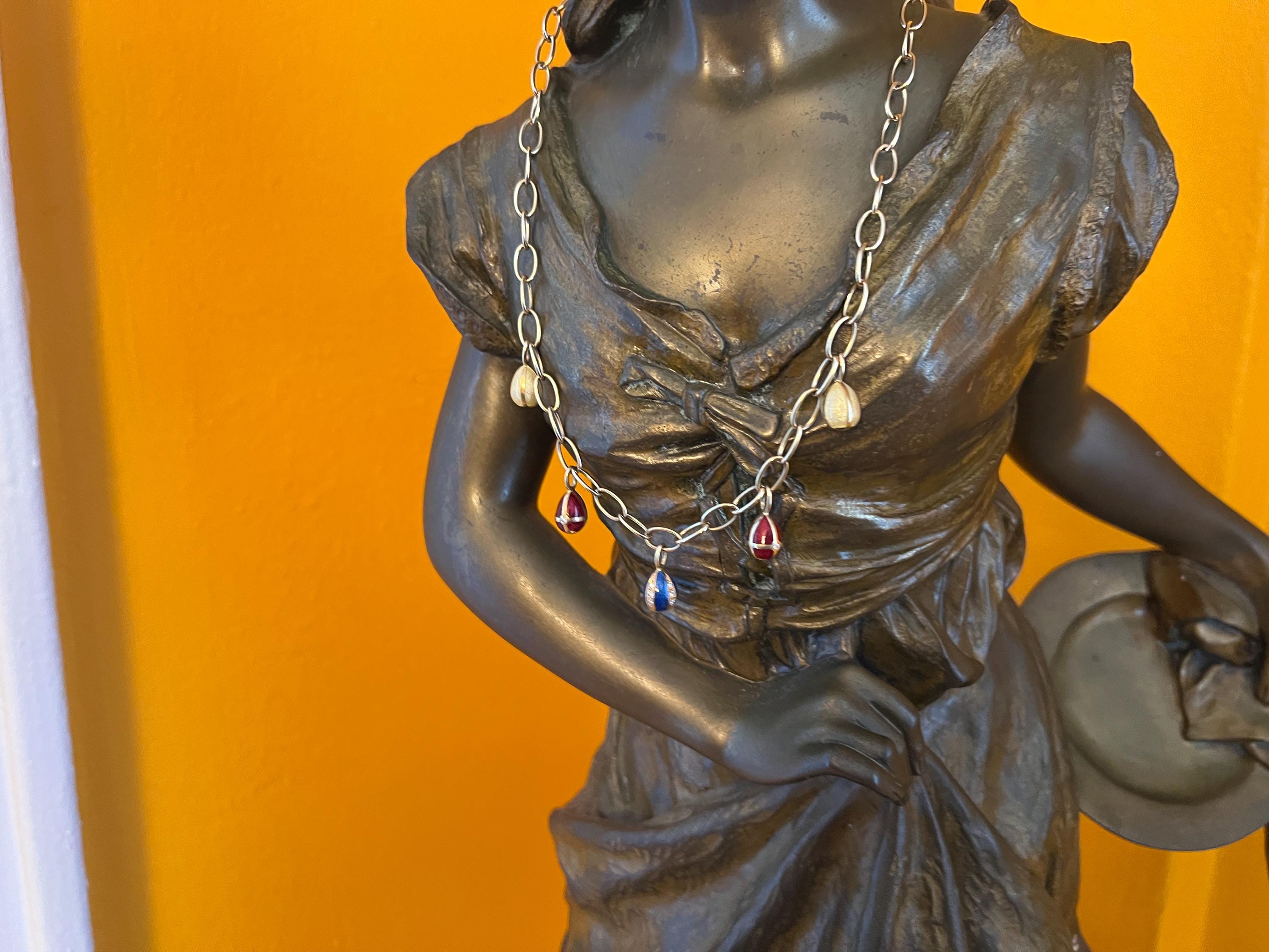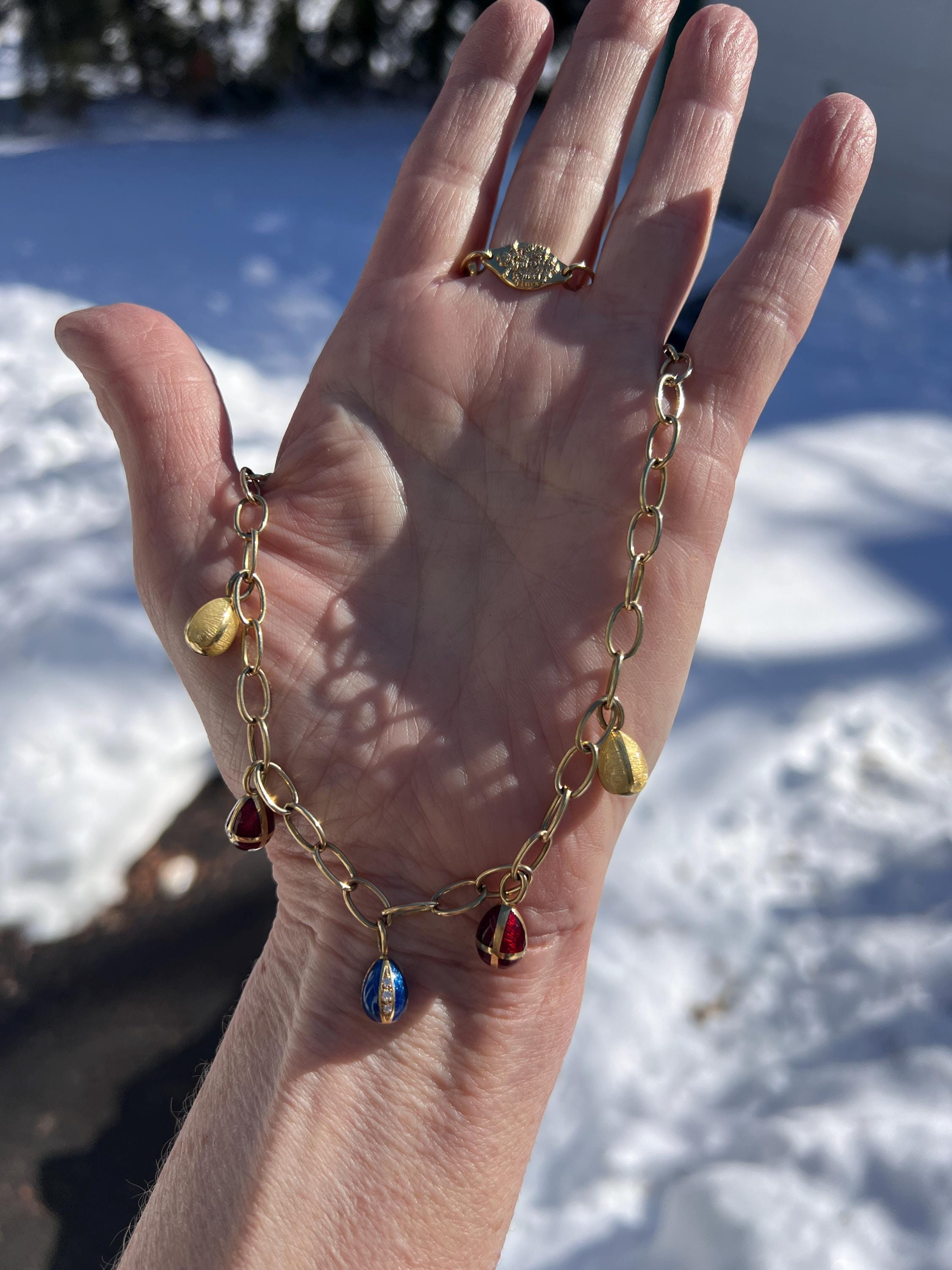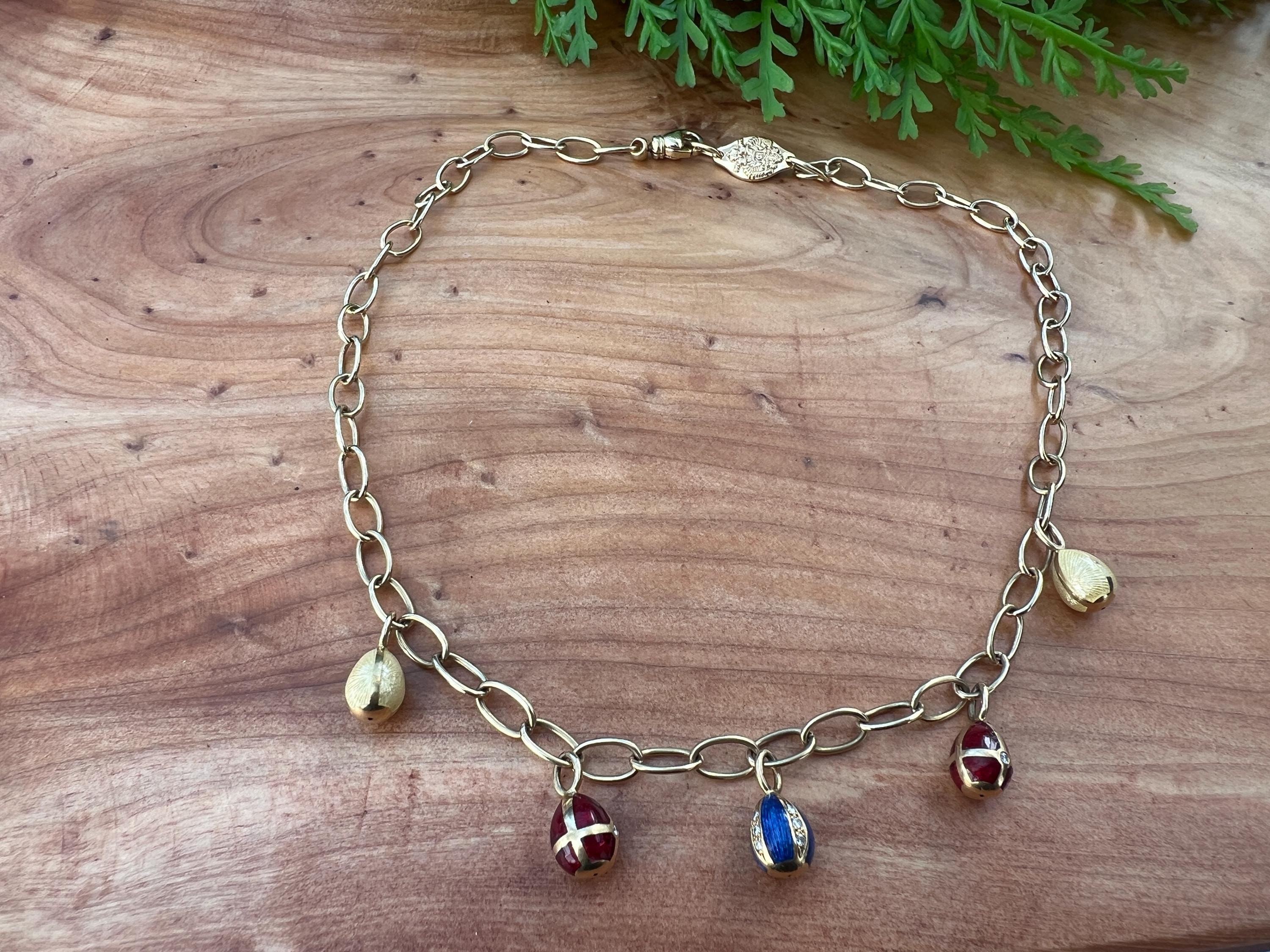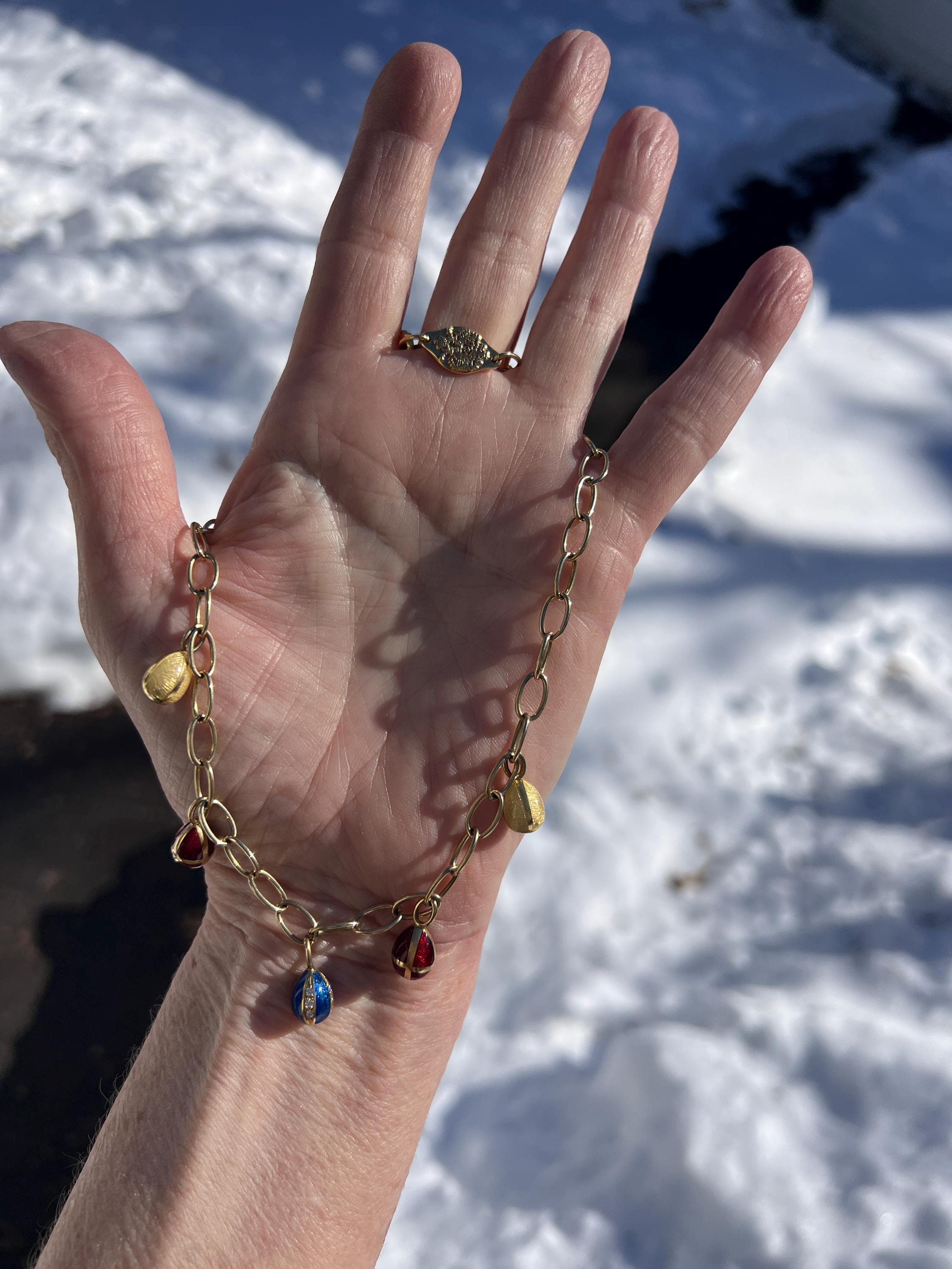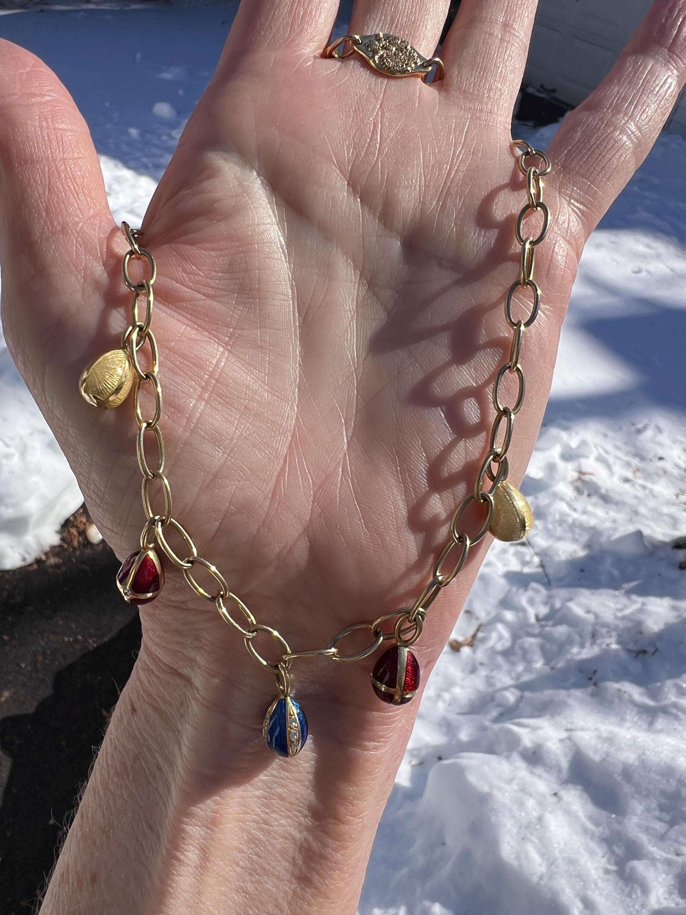 Radiating elegance, this striking vintage Faberge egg choker necklace is made in 18k yellow gold. This dramatic piece dates from the 1960’s. The spectacular decorated and vibrant enamel colored eggs fall like colorful fringe and join together to create a magnificent shaped necklace for a glamorous contrast. They are suspended from an oval link chain creating a strong and eye catching look. The necklace measures 16” long. It is 3/16" wide. The eggs including the bale measure 5/8" x 1/4'. It weighs 29.29 grams. It is marked 18k , Germany, 37 and Faberge.