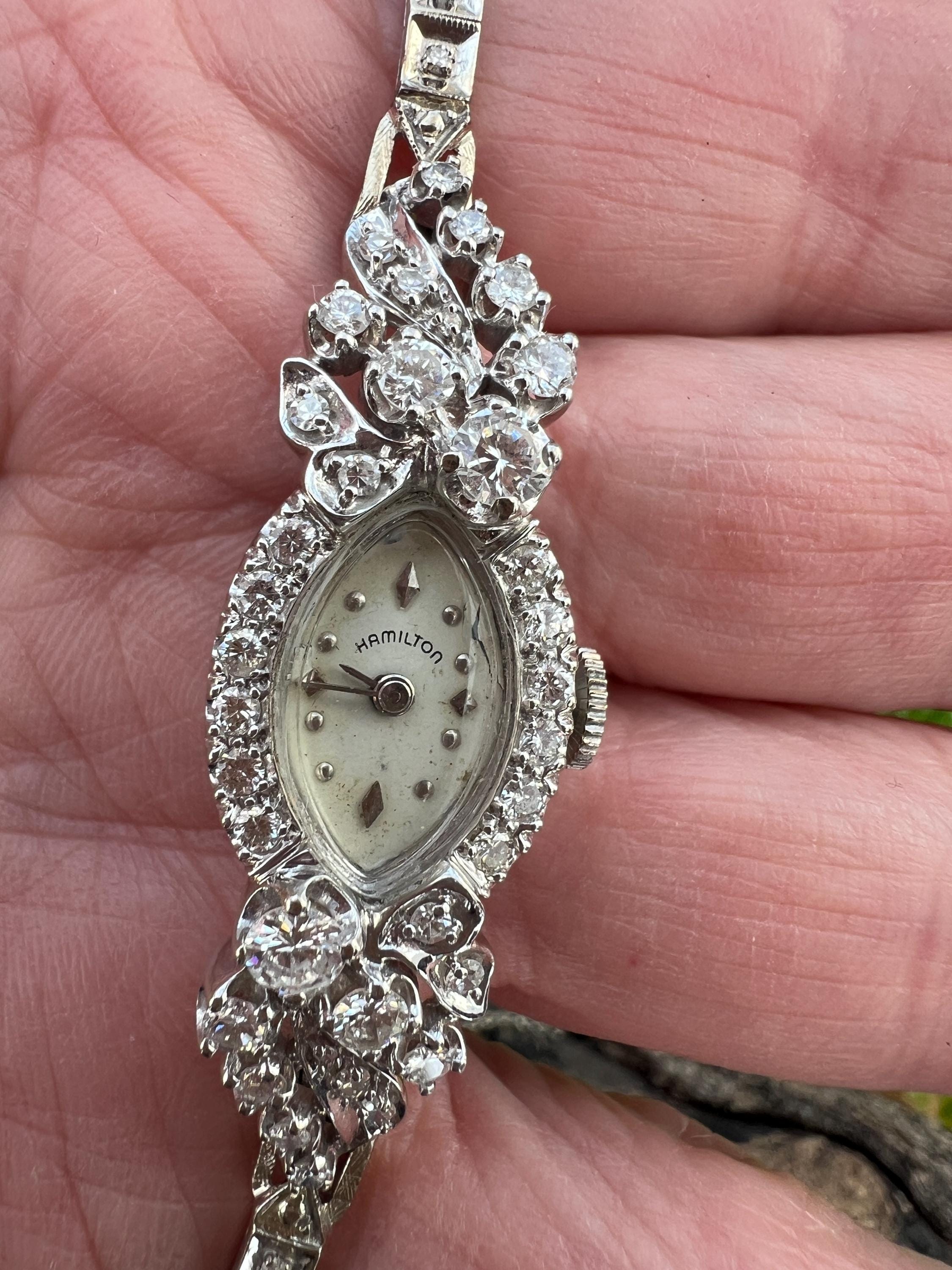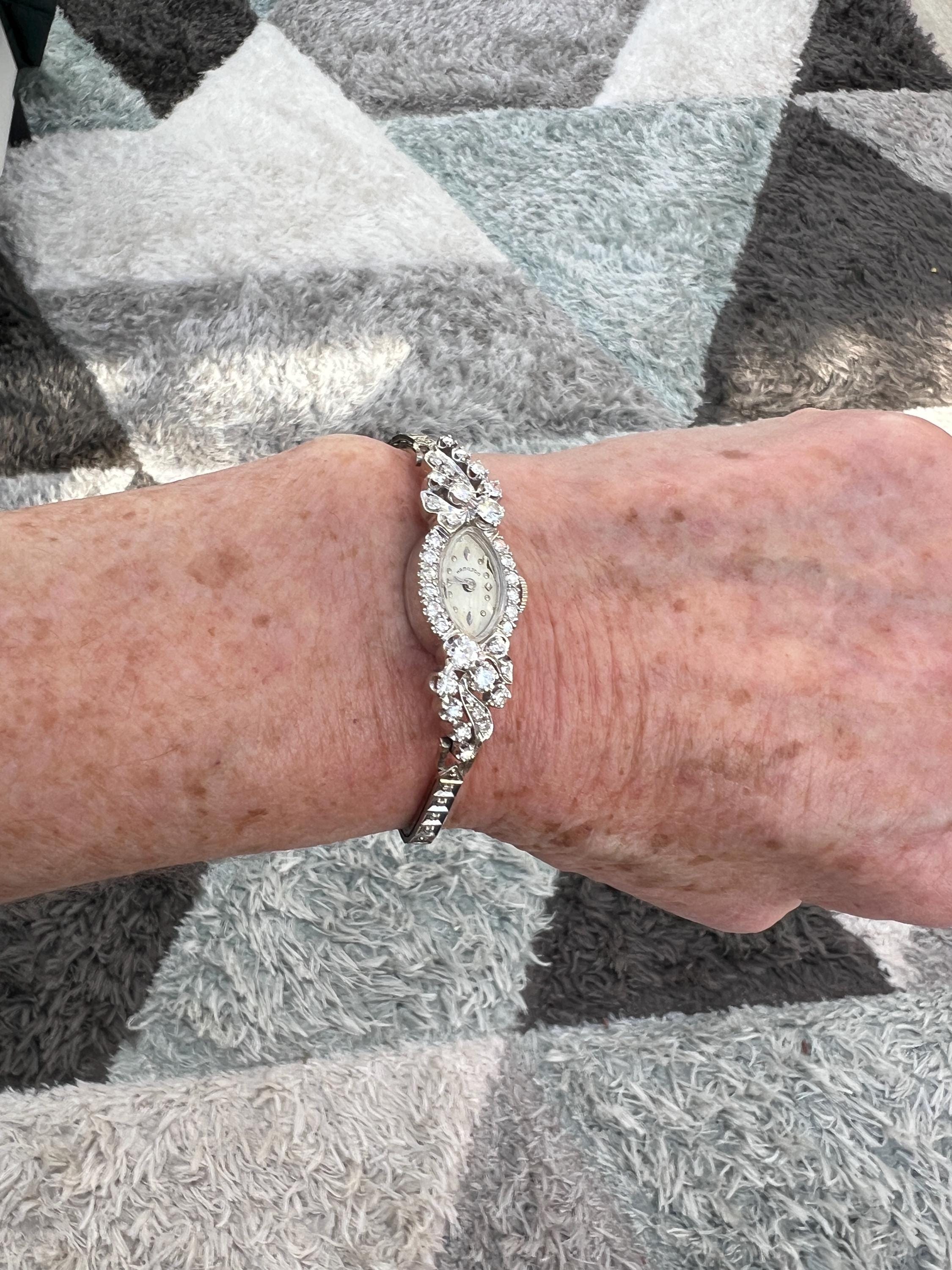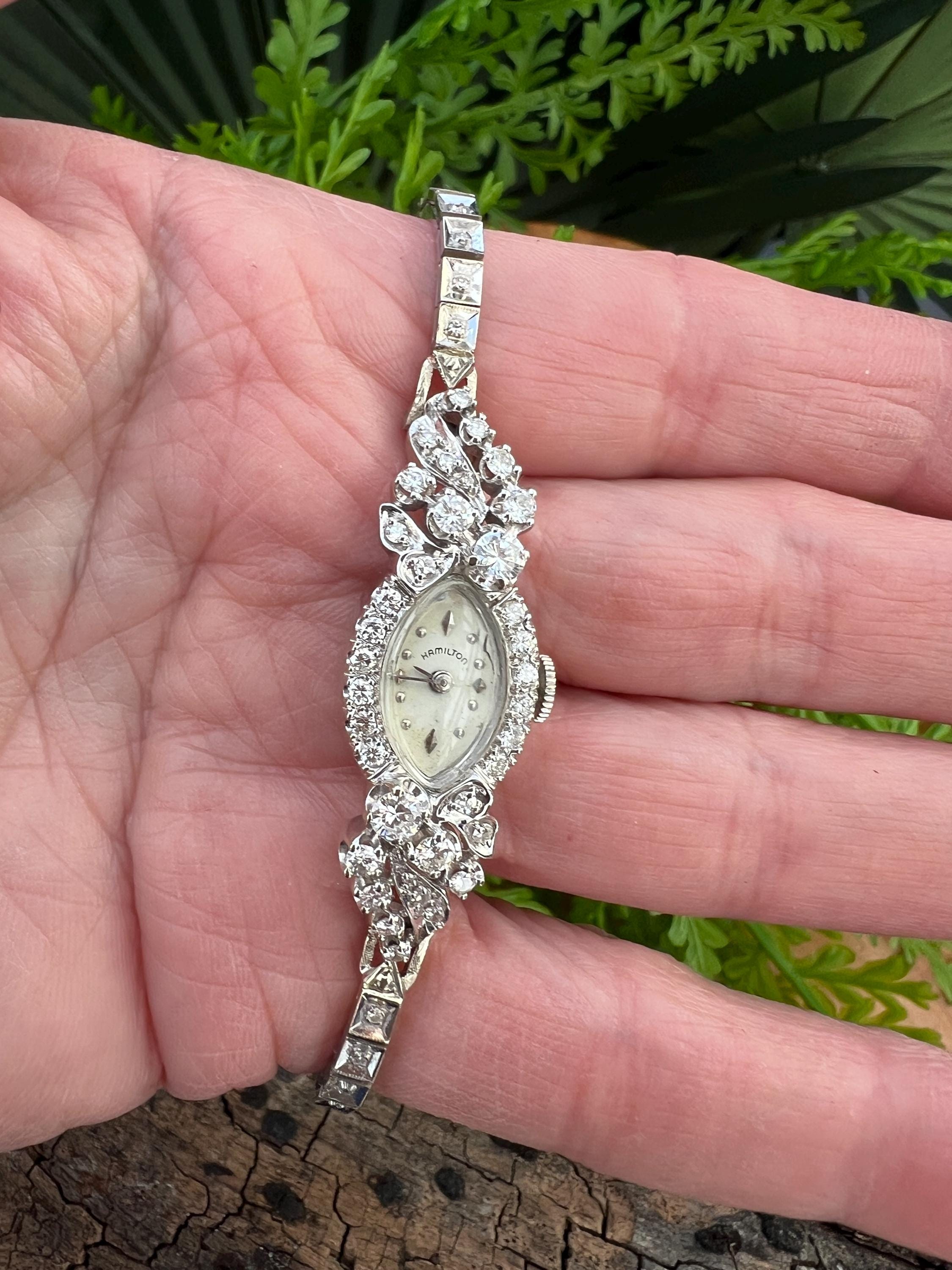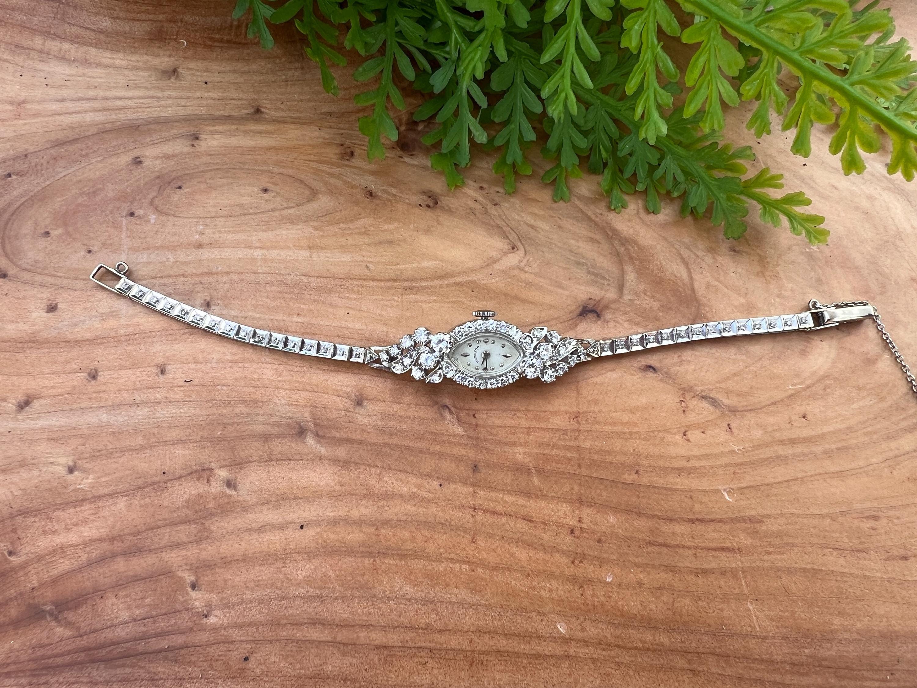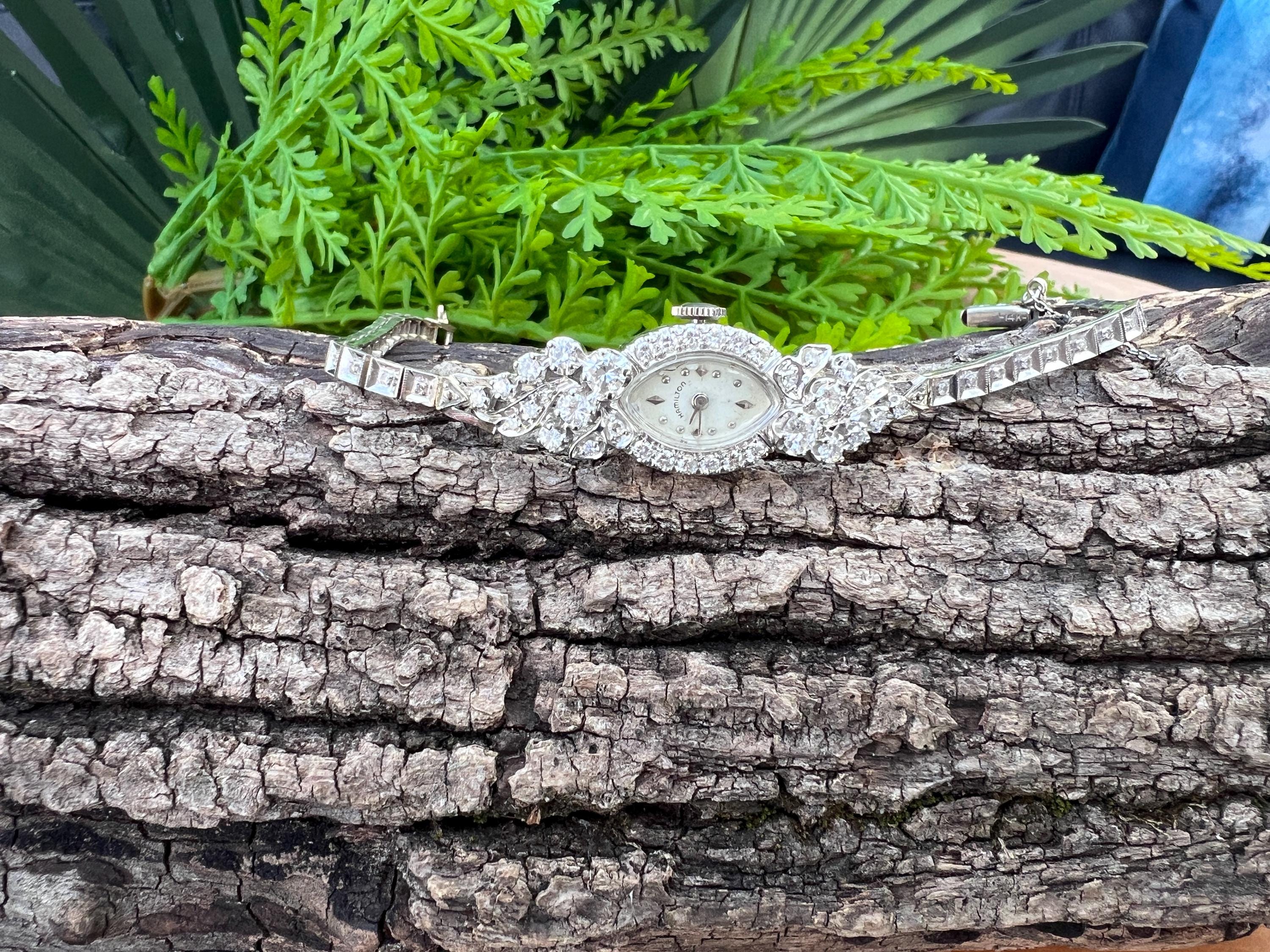 This sizzling 1950s diamond watch is set in 14k white gold. Its 17 jewel movement is mounted into an oval face. The entire watch is barraged with round diamonds. The face is enhanced by a gorgeous diamond band. An impassioned and ornate diamond watch made up of gleaming luminescence. The diamonds have a total approx. weight of 2.00 cts. The diamonds are G/H color and VS2 clarity. A stunning timepiece. The watch is made by Hamilton. The watch measure 6 7/8”. The face is 3/4" x 1/2". The band is 1/8" wide. The watch weighs 18.21 grams. It is marked 14k. It is made by Hamilton.