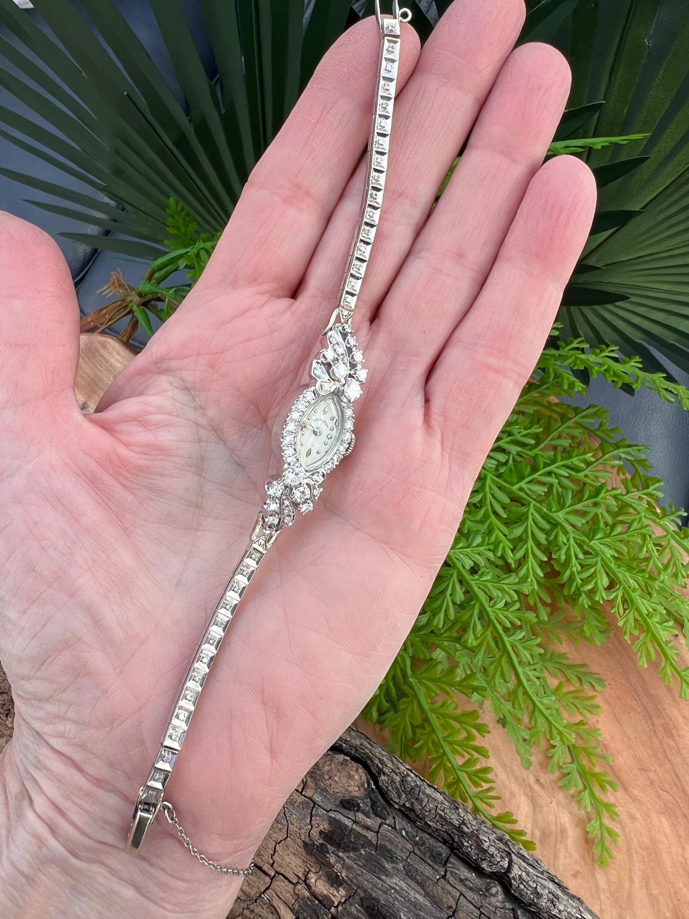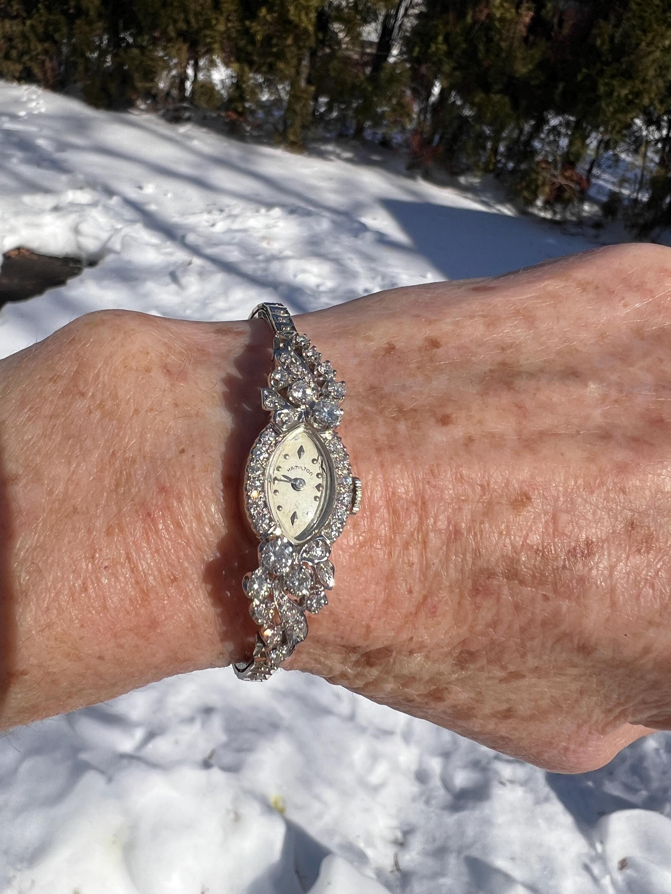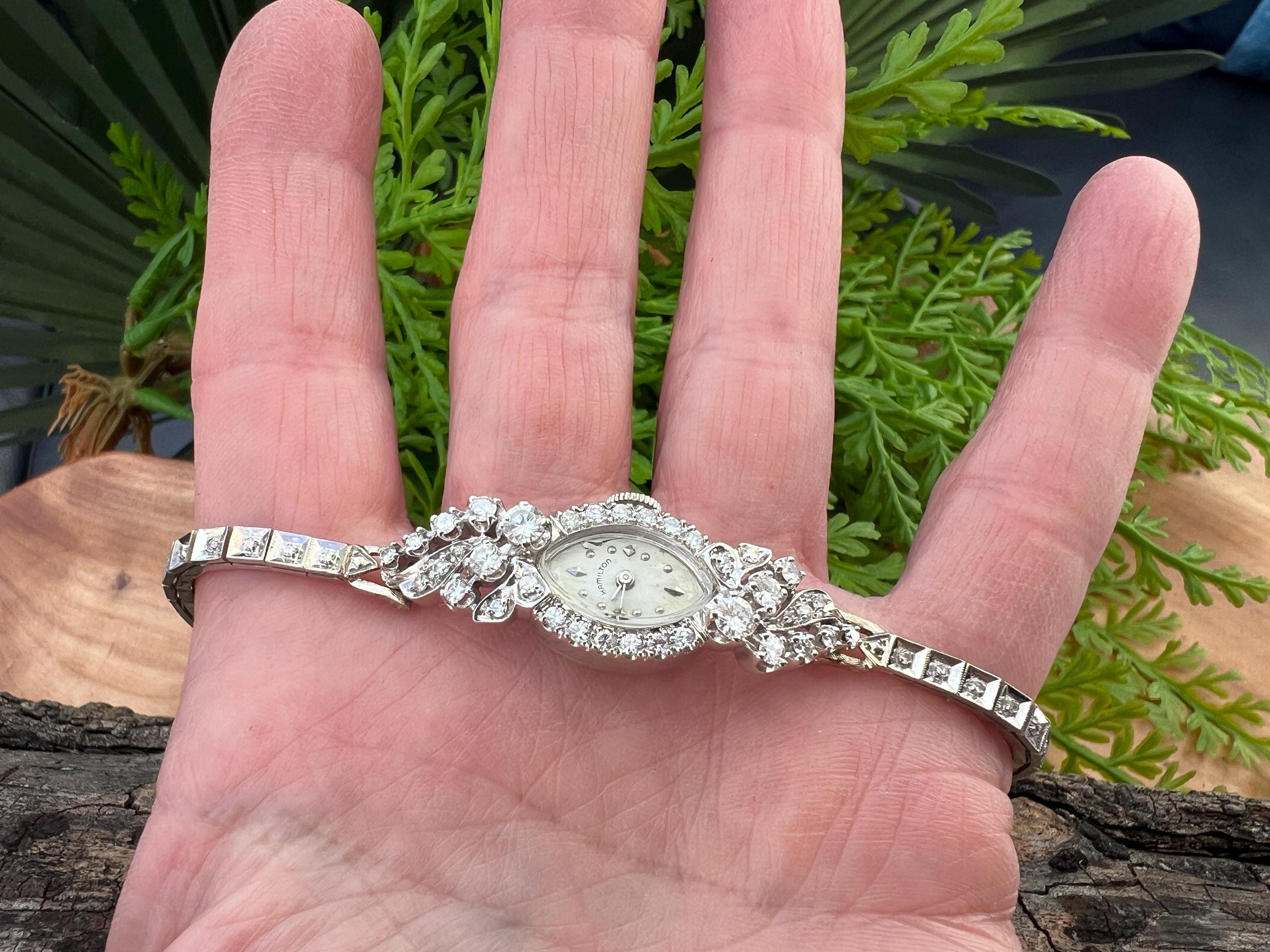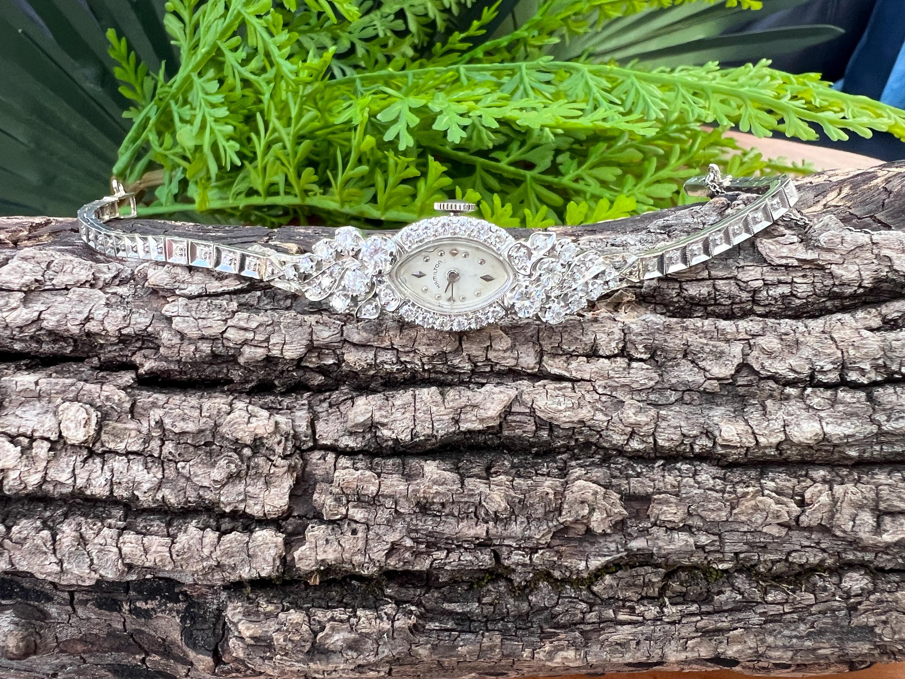 This sizzling 1950s diamond watch is set in 14k white gold. Its 17 jewel movement is mounted into an oval face. The entire watch is barraged with round diamonds. The face is enhanced by a gorgeous diamond band. An impassioned and ornate diamond watch made up of gleaming luminescence. The diamonds have a total approx. weight of 2.00 cts. The diamonds are G/H color and VS2 clarity. A stunning timepiece. The watch is made by Hamilton. The watch measure 6 7/8”. The face is 3/4" x 1/2". The band is 1/8" wide. The watch weighs 18.21 grams. It is marked 14k. It is made by Hamilton.