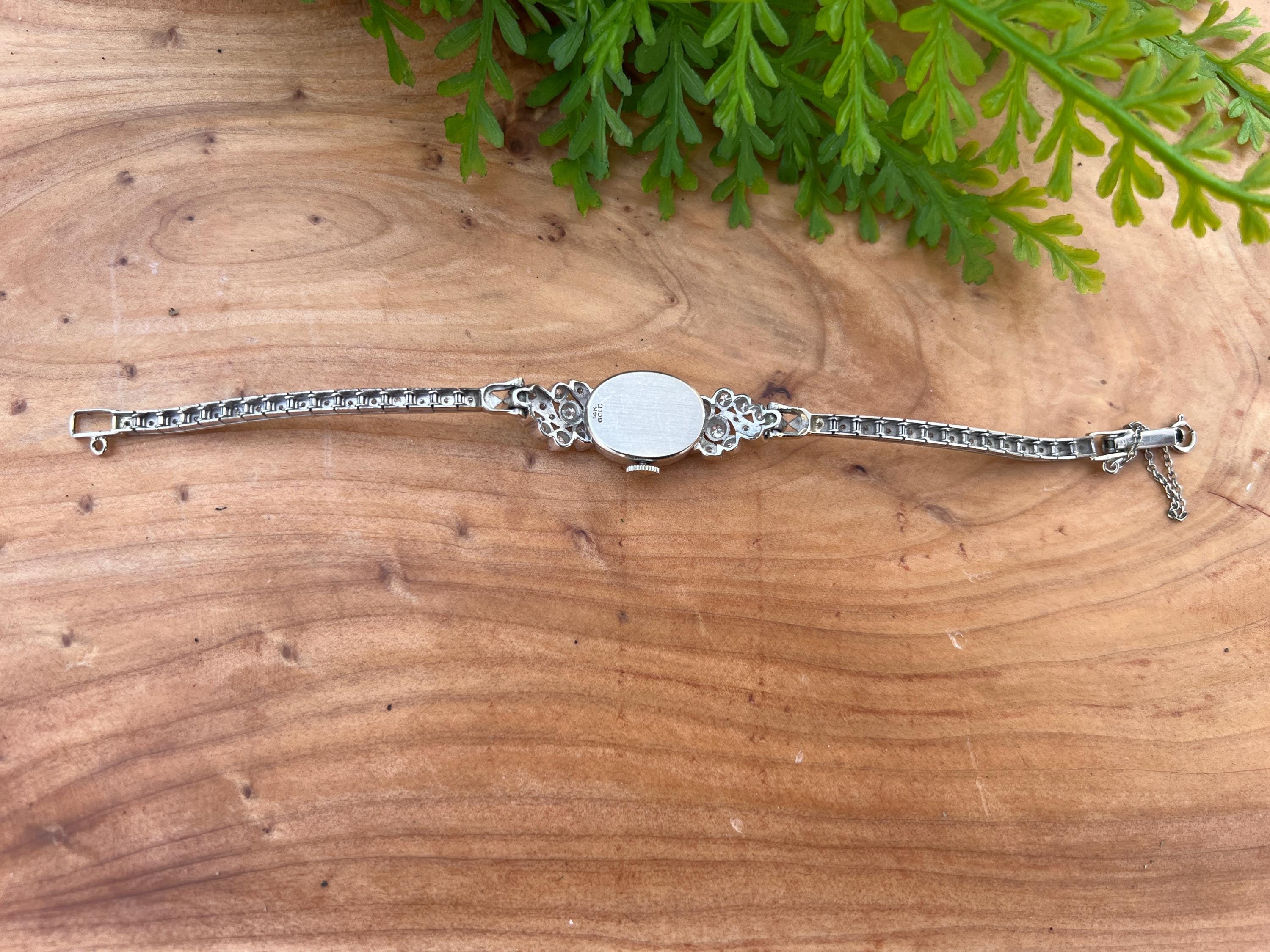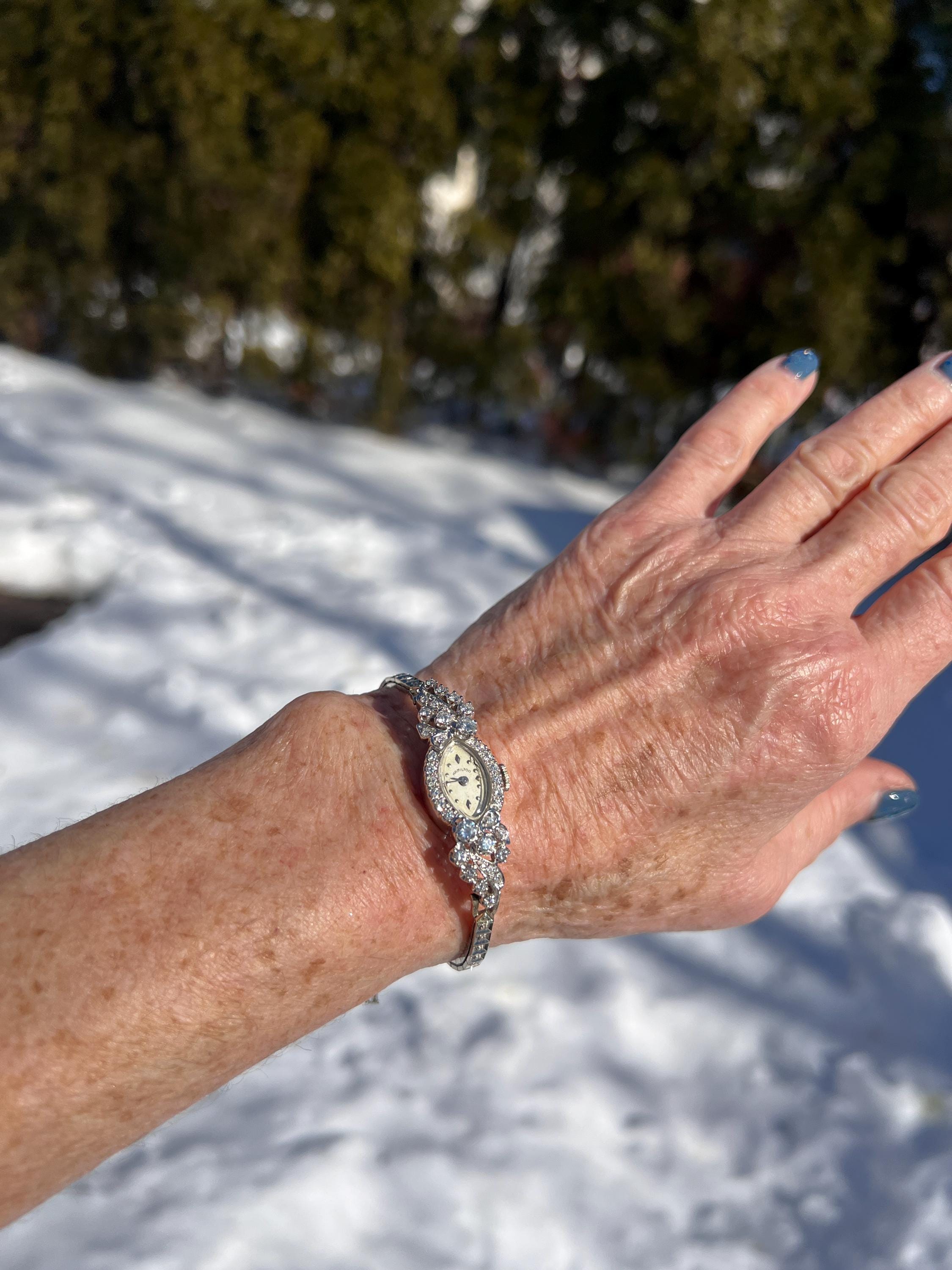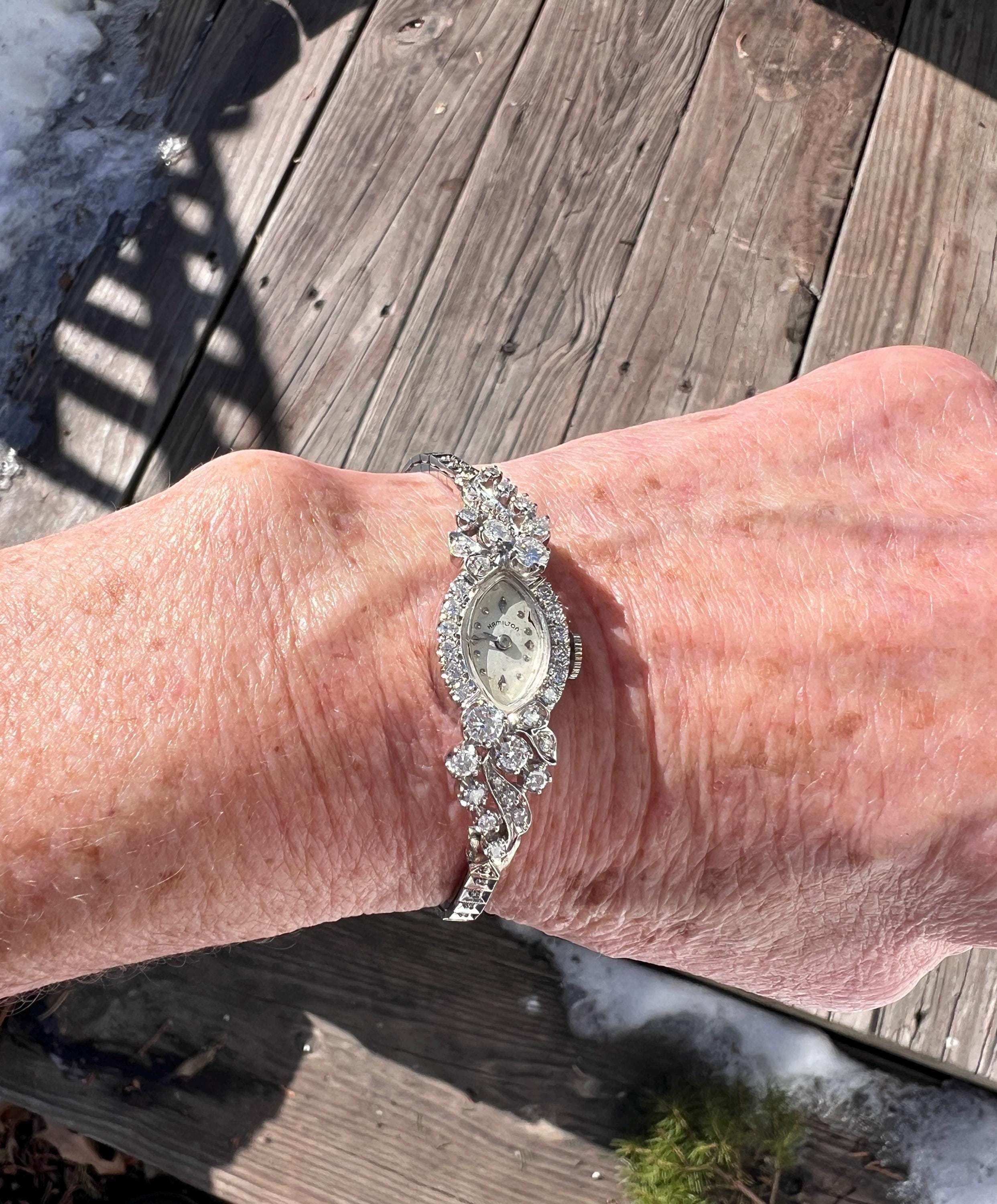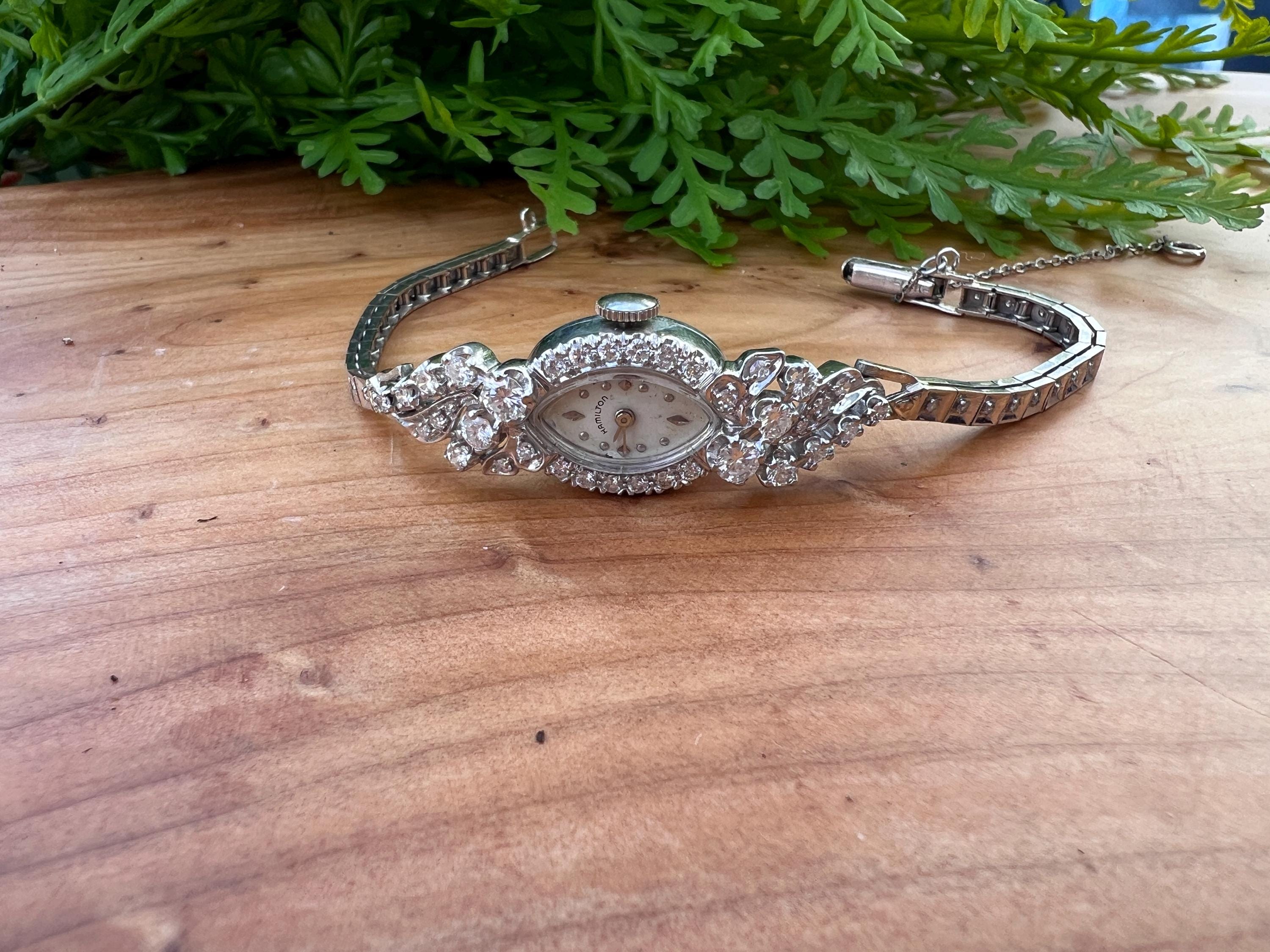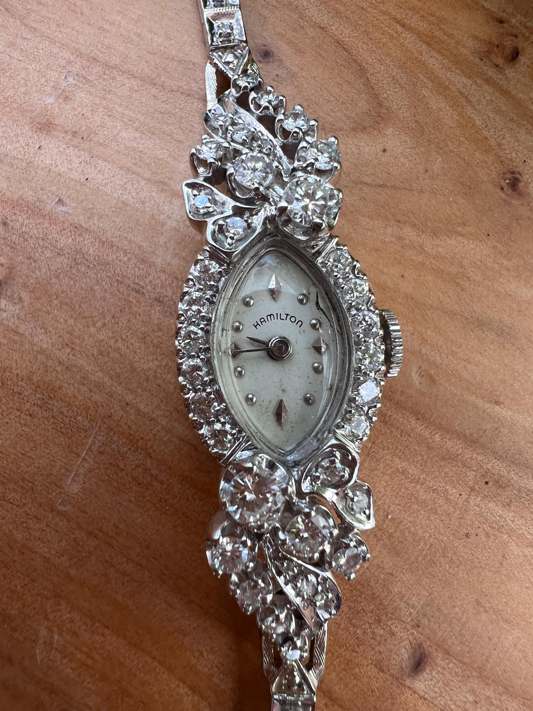 This sizzling 1950s diamond watch is set in 14k white gold. Its 17 jewel movement is mounted into an oval face. The entire watch is barraged with round diamonds. The face is enhanced by a gorgeous diamond band. An impassioned and ornate diamond watch made up of gleaming luminescence. The diamonds have a total approx. weight of 2.00 cts. The diamonds are G/H color and VS2 clarity. A stunning timepiece. The watch is made by Hamilton. The watch measure 6 7/8”. The face is 3/4" x 1/2". The band is 1/8" wide. The watch weighs 18.21 grams. It is marked 14k. It is made by Hamilton.