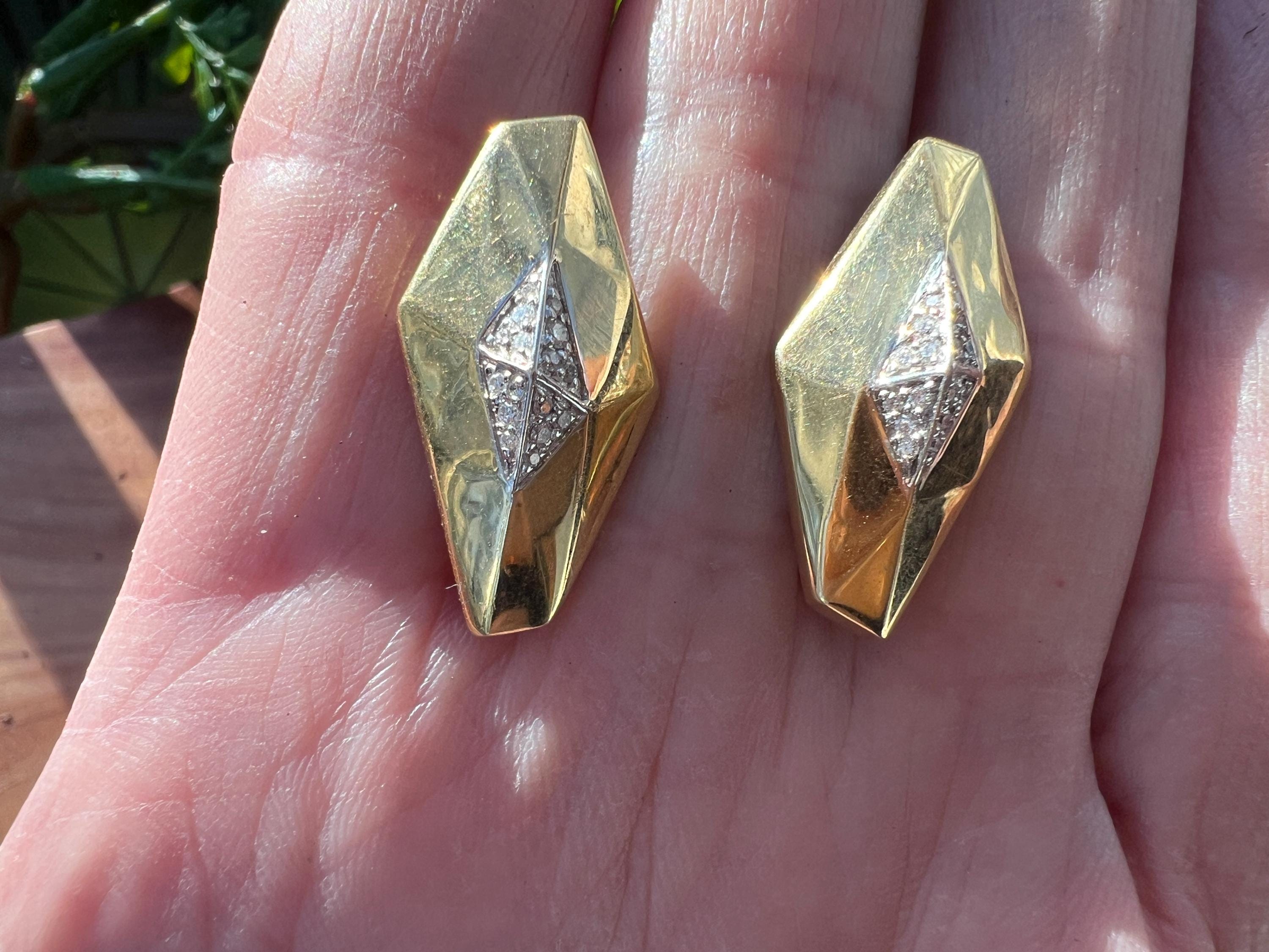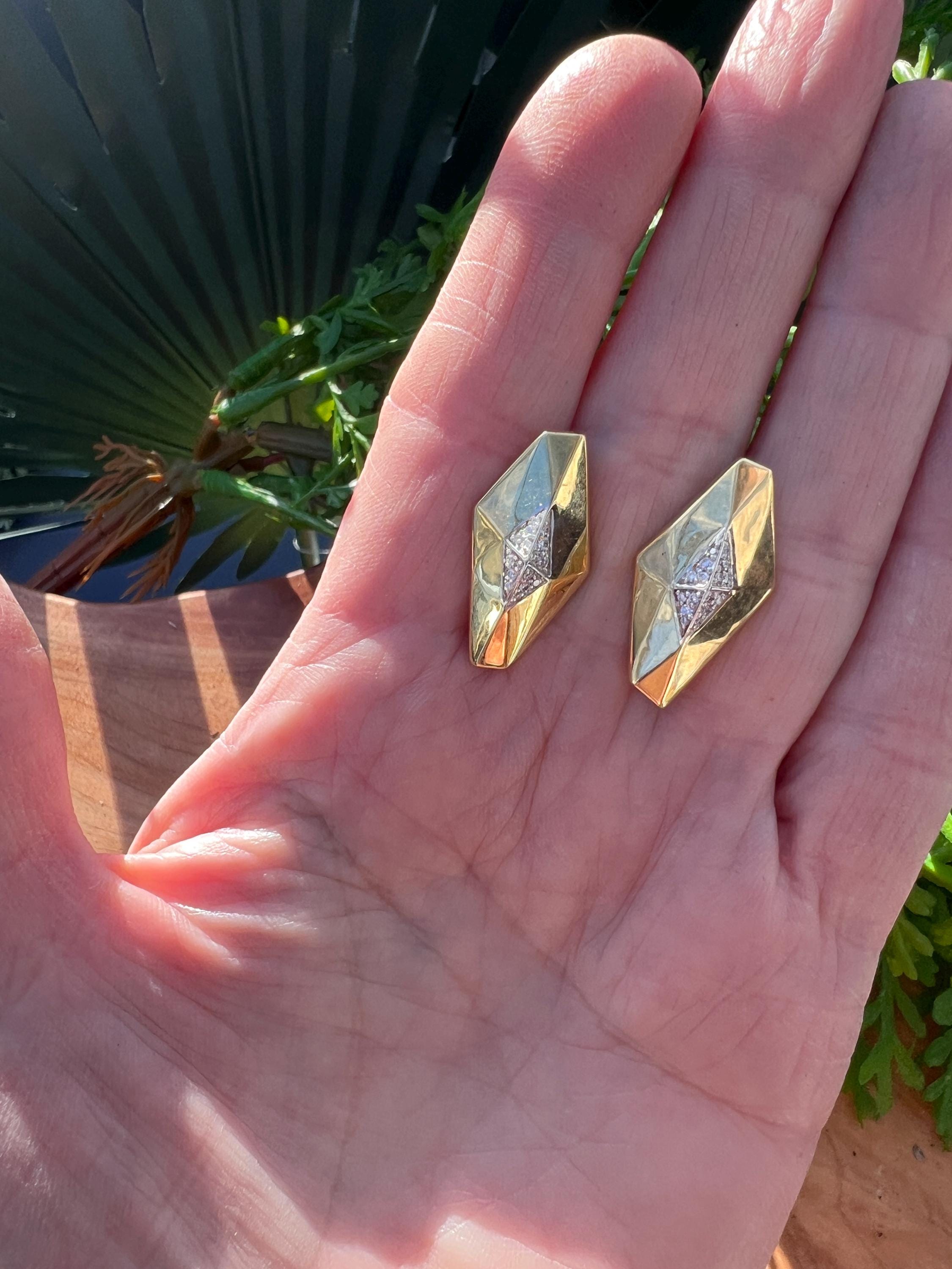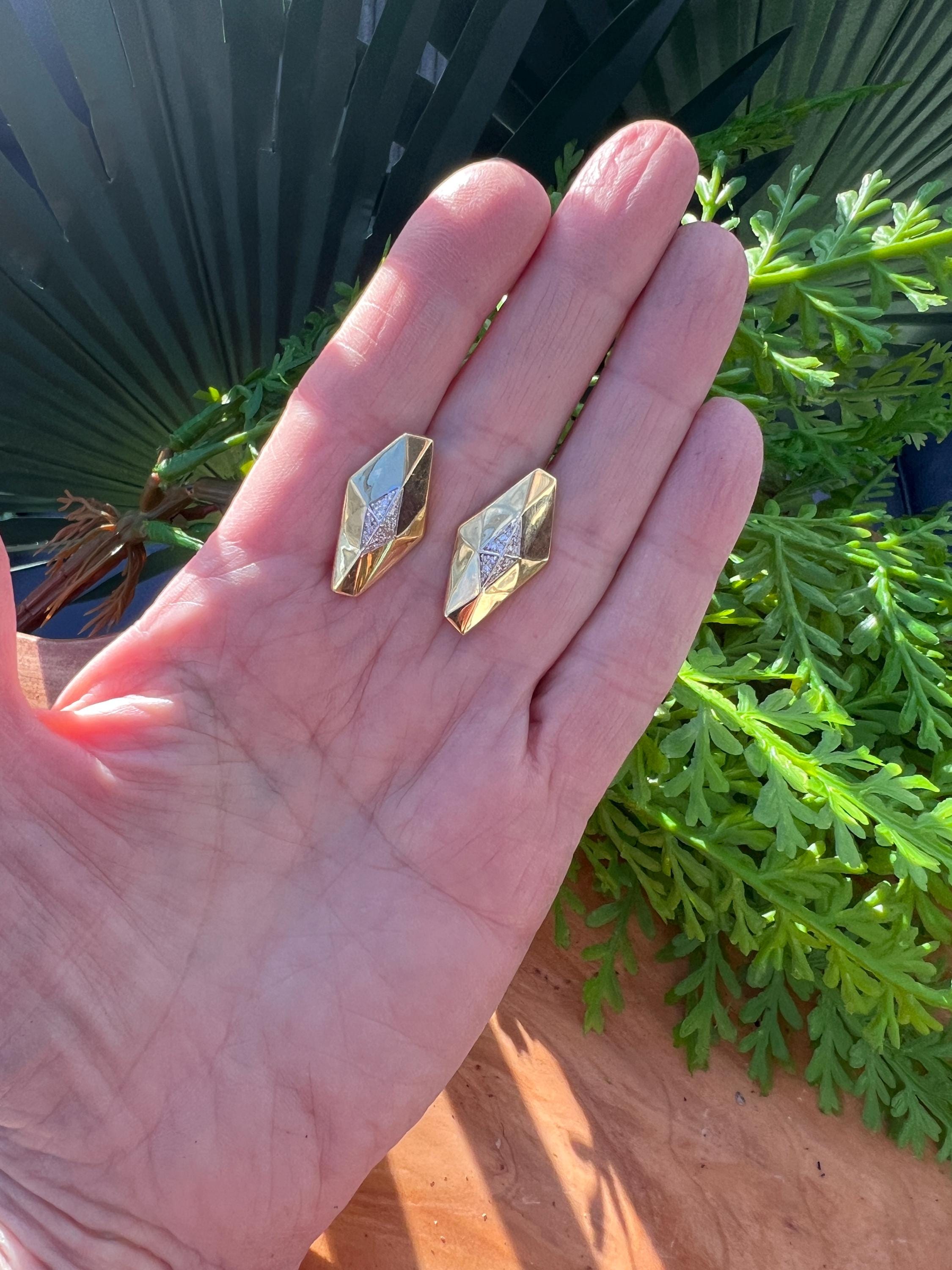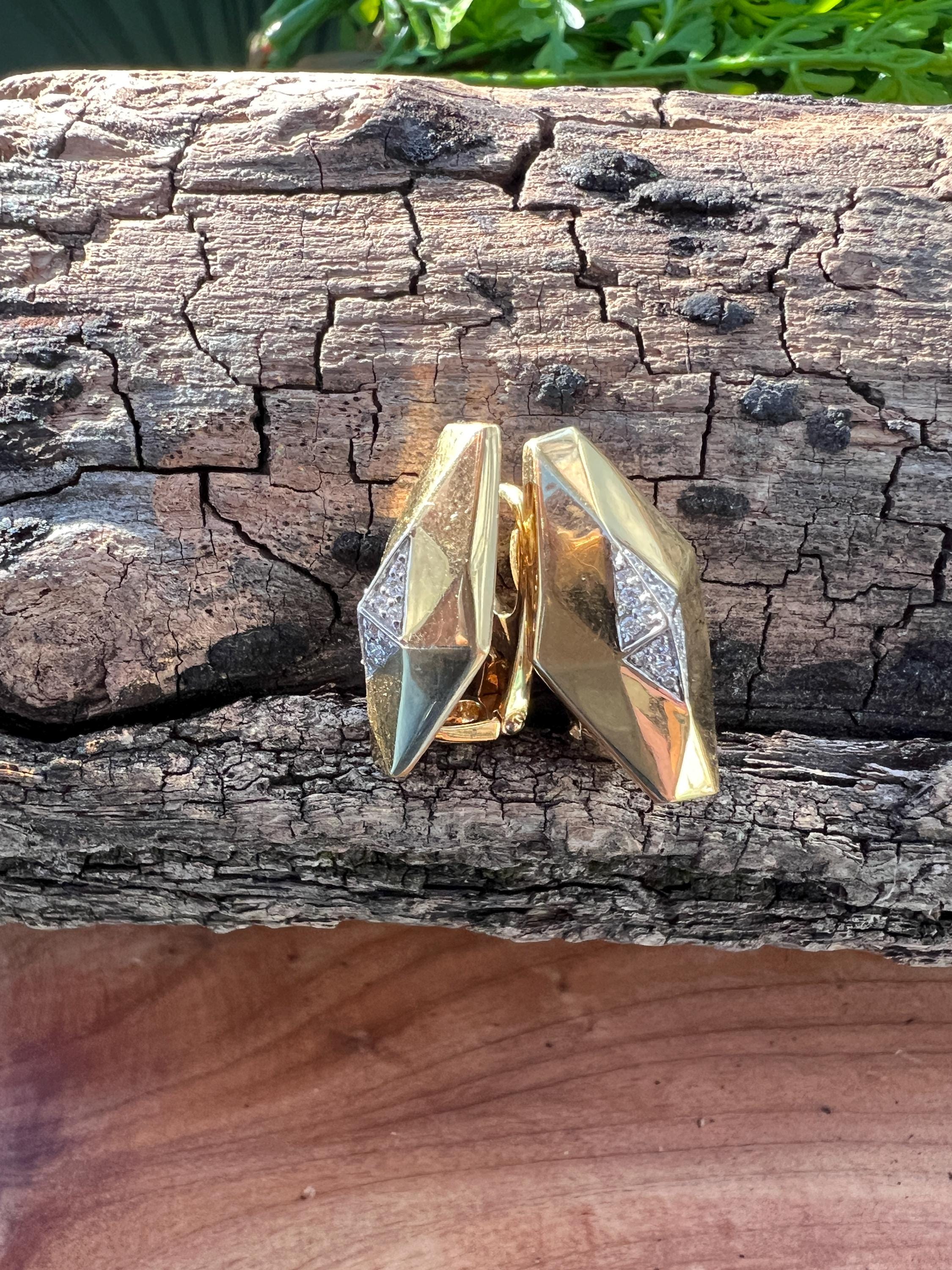 These vintage diamond cluster earrings are set in 18k yellow gold. They date from the 1980’s. The sophisticated slightly curved diamond shaped earrings are beautifully sculpted to the ear. The beautiful swerved polished gold cluster earrings are encrusted with dazzling round diamonds in the center of the earring. The total weight of the diamonds are .25. ct. The diamonds are F color and VS2 clarity. An earring structuring a stream of stunning sparkle. They measure 1” long x 1/2” wide. They weigh 12.62 grams. They are made for non pierced ears, but can easily be converted into pierced. They are marked 18k. They are designed by Roberto Coin.