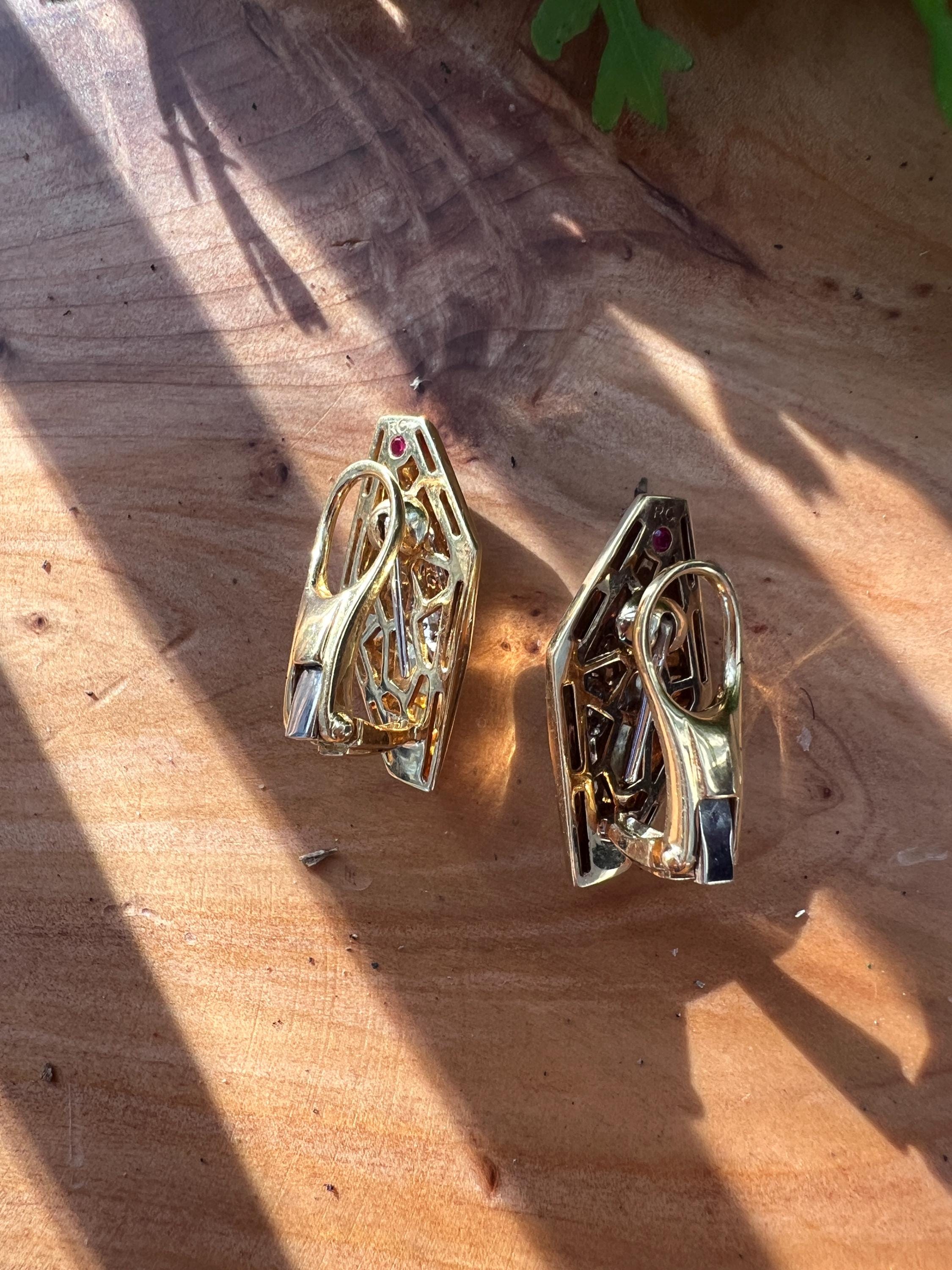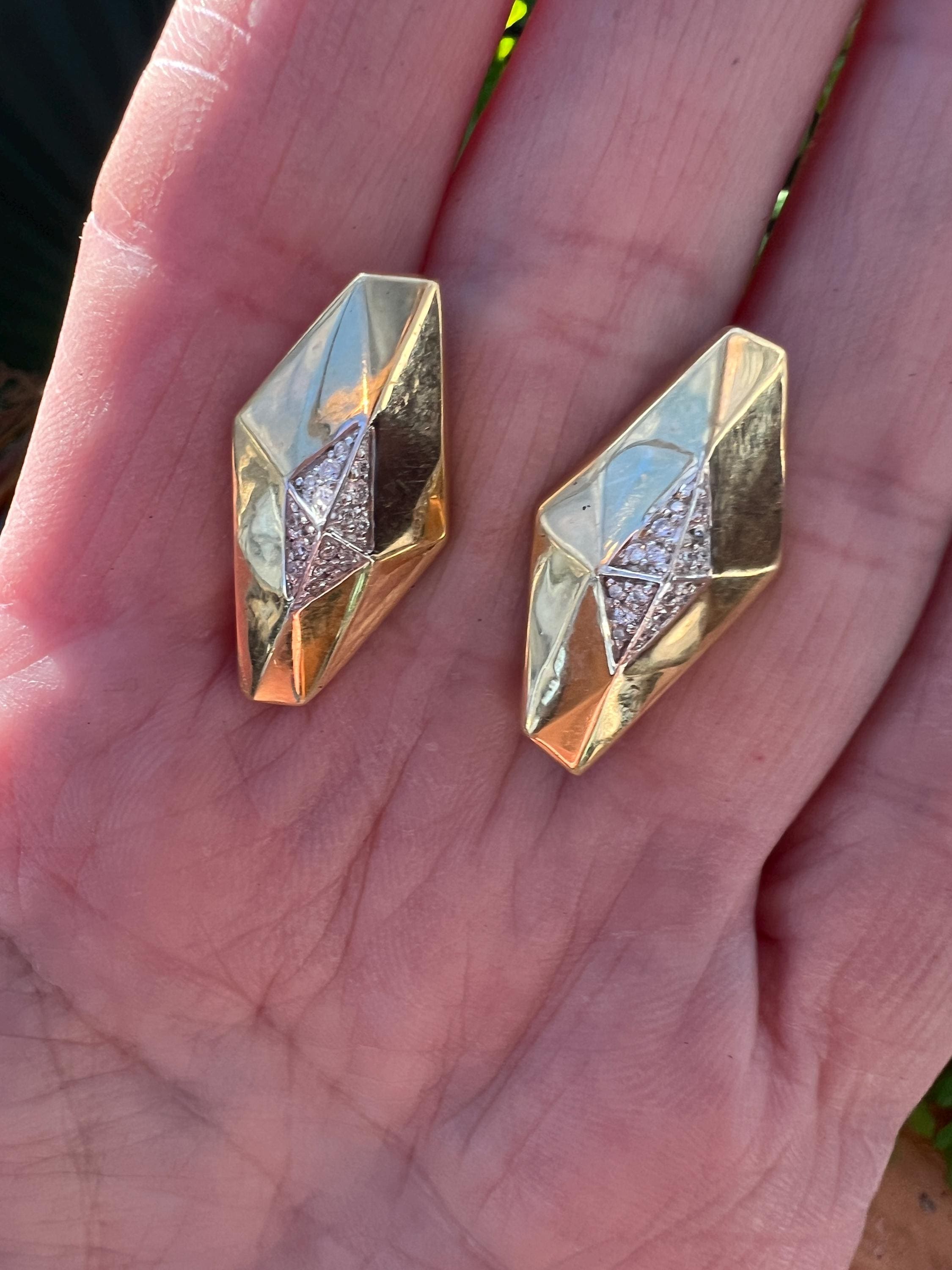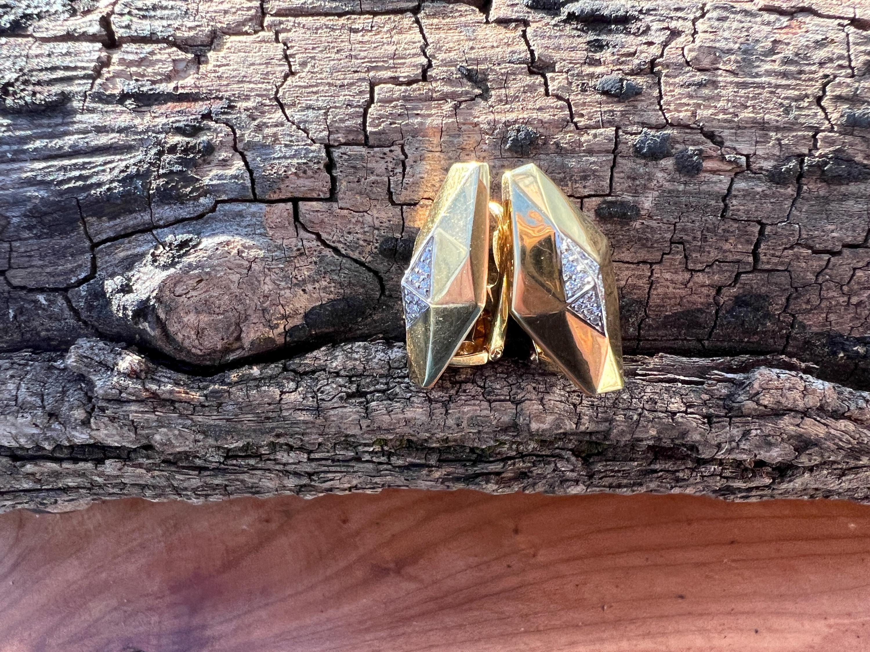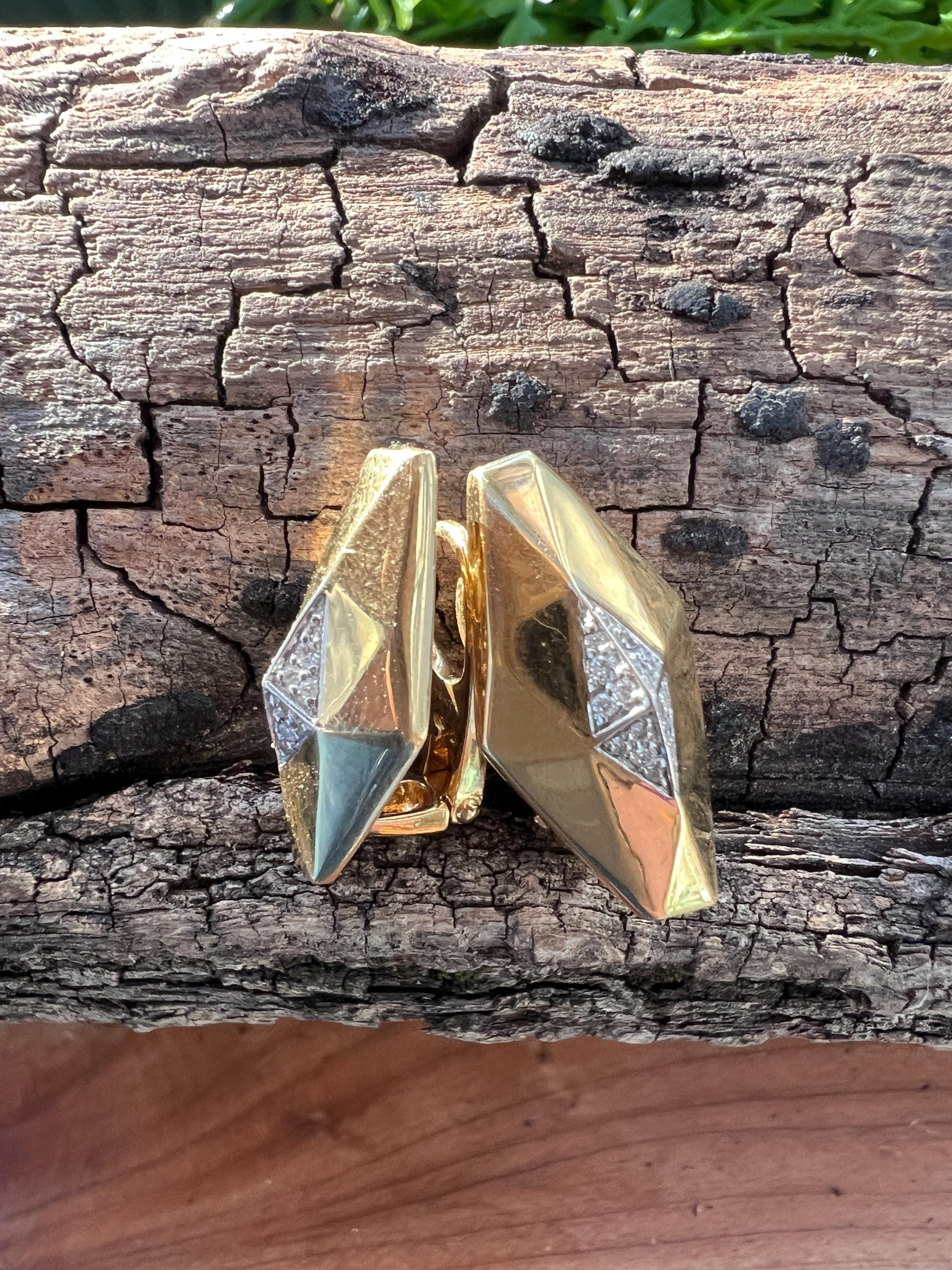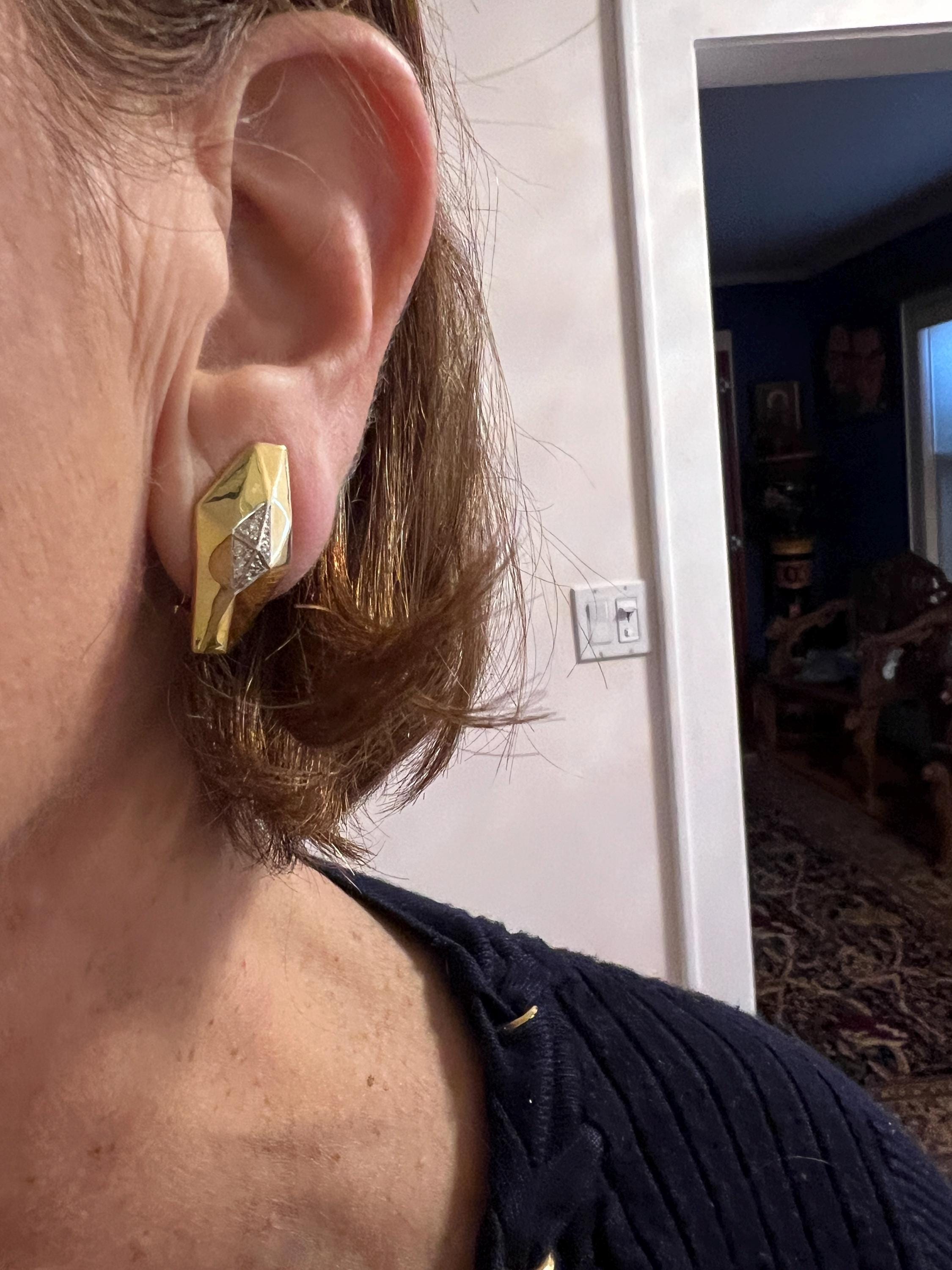 These vintage diamond cluster earrings are set in 18k yellow gold. They date from the 1980’s. The sophisticated slightly curved diamond shaped earrings are beautifully sculpted to the ear. The beautiful swerved polished gold cluster earrings are encrusted with dazzling round diamonds in the center of the earring. The total weight of the diamonds are .25. ct. The diamonds are F color and VS2 clarity. An earring structuring a stream of stunning sparkle. They measure 1” long x 1/2” wide. They weigh 12.62 grams. They are made for non pierced ears, but can easily be converted into pierced. They are marked 18k. They are designed by Roberto Coin.