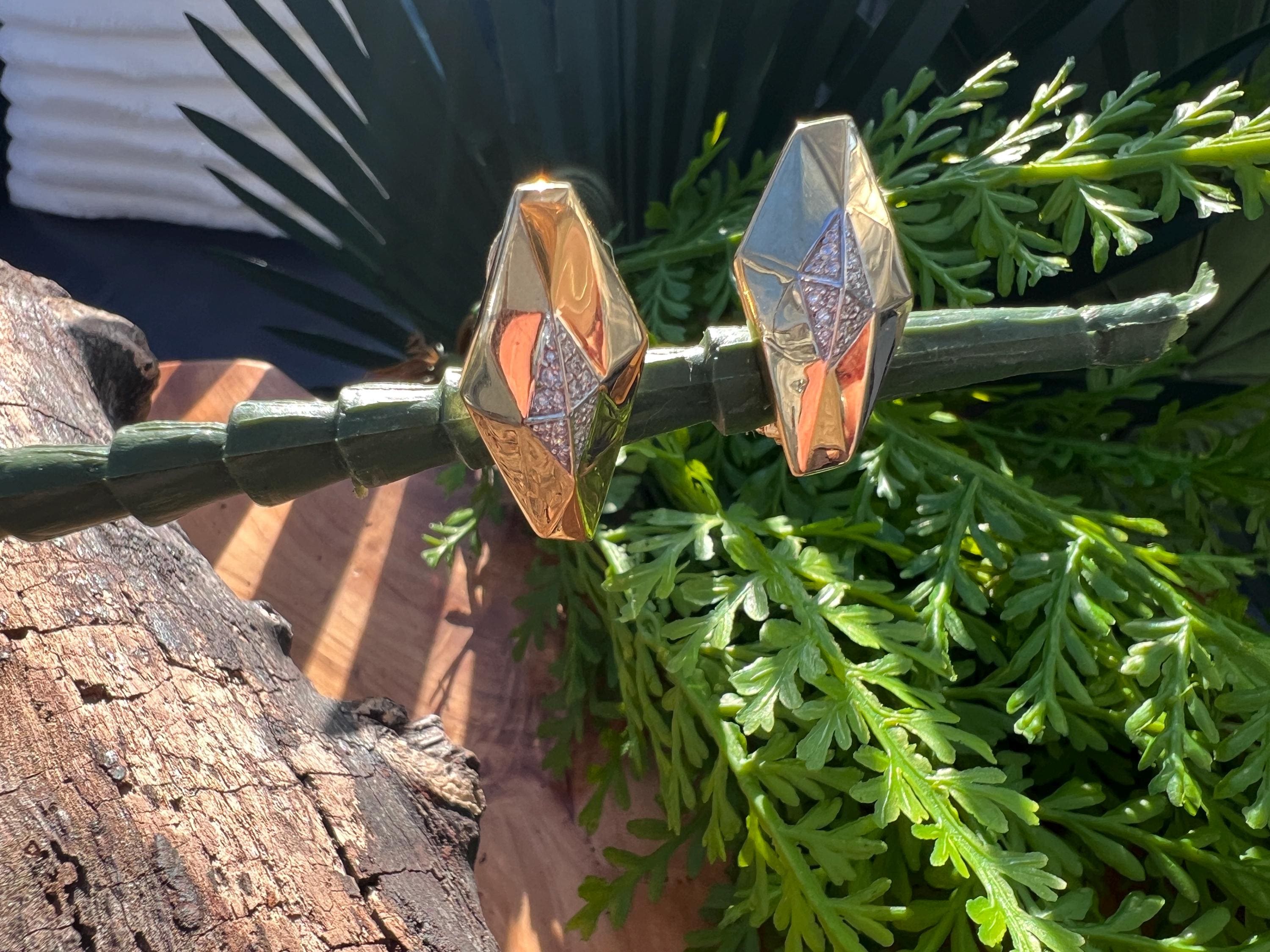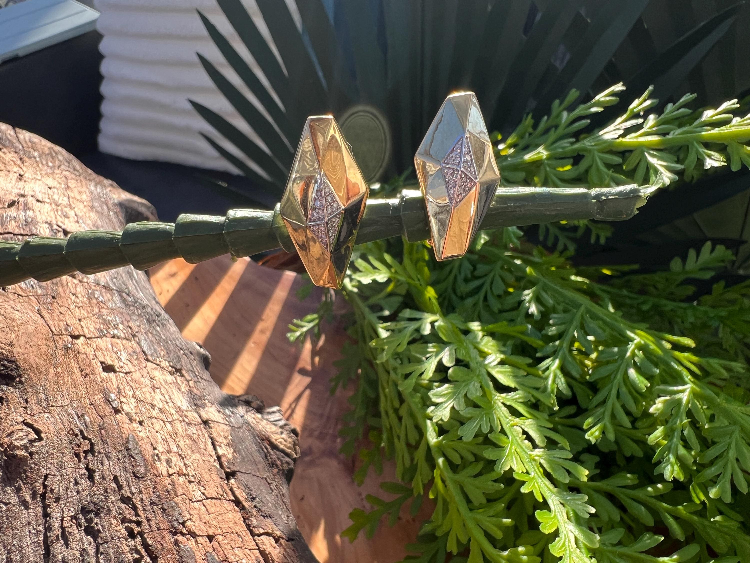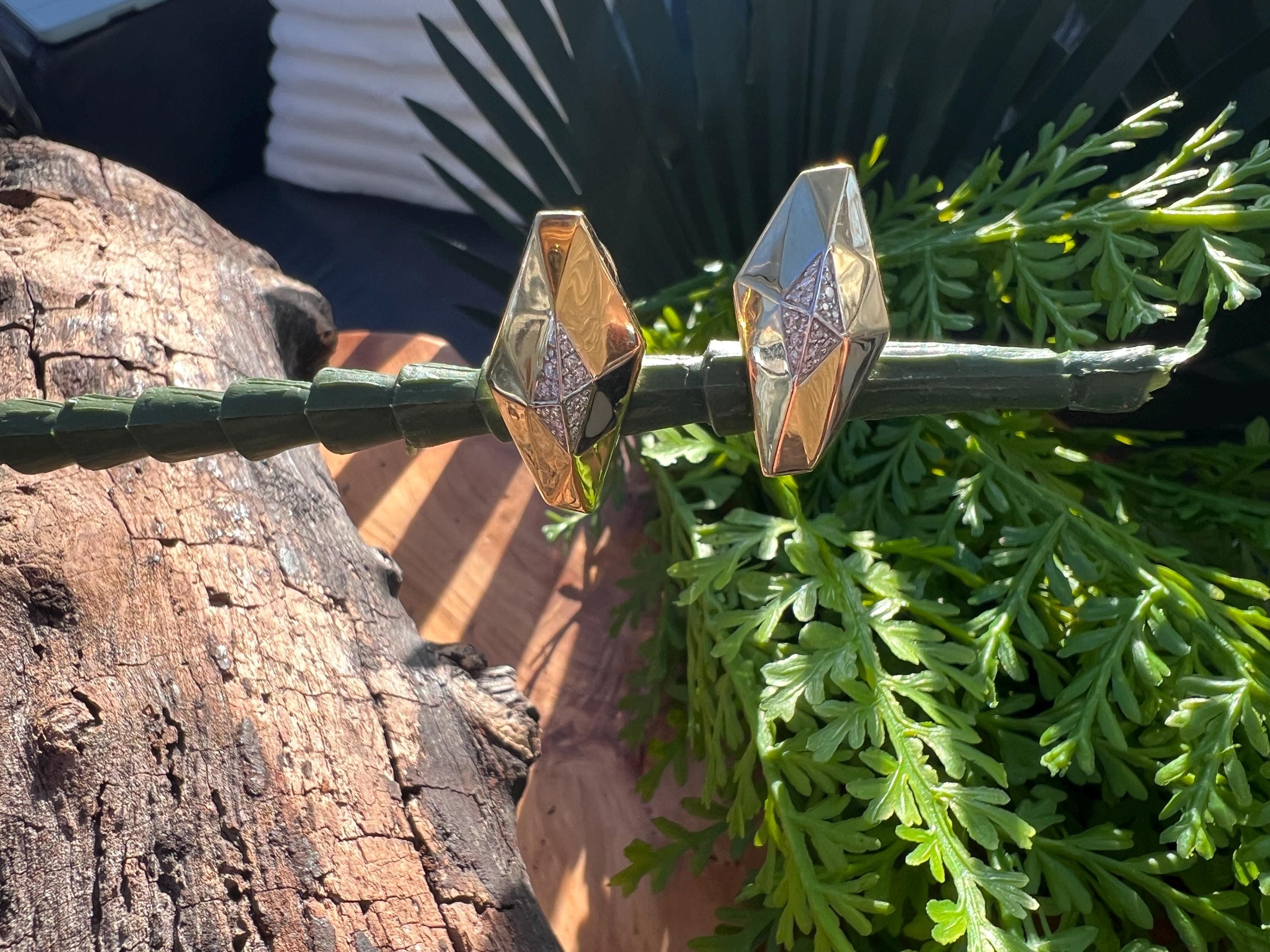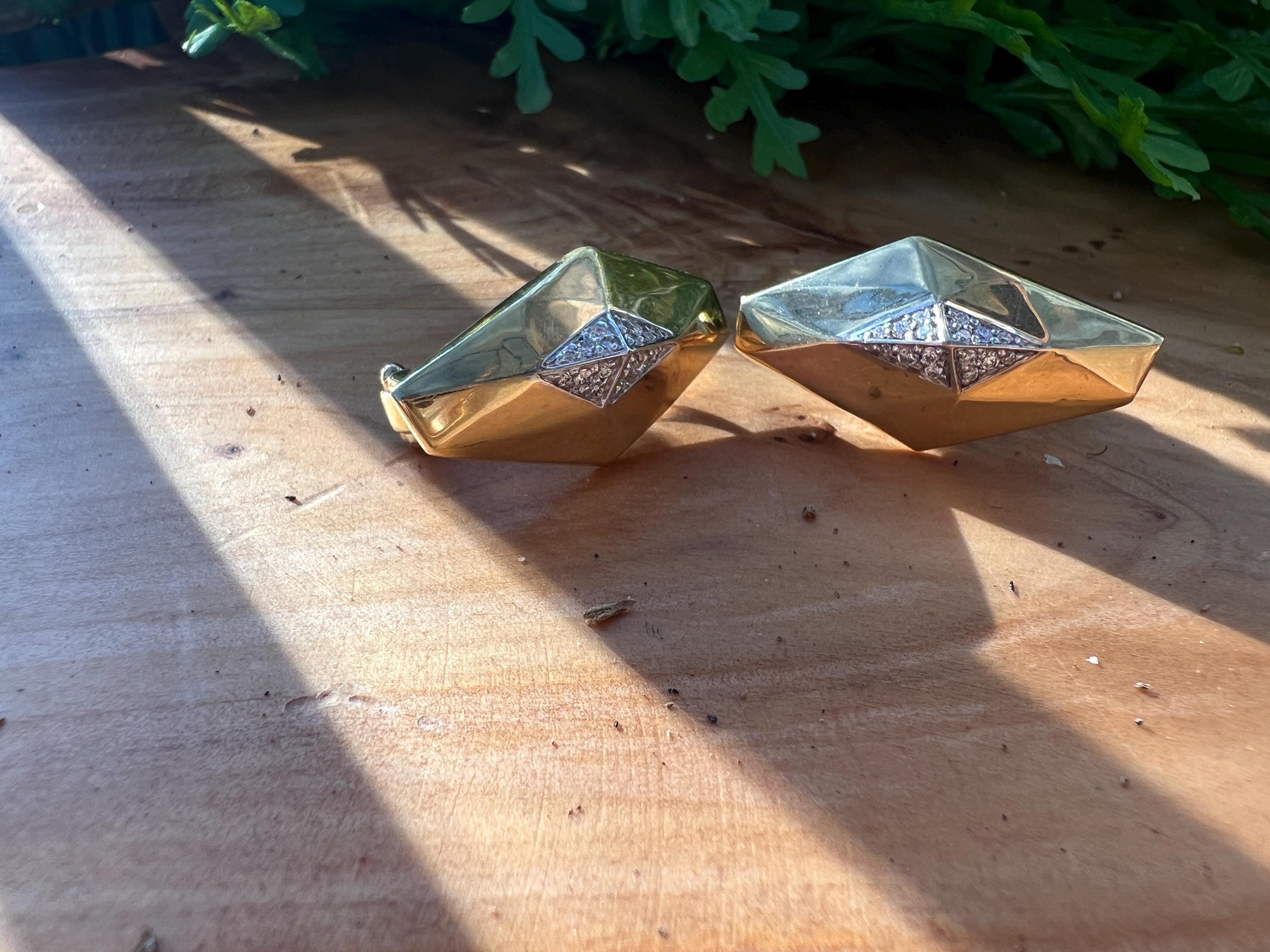 These vintage diamond cluster earrings are set in 18k yellow gold. They date from the 1980’s. The sophisticated slightly curved diamond shaped earrings are beautifully sculpted to the ear. The beautiful swerved polished gold cluster earrings are encrusted with dazzling round diamonds in the center of the earring. The total weight of the diamonds are .25. ct. The diamonds are F color and VS2 clarity. An earring structuring a stream of stunning sparkle. They measure 1” long x 1/2” wide. They weigh 12.62 grams. They are made for non pierced ears, but can easily be converted into pierced. They are marked 18k. They are designed by Roberto Coin.